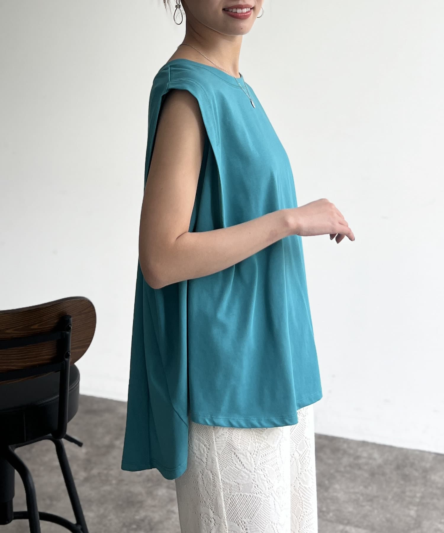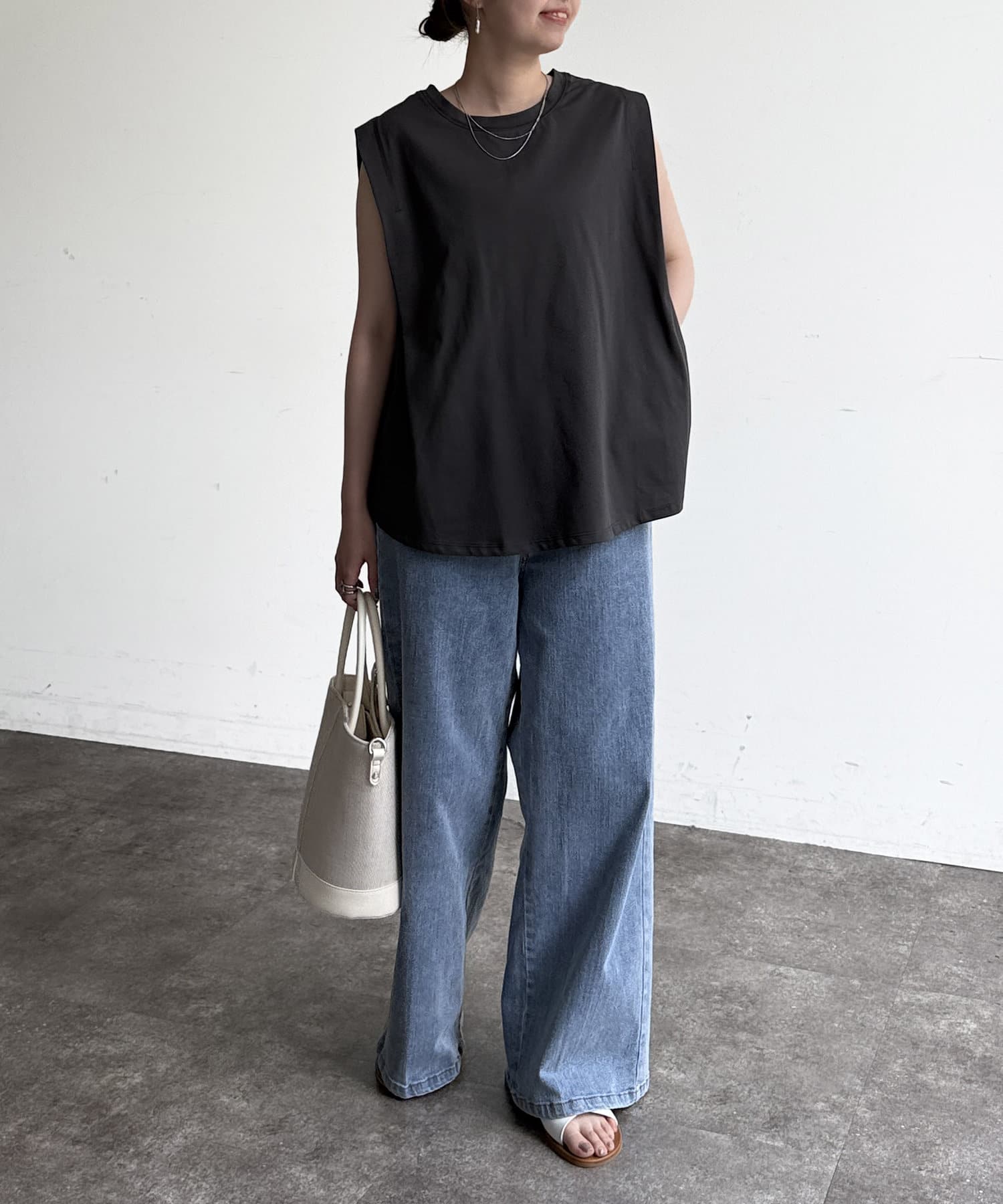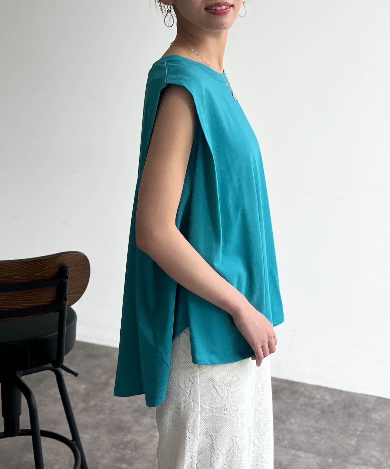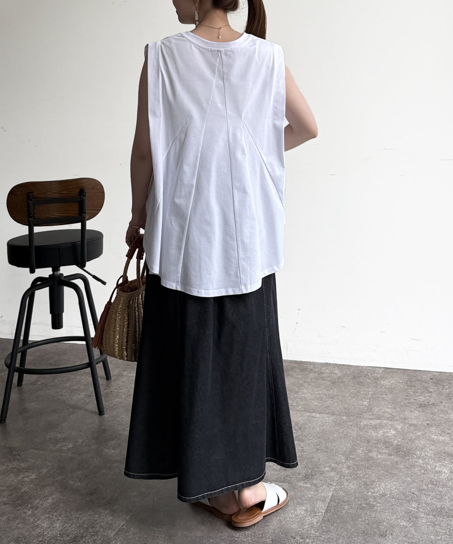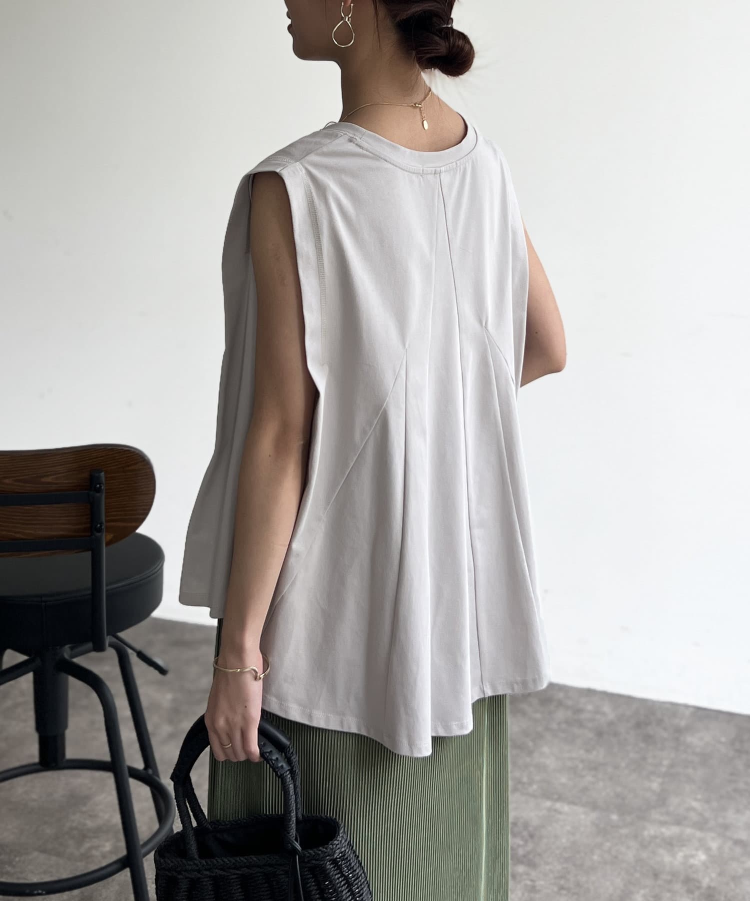 肩のまっすぐに切り落とされたラインが腕をすっきり見せてくれるノースリーブ。