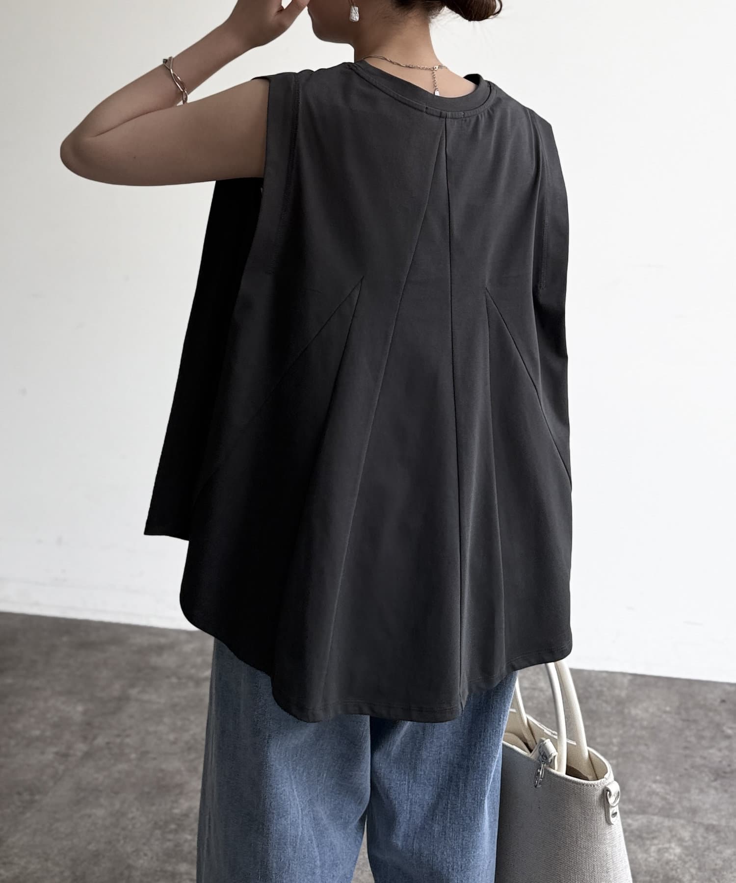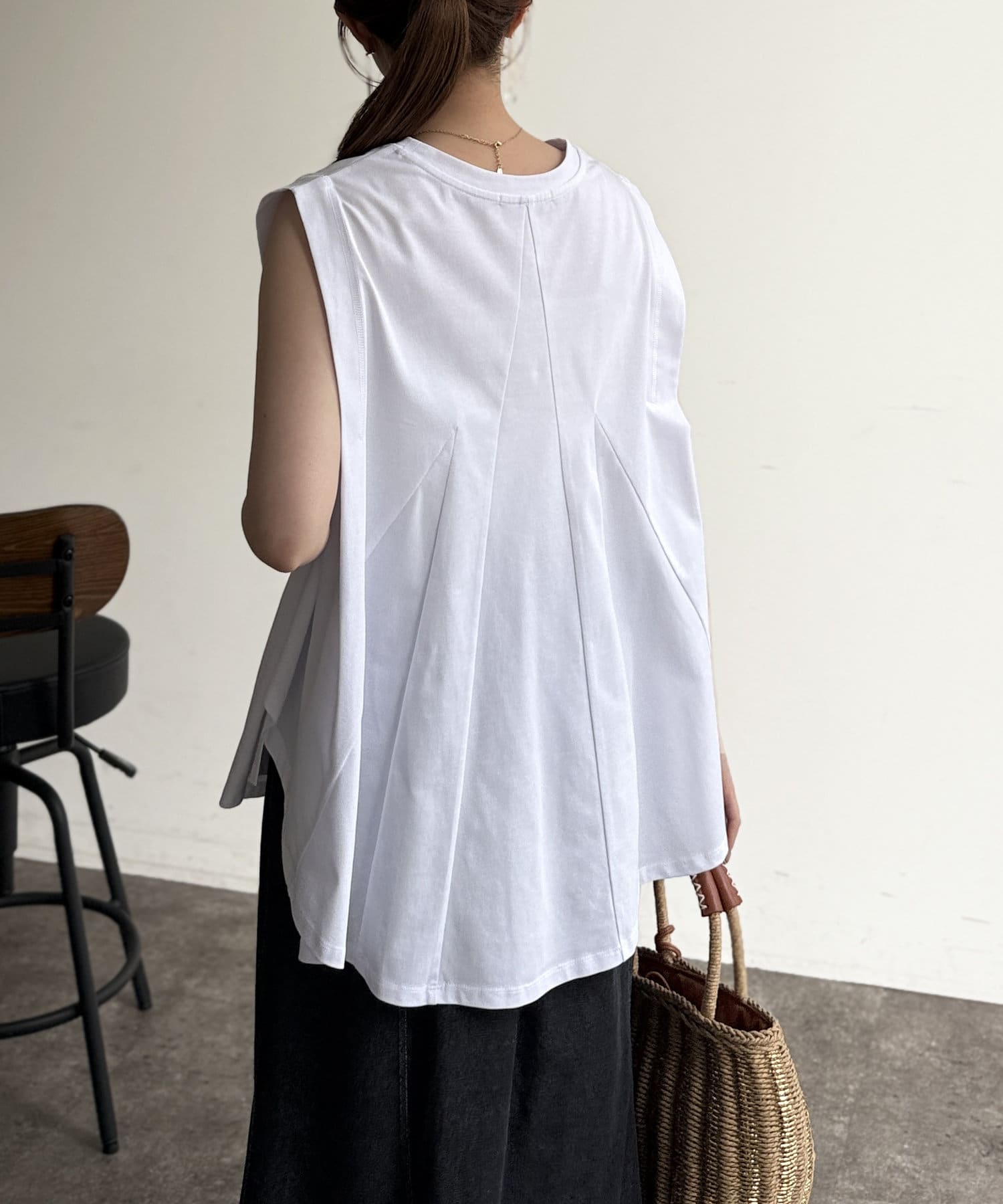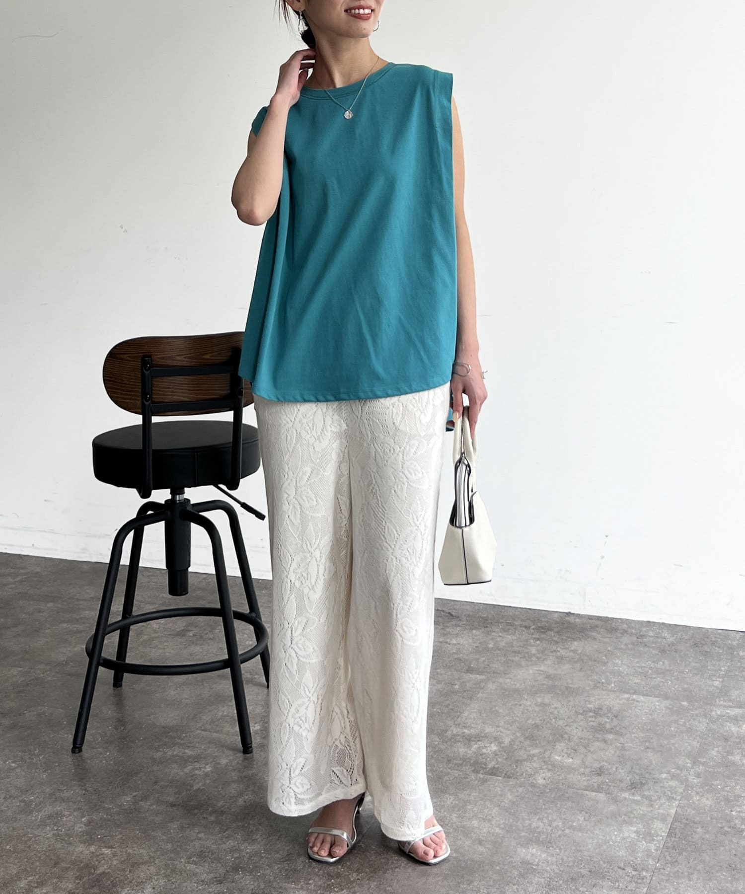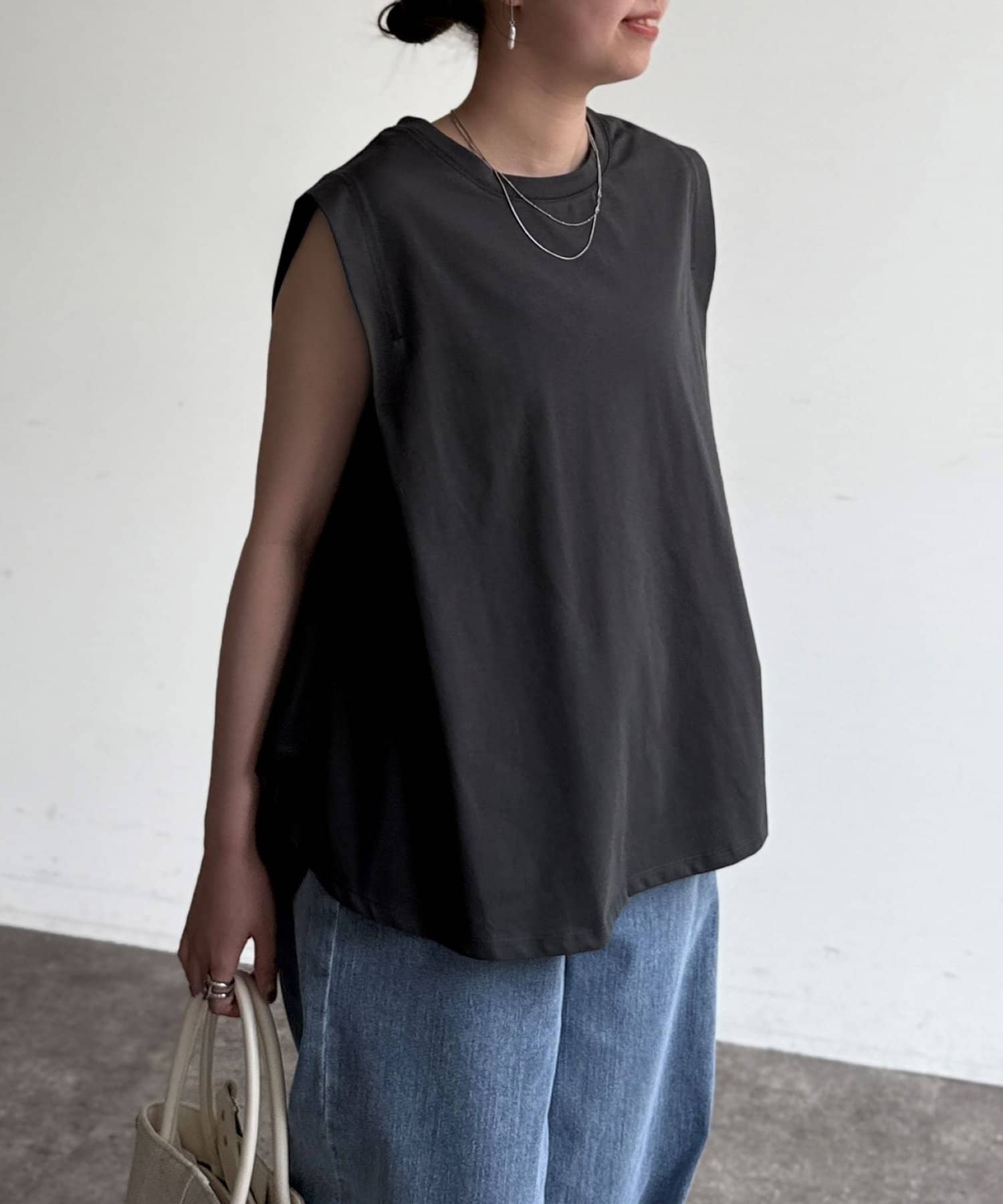 肩のまっすぐに切り落とされたラインが腕をすっきり見せてくれるノースリーブ。