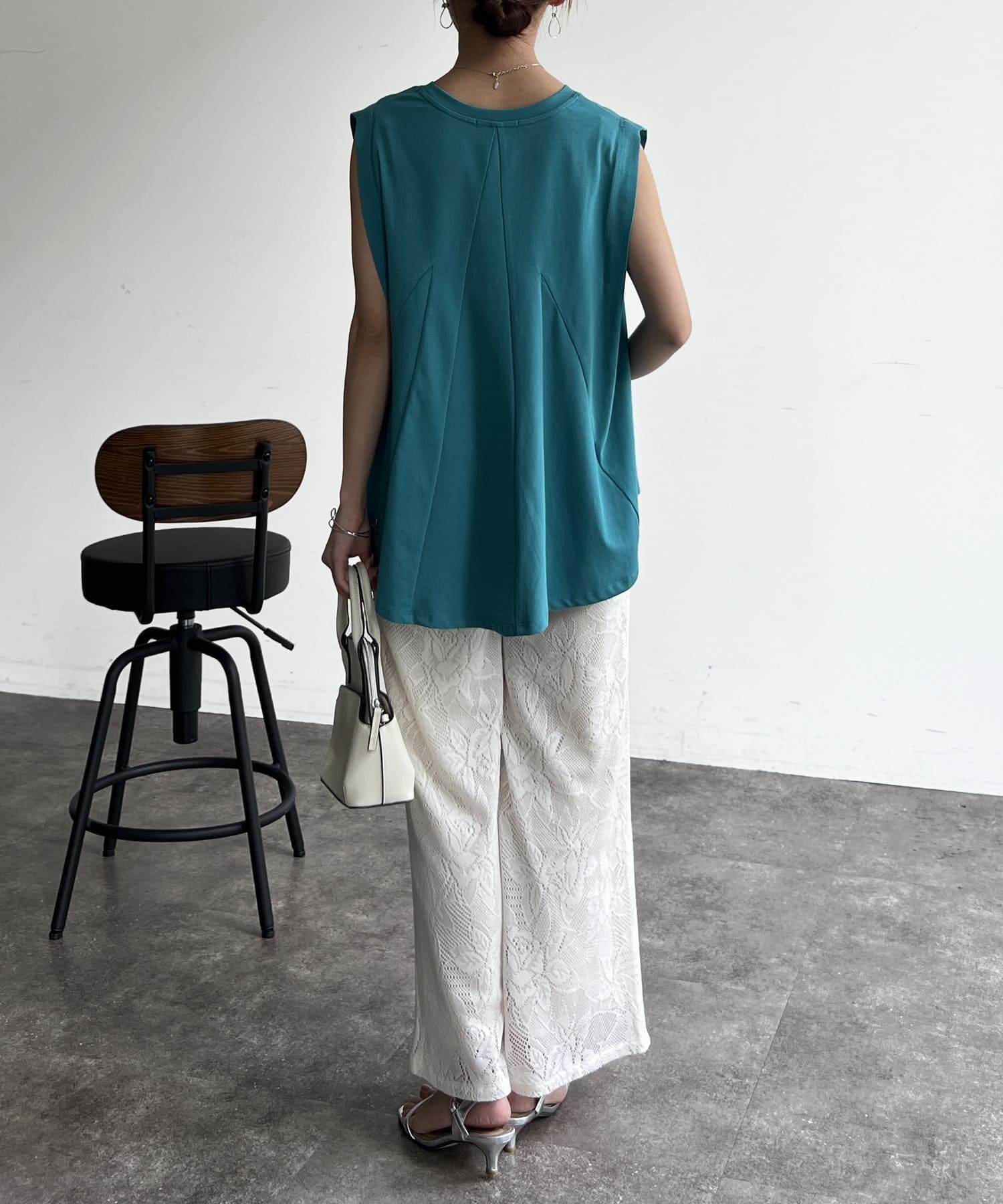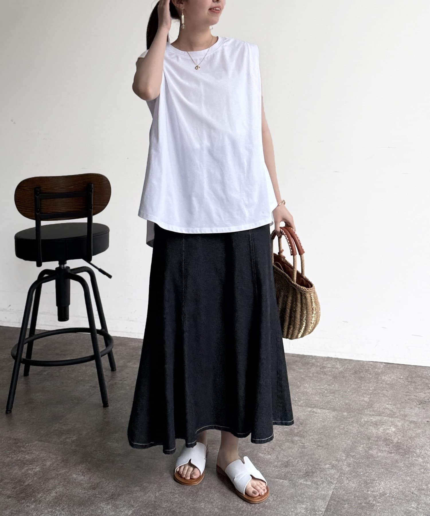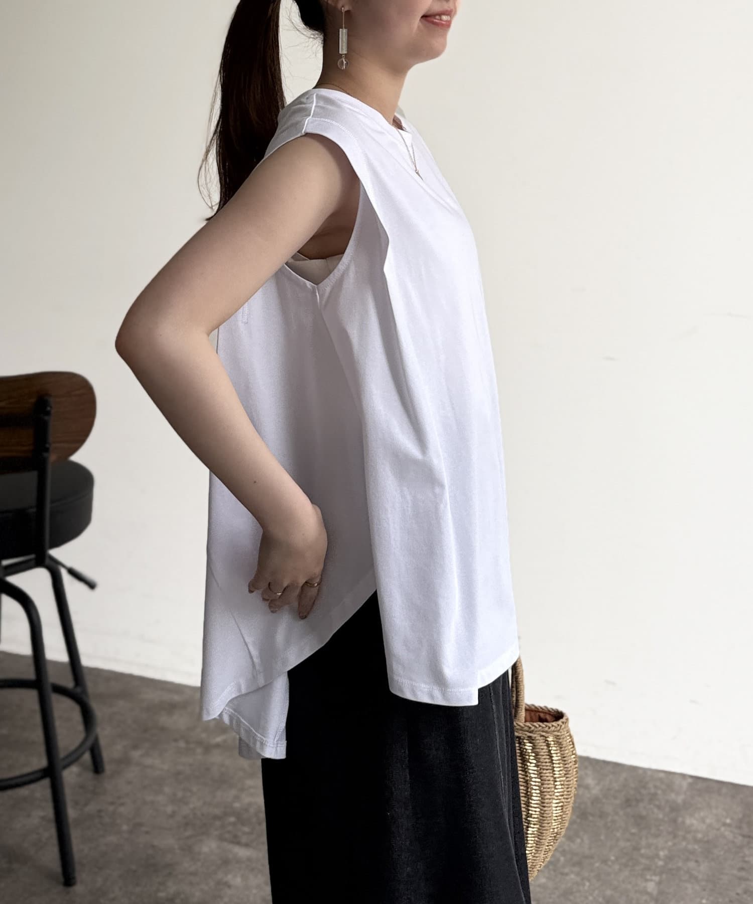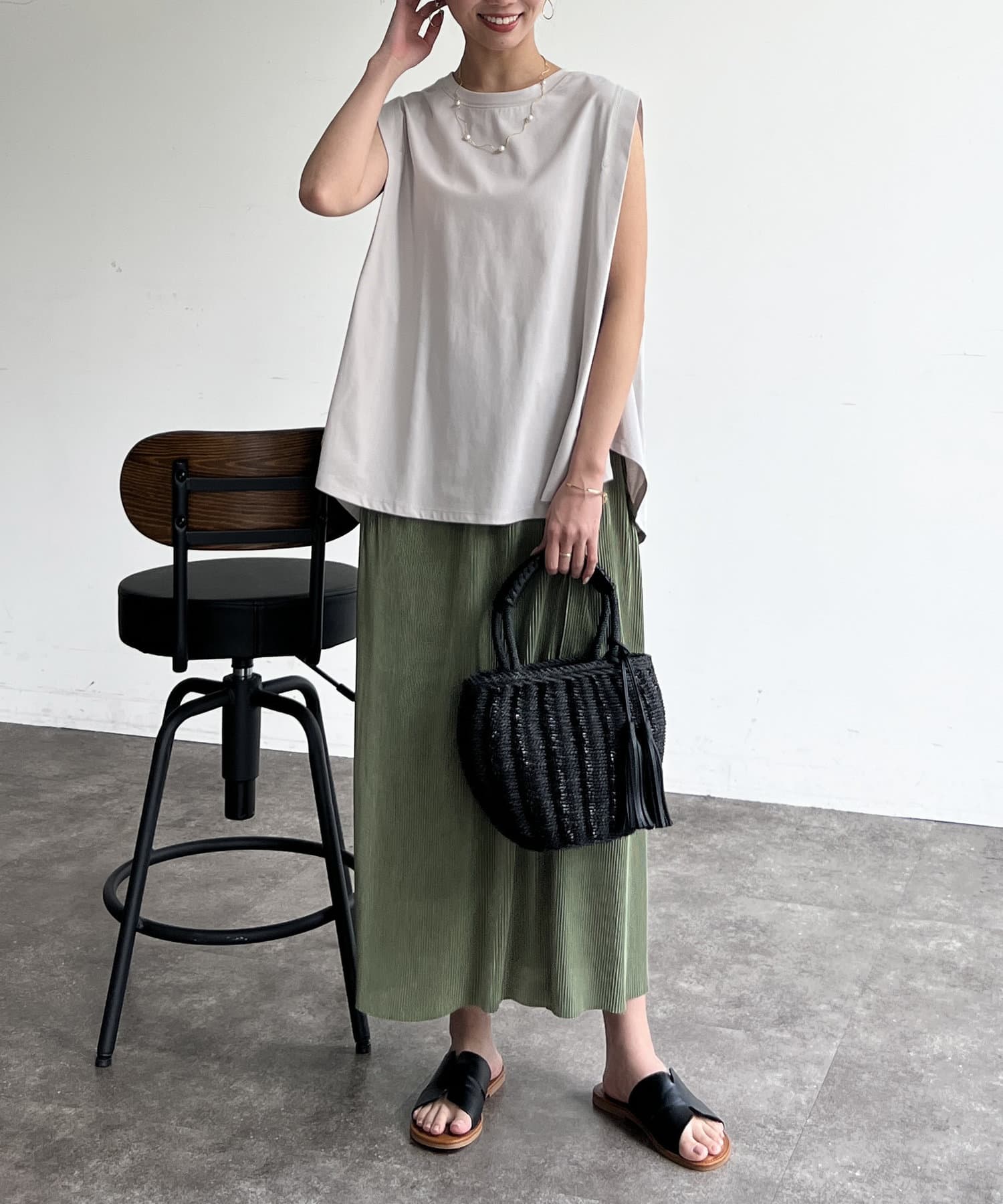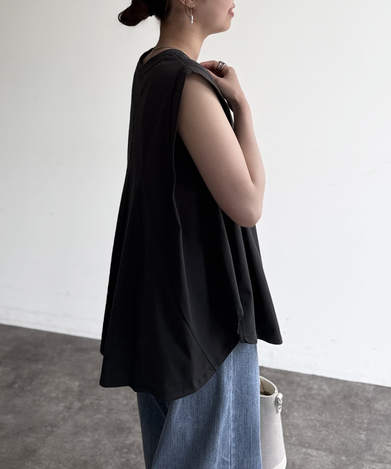 肩のまっすぐに切り落とされたラインが腕をすっきり見せてくれるノースリーブ。