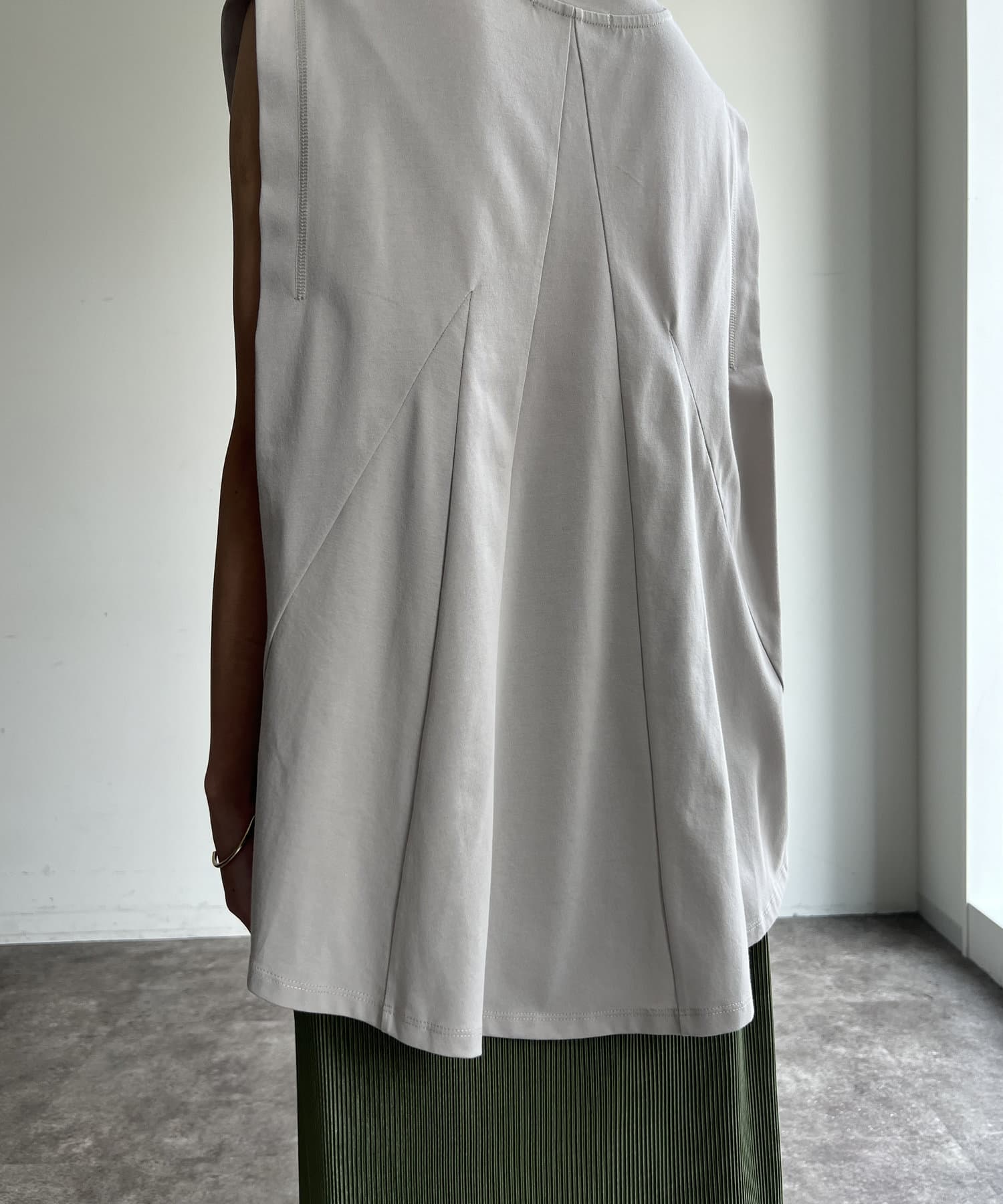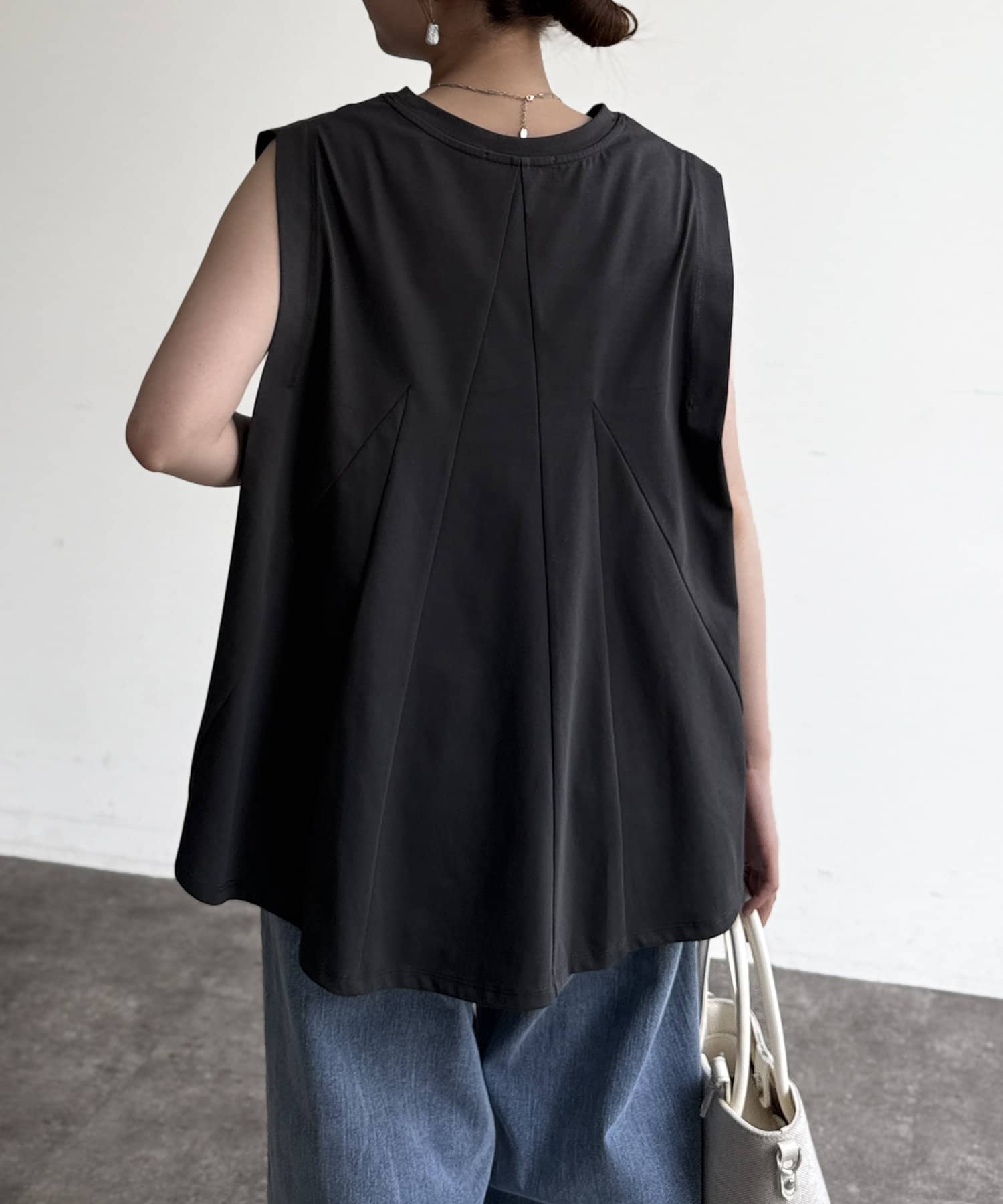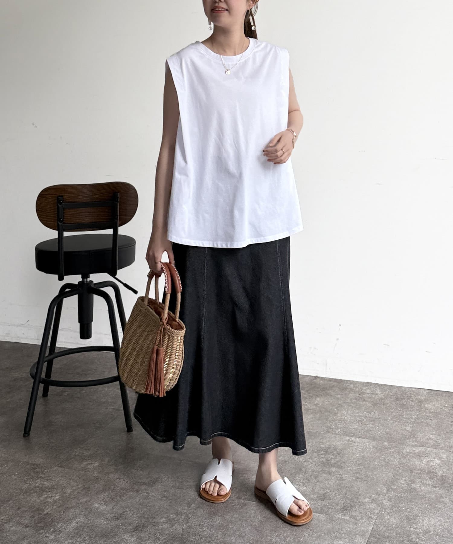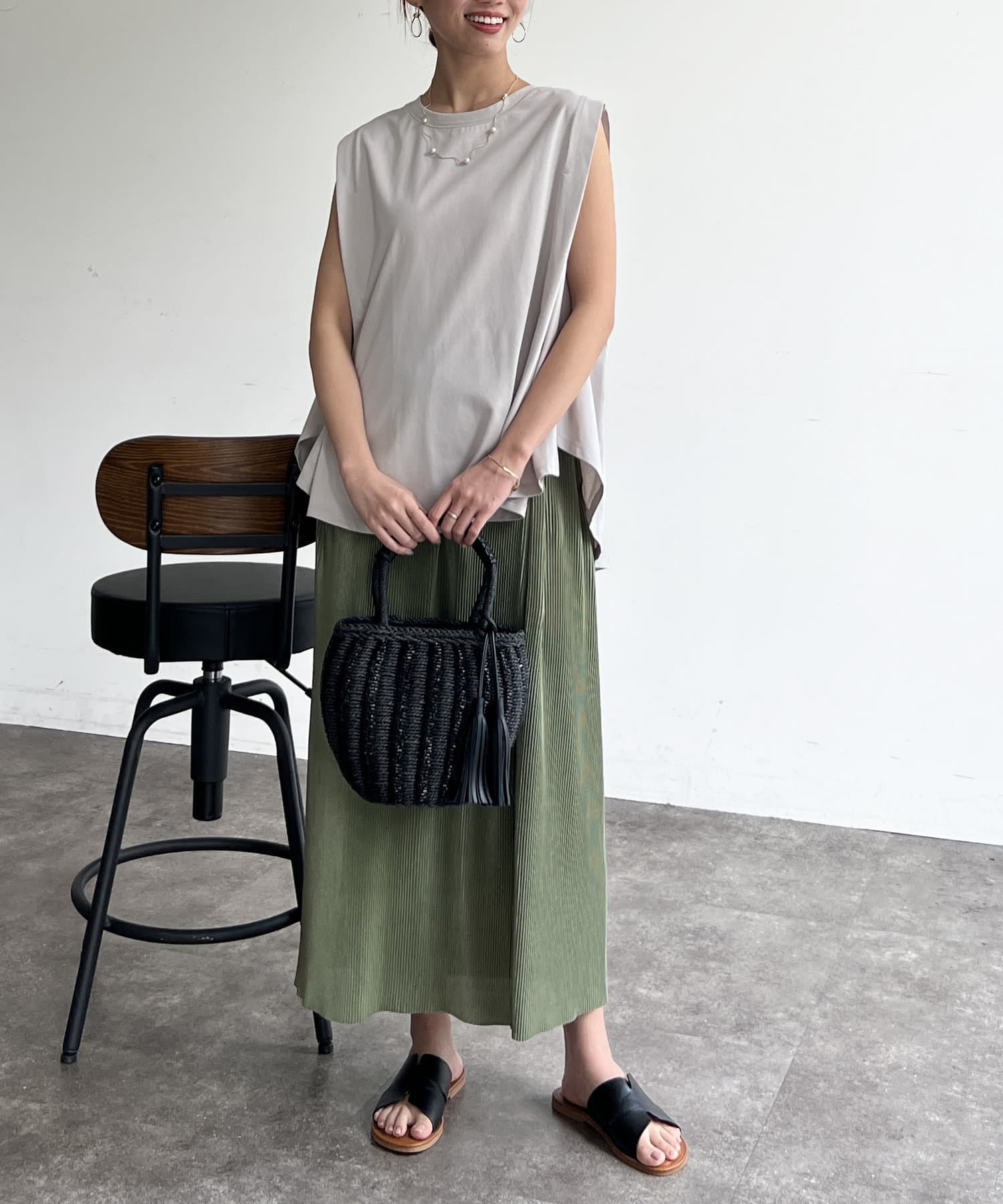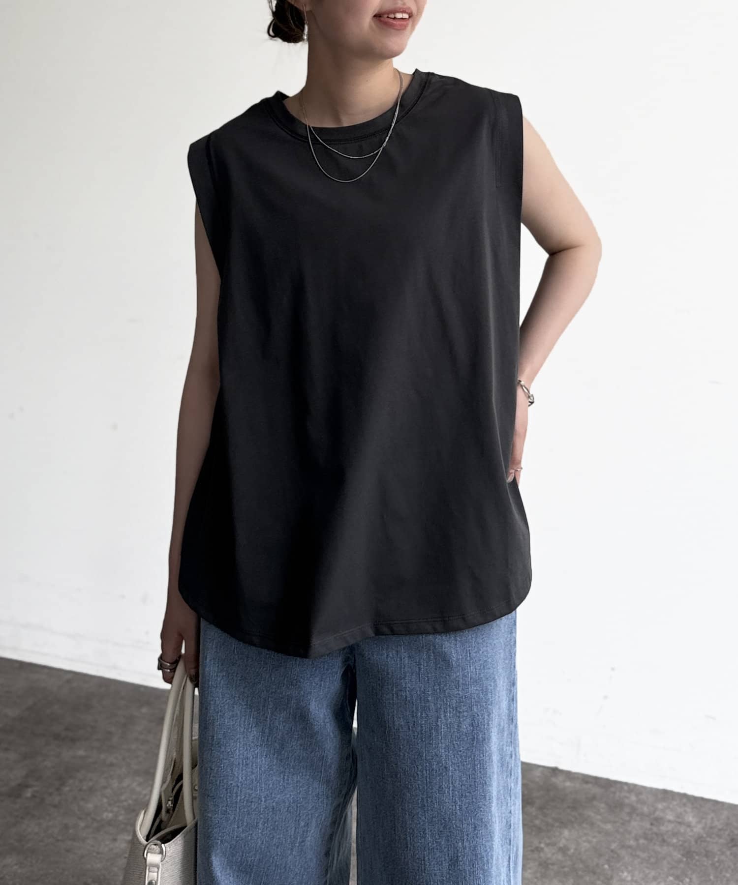 肩のまっすぐに切り落とされたラインが腕をすっきり見せてくれるノースリーブ。