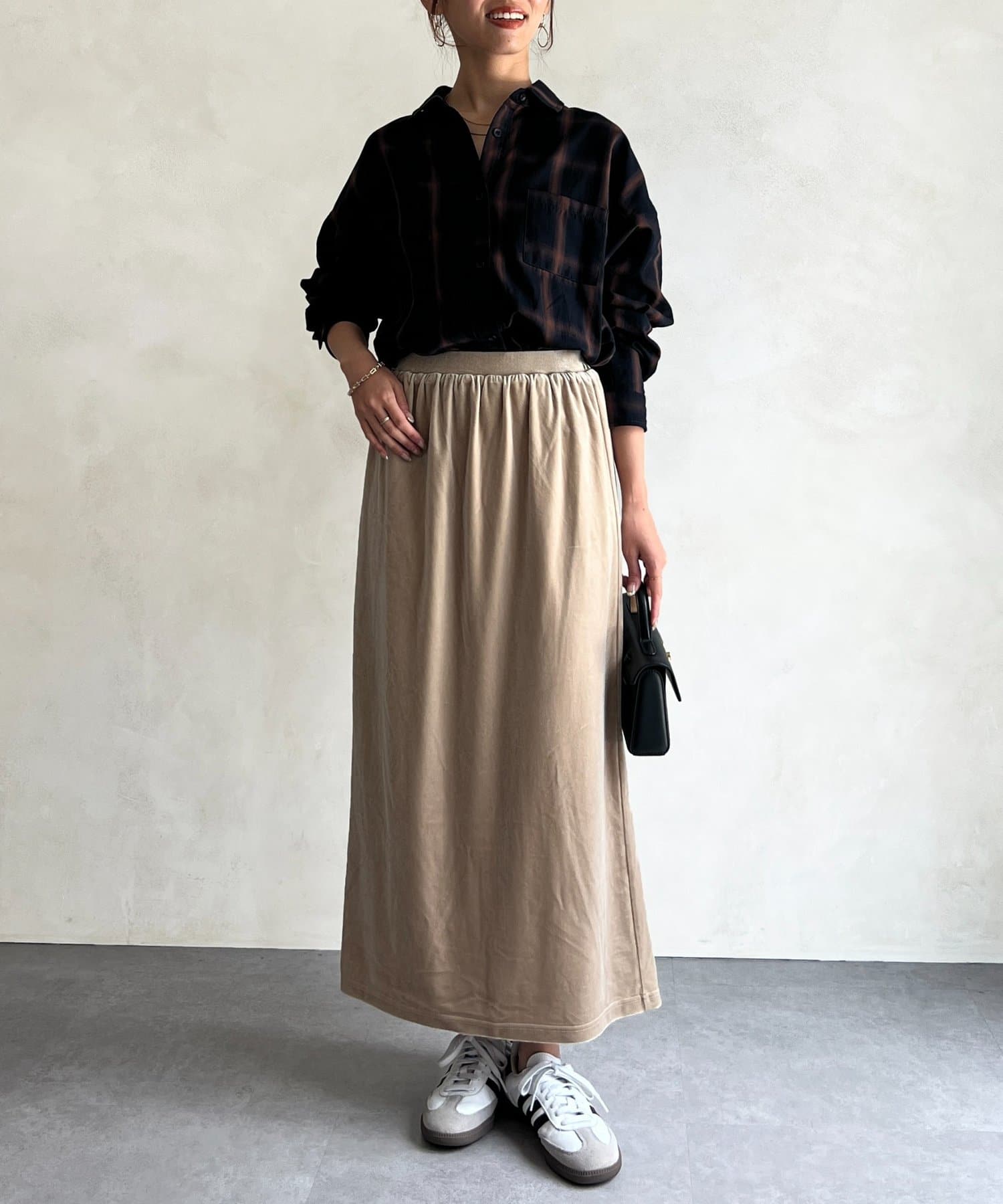 伸縮性のある素材感で、着心地よくスタイルアップ見え間違いなし◎