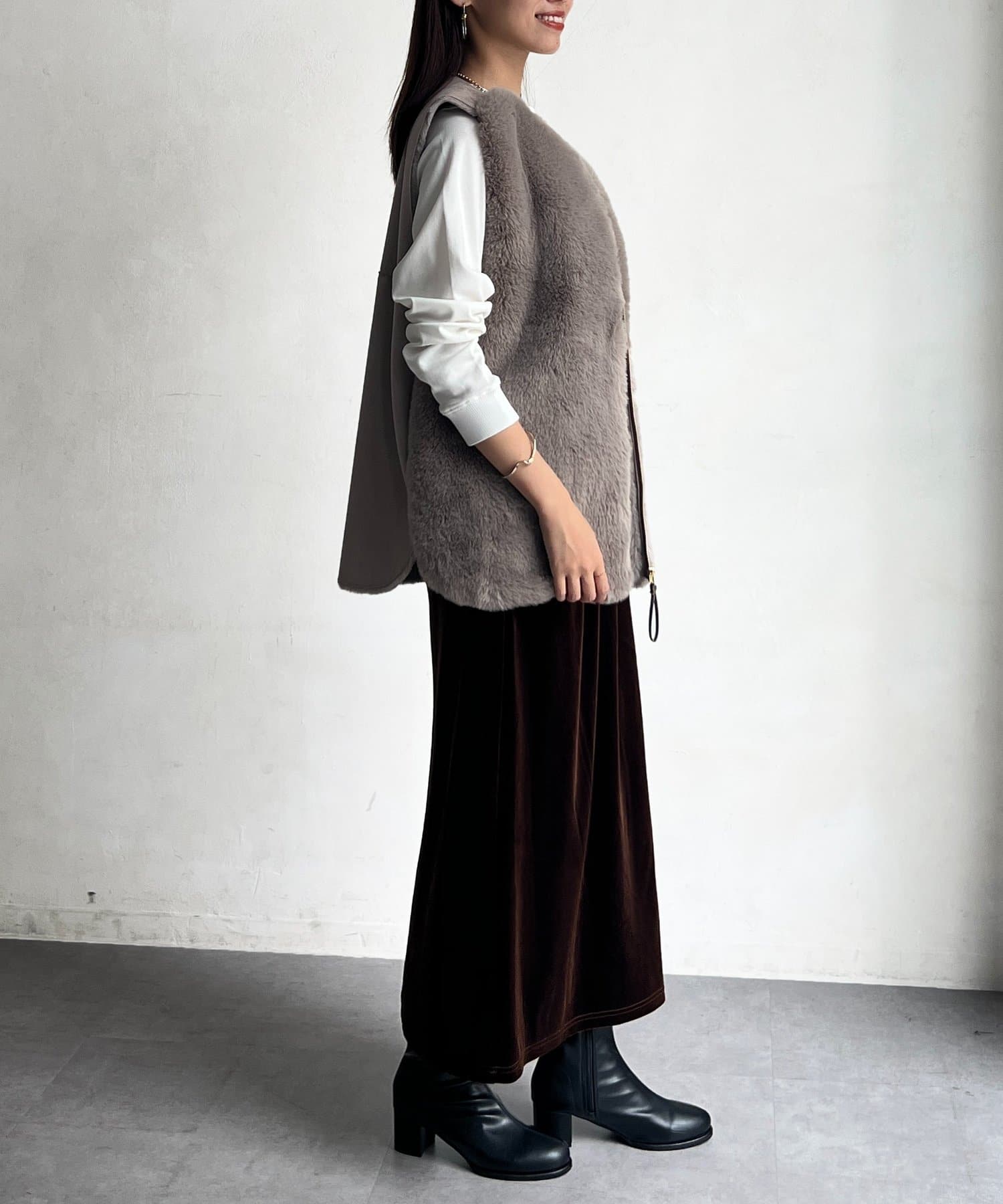 ジレやベストとレイヤードしたり、トップスでボリューム感をプラスするのがおすすめです。