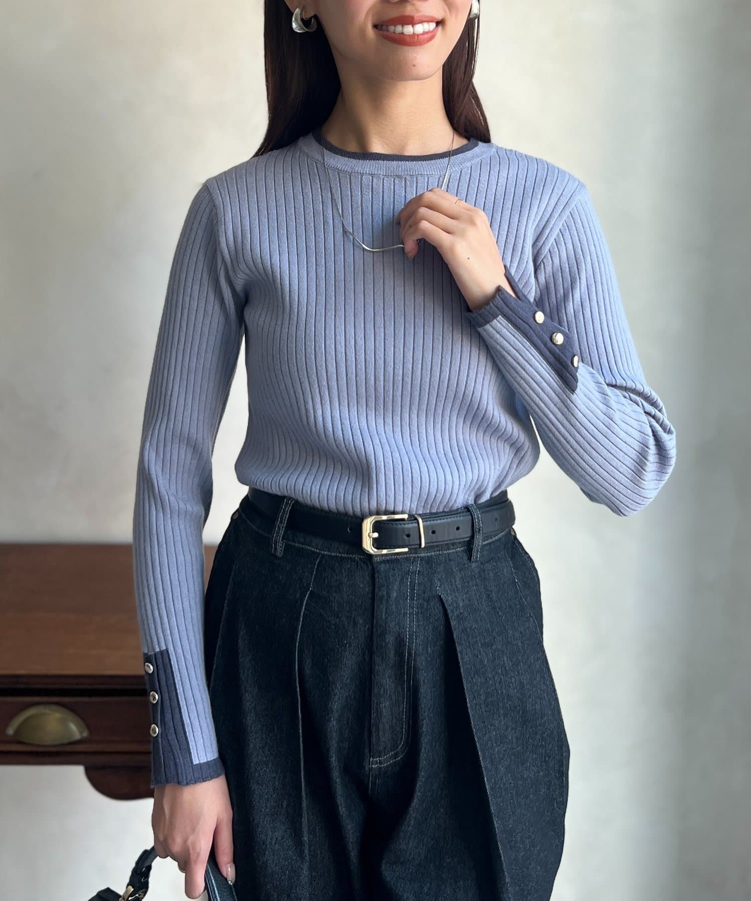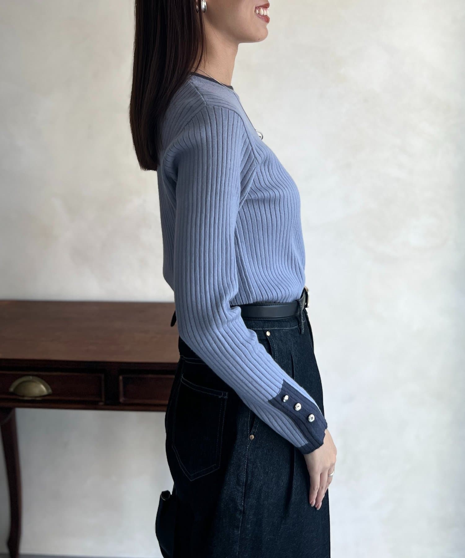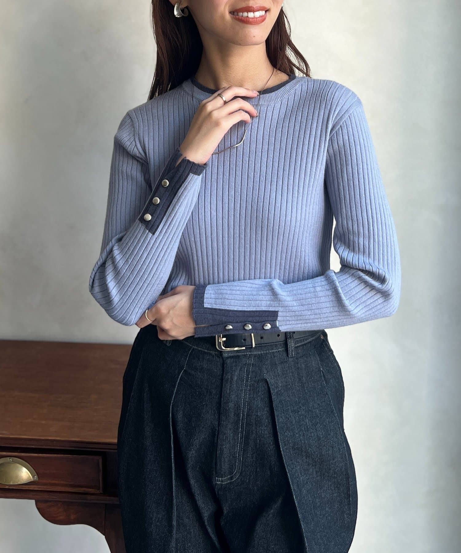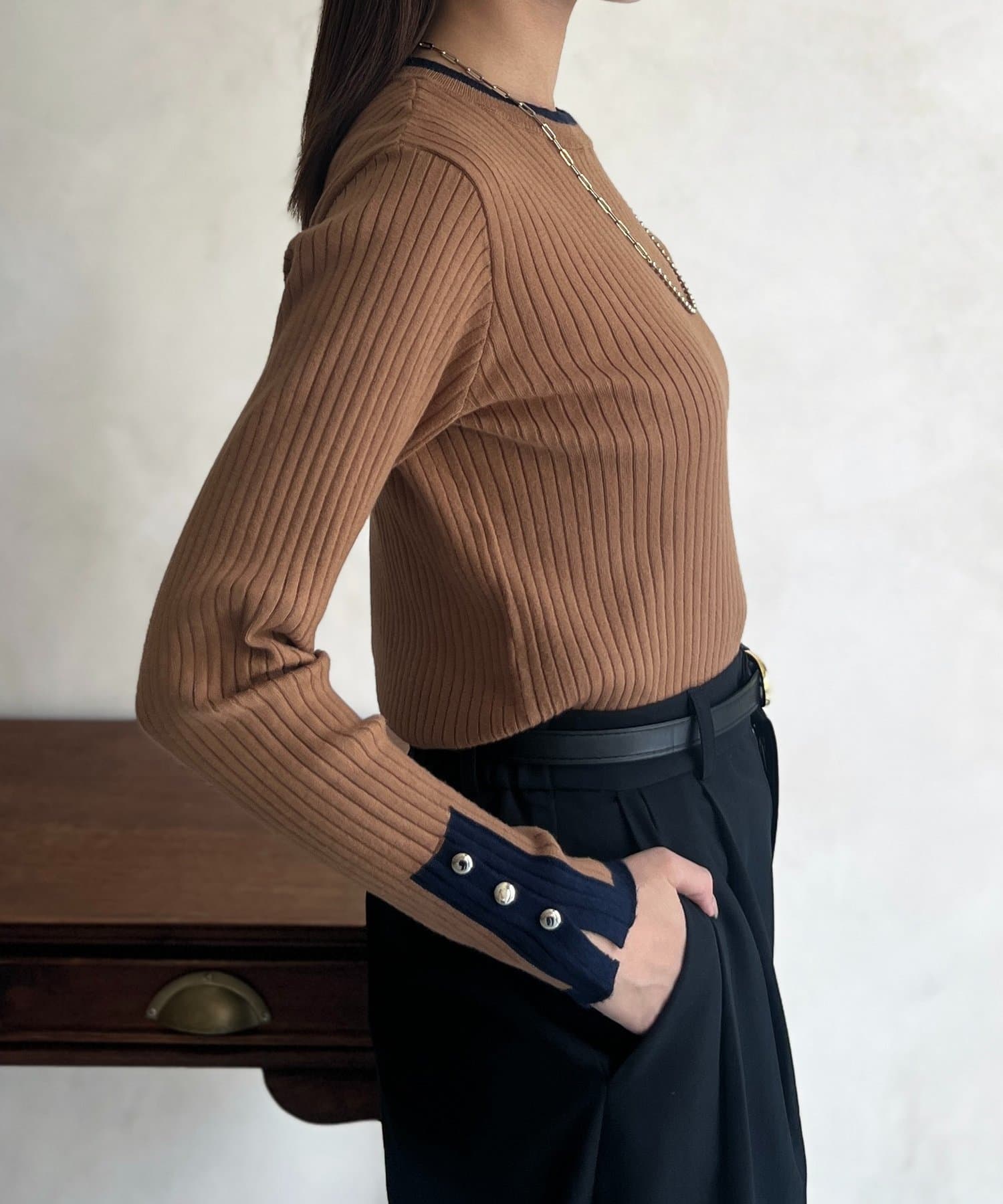 襟元と裾を配色にし、袖口にゴールドボタンをあしらったプルオーバー。