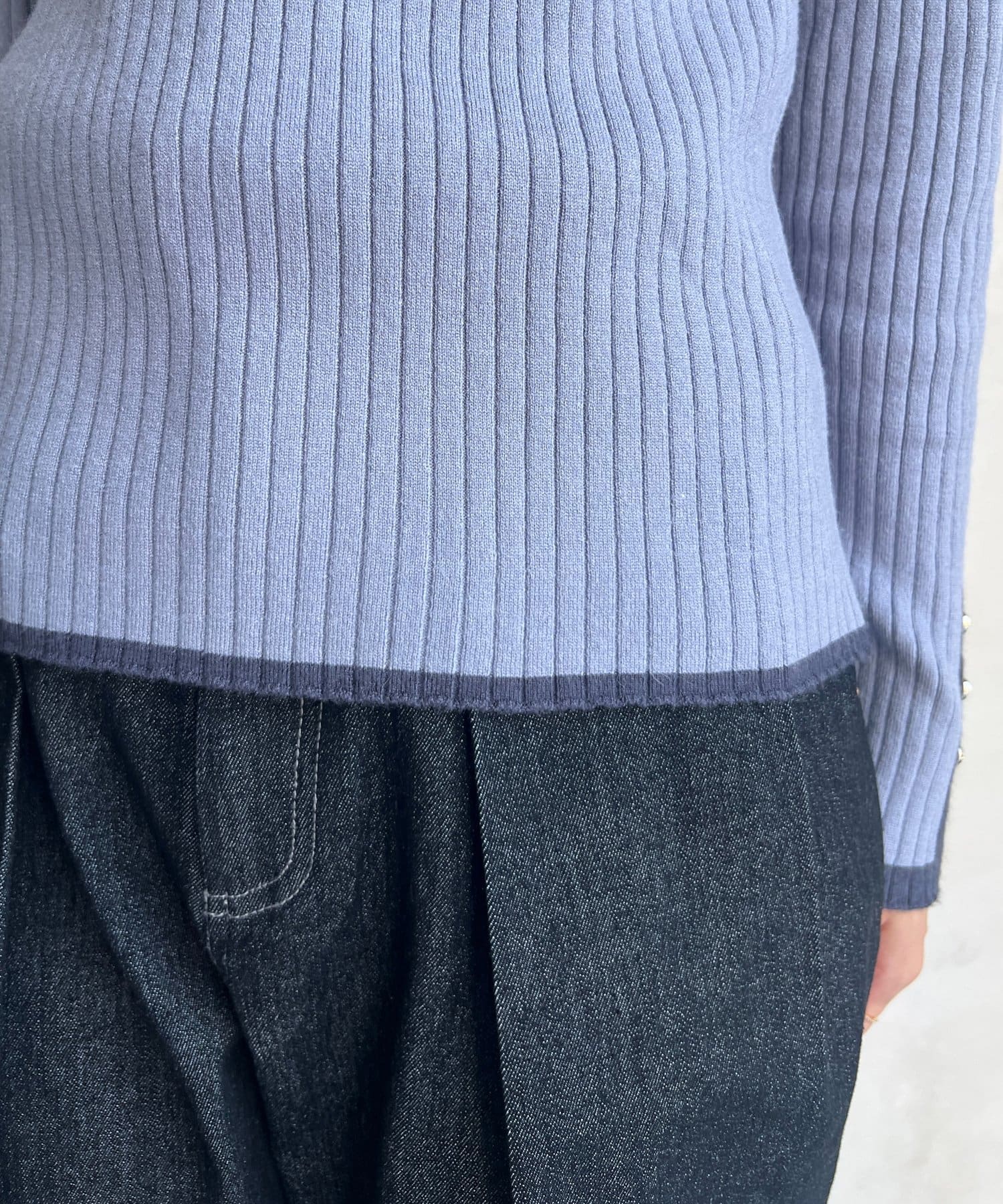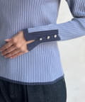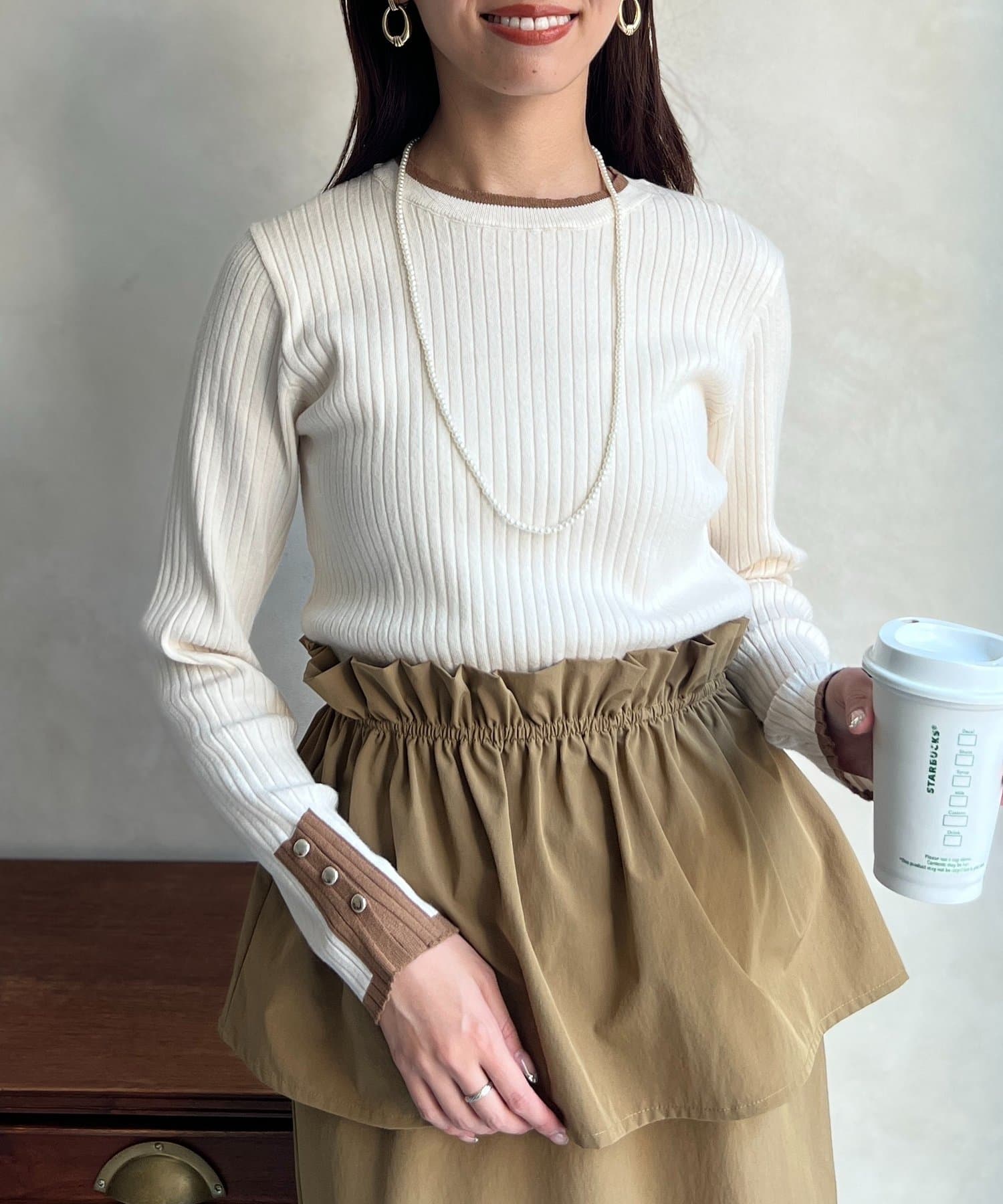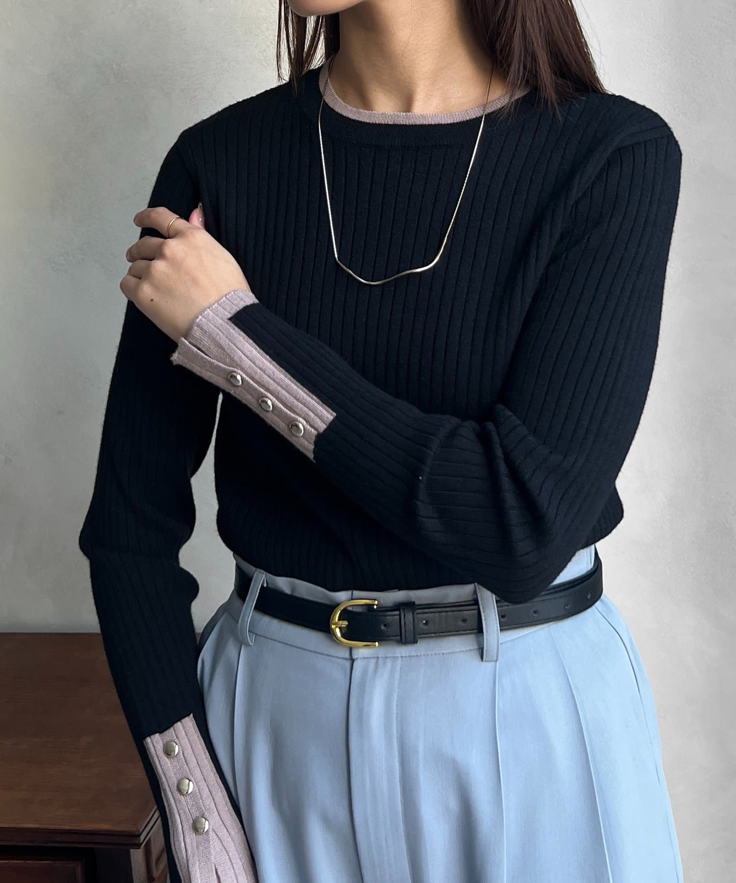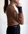 襟元と裾を配色にし、袖口にゴールドボタンをあしらったプルオーバー。