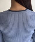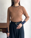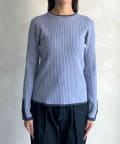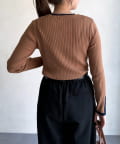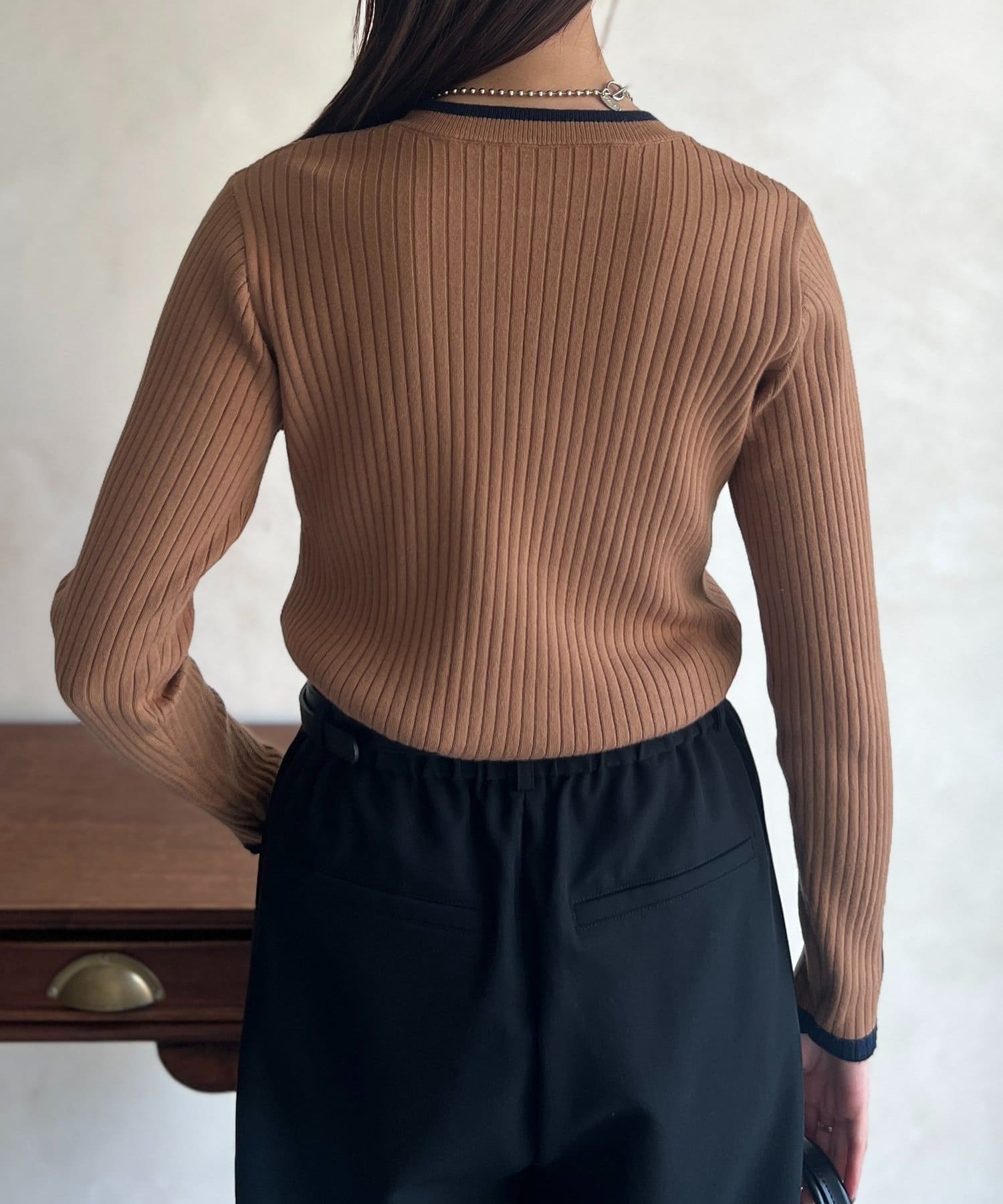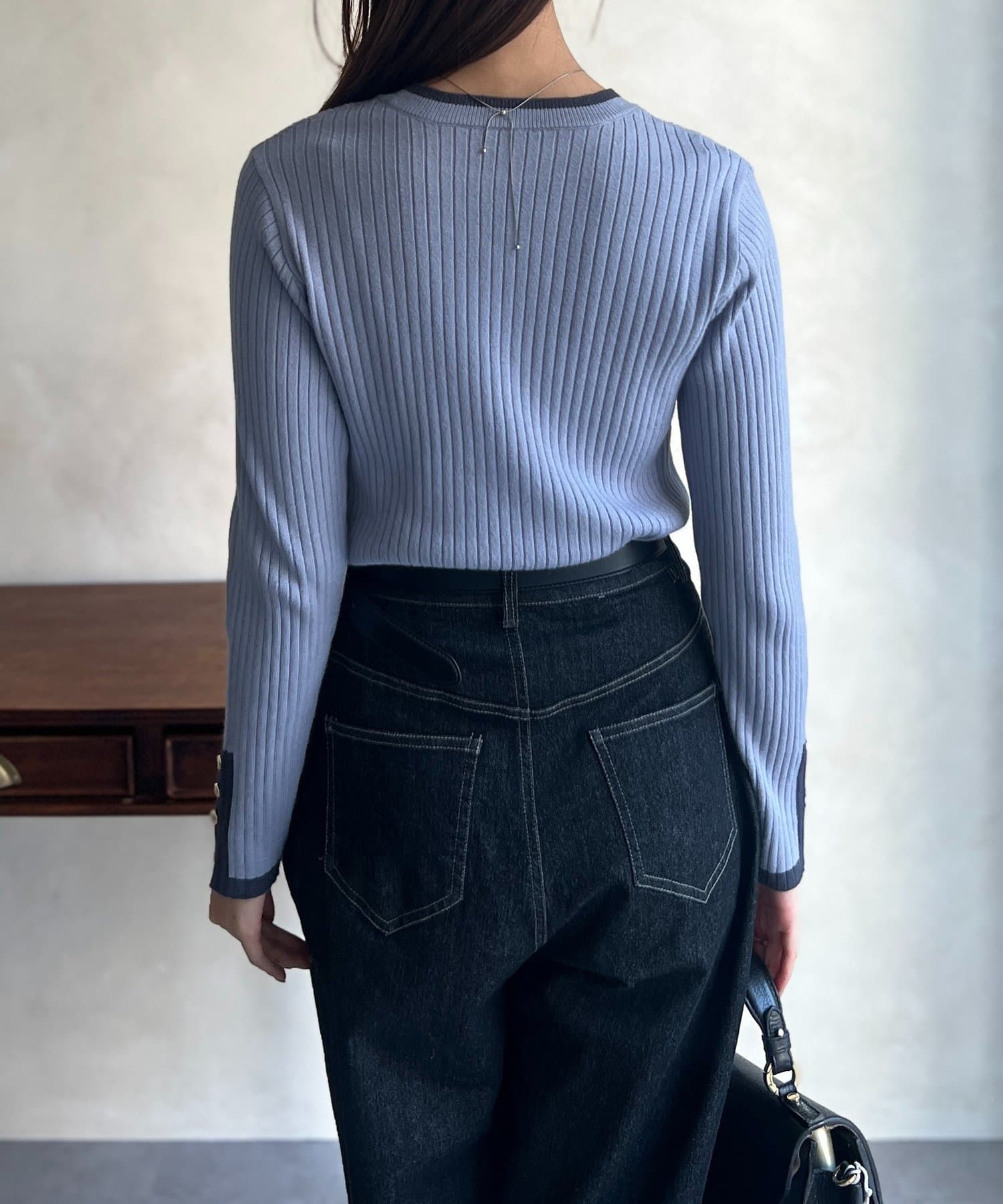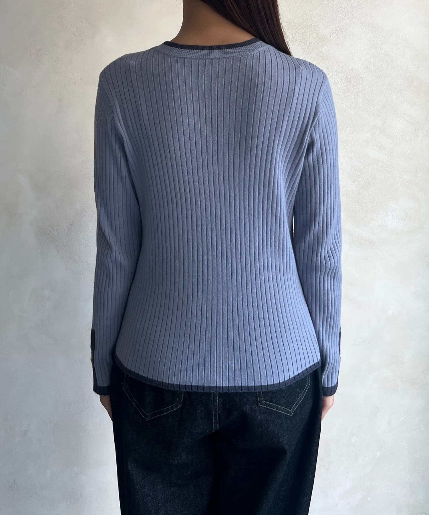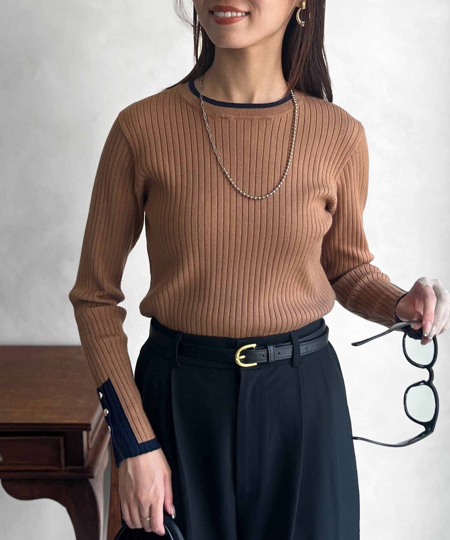襟元と裾を配色にし、袖口にゴールドボタンをあしらったプルオーバー。