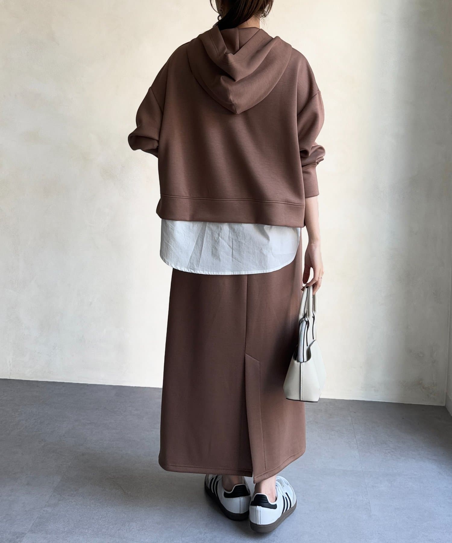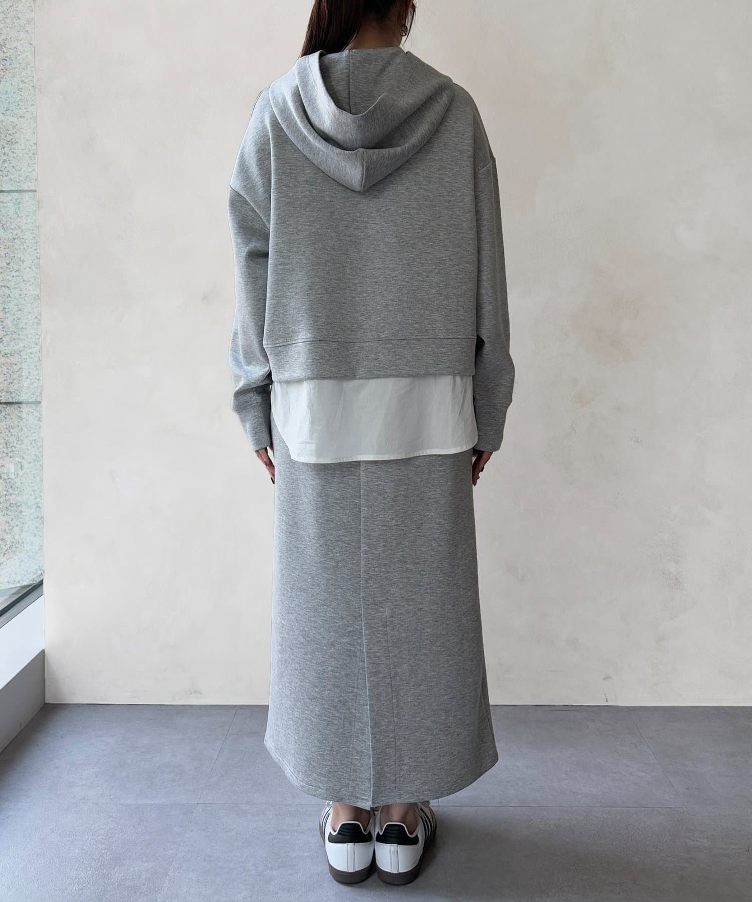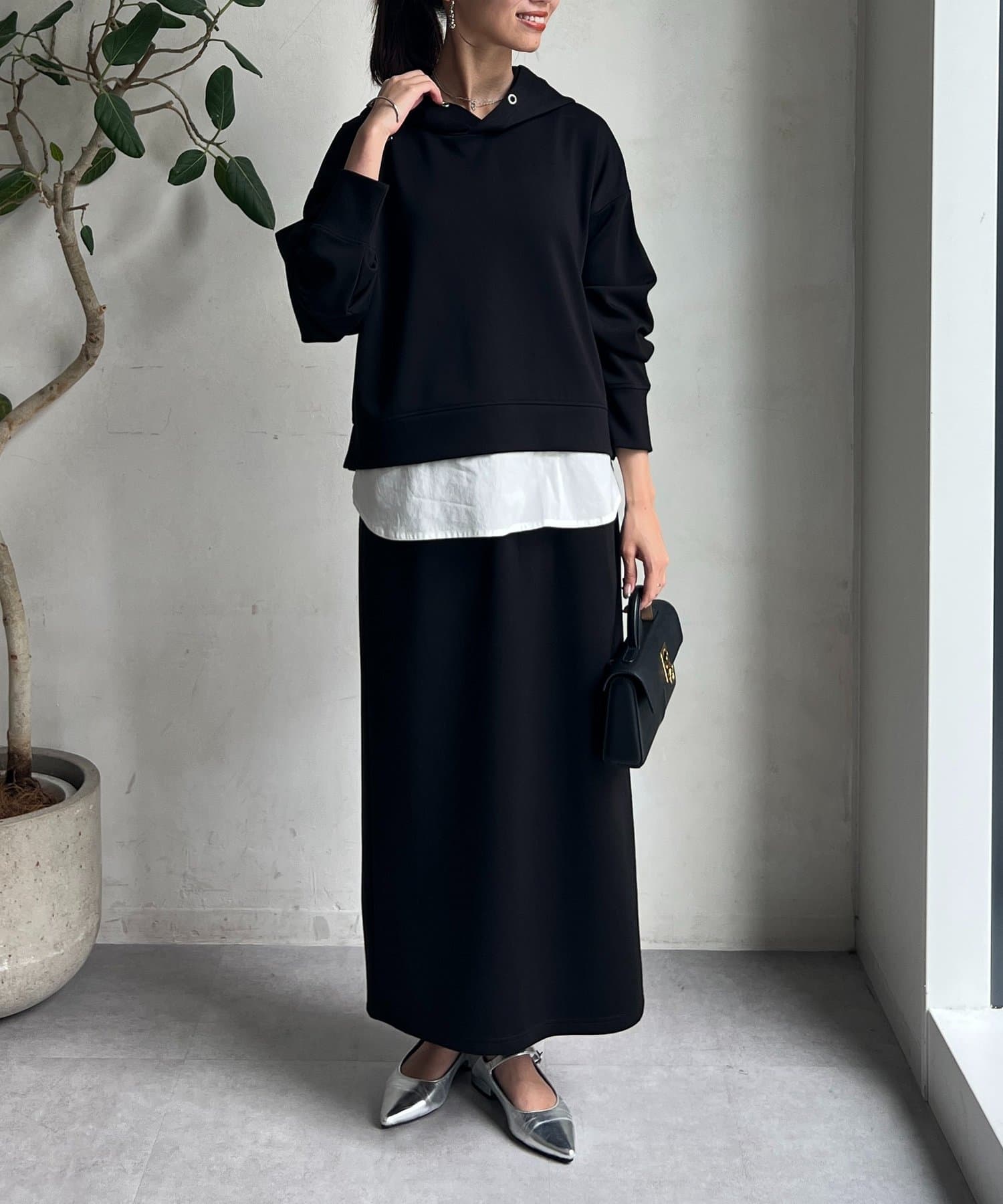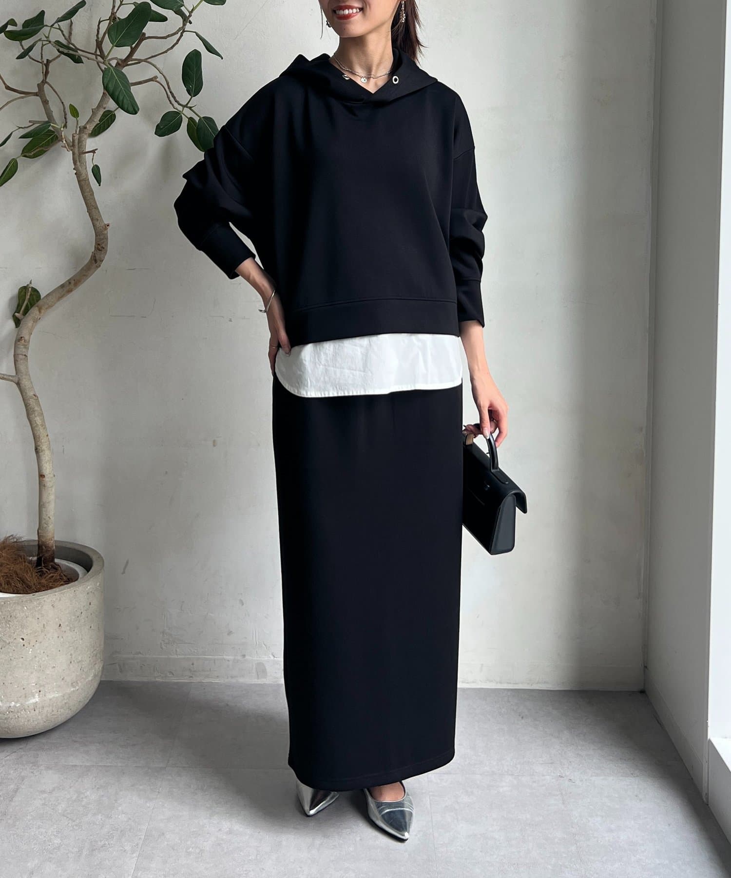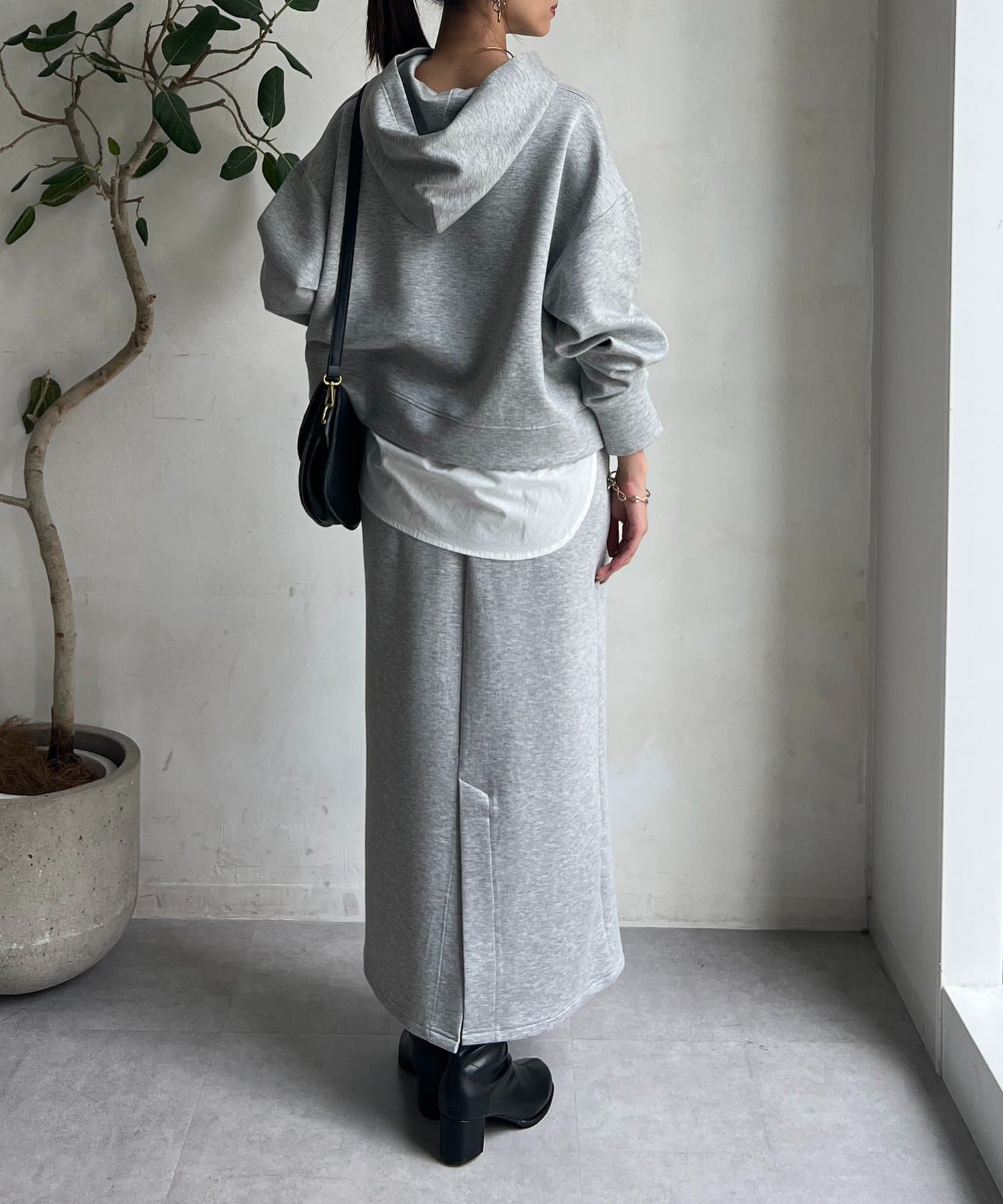 ボンディングフードプルオーバー×ナロースカート