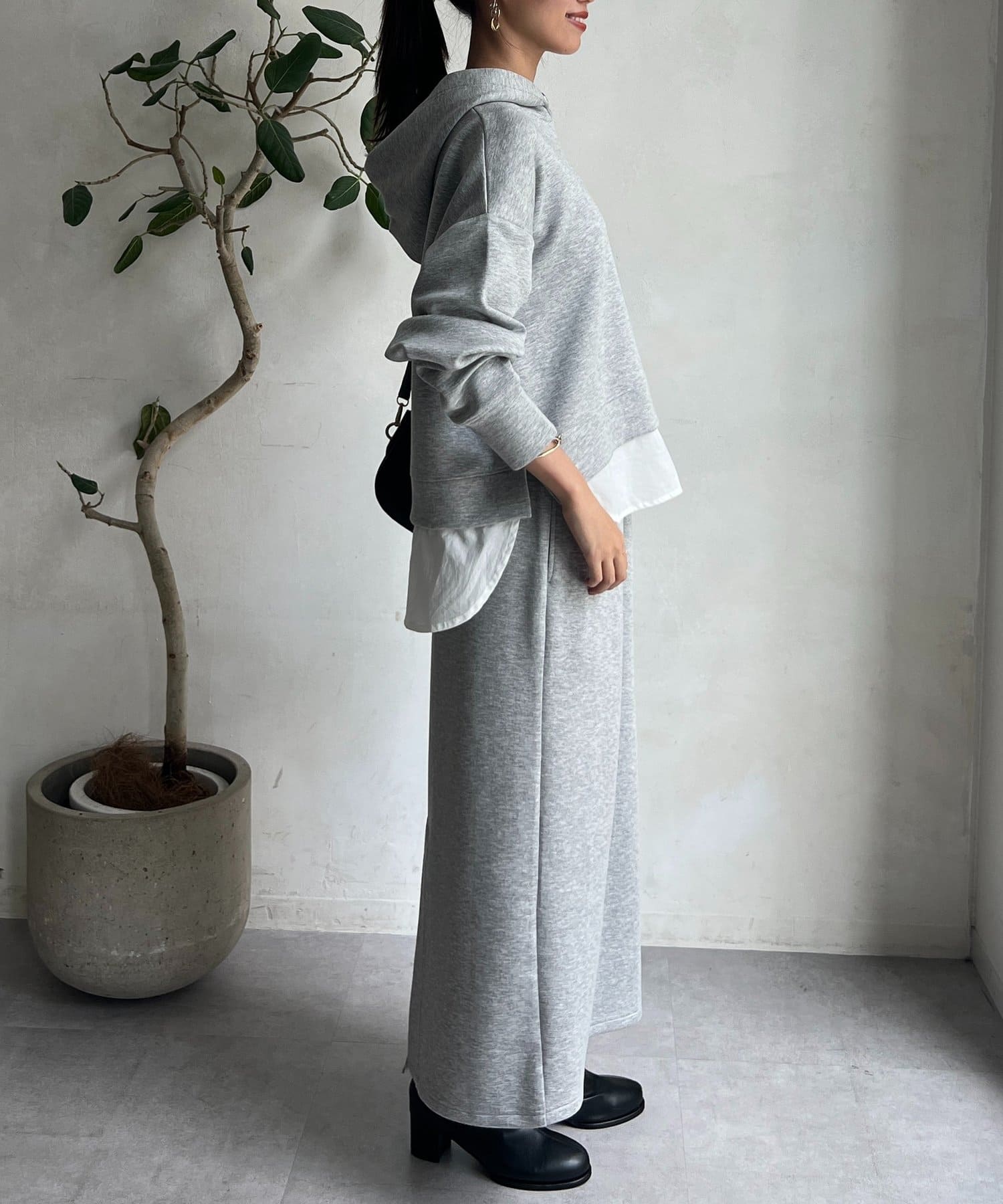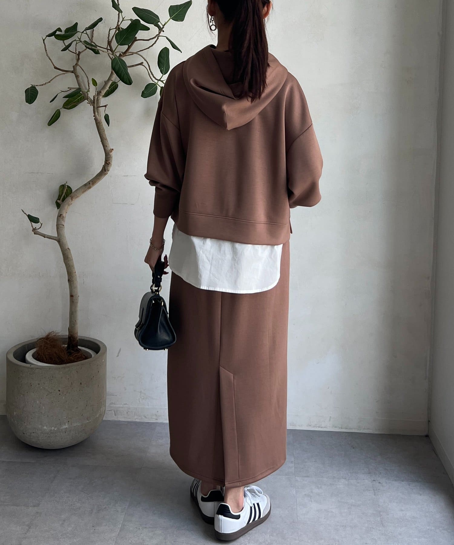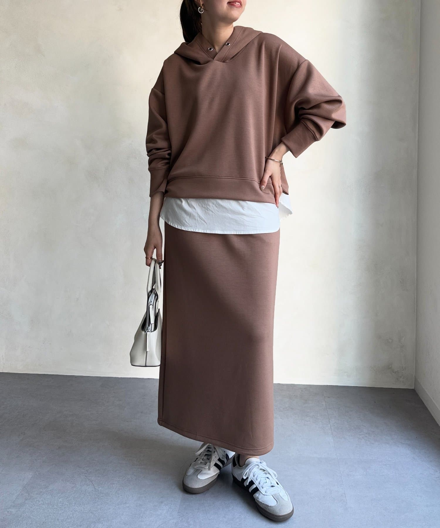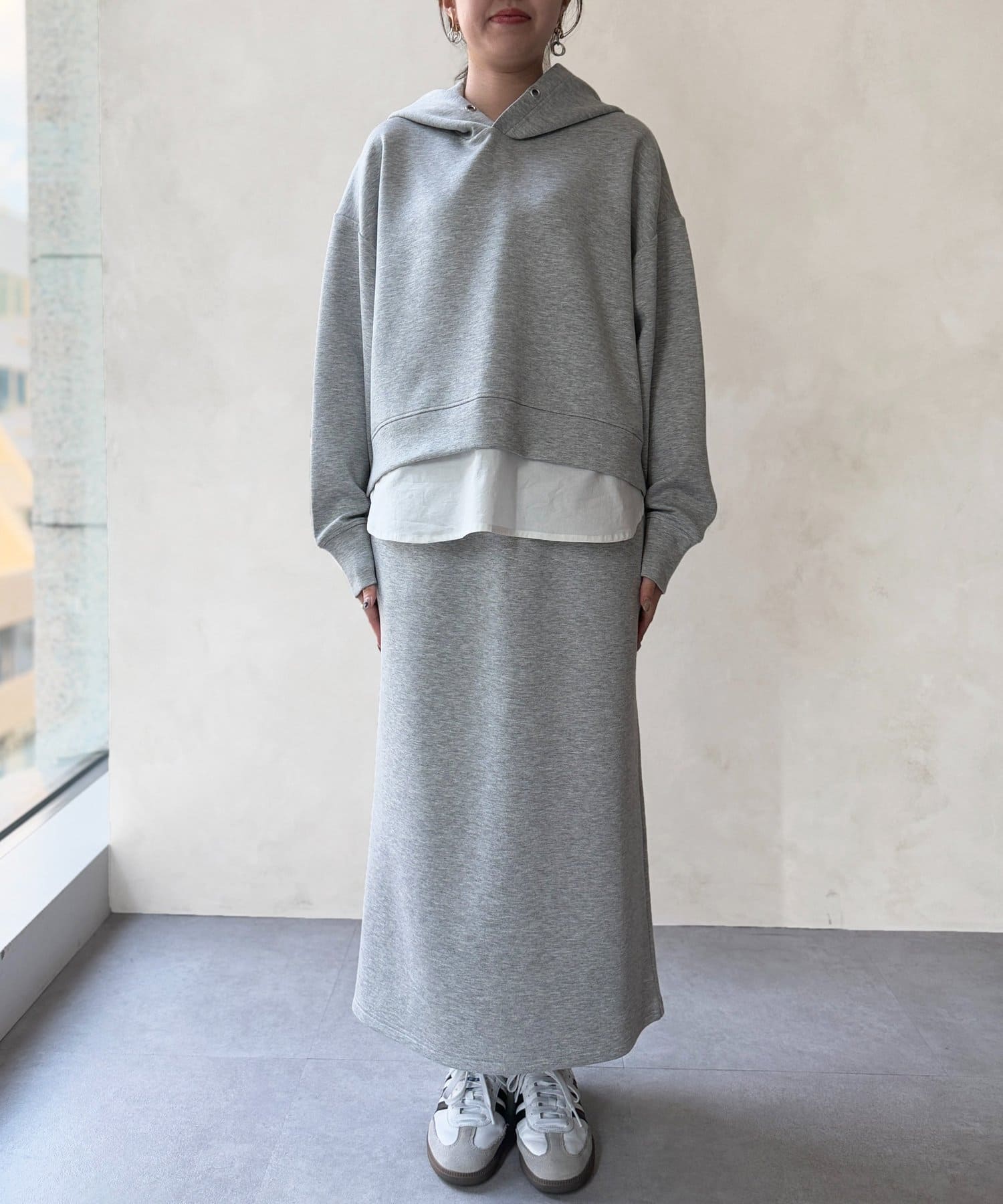 ボンディングフードプルオーバー×ナロースカート
