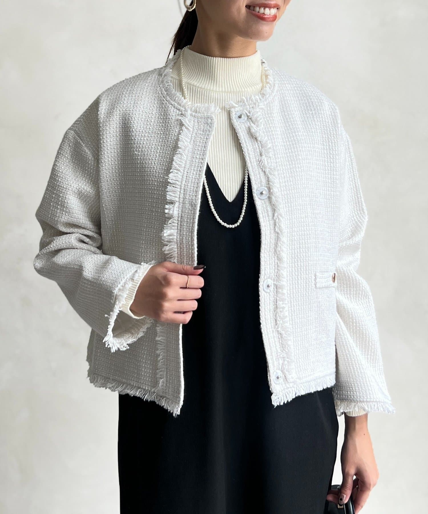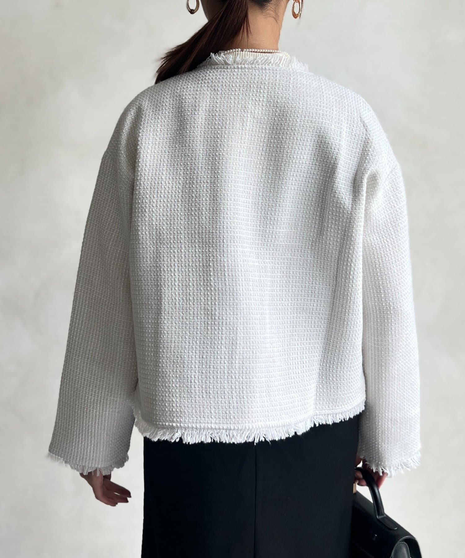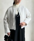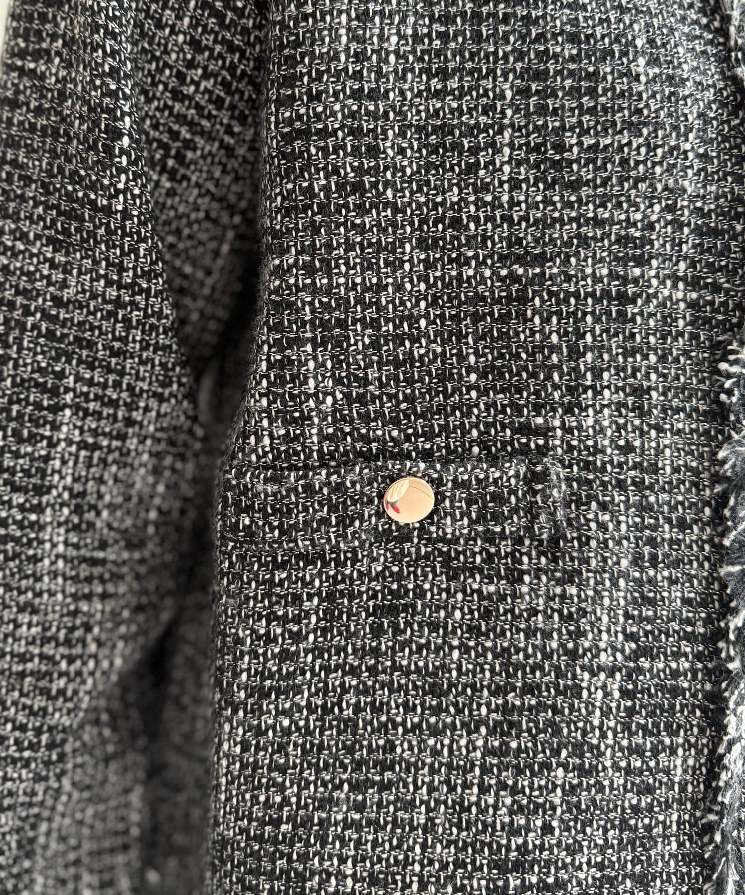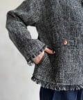 ポケットや袖口、前立て部分がフリンジ仕立てになっており、ゴールドボタンが高級感と華やかさをプラス♪
