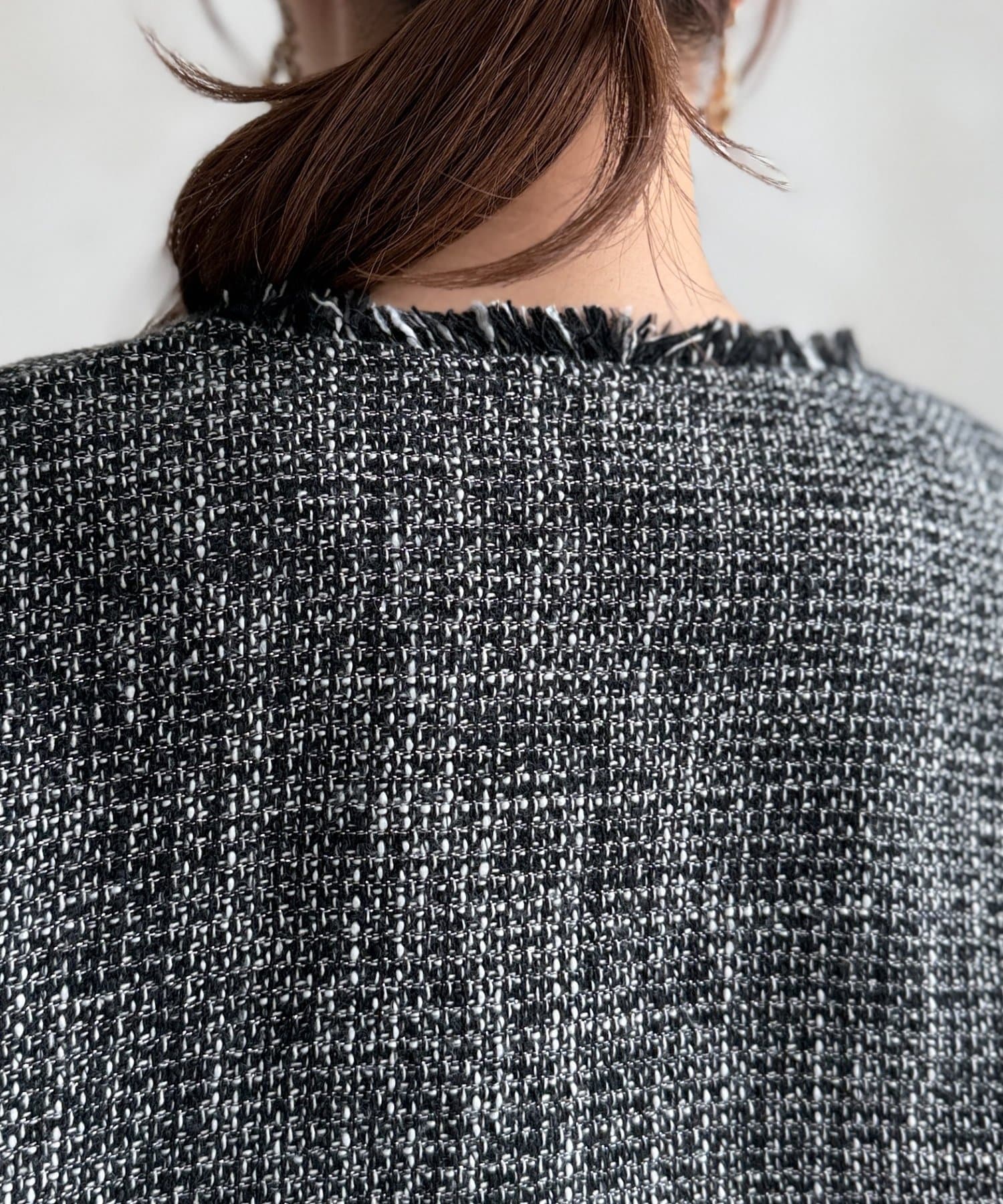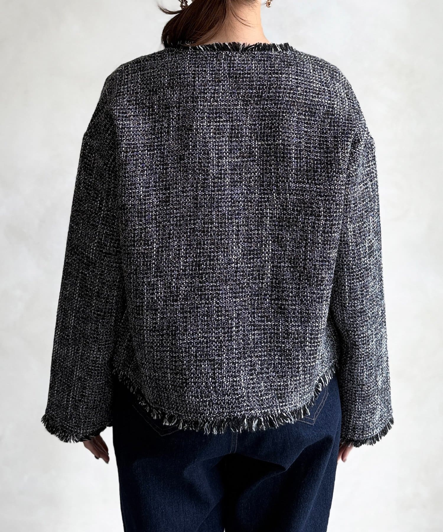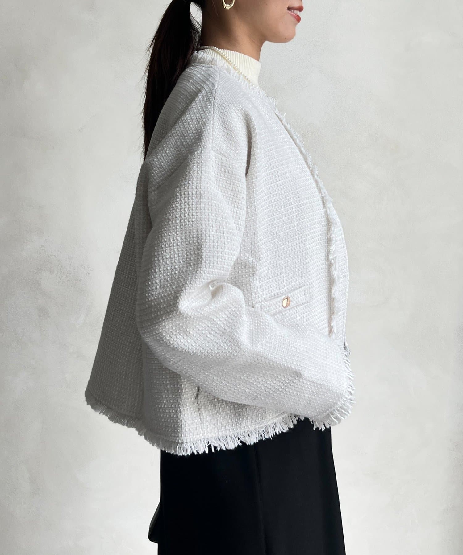 ポケットや袖口、前立て部分がフリンジ仕立てになっており、ゴールドボタンが高級感と華やかさをプラス♪