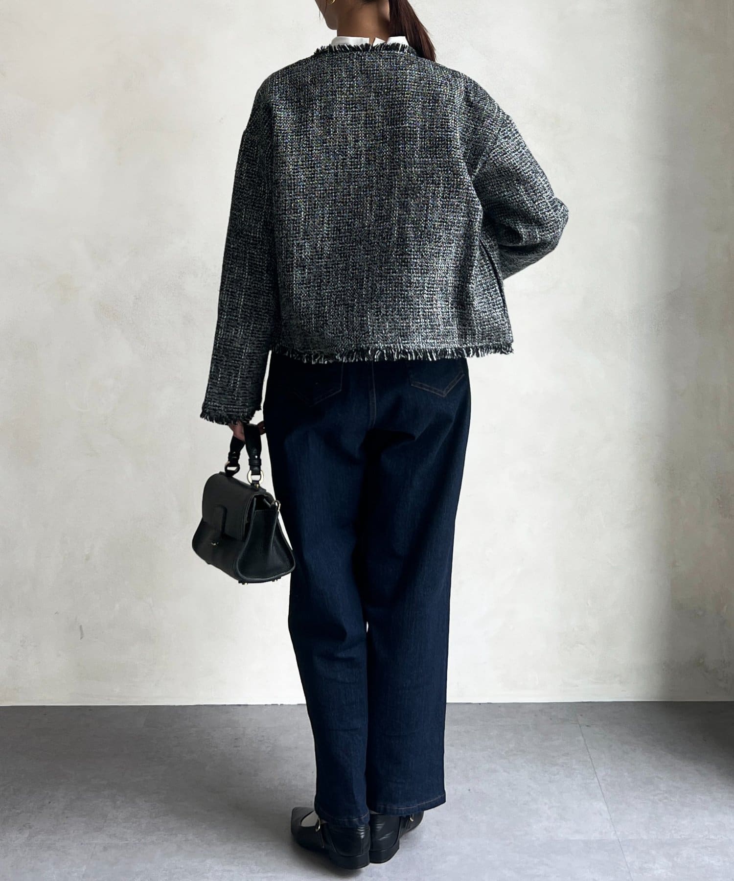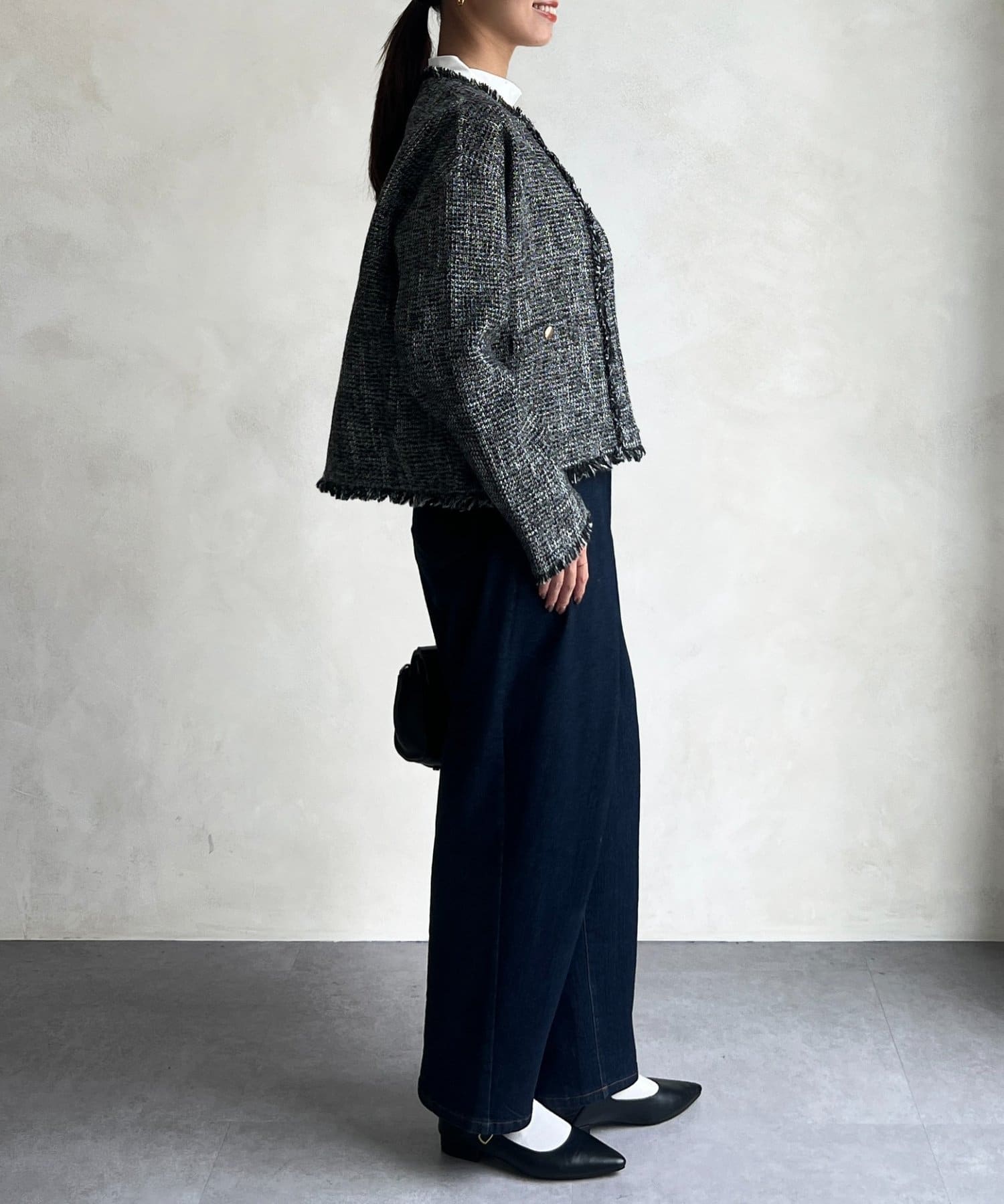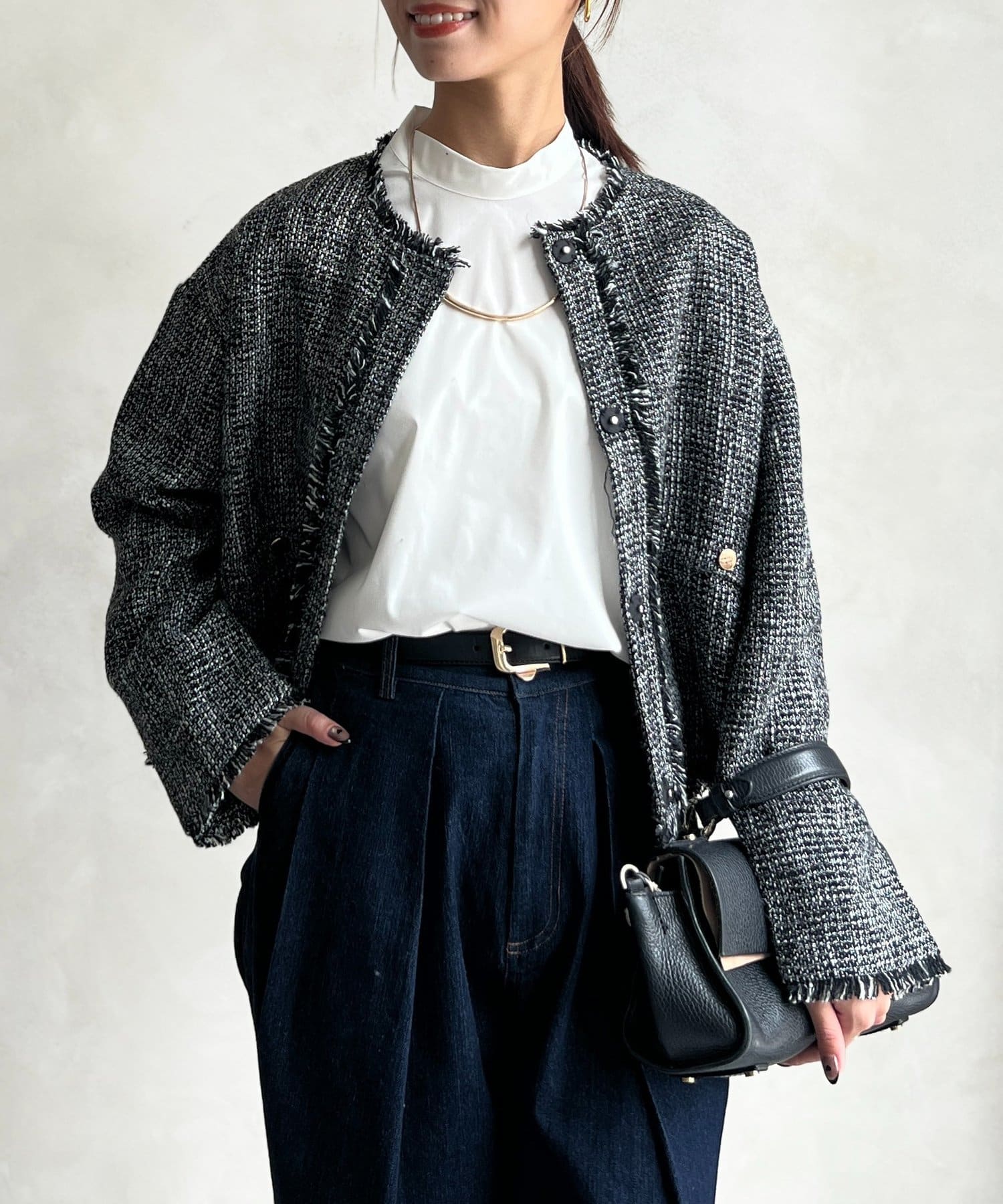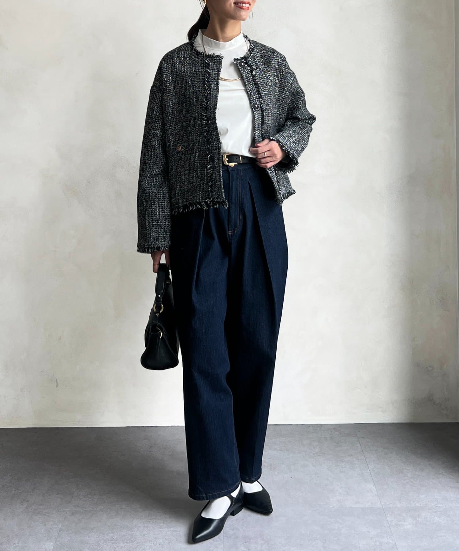 きちんと感のあるツイードジャケットは、デニムなどカジュアルなアイテムとの組み合わせで抜け感を出すのがおすすめです。