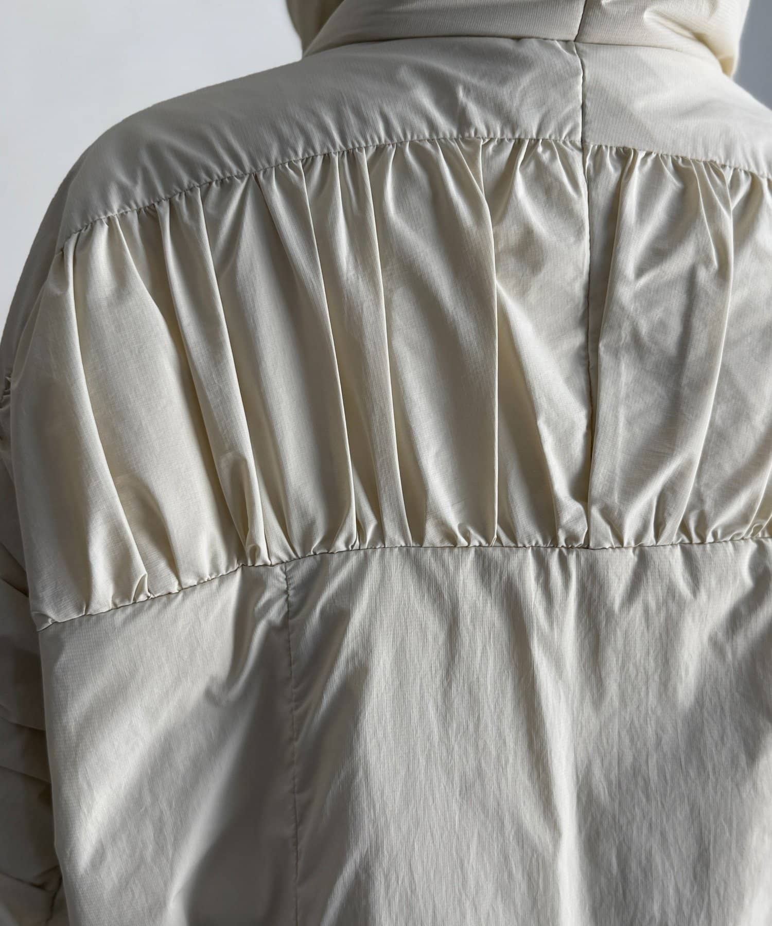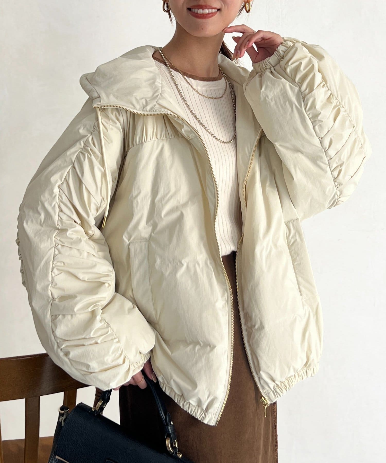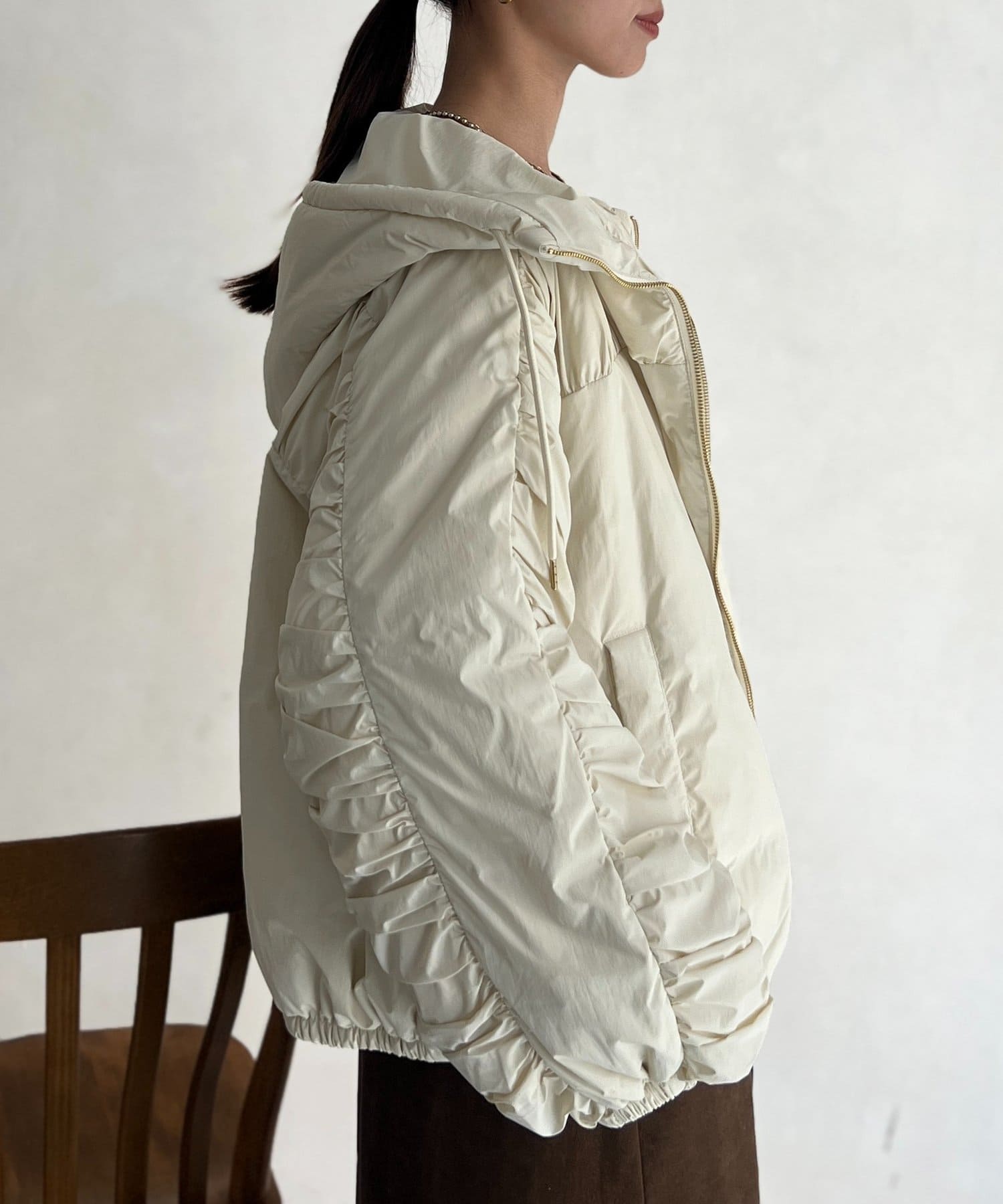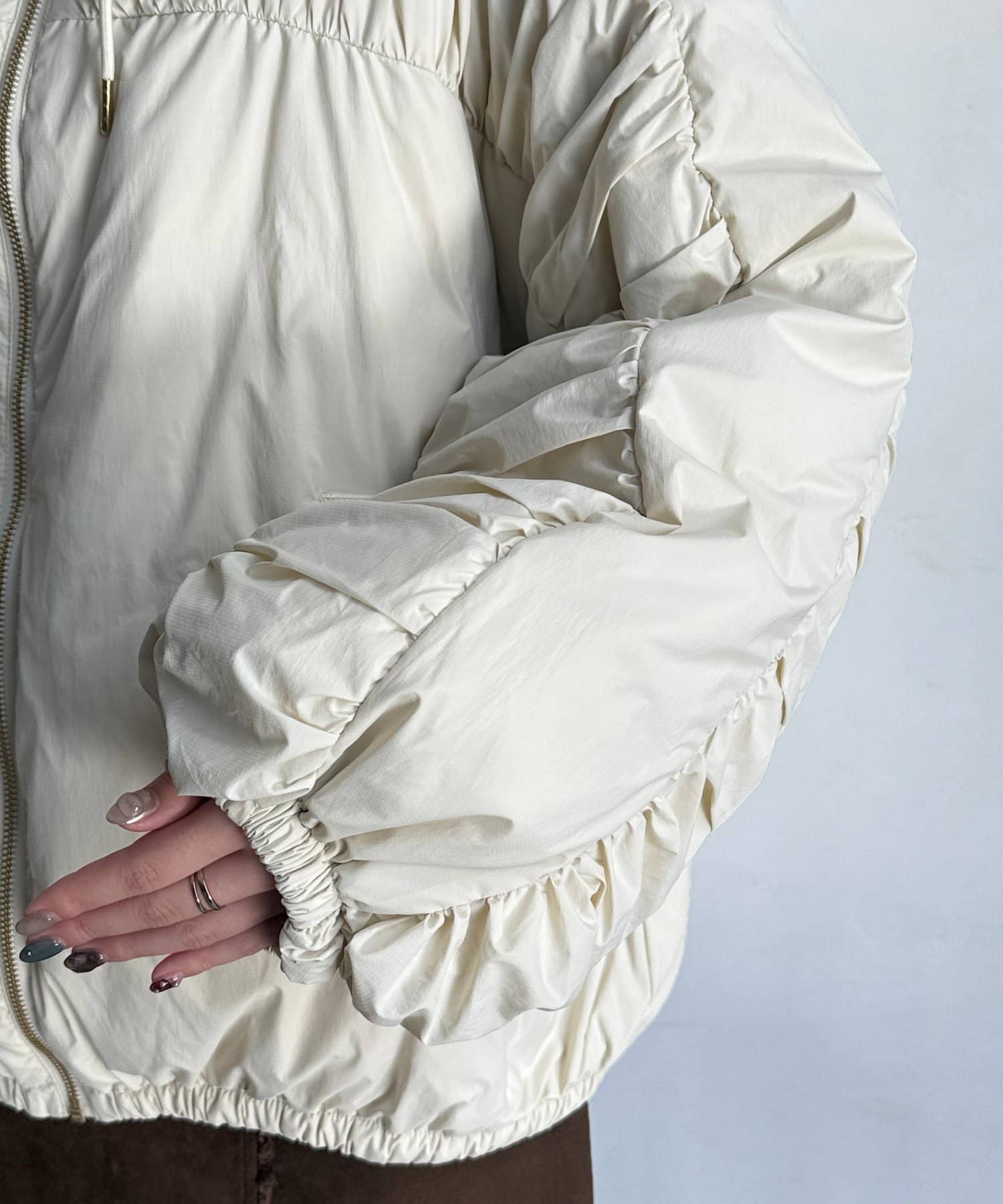 ティアード切替と背面から袖口まで施されたギャザーが特徴的なダウン。