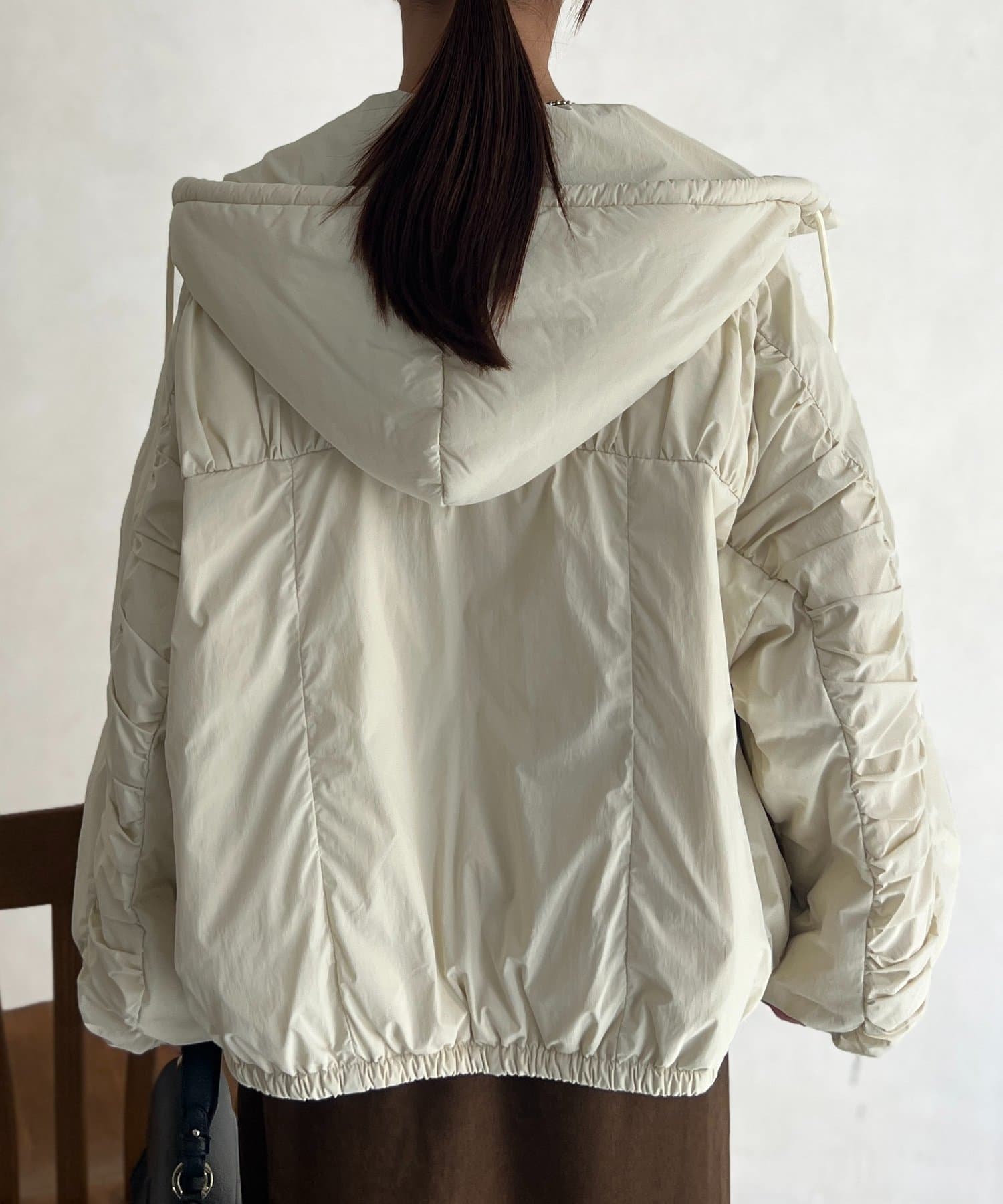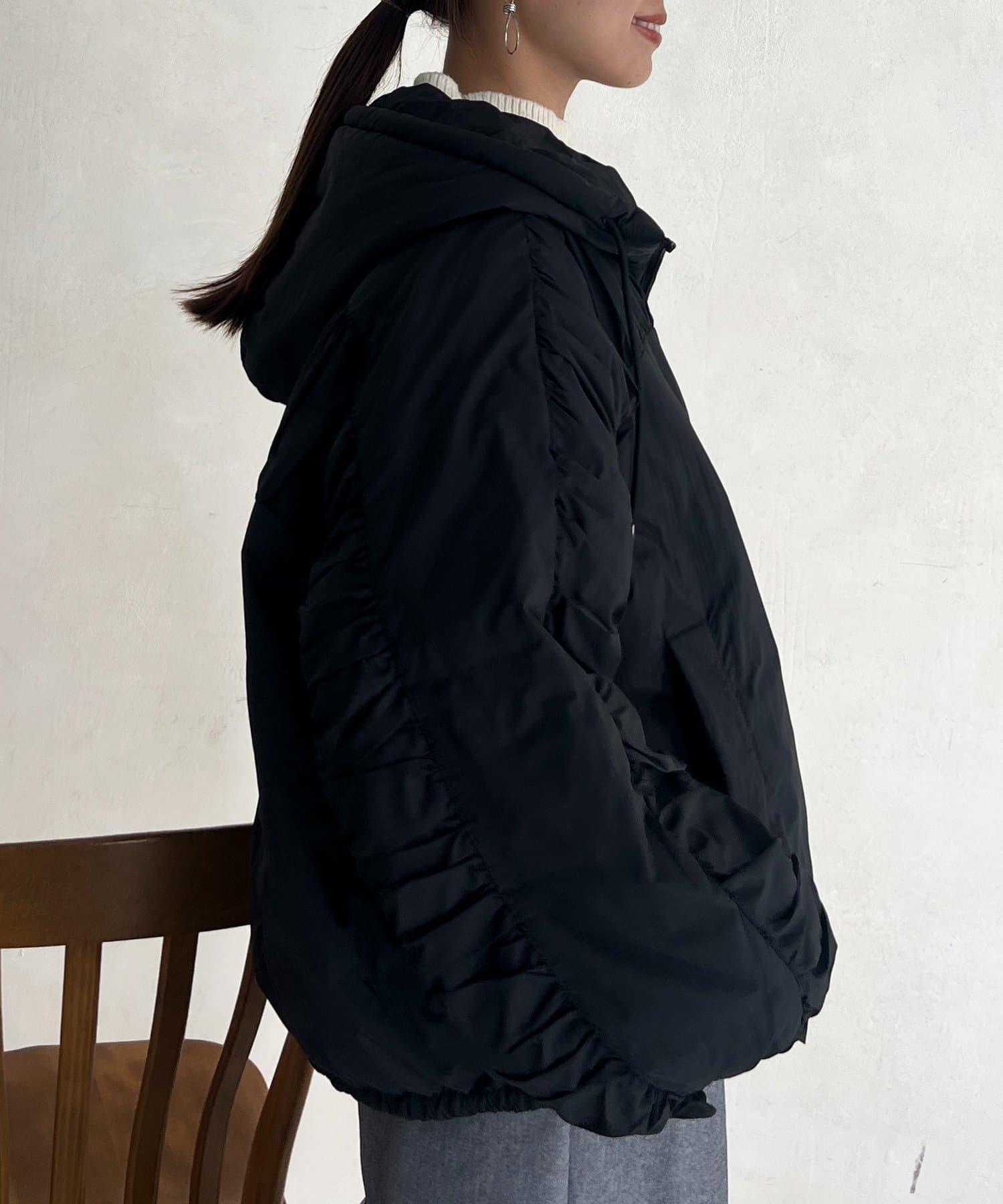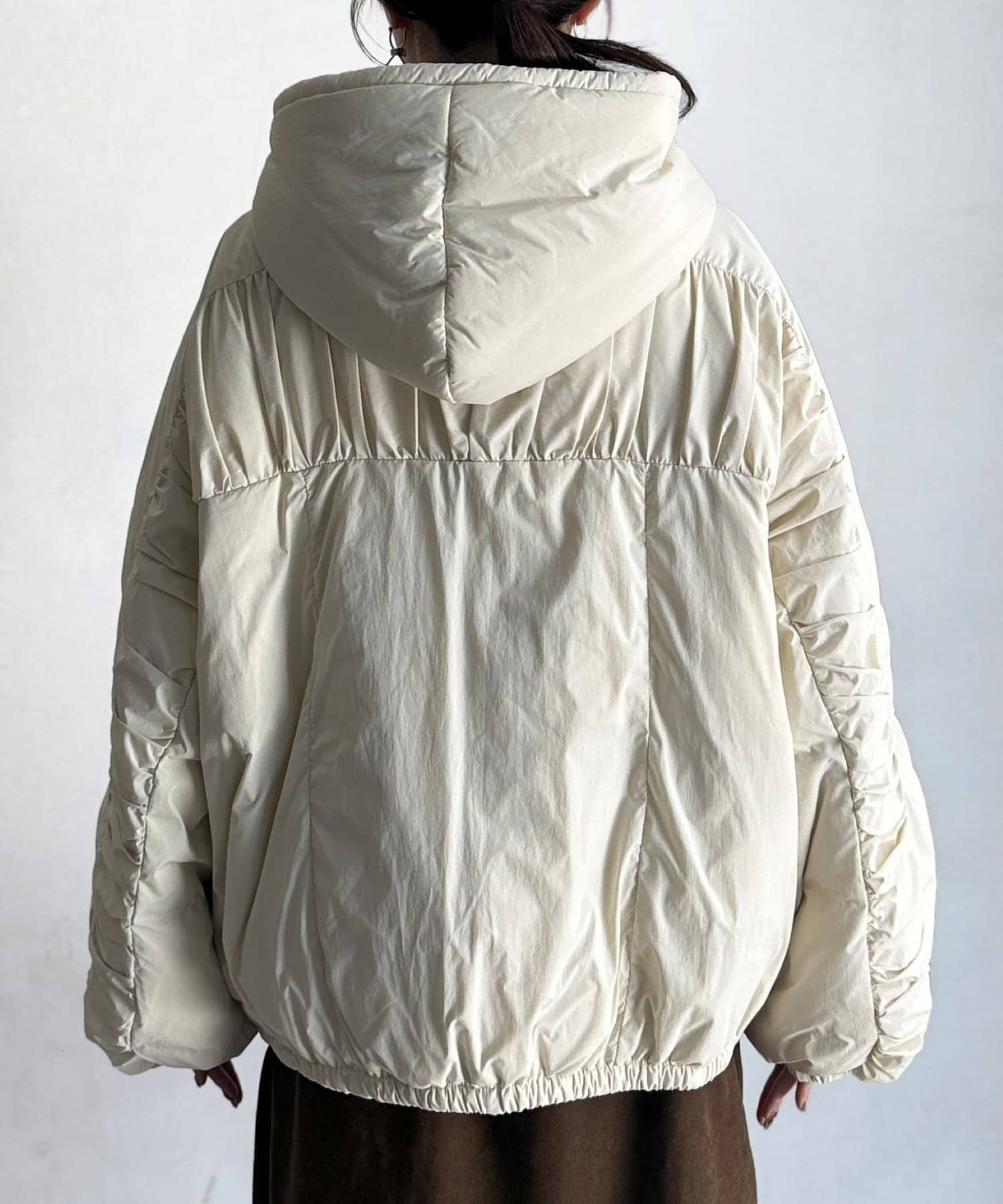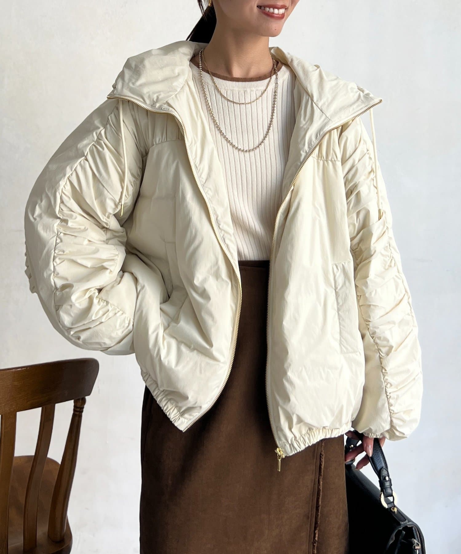 ティアード切替と背面から袖口まで施されたギャザーが特徴的なダウン。
