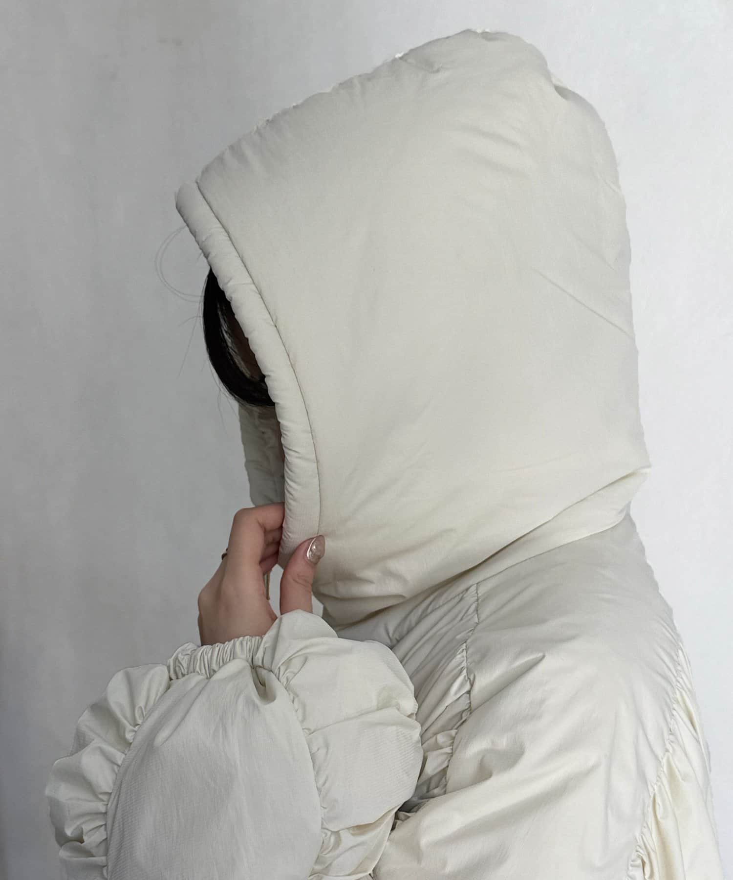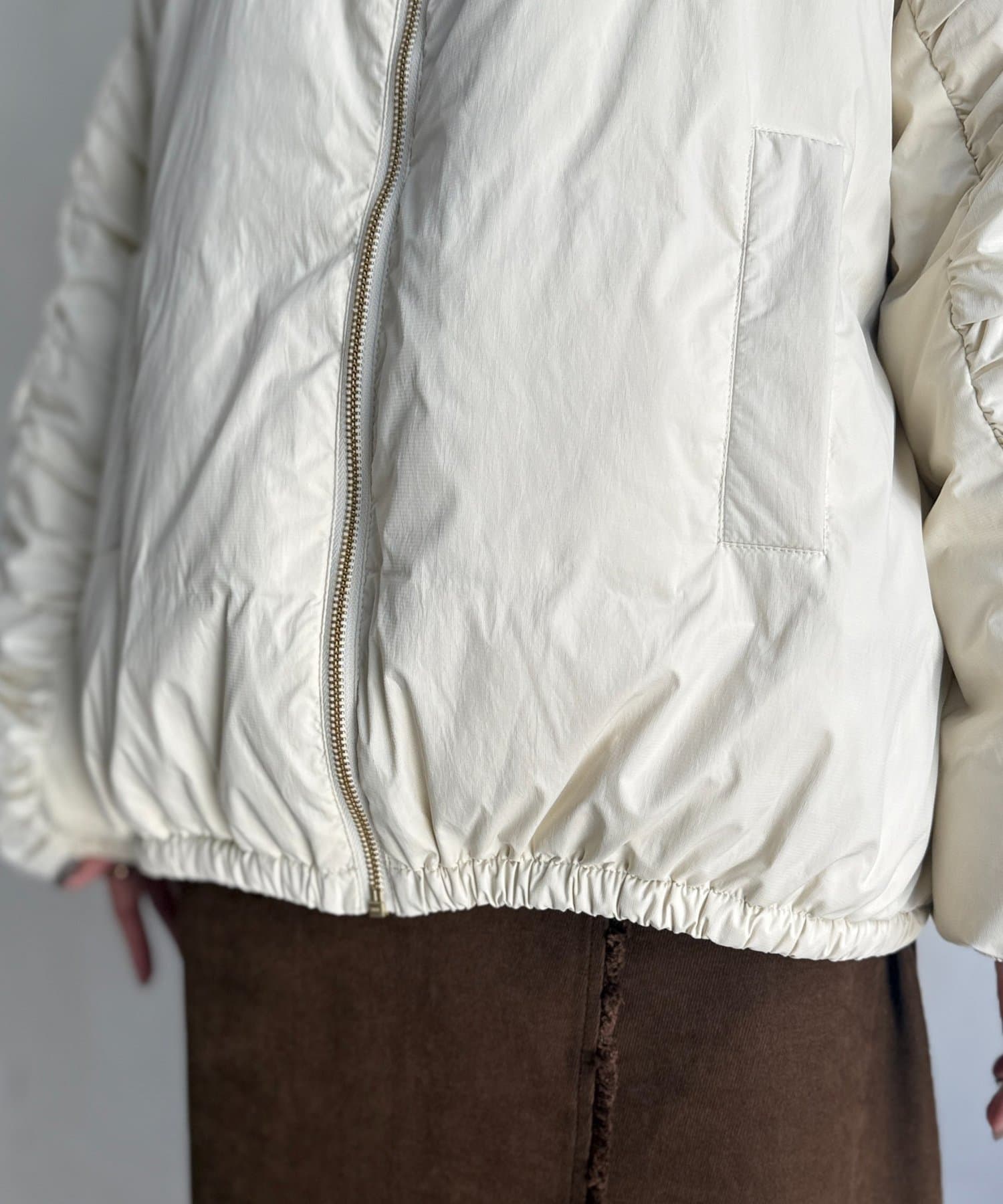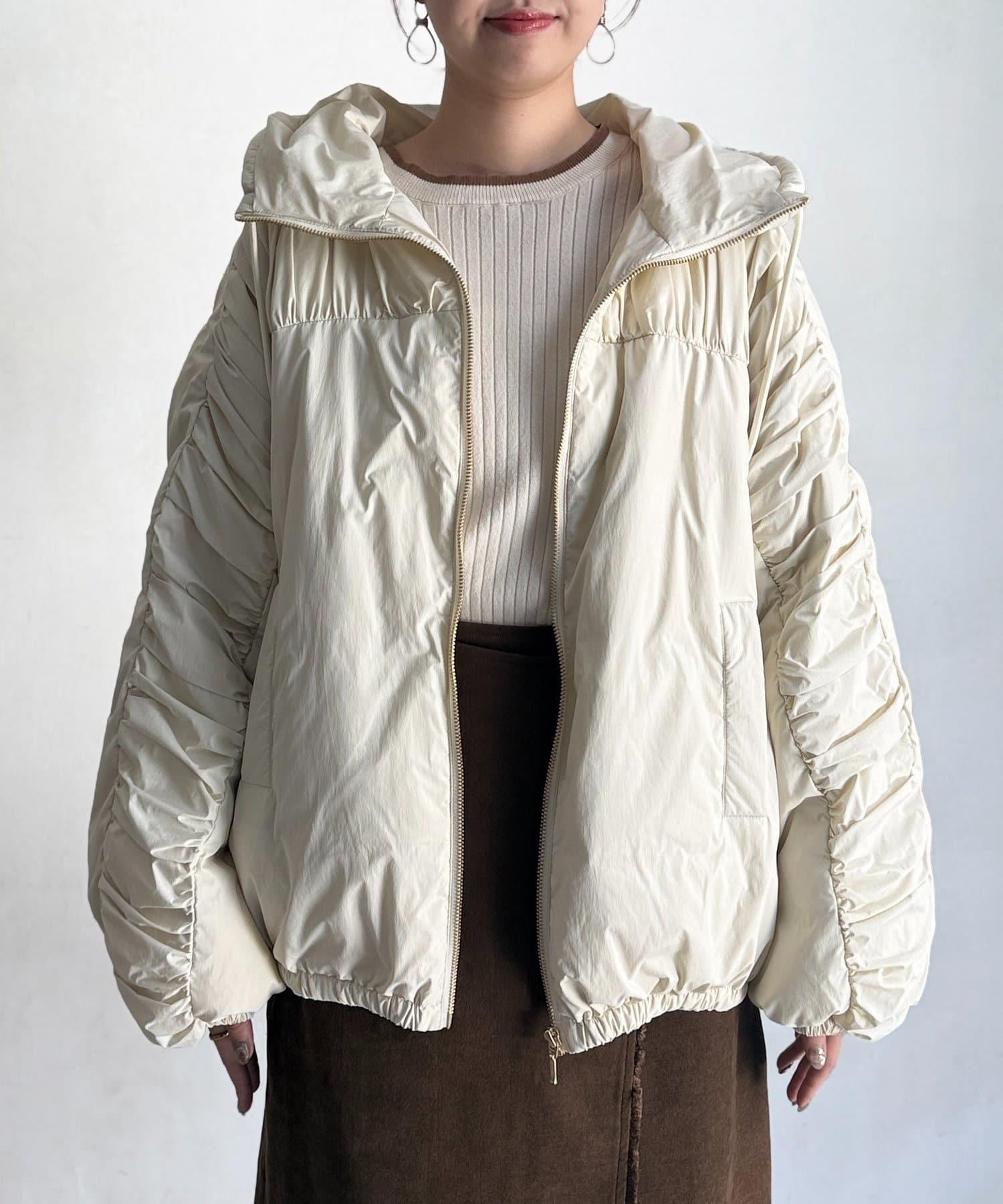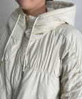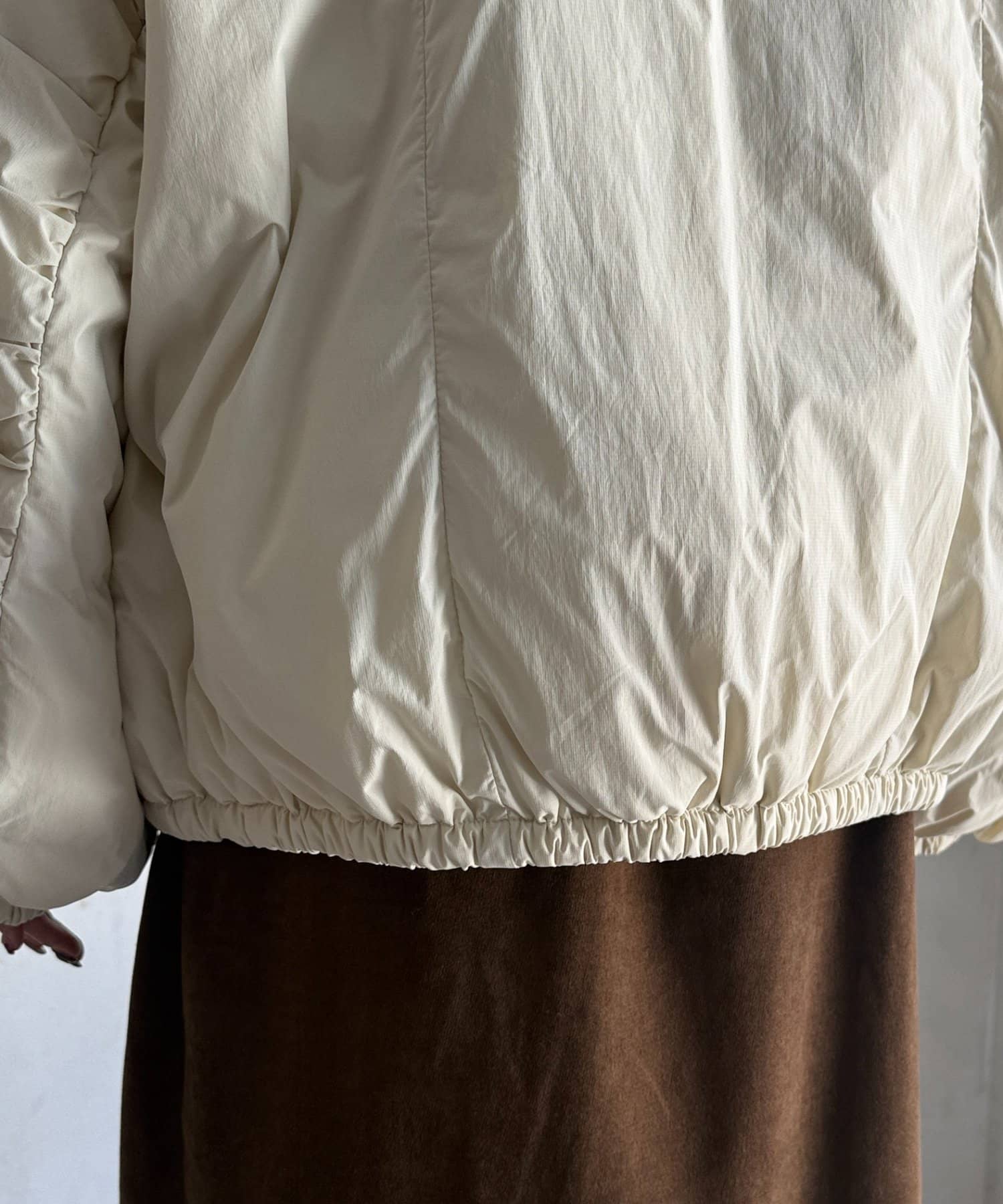 ティアード切替と背面から袖口まで施されたギャザーが特徴的なダウン。