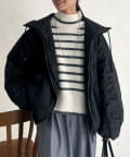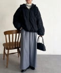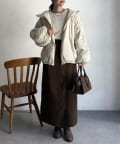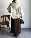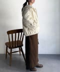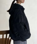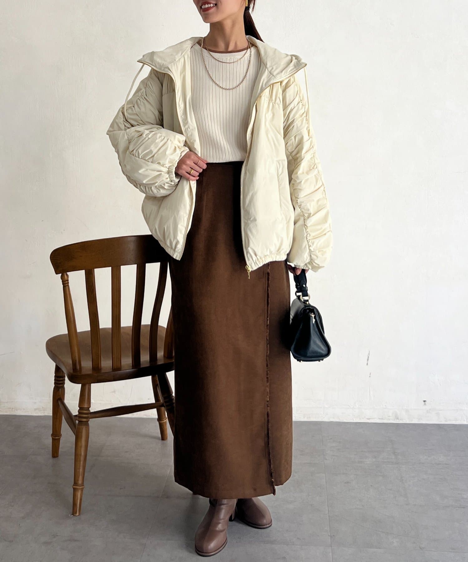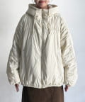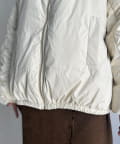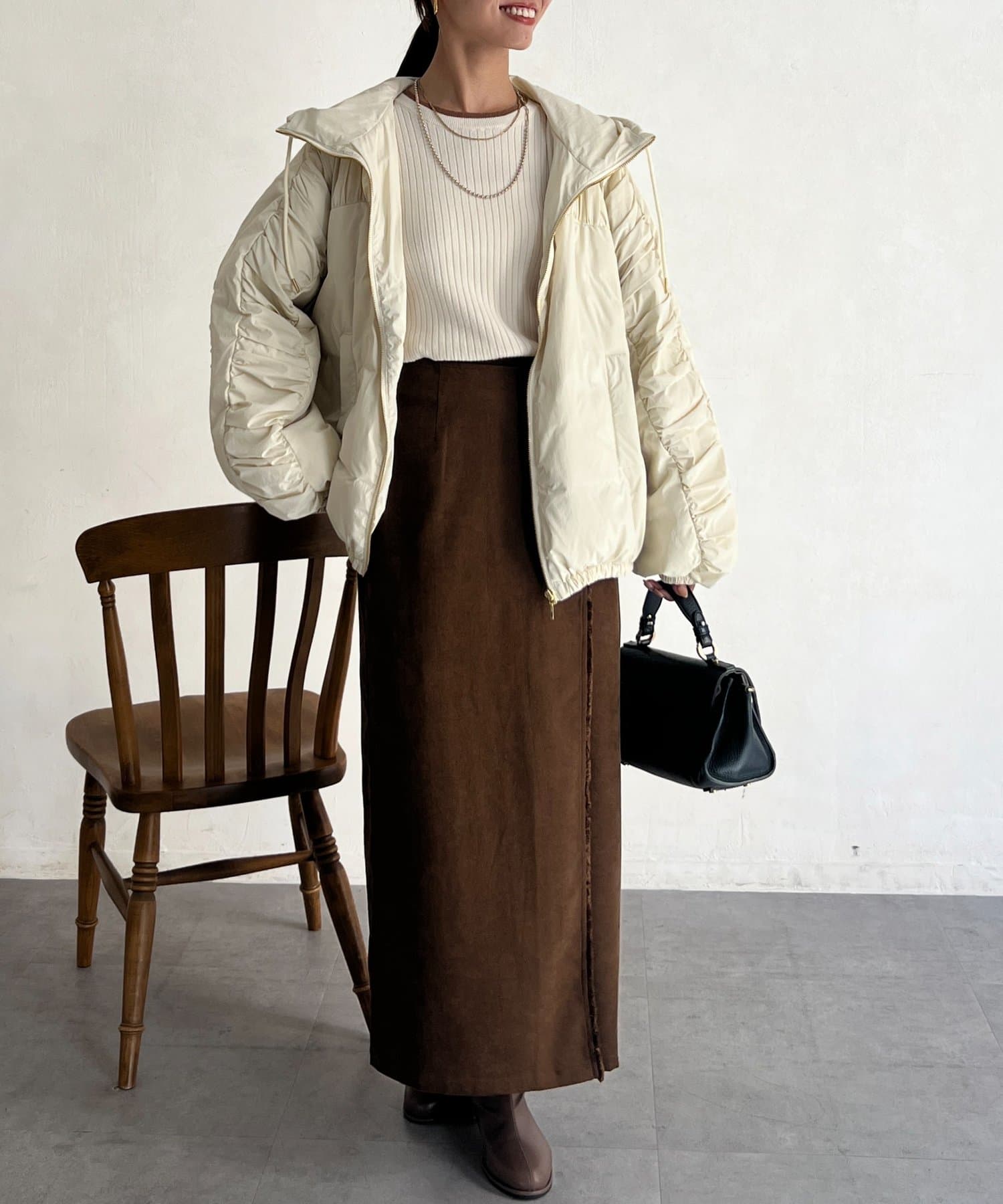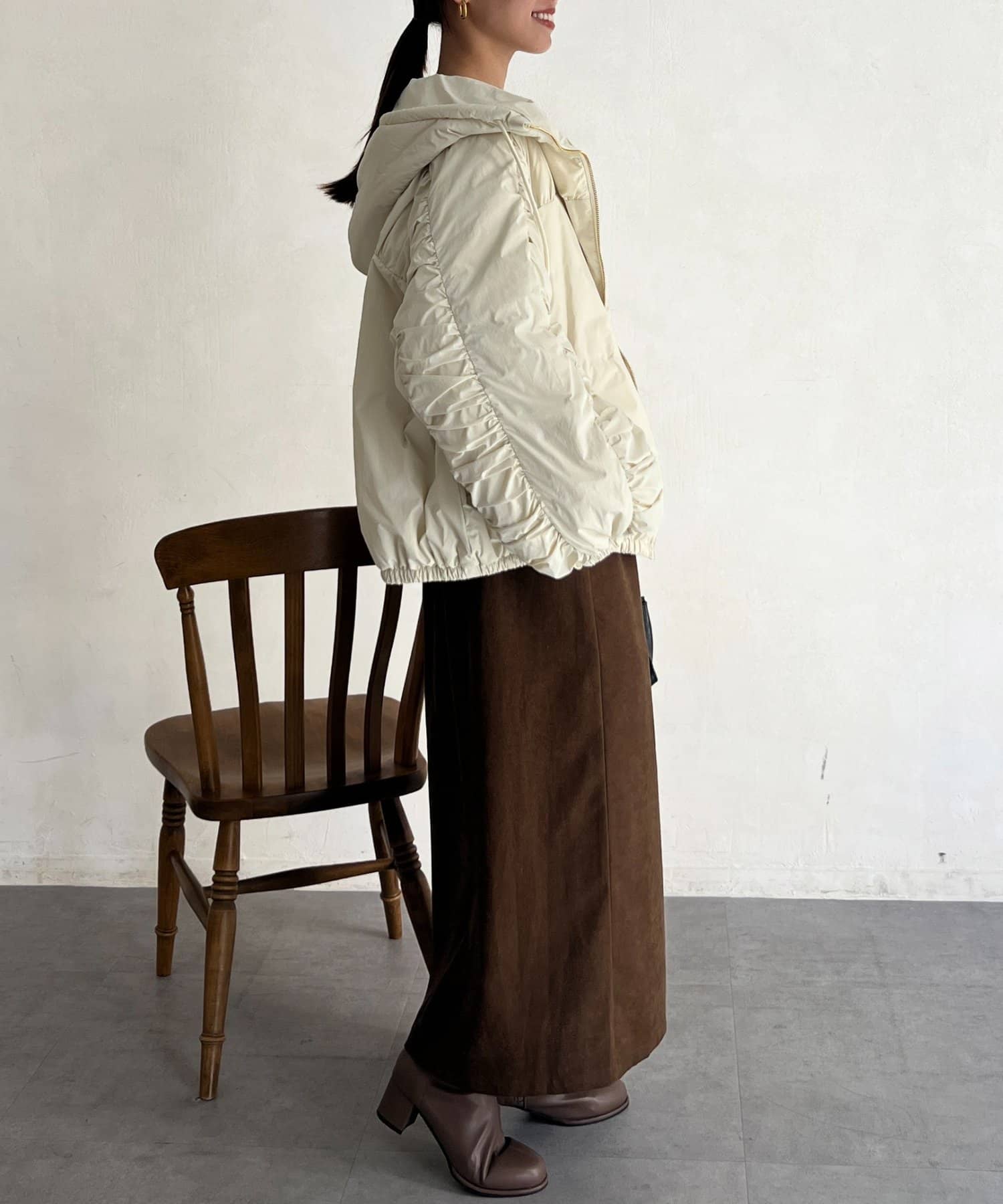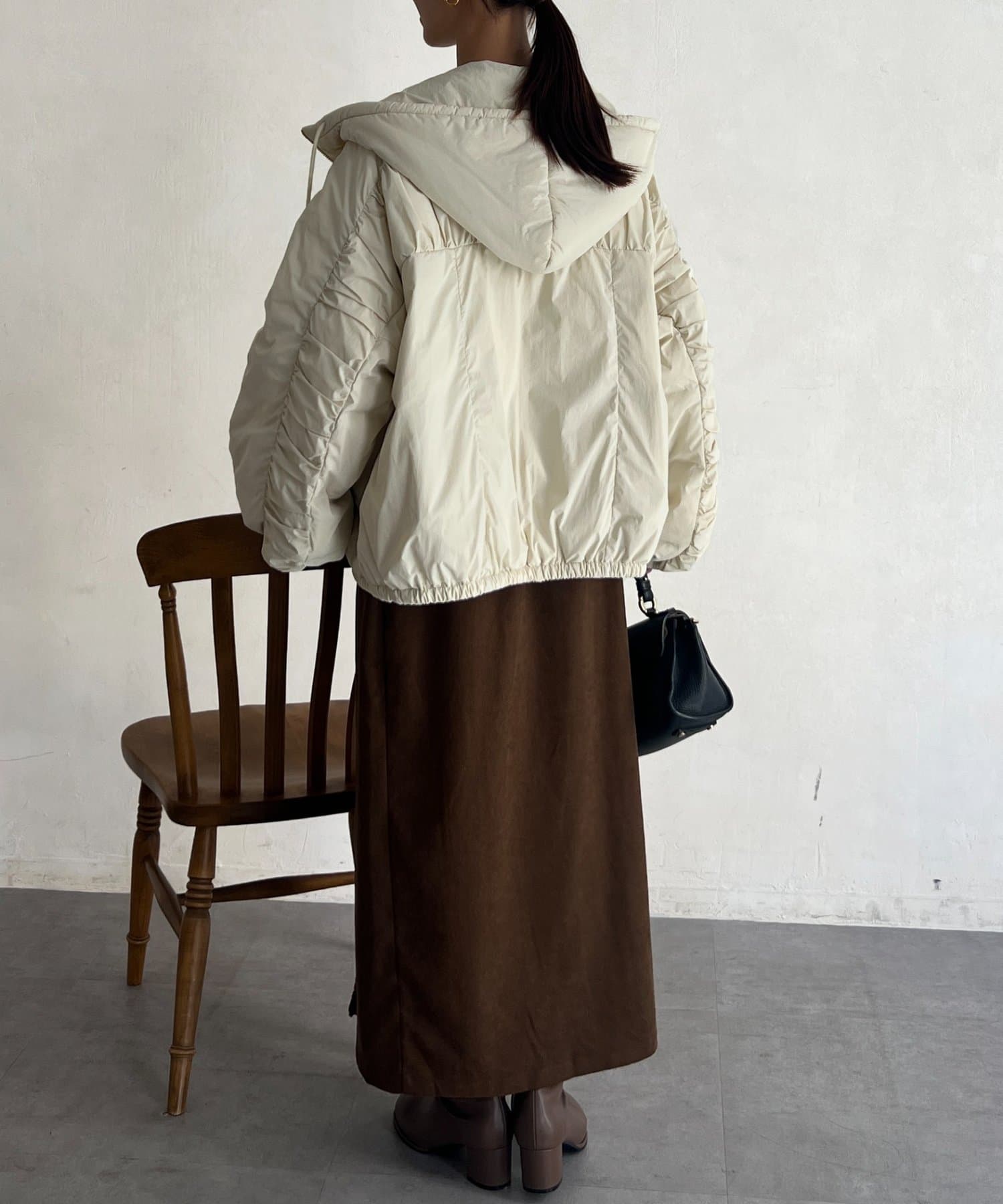 ティアード切替と背面から袖口まで施されたギャザーが特徴的なダウン。