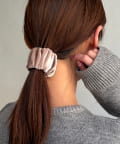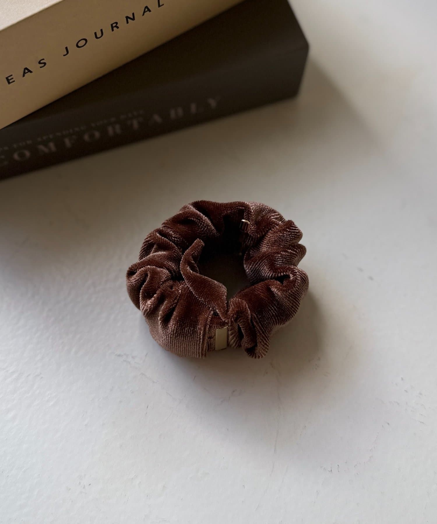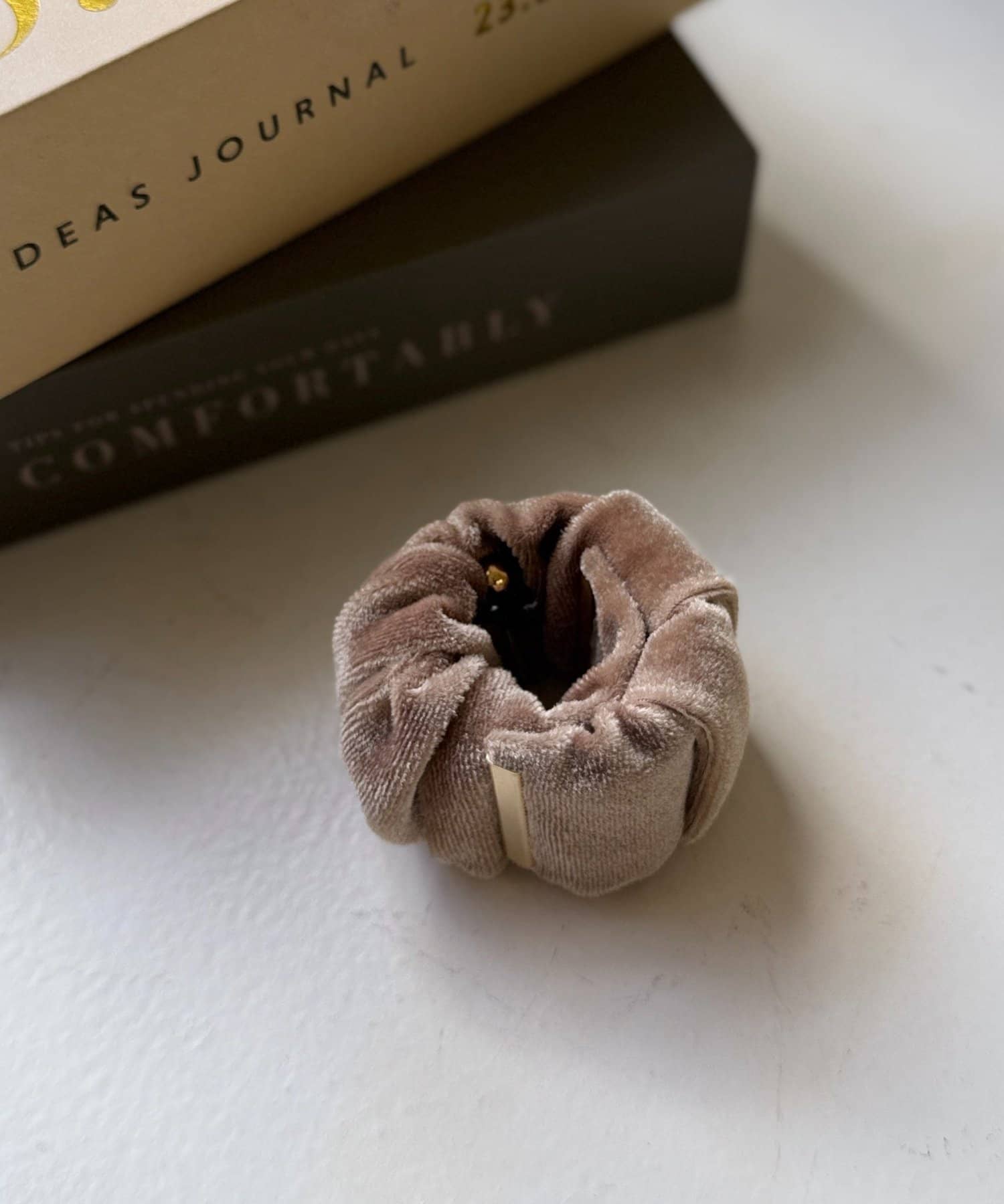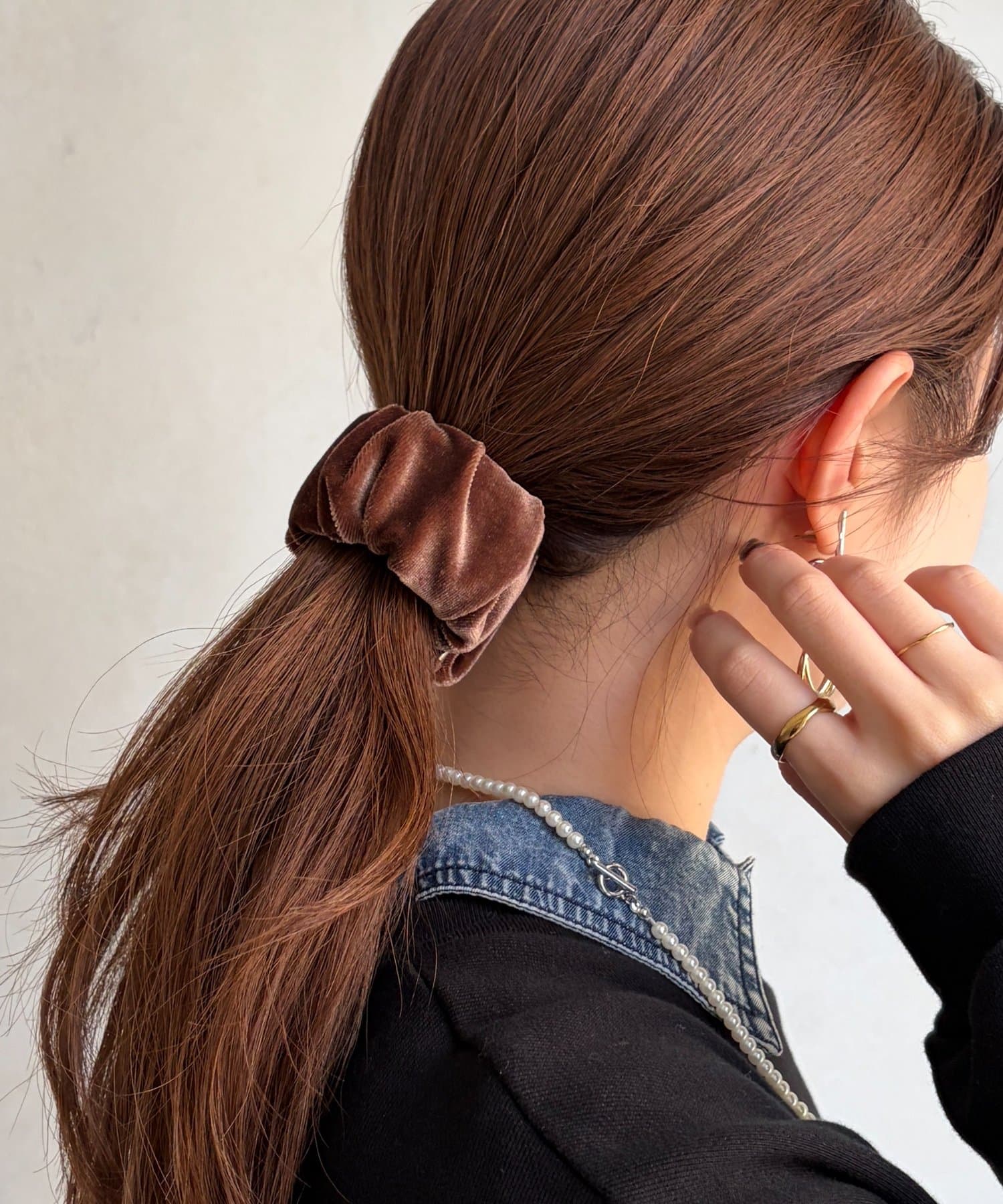 ベロア素材のシュシュが着いているようにみえて、取り入れるだけで一気にトレンド感のあるスタイリングが完成◎