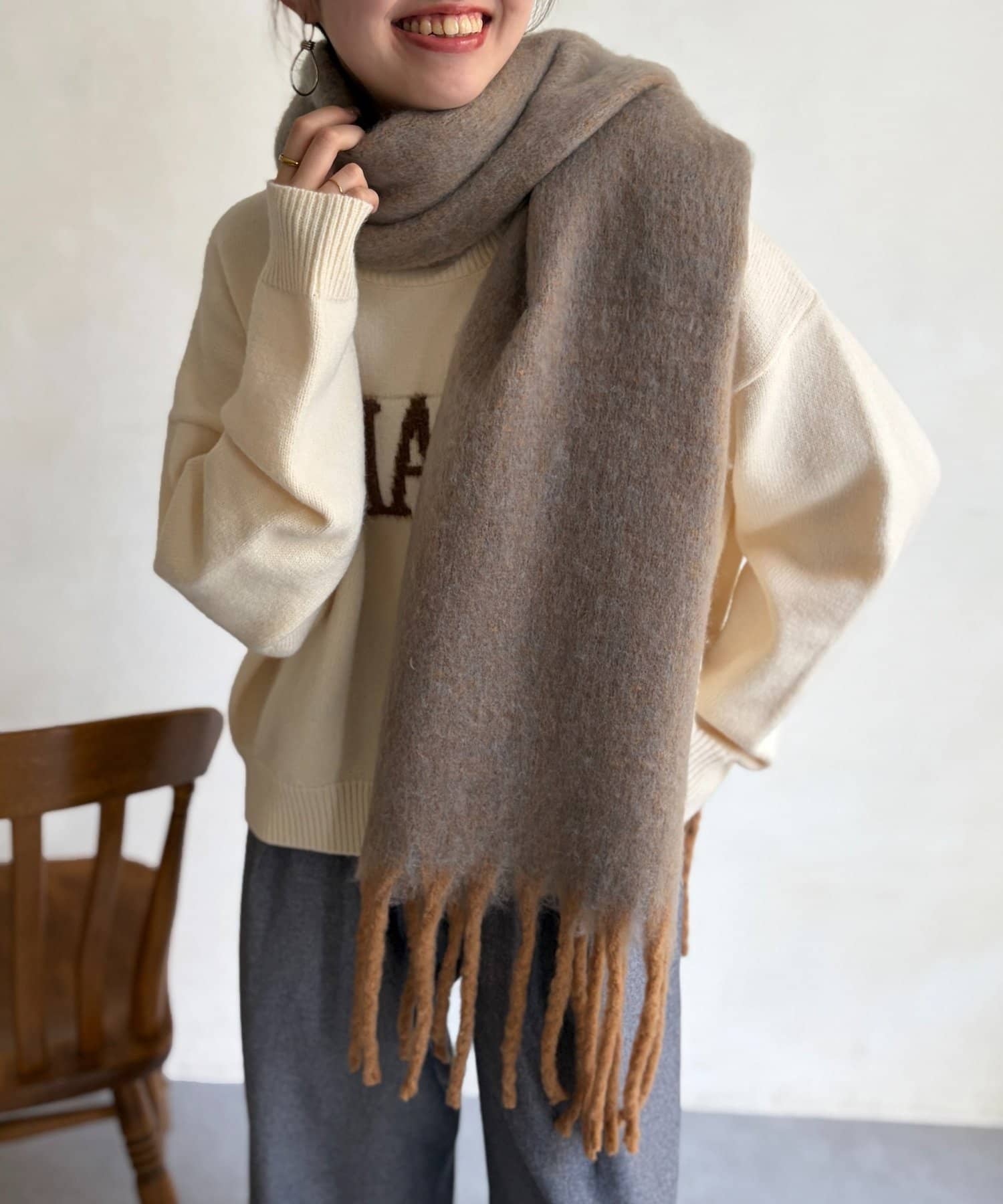 さまざまな巻き方を楽しめる大判マフラー