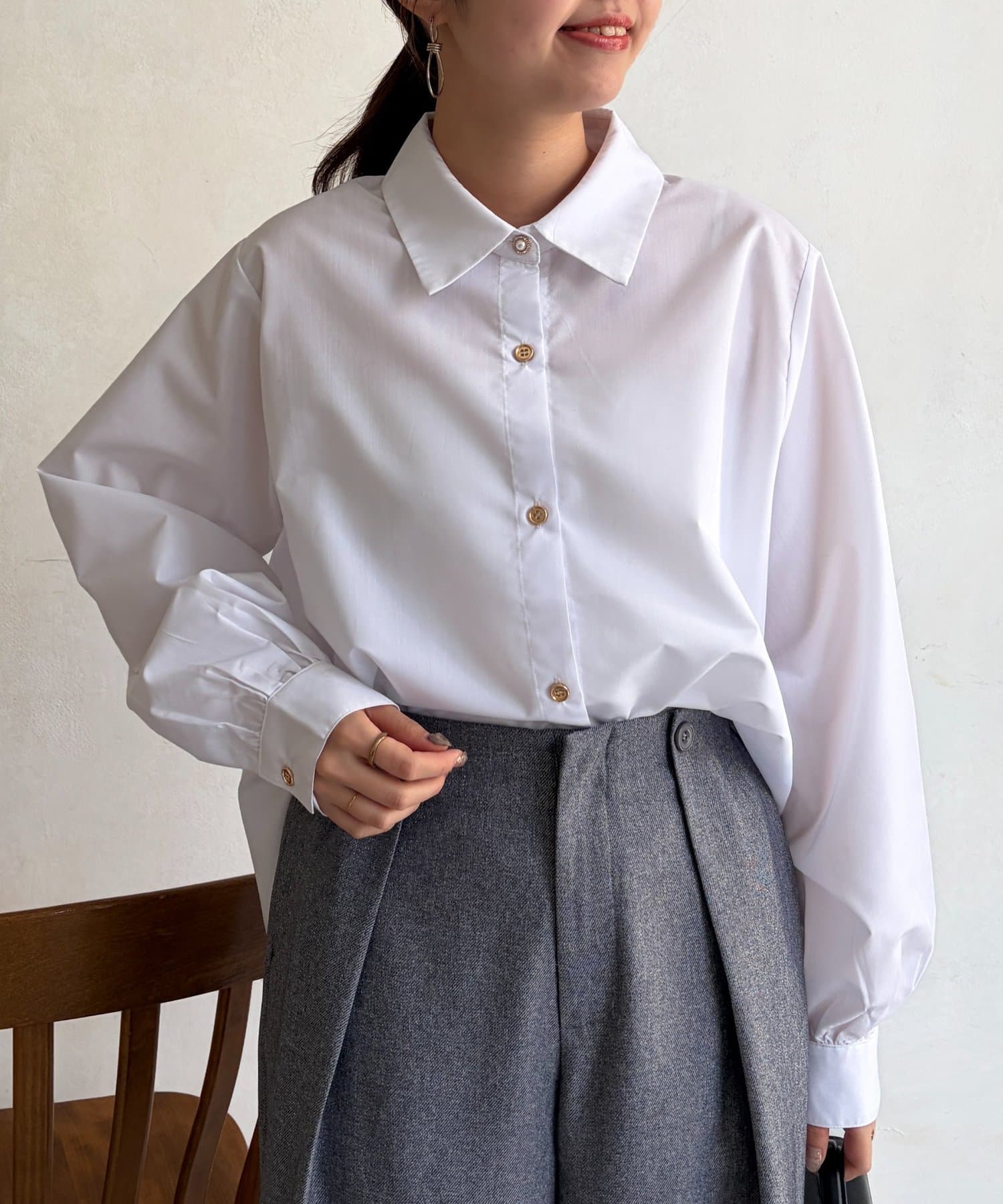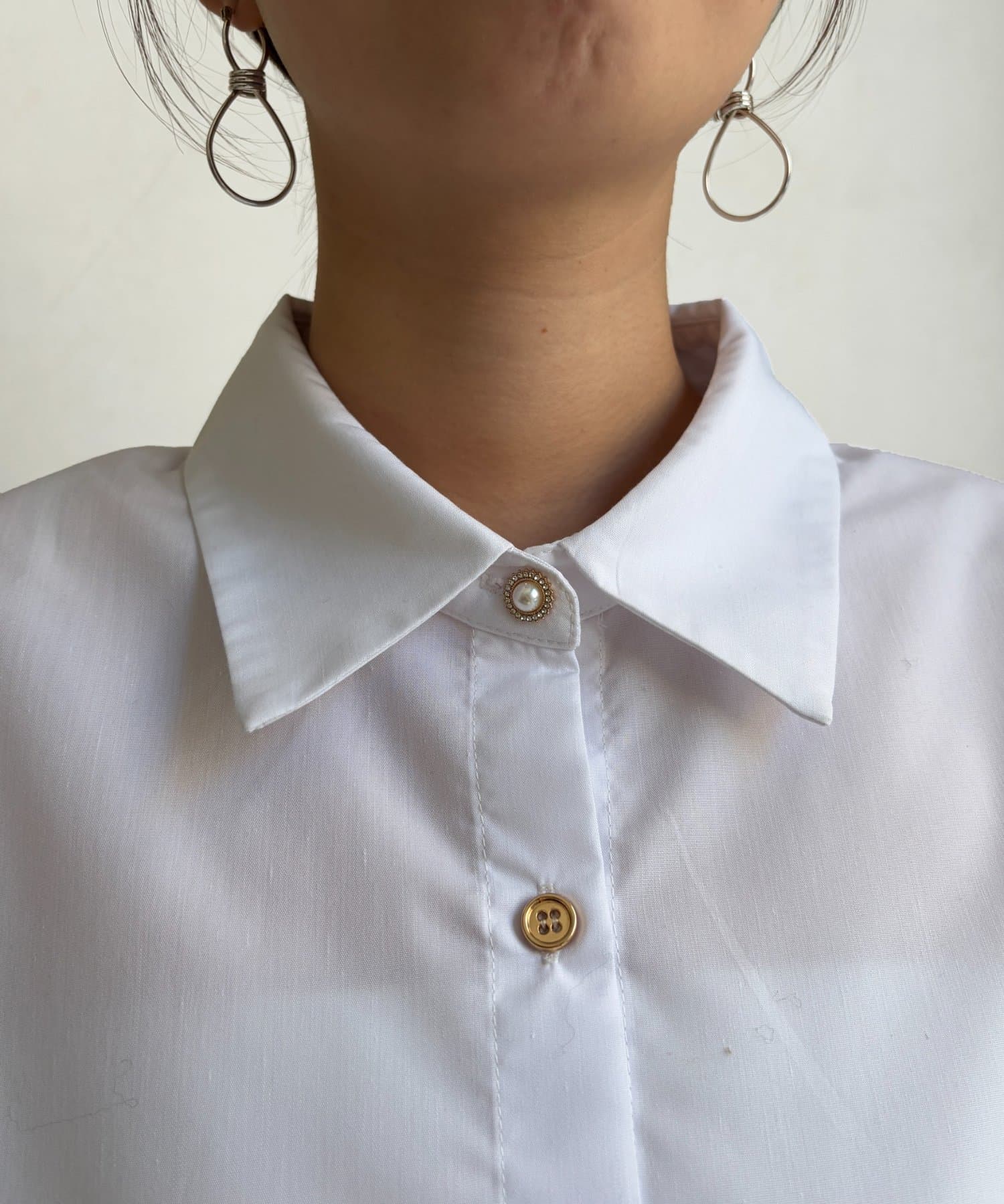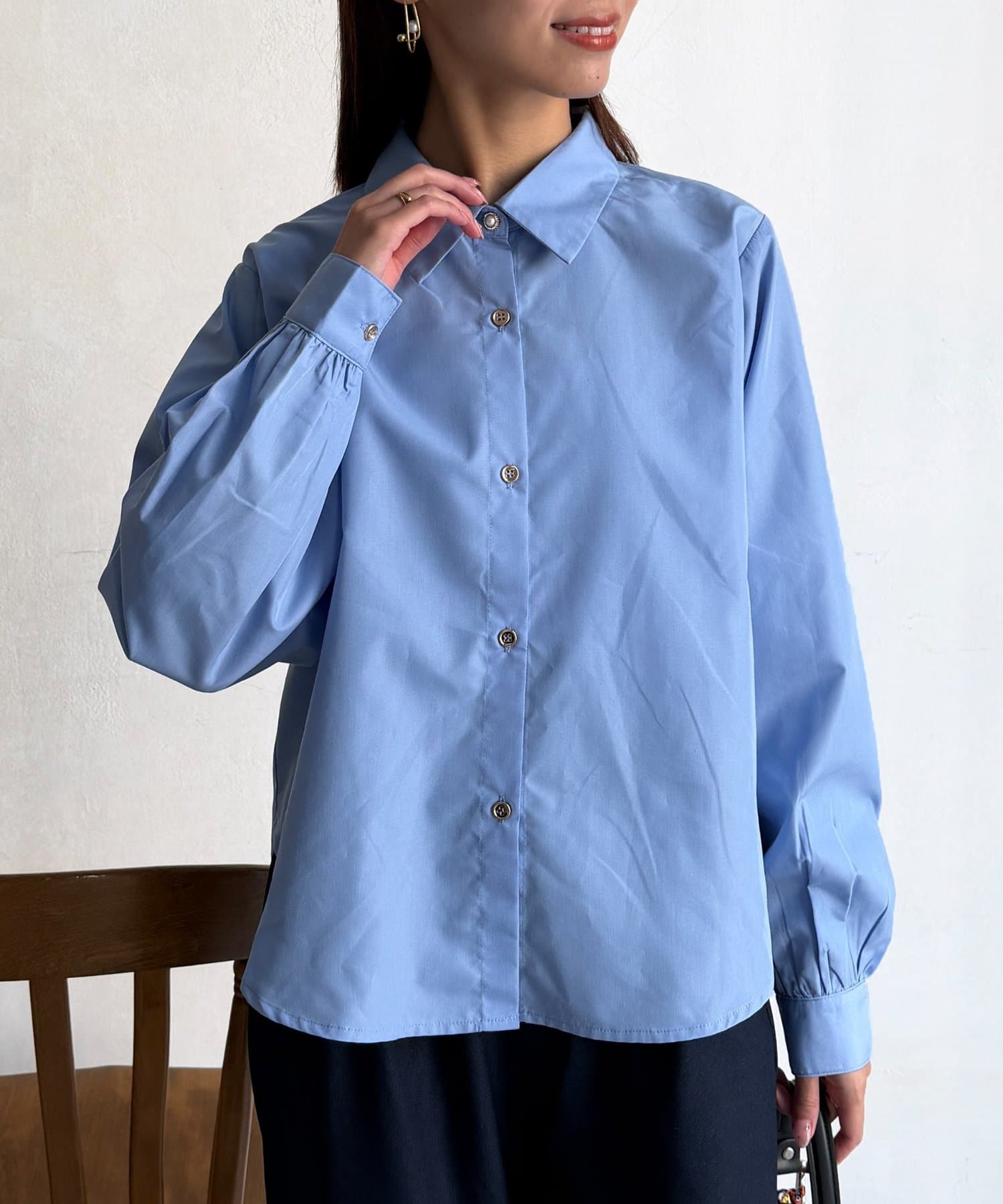 トップのビジューボタンがコーディネートのアクセントになった、シンプルで着まわしやすいアイテム。
