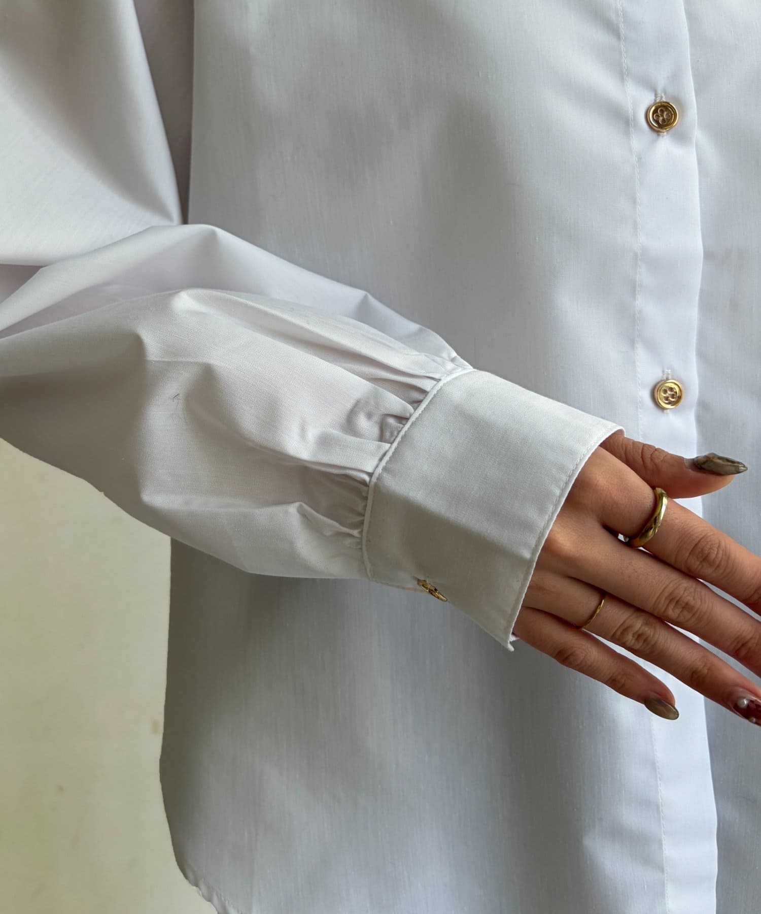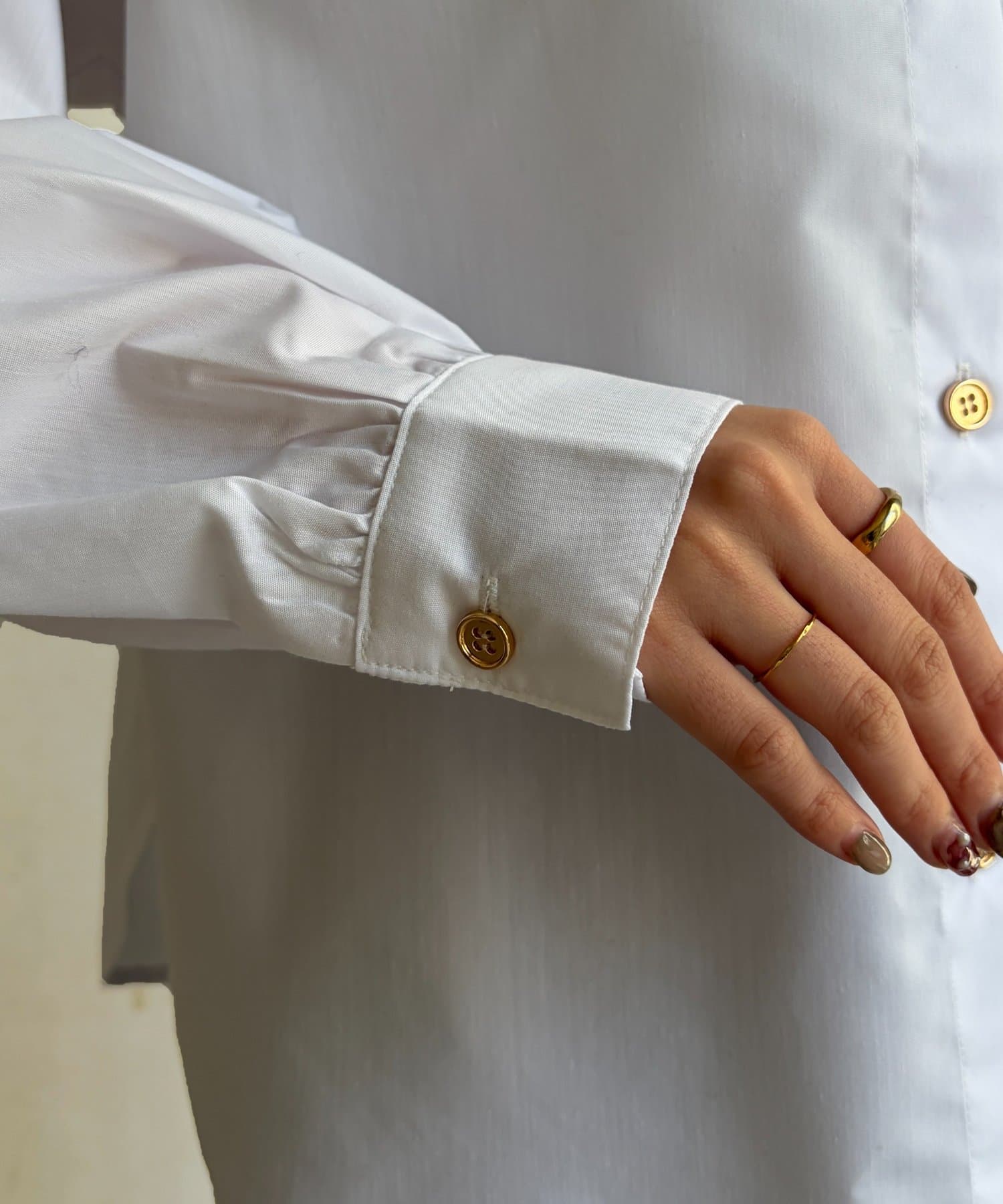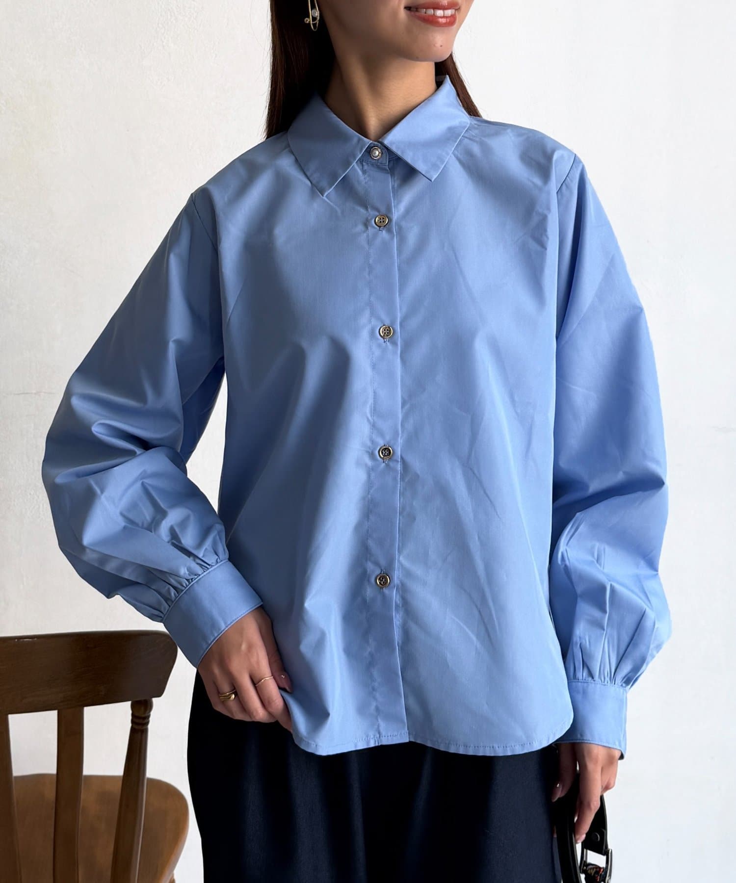 トップのビジューボタンがコーディネートのアクセントになった、シンプルで着まわしやすいアイテム。