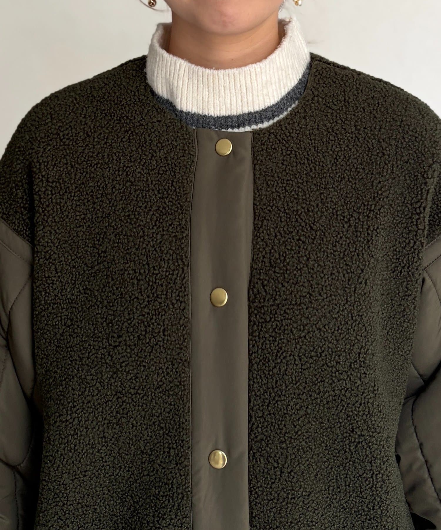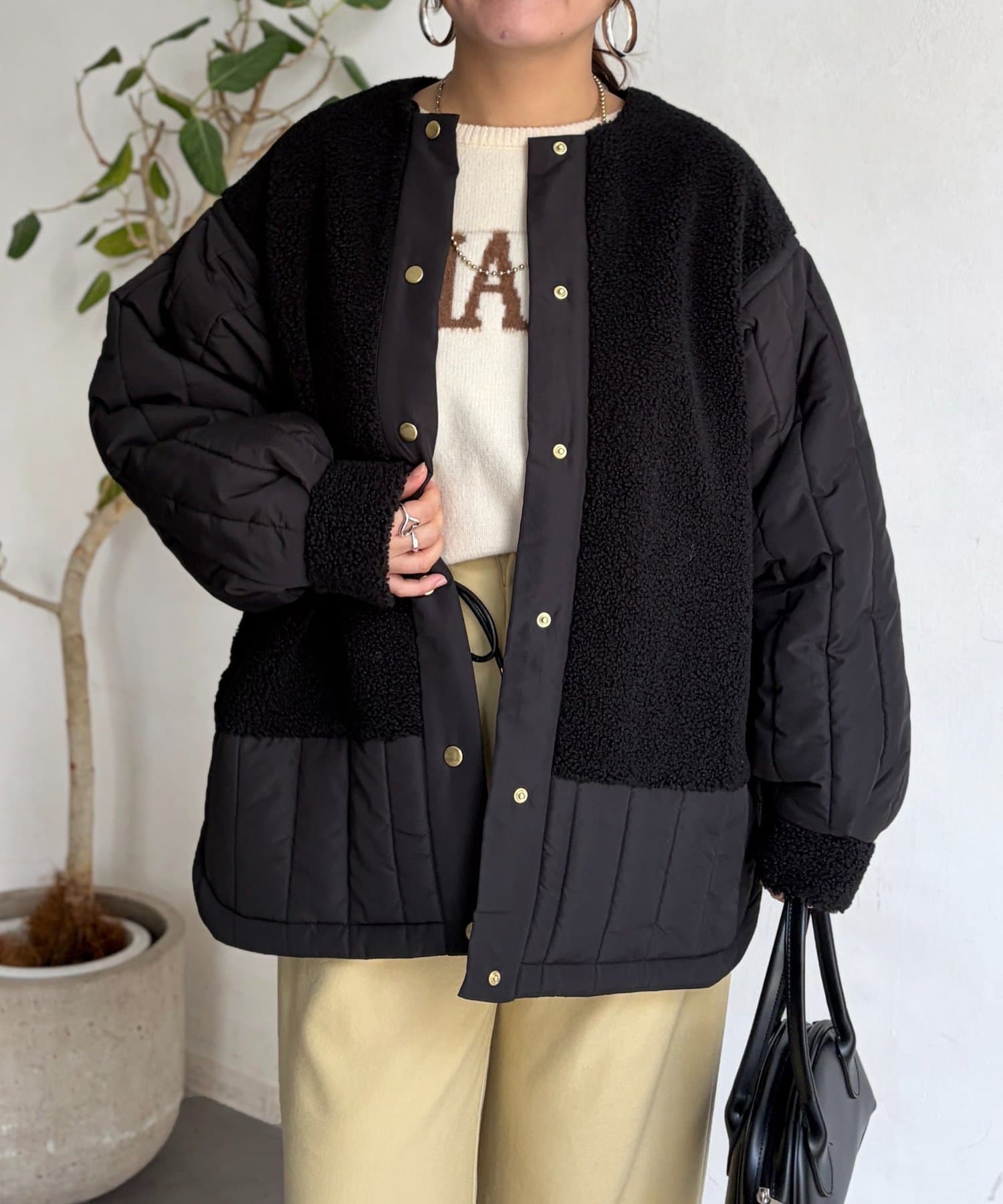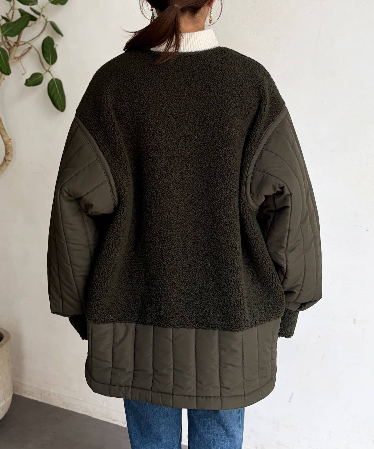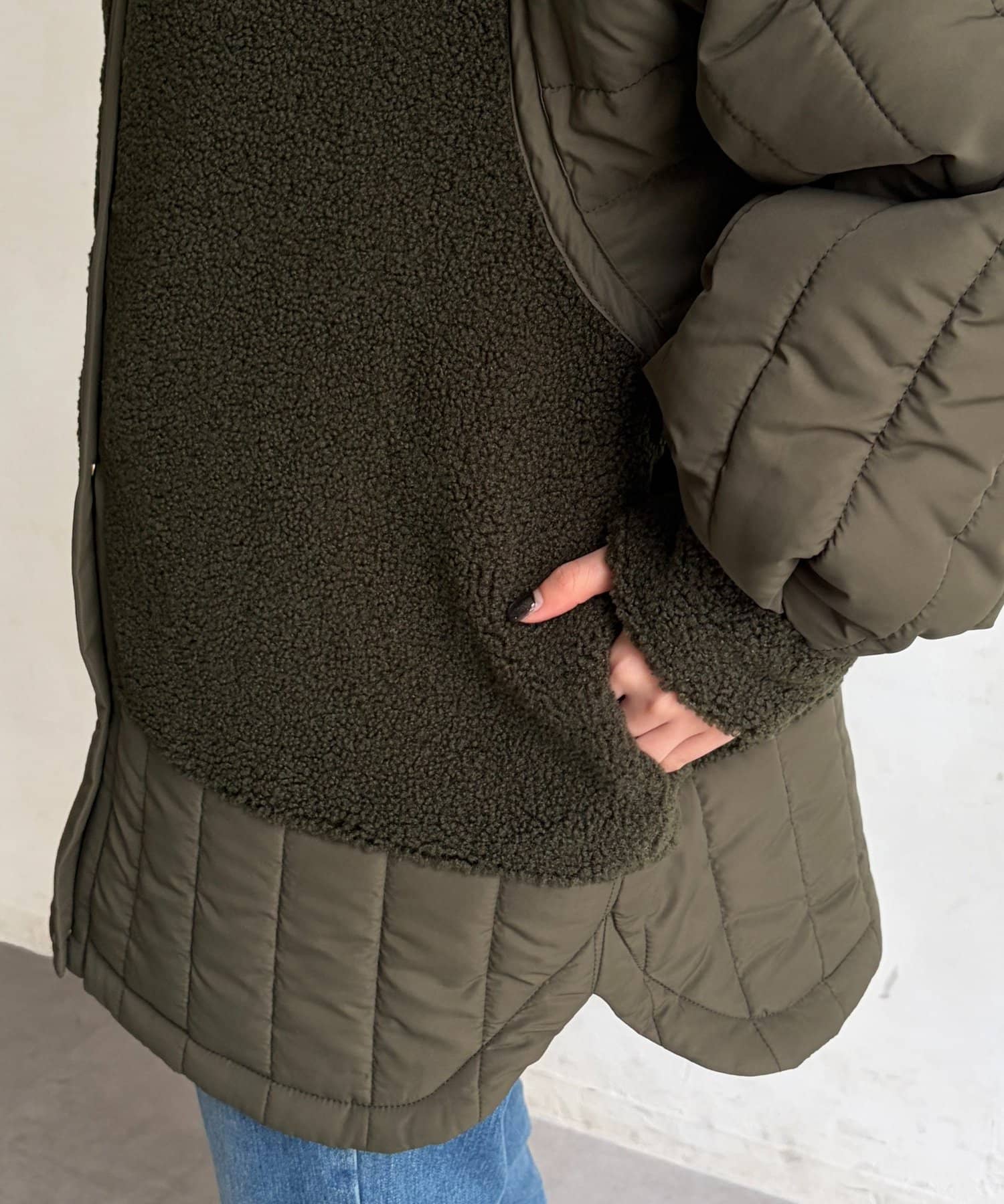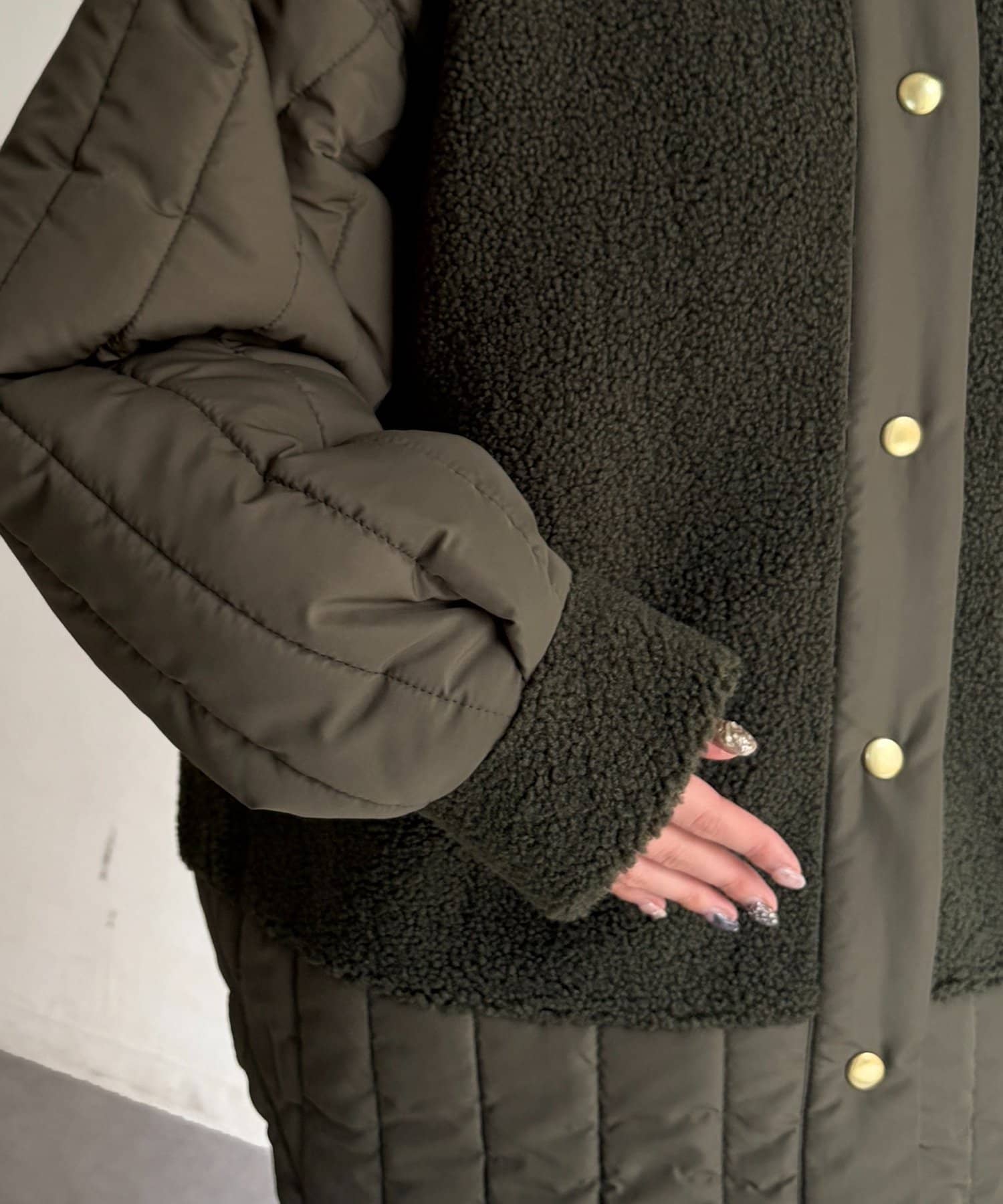 ふわふわのボア素材と品のある質感のキルティング素材を切替で配置したドッキングコート。
