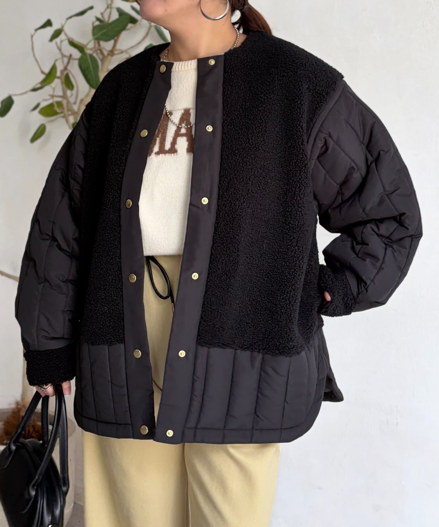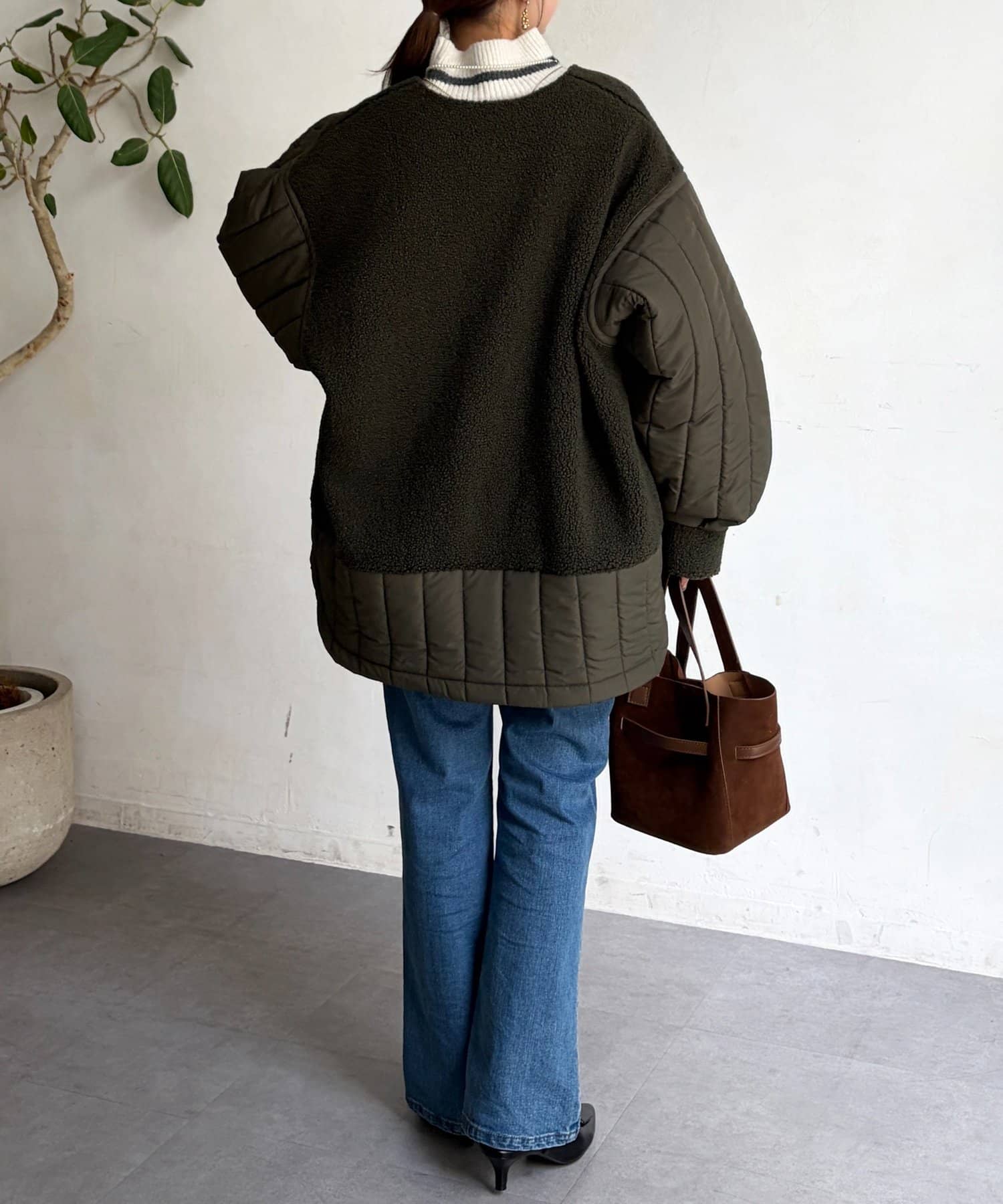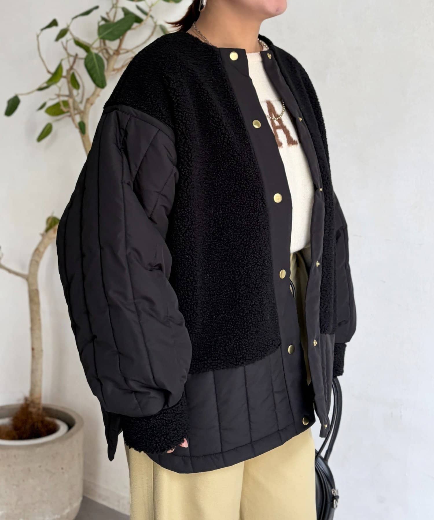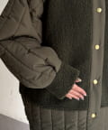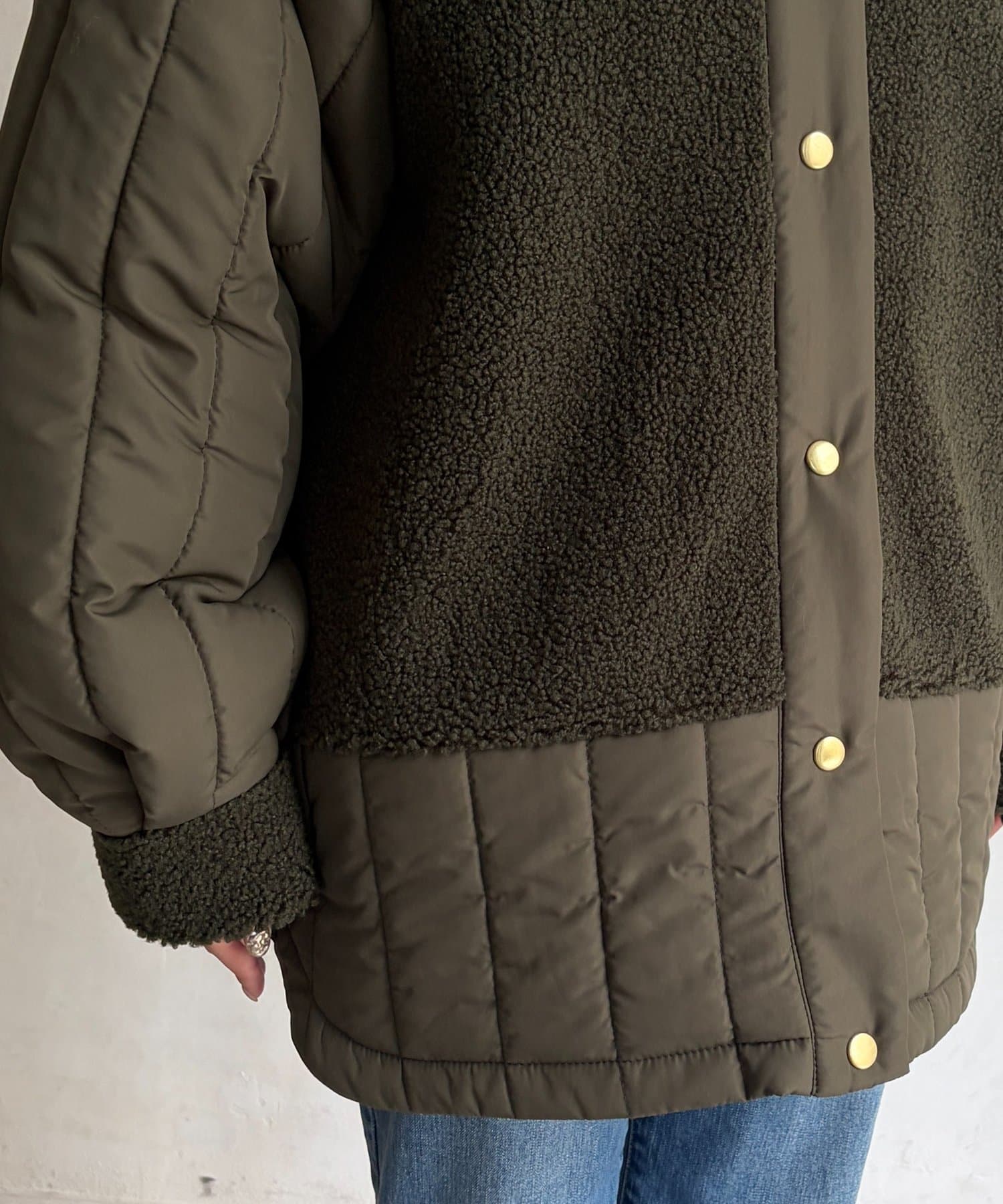 ふわふわのボア素材と品のある質感のキルティング素材を切替で配置したドッキングコート。