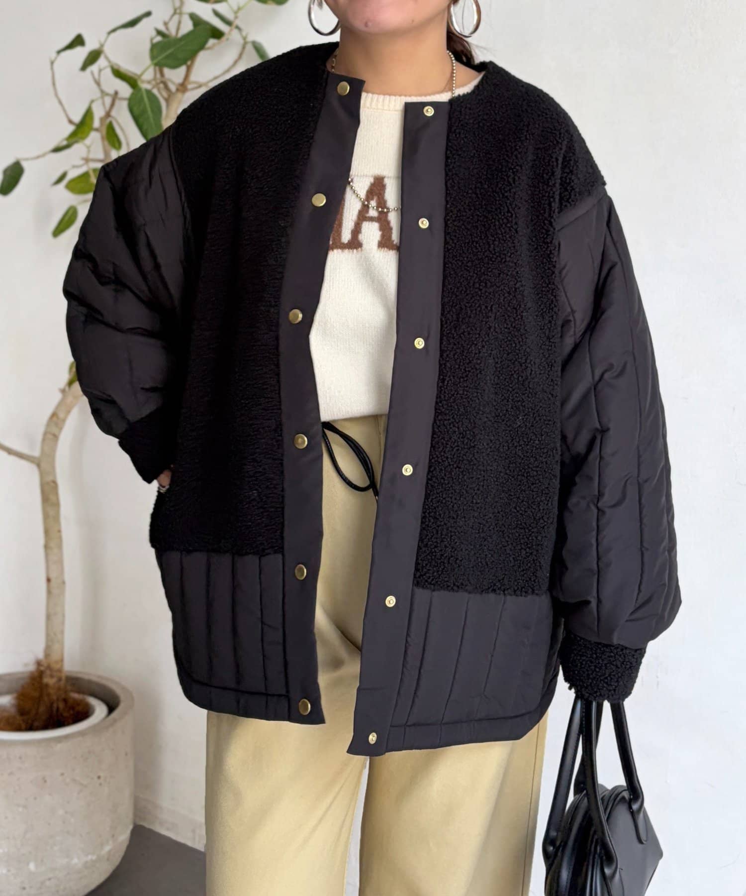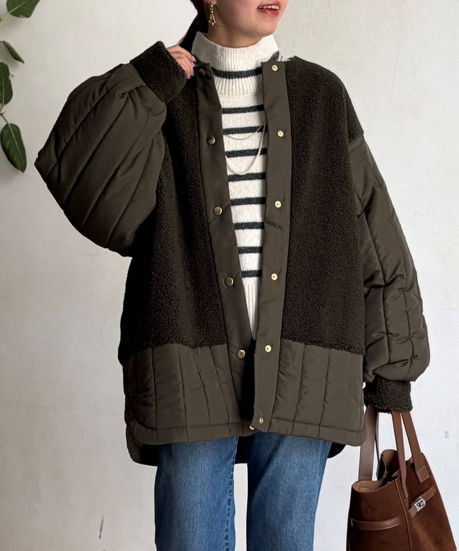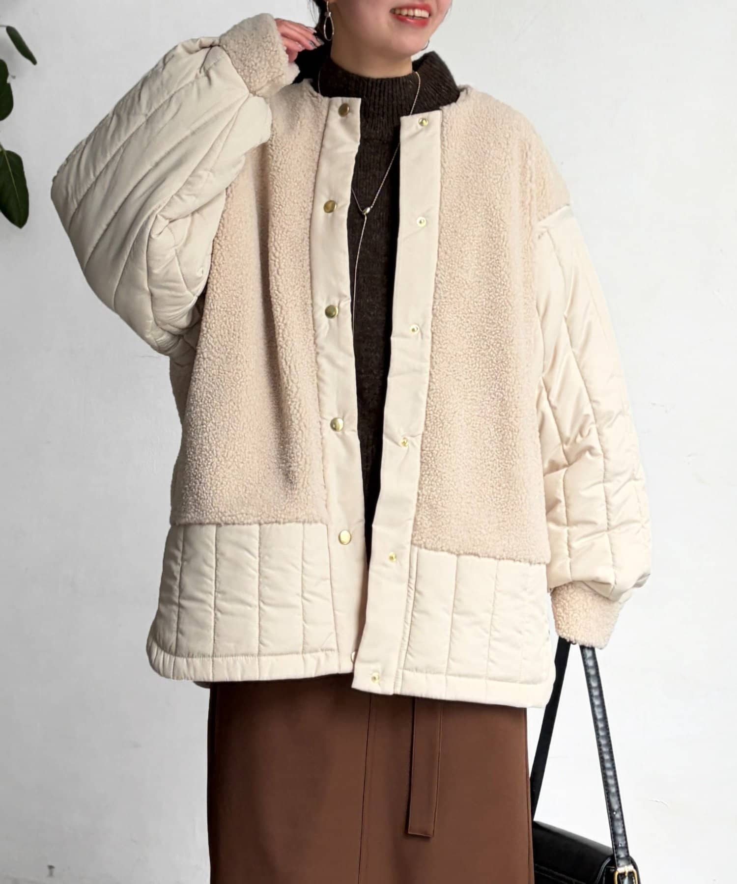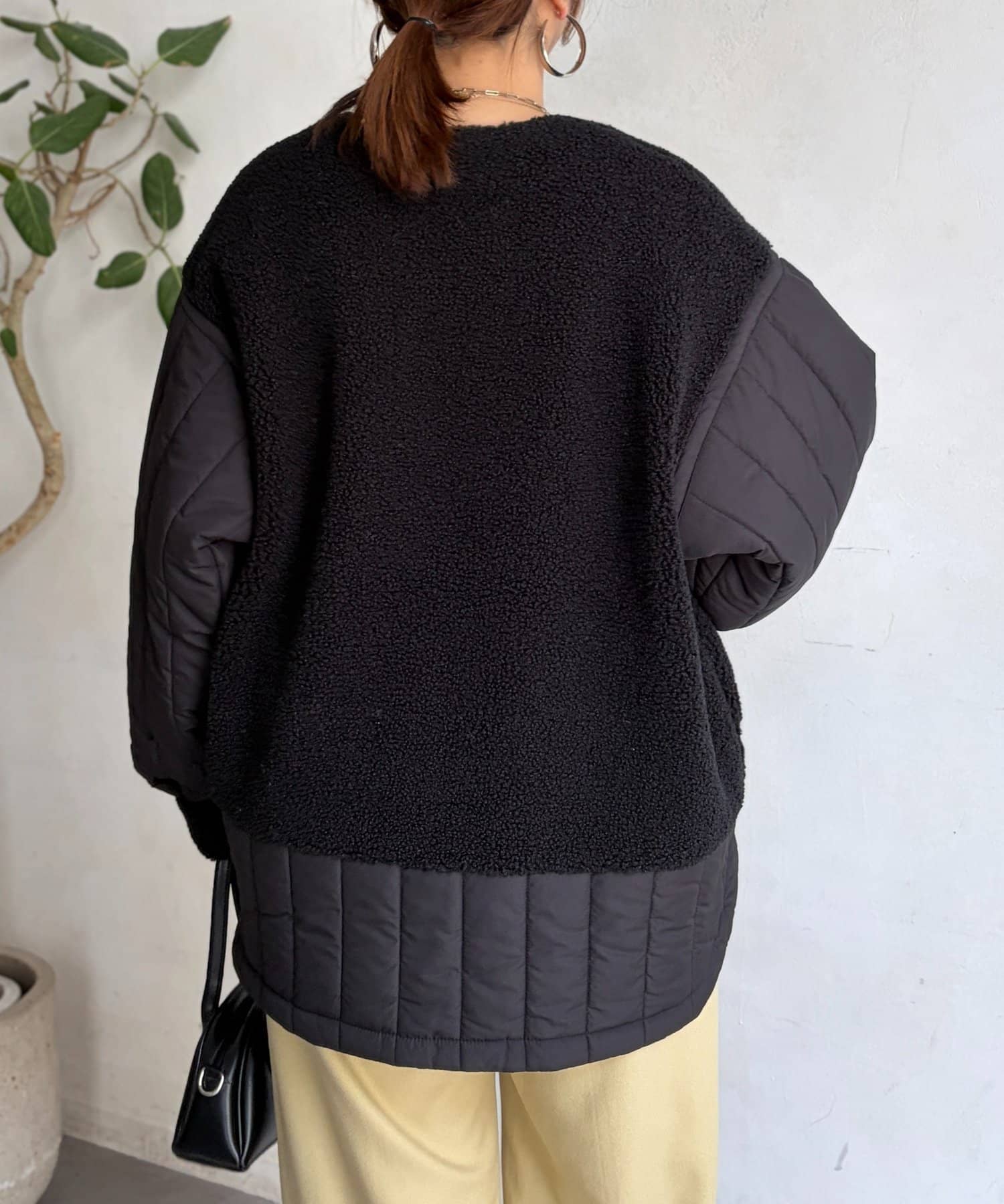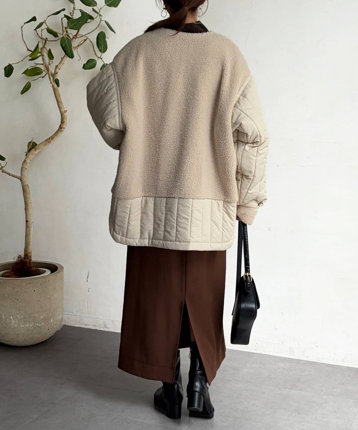 ふわふわのボア素材と品のある質感のキルティング素材を切替で配置したドッキングコート。