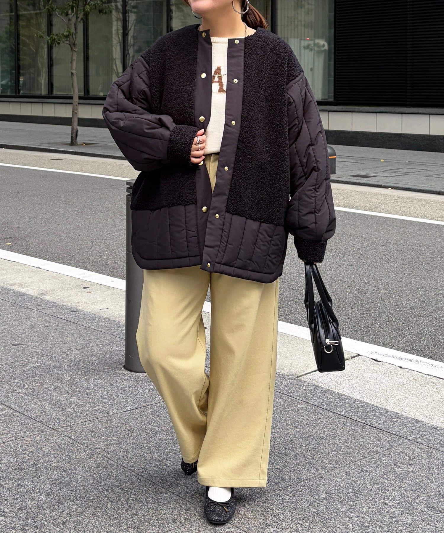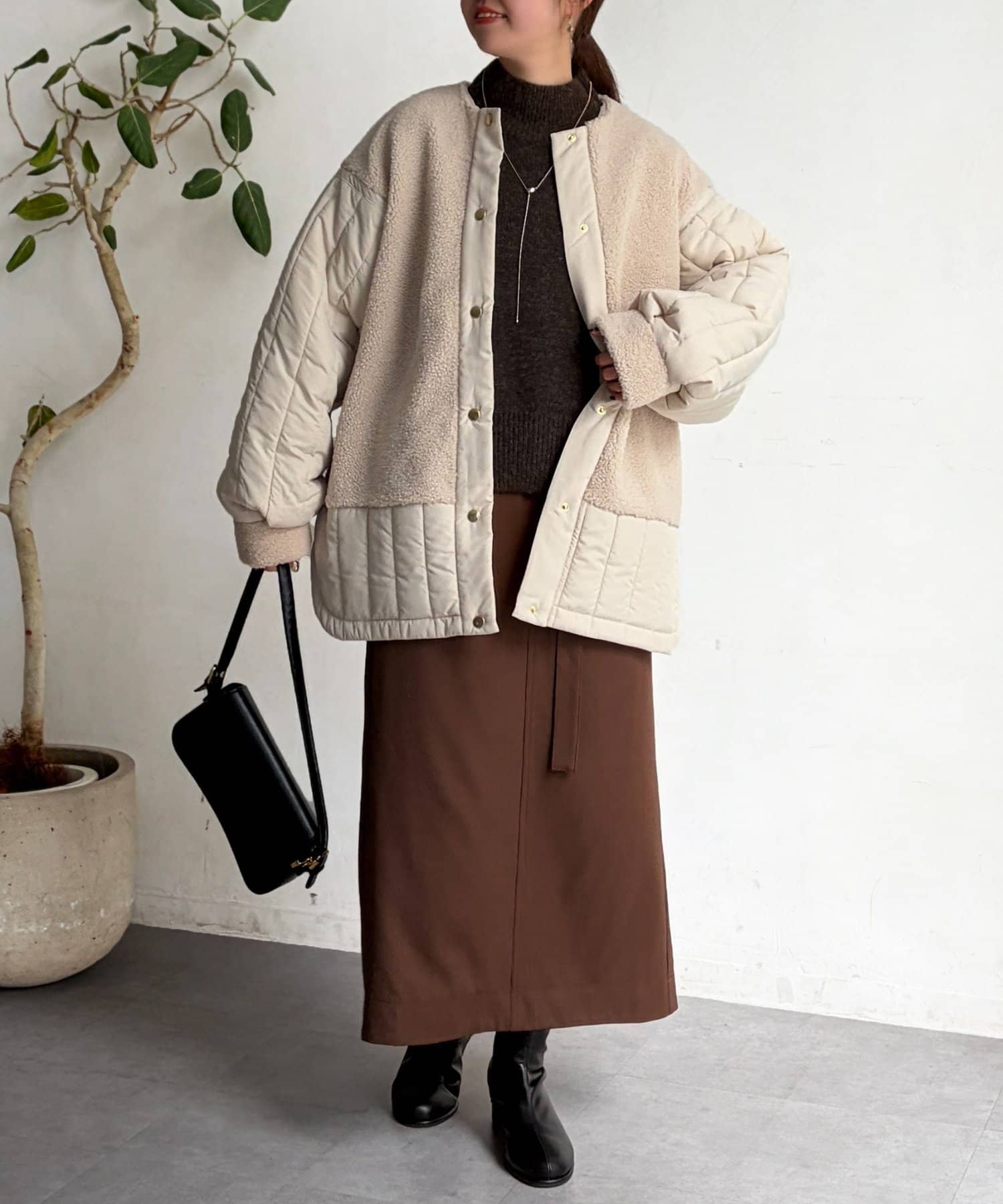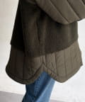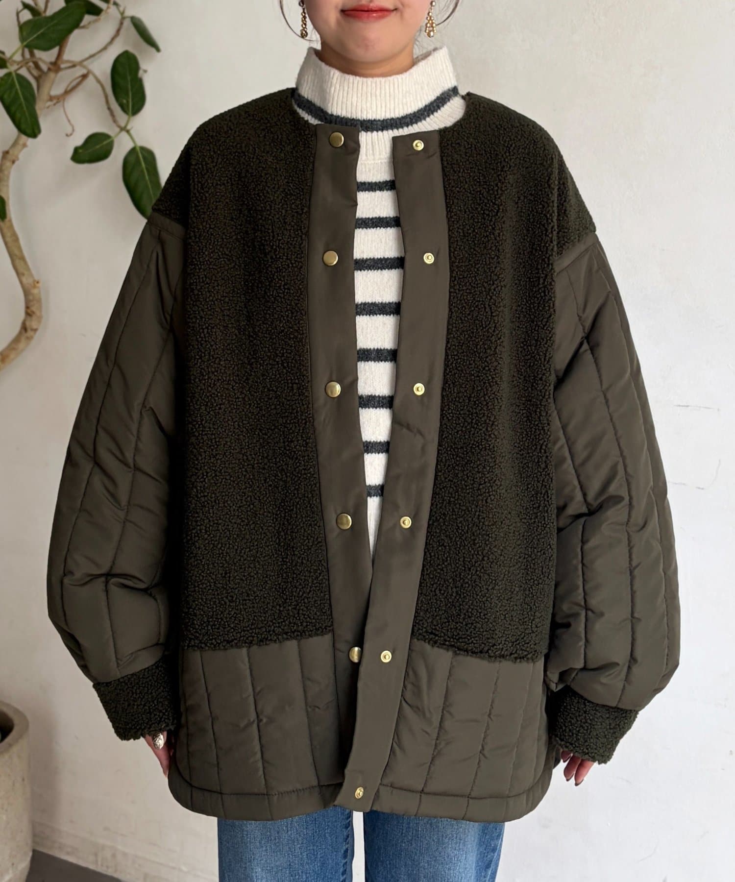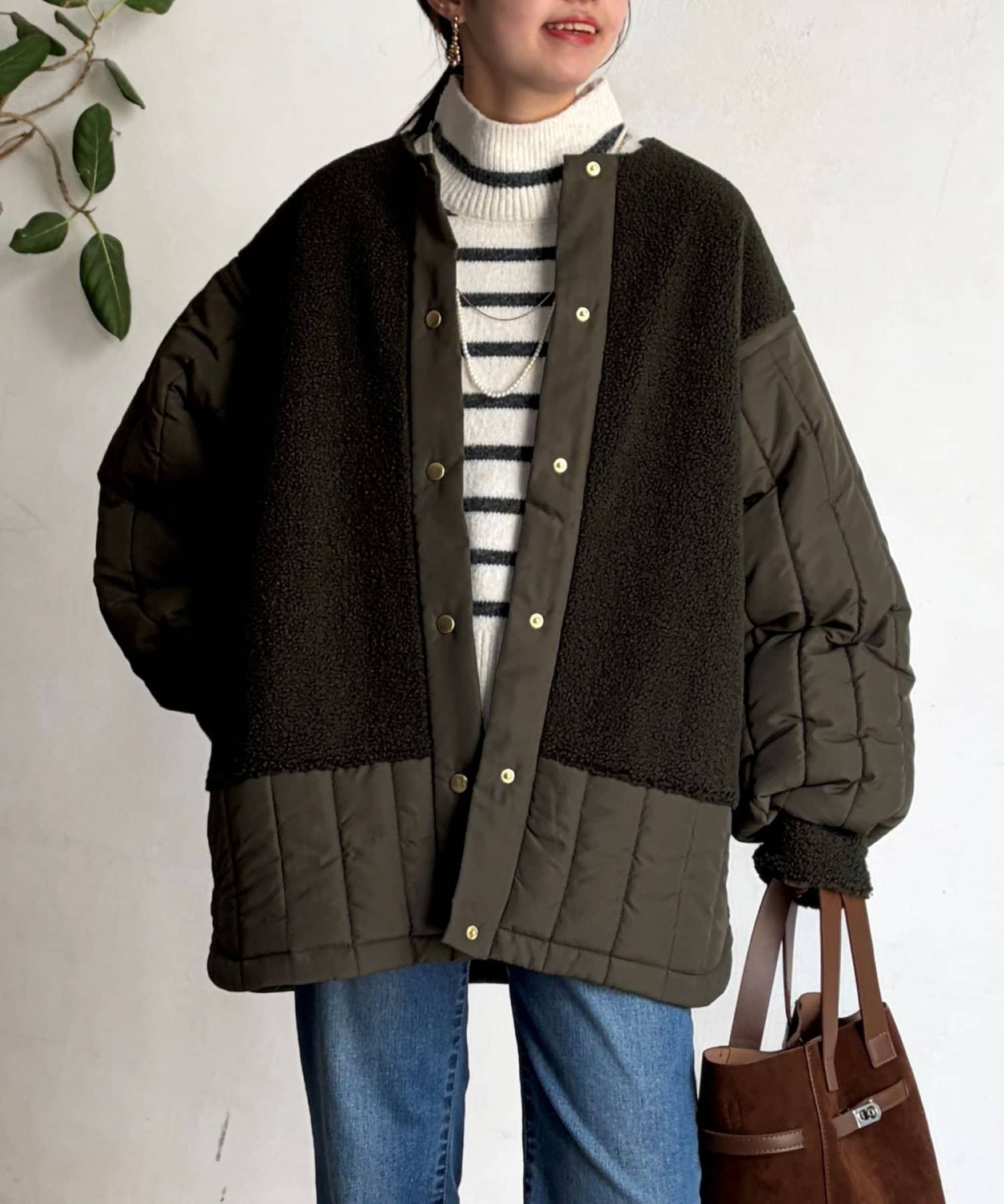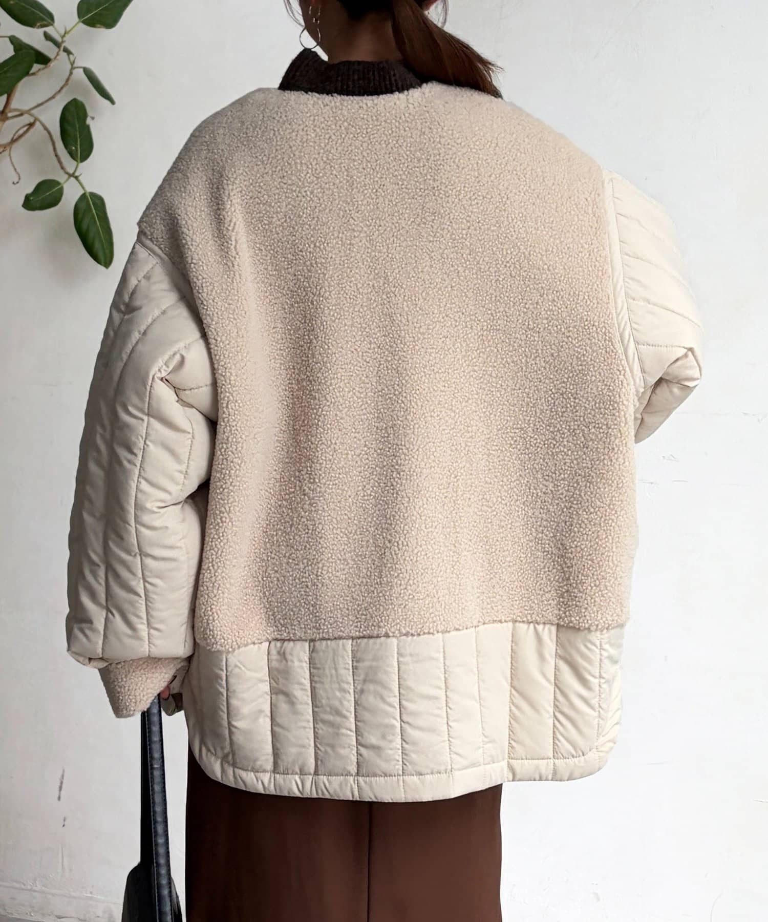 ふわふわのボア素材と品のある質感のキルティング素材を切替で配置したドッキングコート。