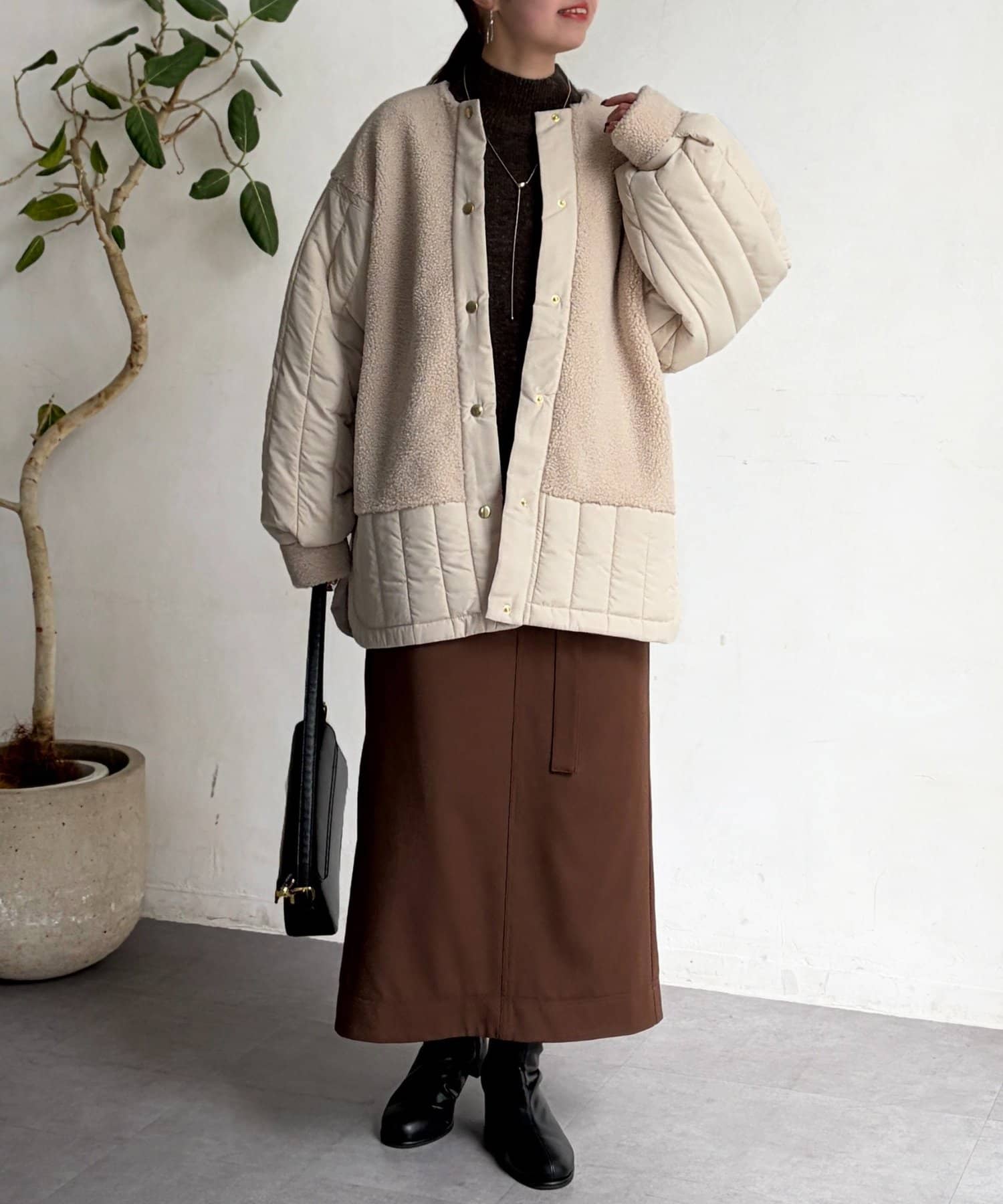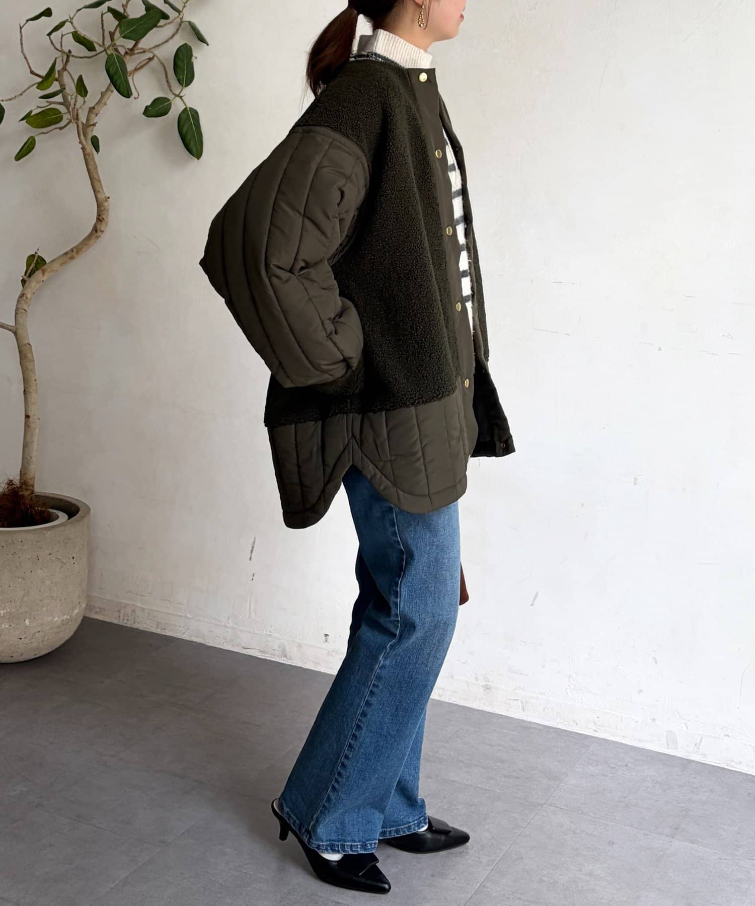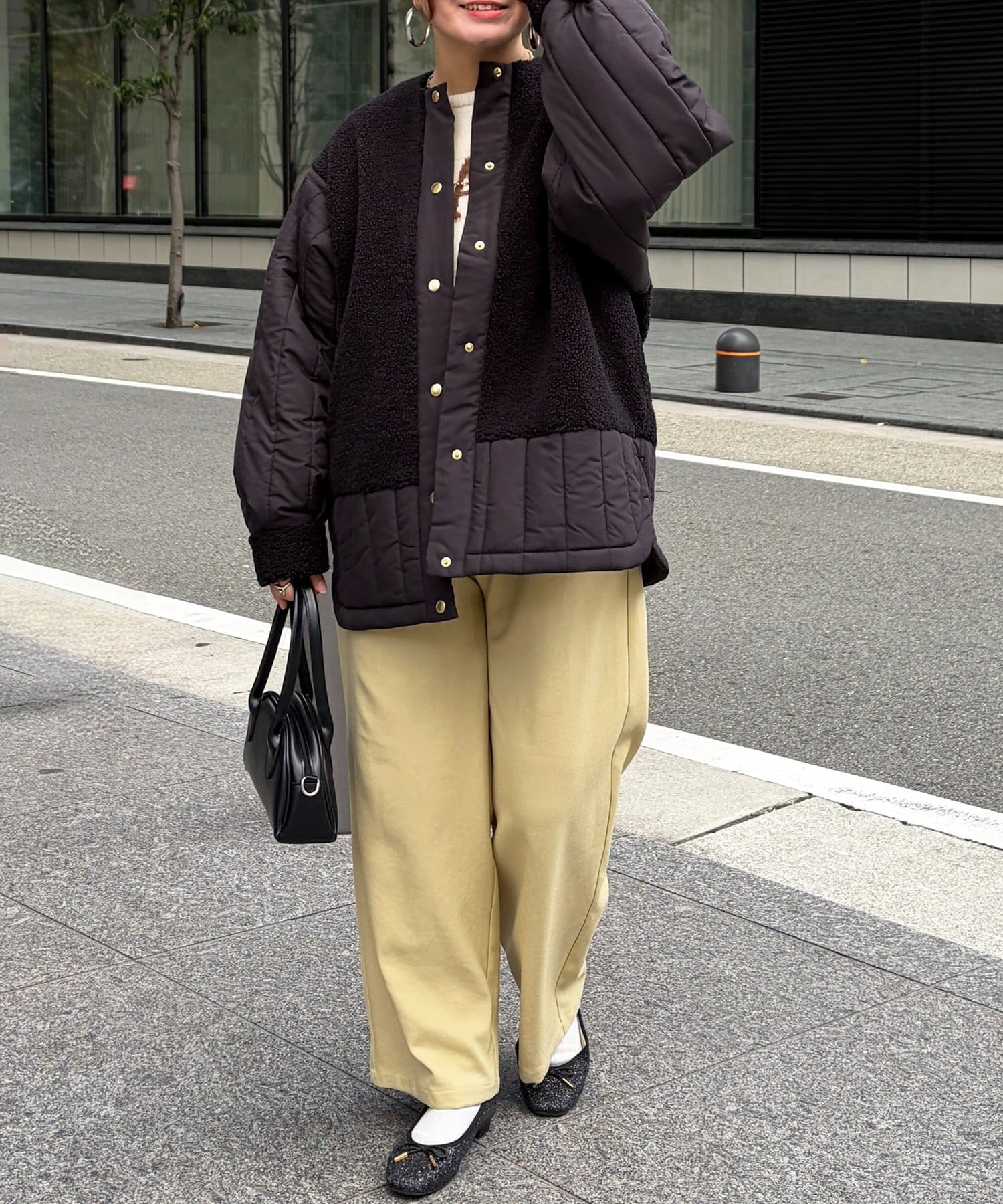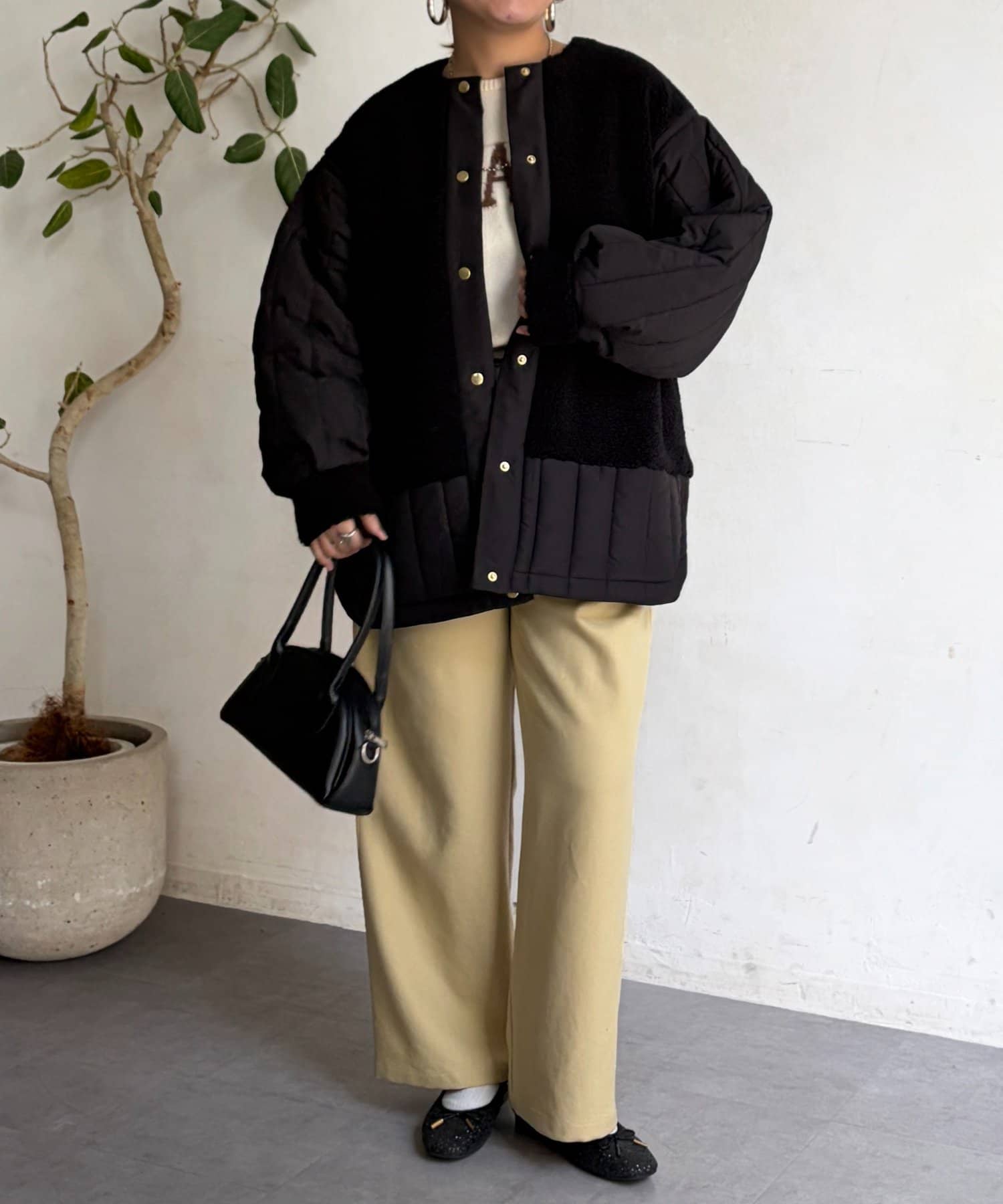 ふわふわのボア素材と品のある質感のキルティング素材を切替で配置したドッキングコート。