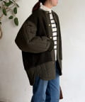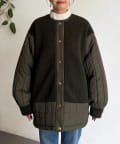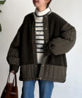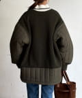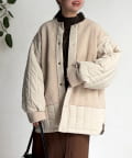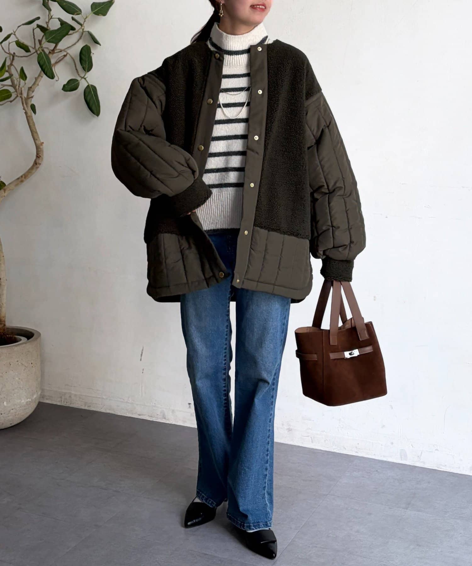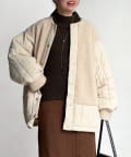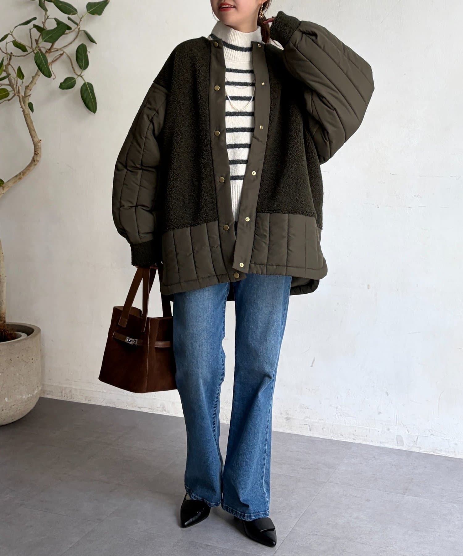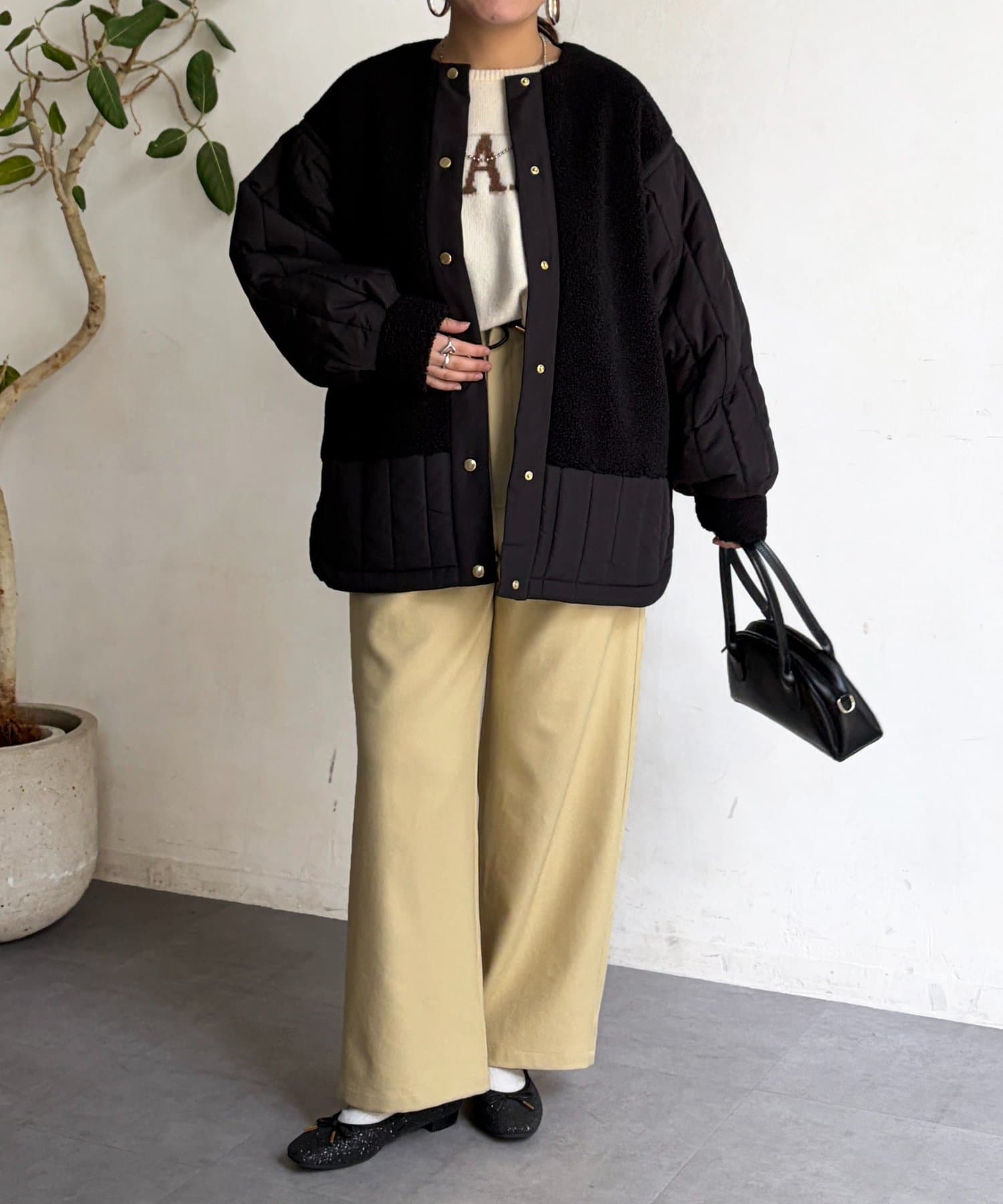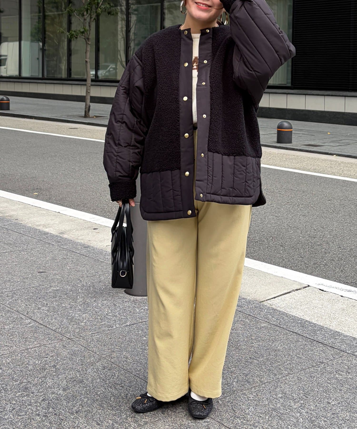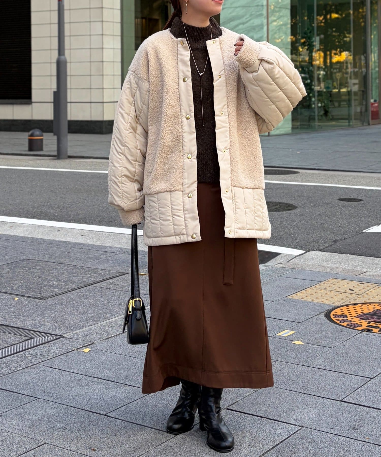 ふわふわのボア素材と品のある質感のキルティング素材を切替で配置したドッキングコート。