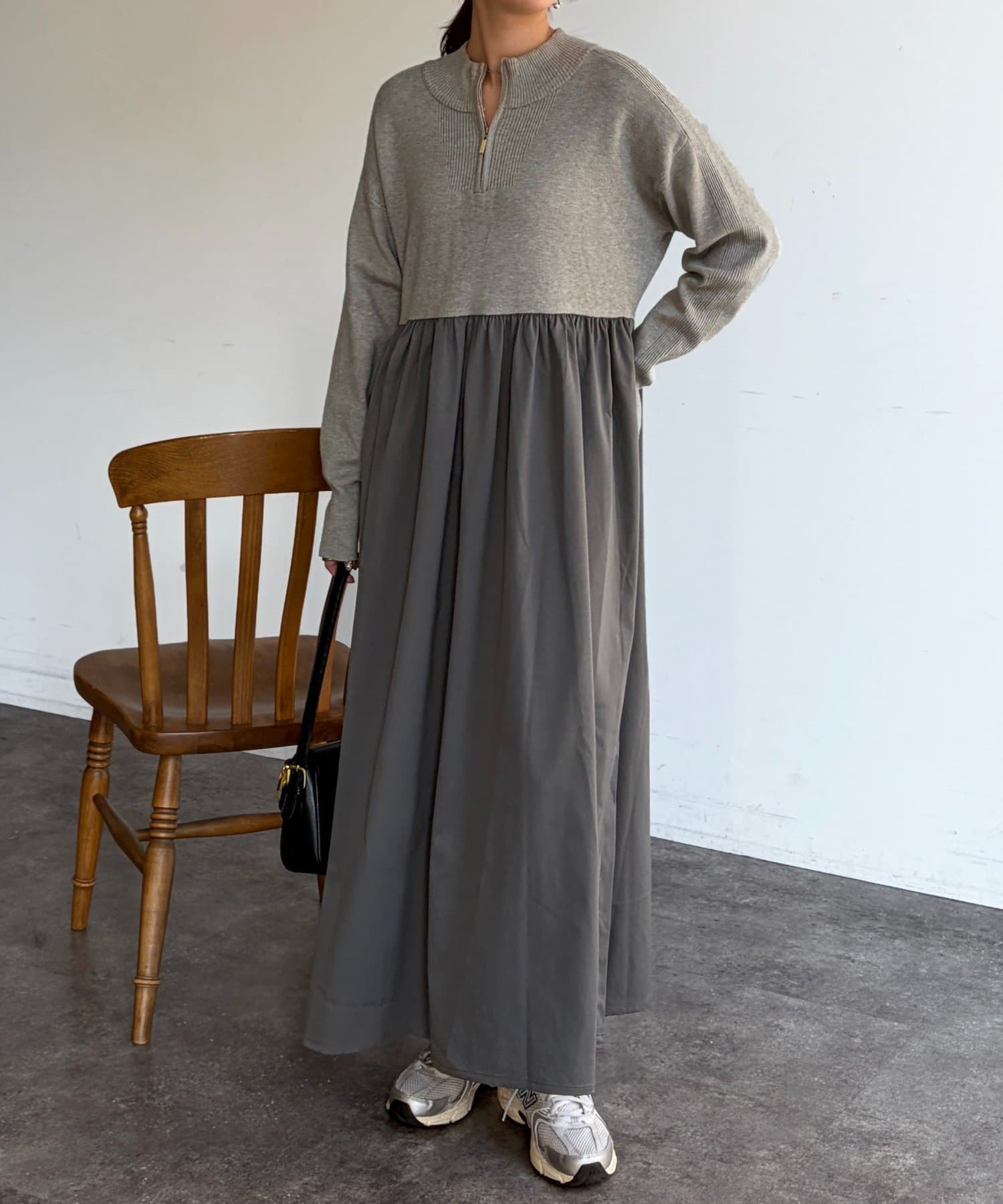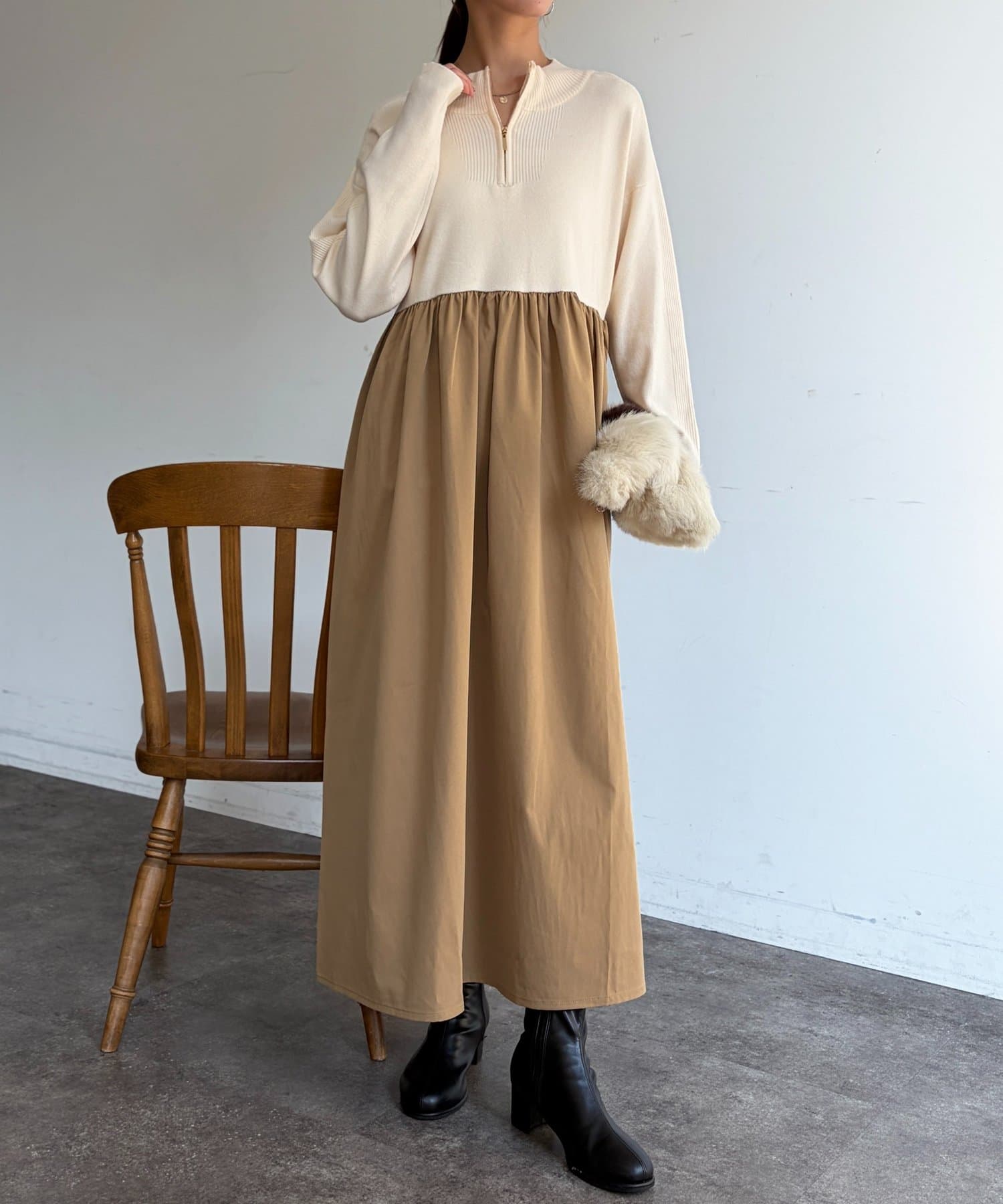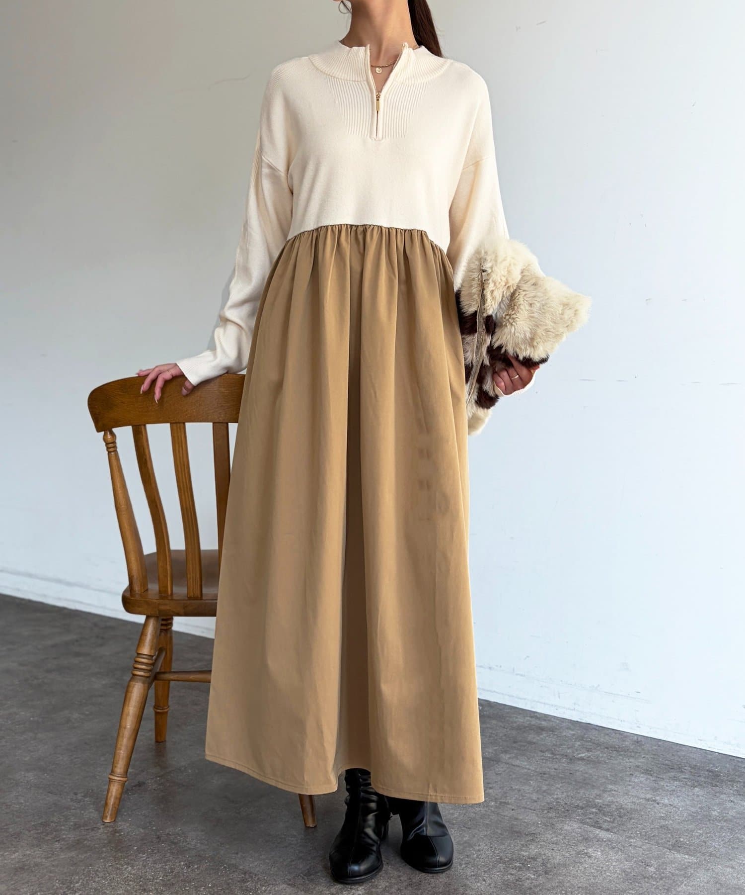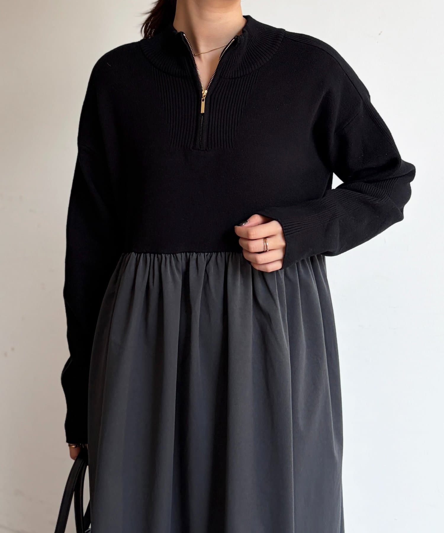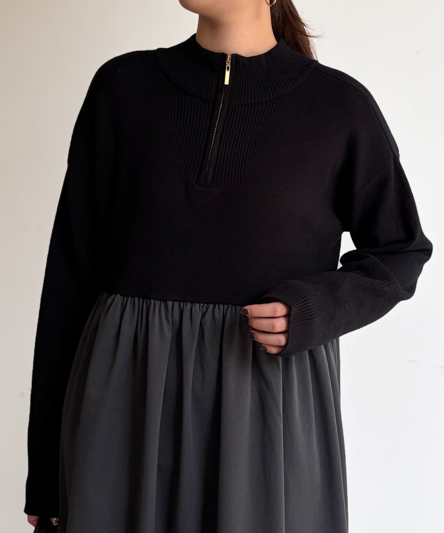 • Chez toi(シェトワ) 異素材ドッキングハーフジップワンピース