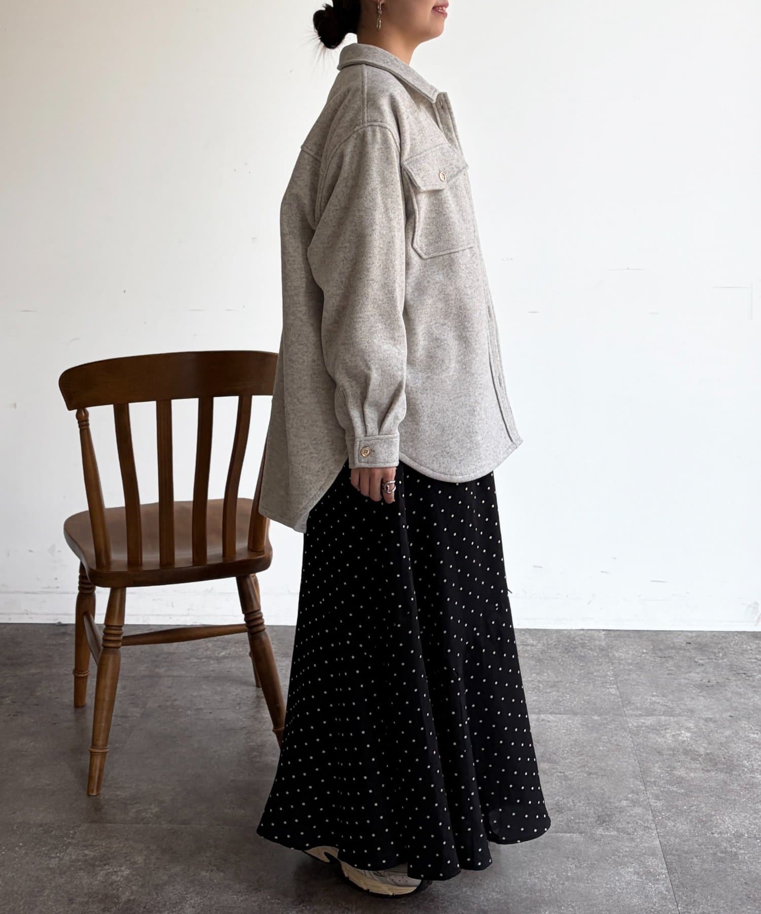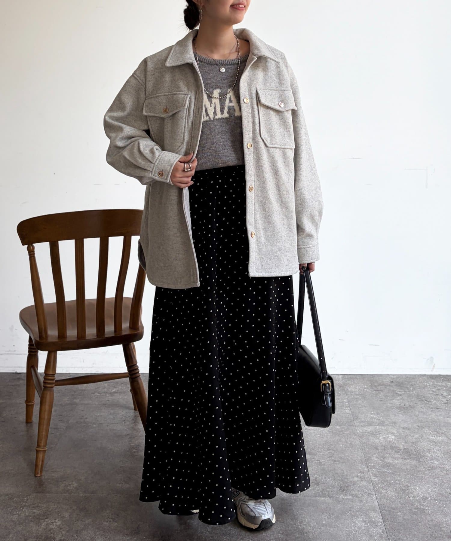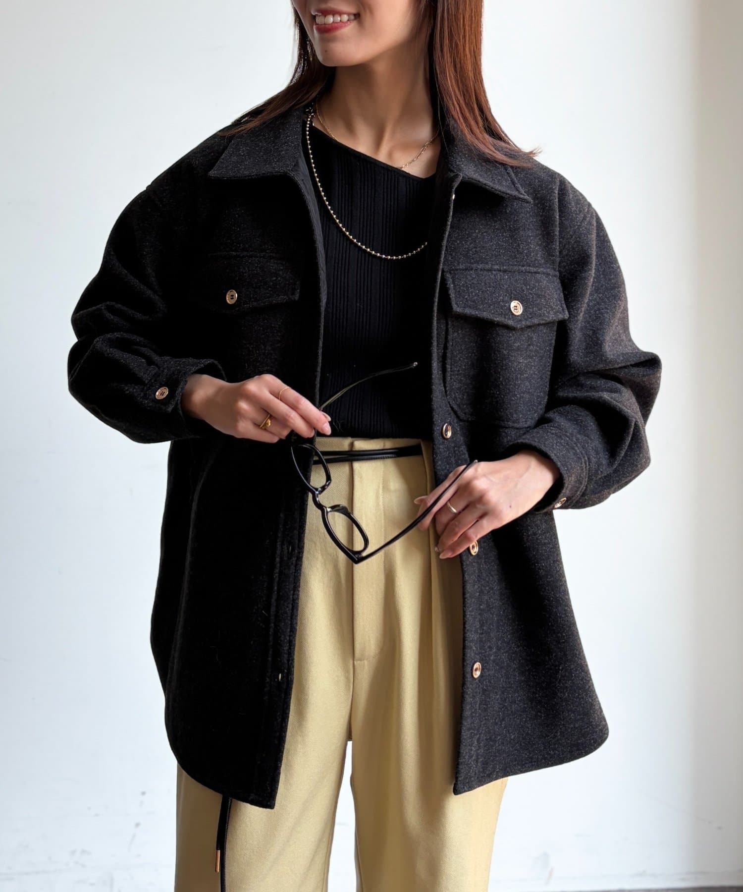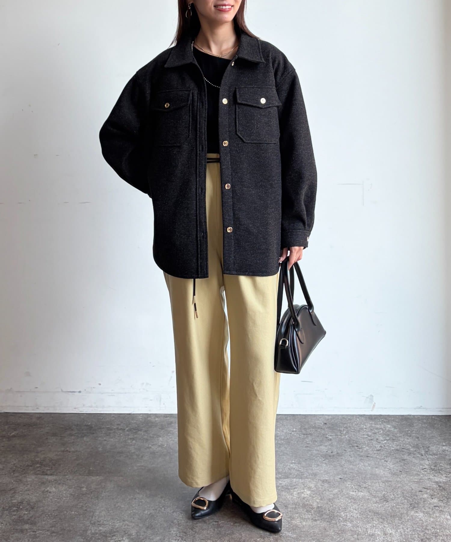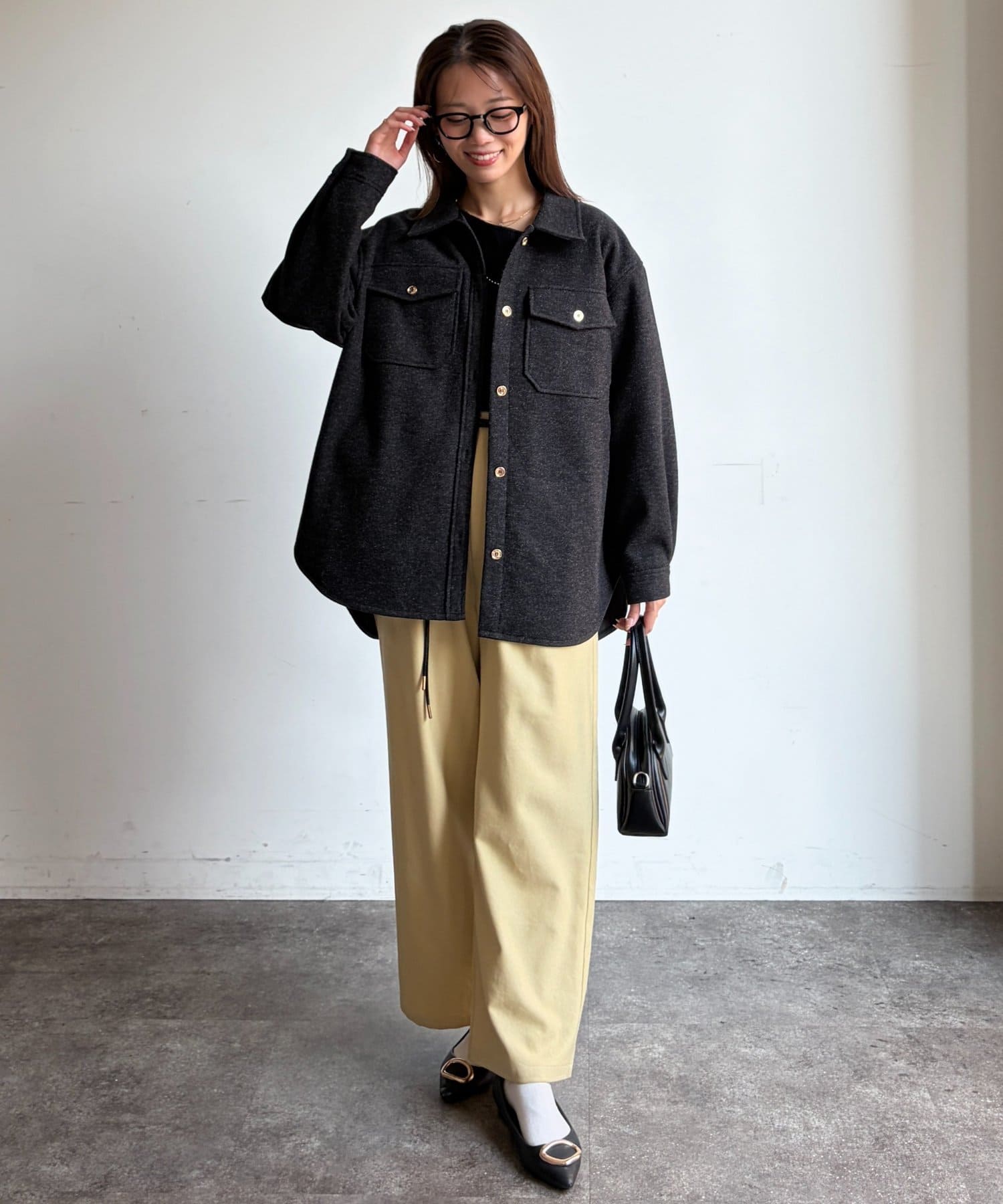 シャツのようにも着れるジャケットなので、スラックスパンツやナロースカートを合わせるとコーデが締まり、キレイメな印象に◎