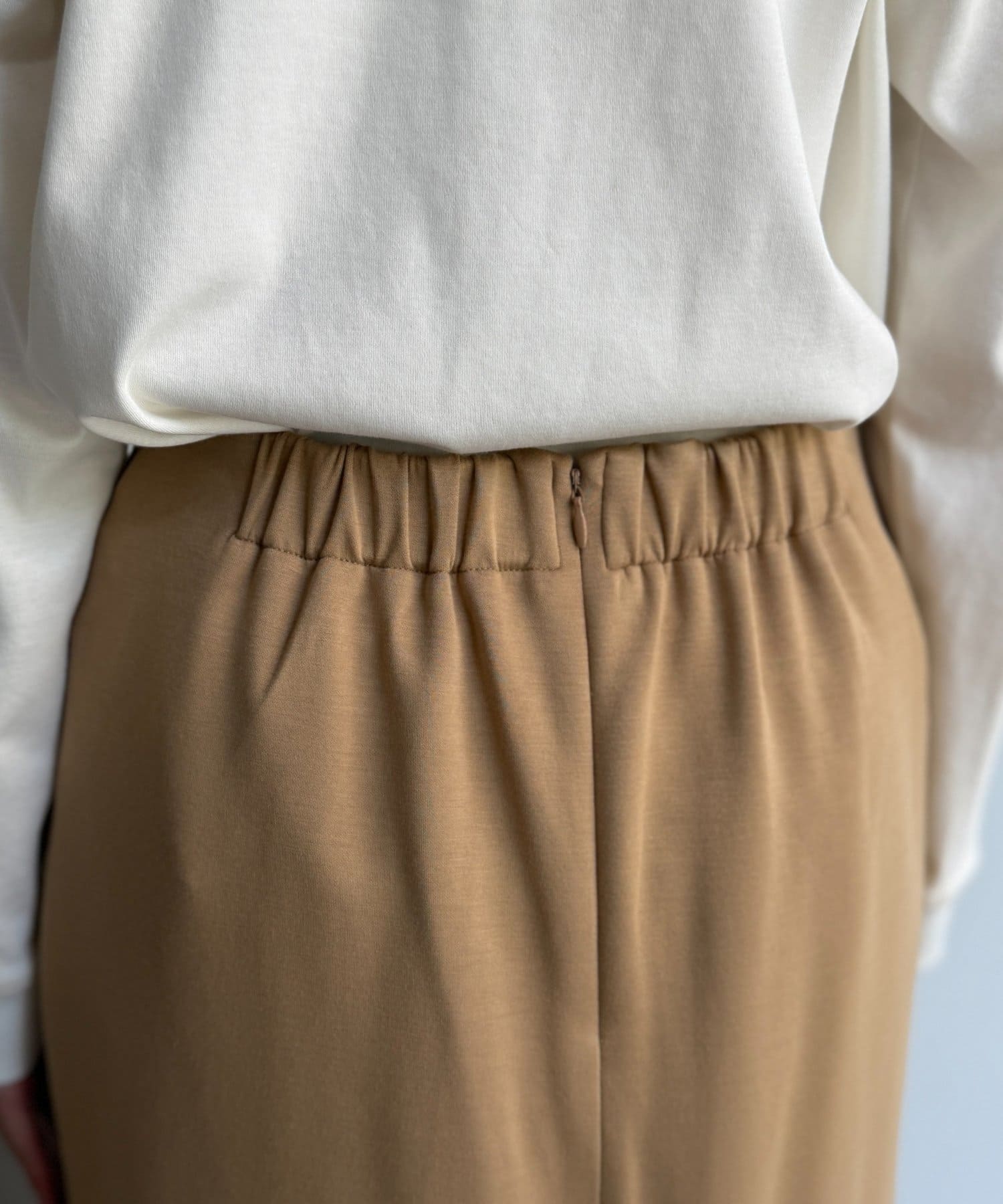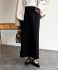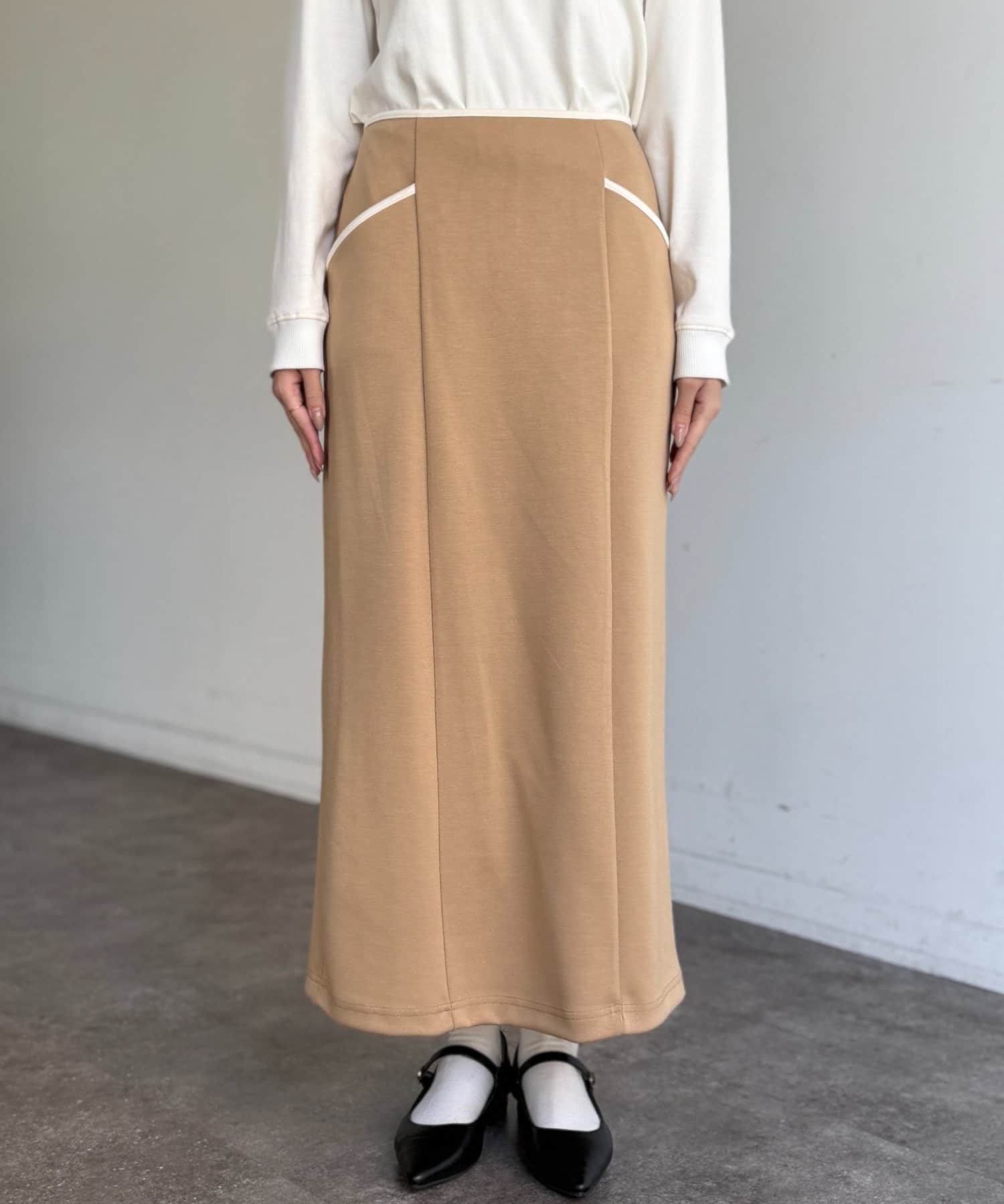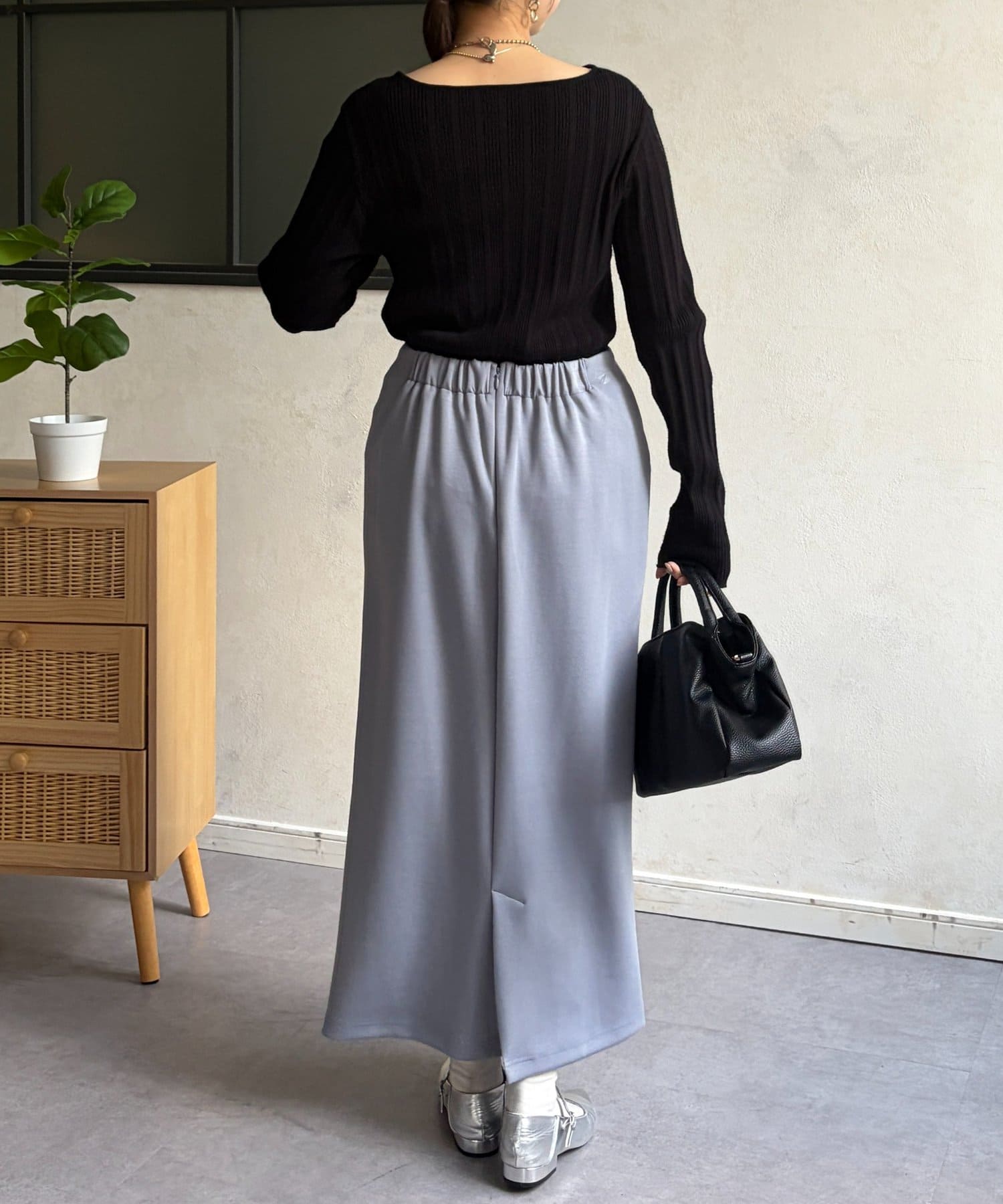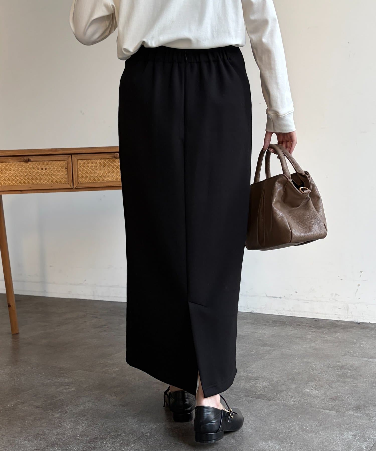 身体のラインを拾いすぎず、きれい見えするナロースカート。