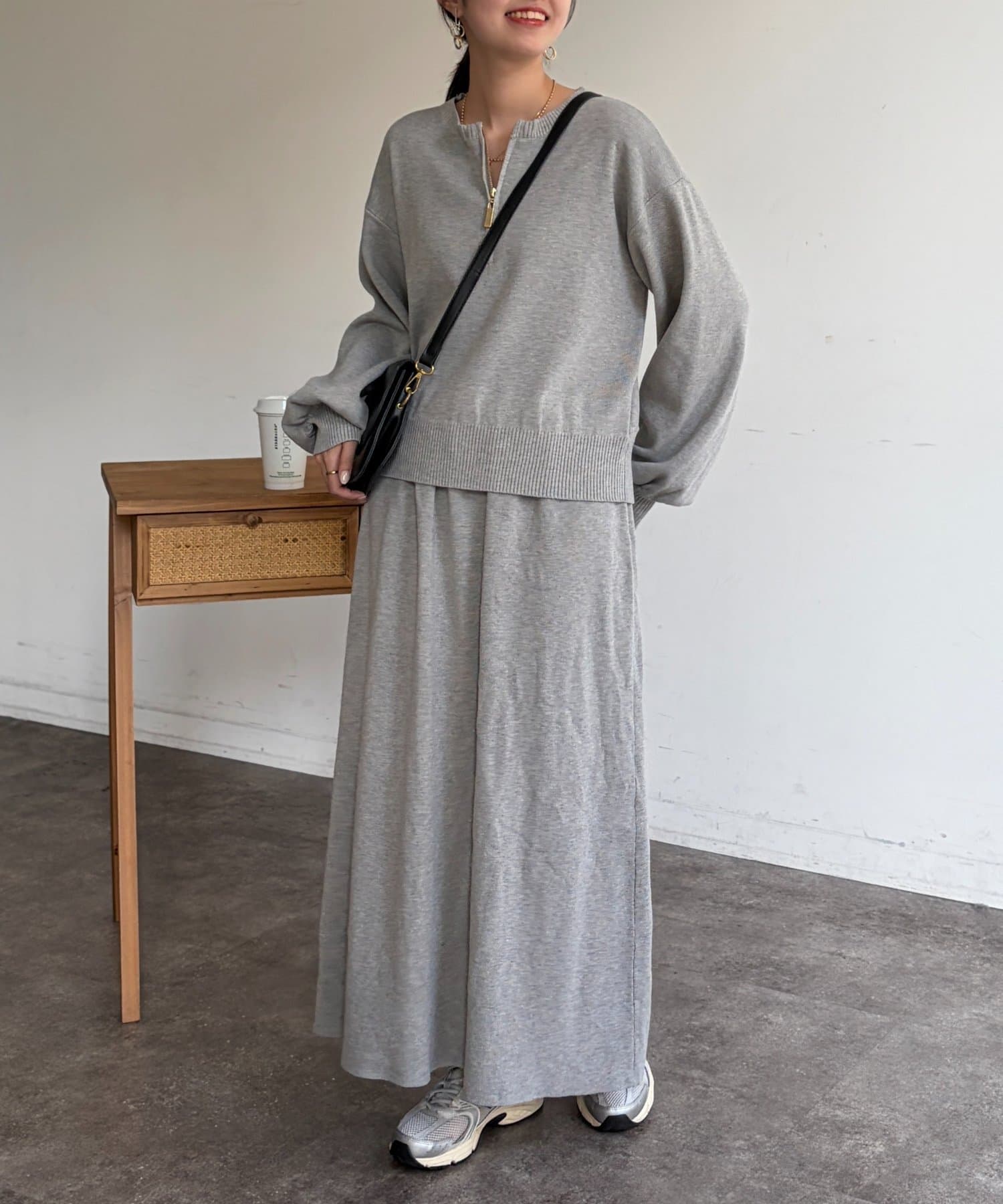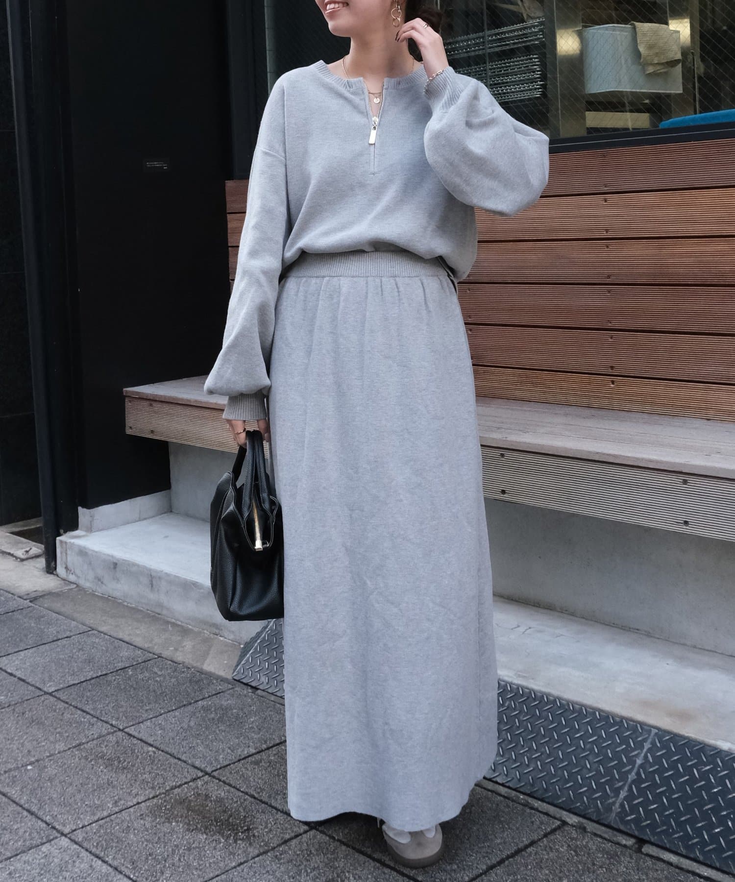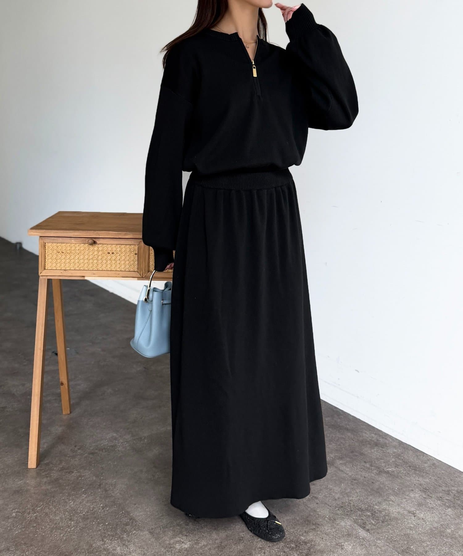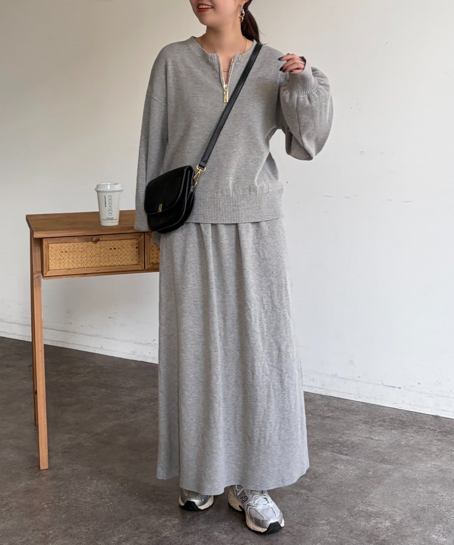 ハーフジップニットとAラインスカートのセットアップ。