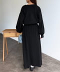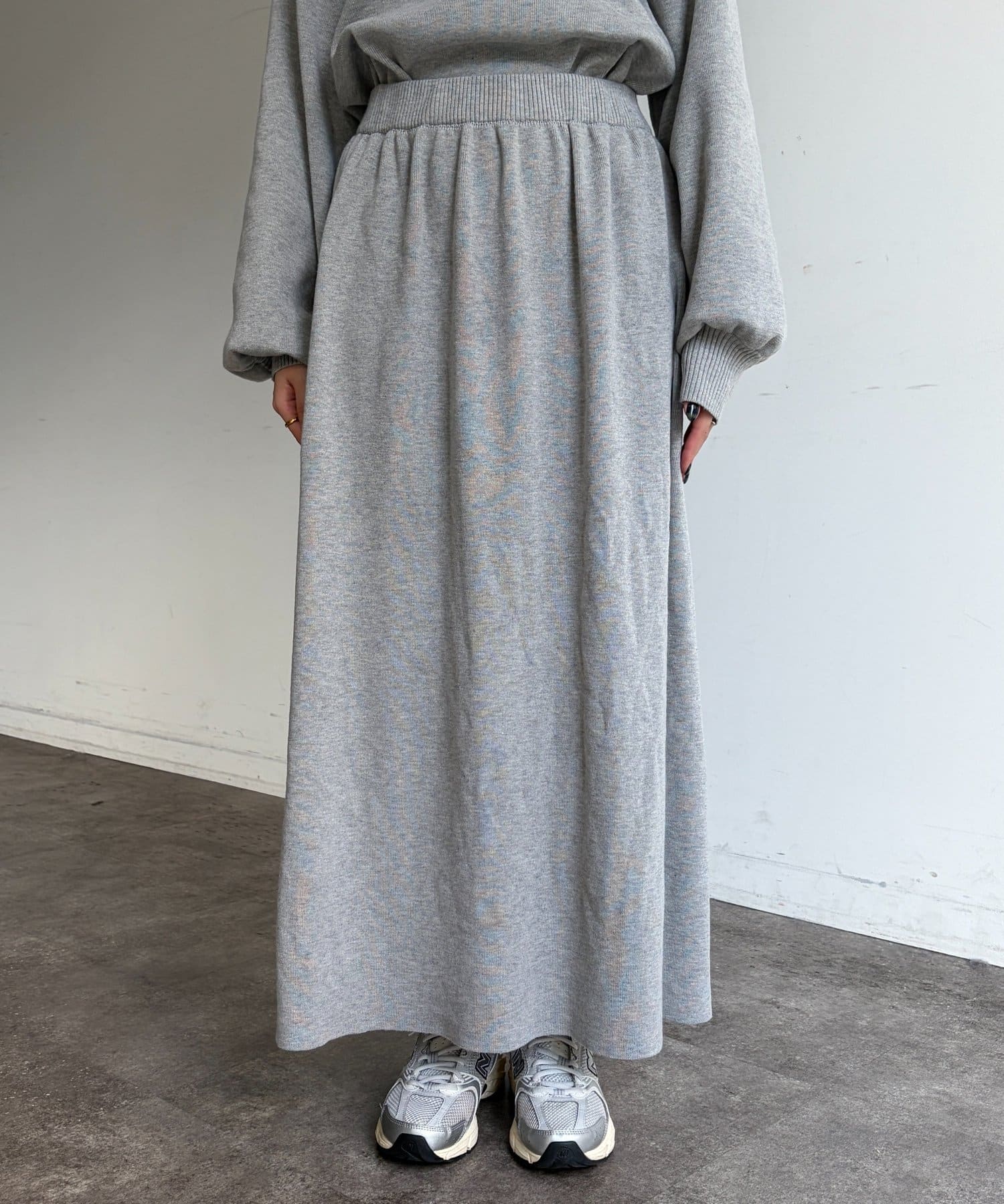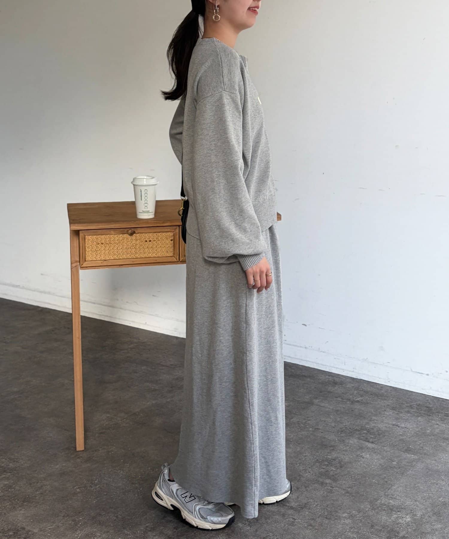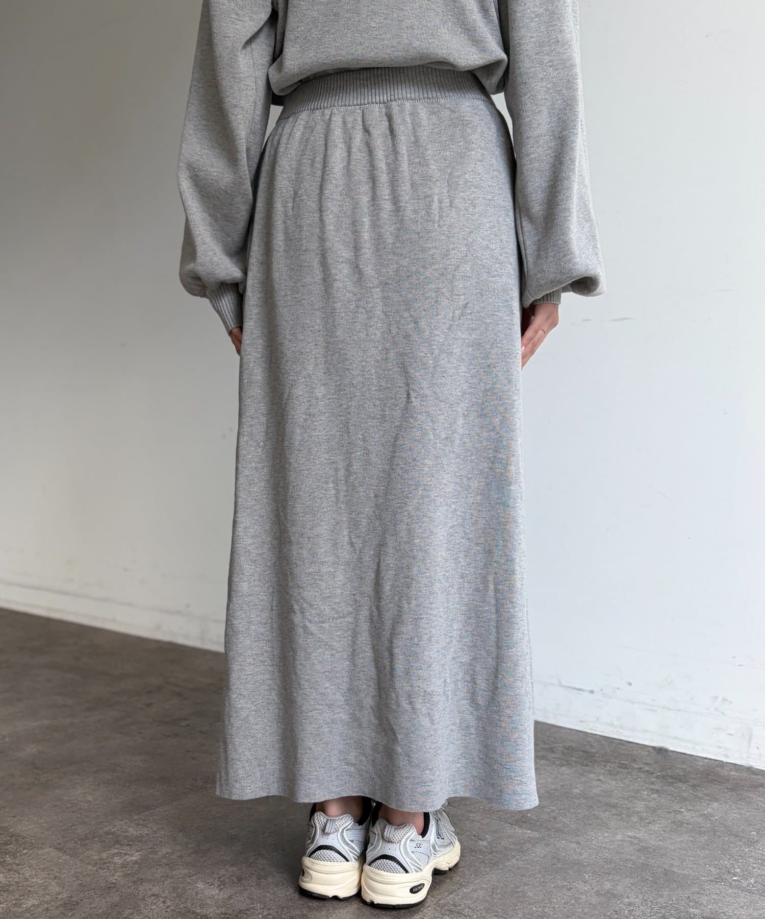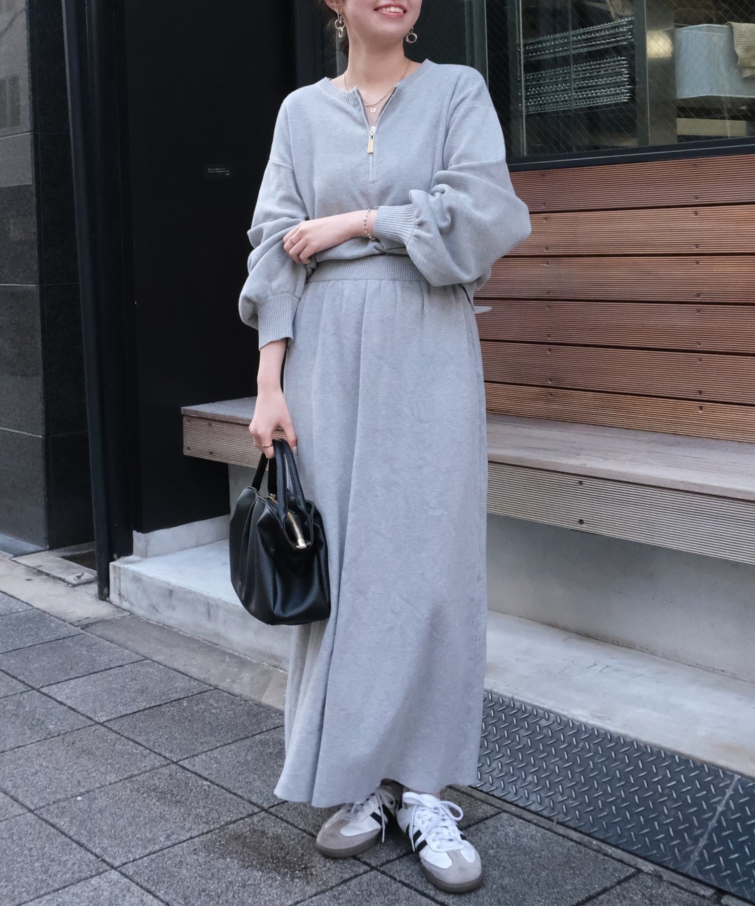 ハーフジップニットとAラインスカートのセットアップ。