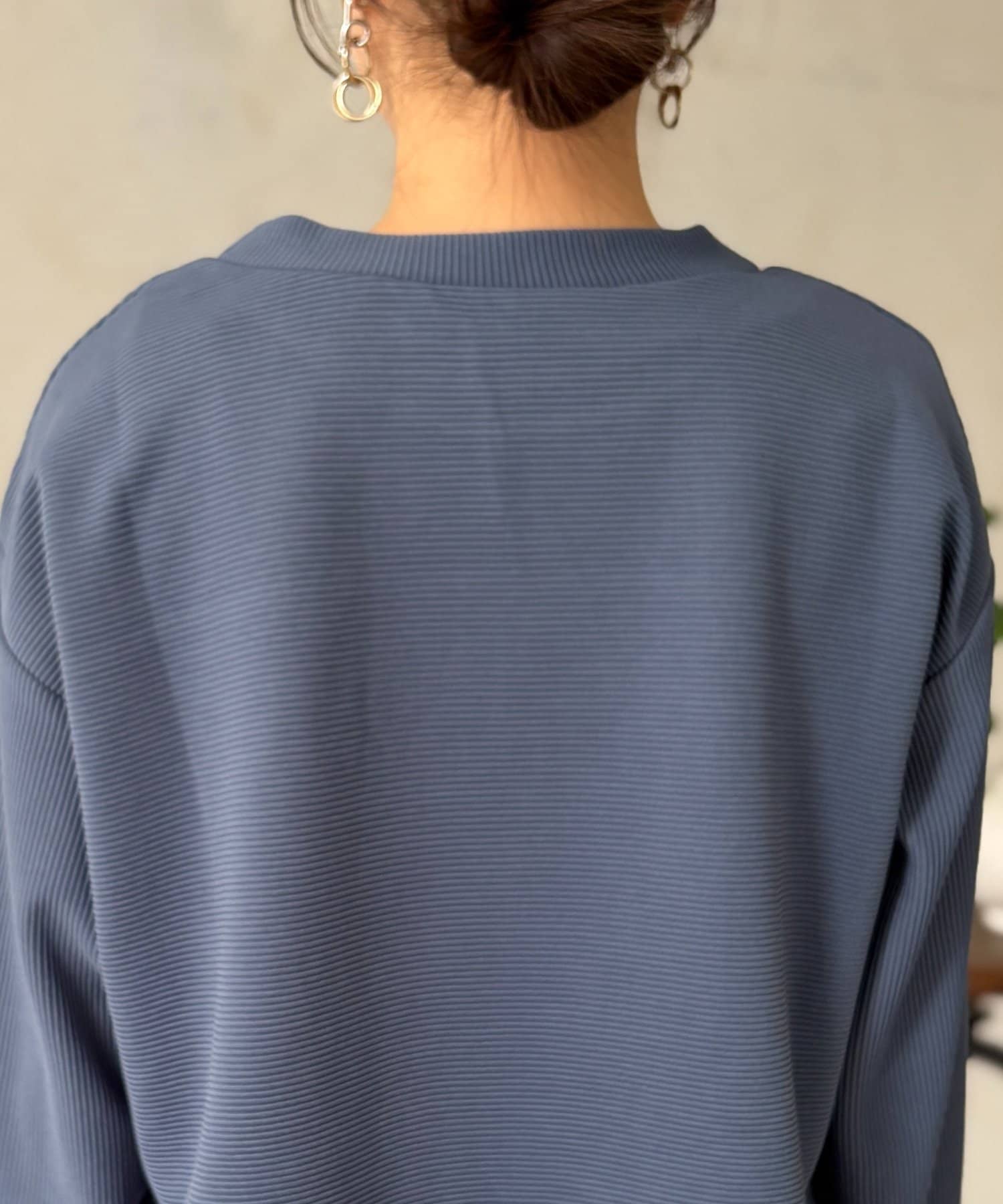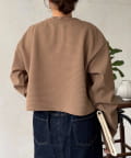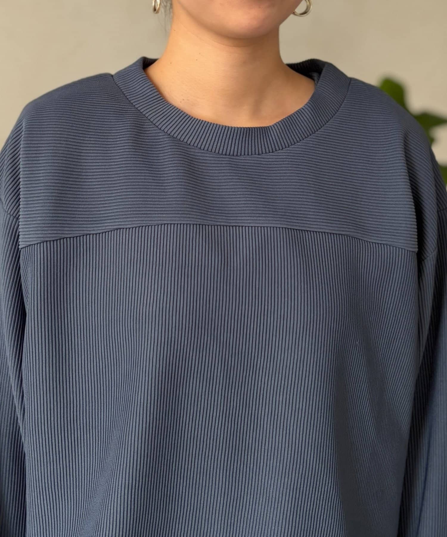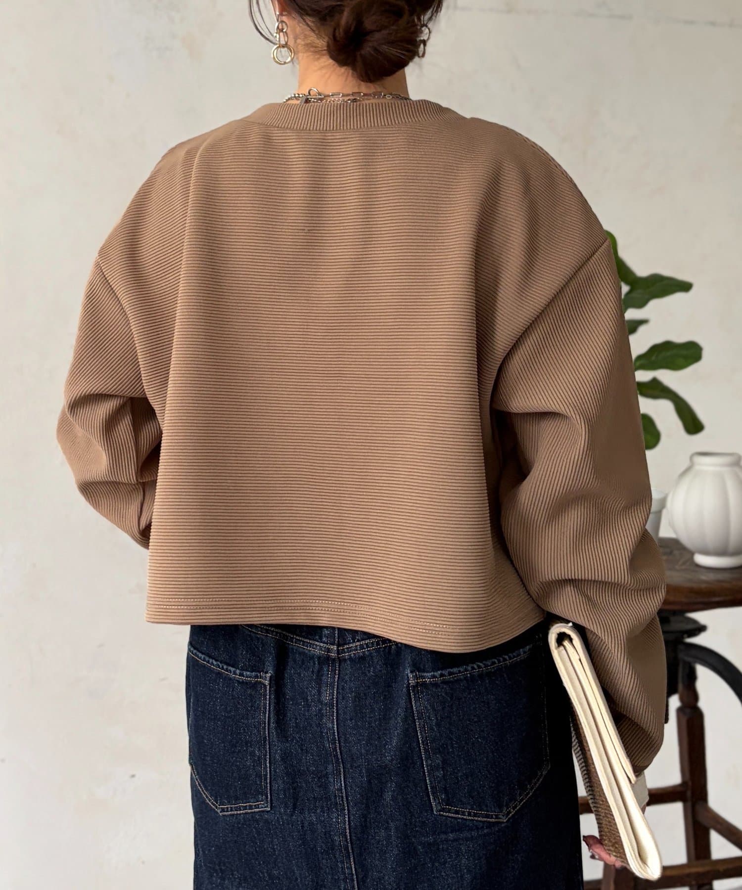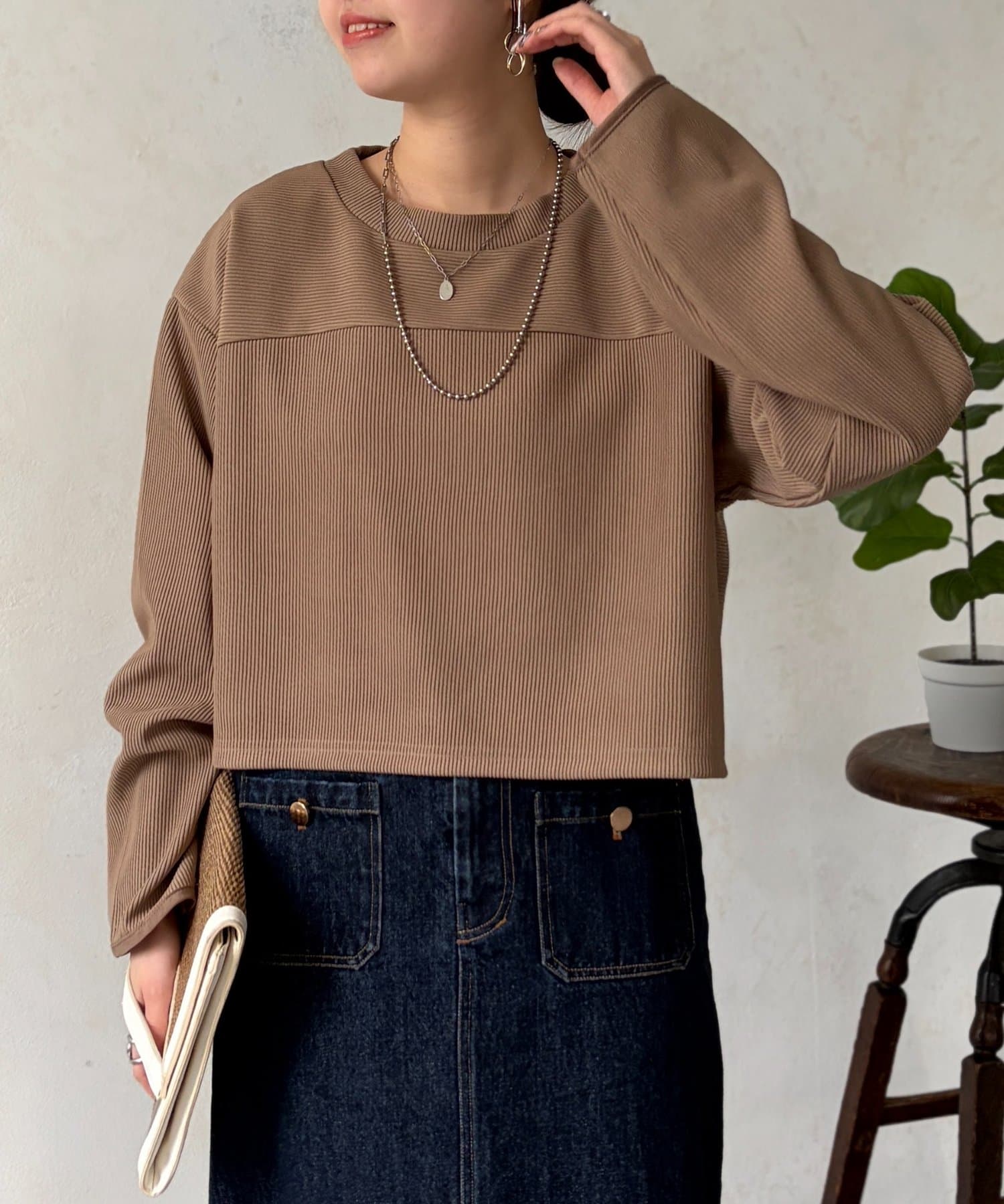 同生地で仕立てたロンTはショート丈で、様々なアイテムとバランス良く決まるのも魅力。