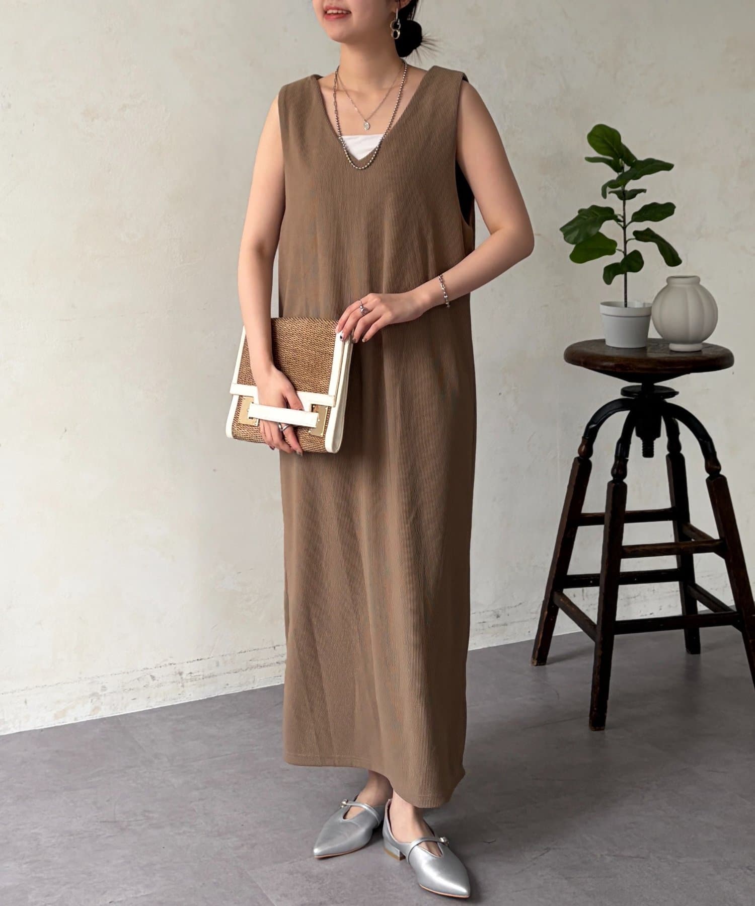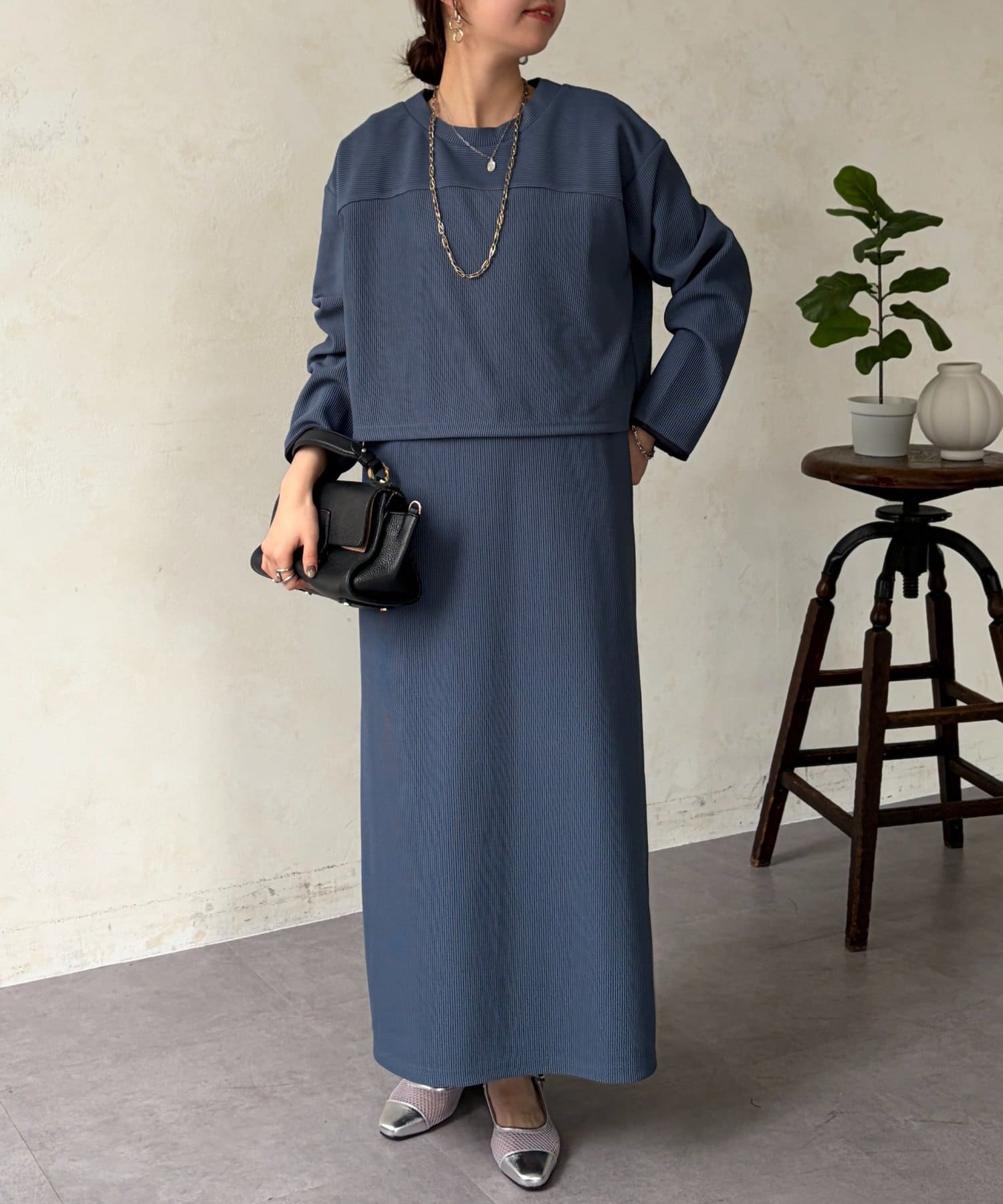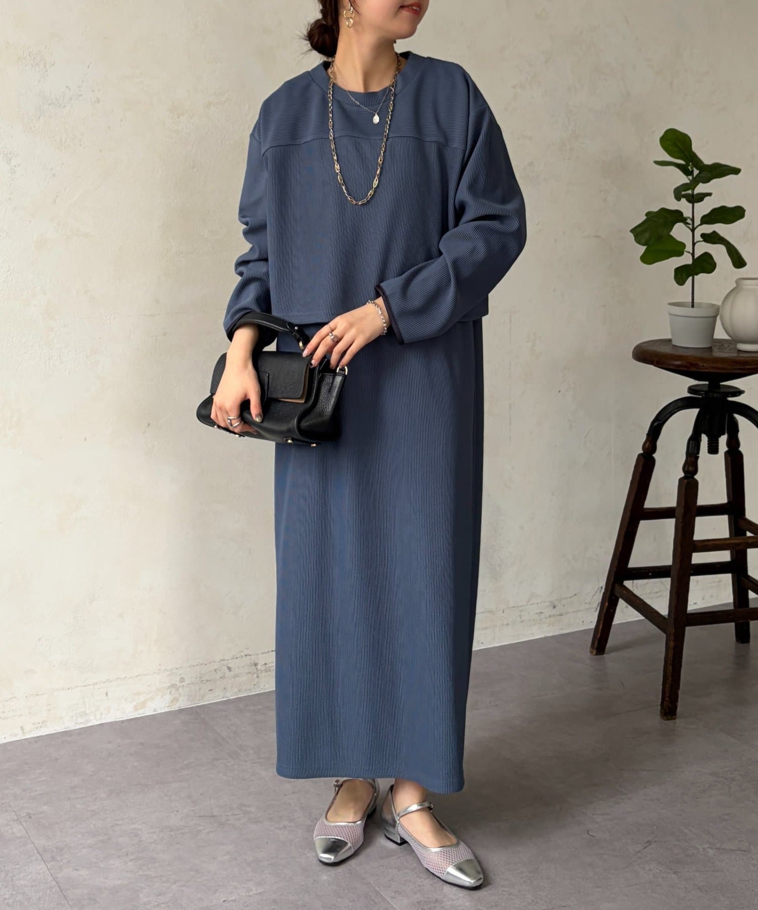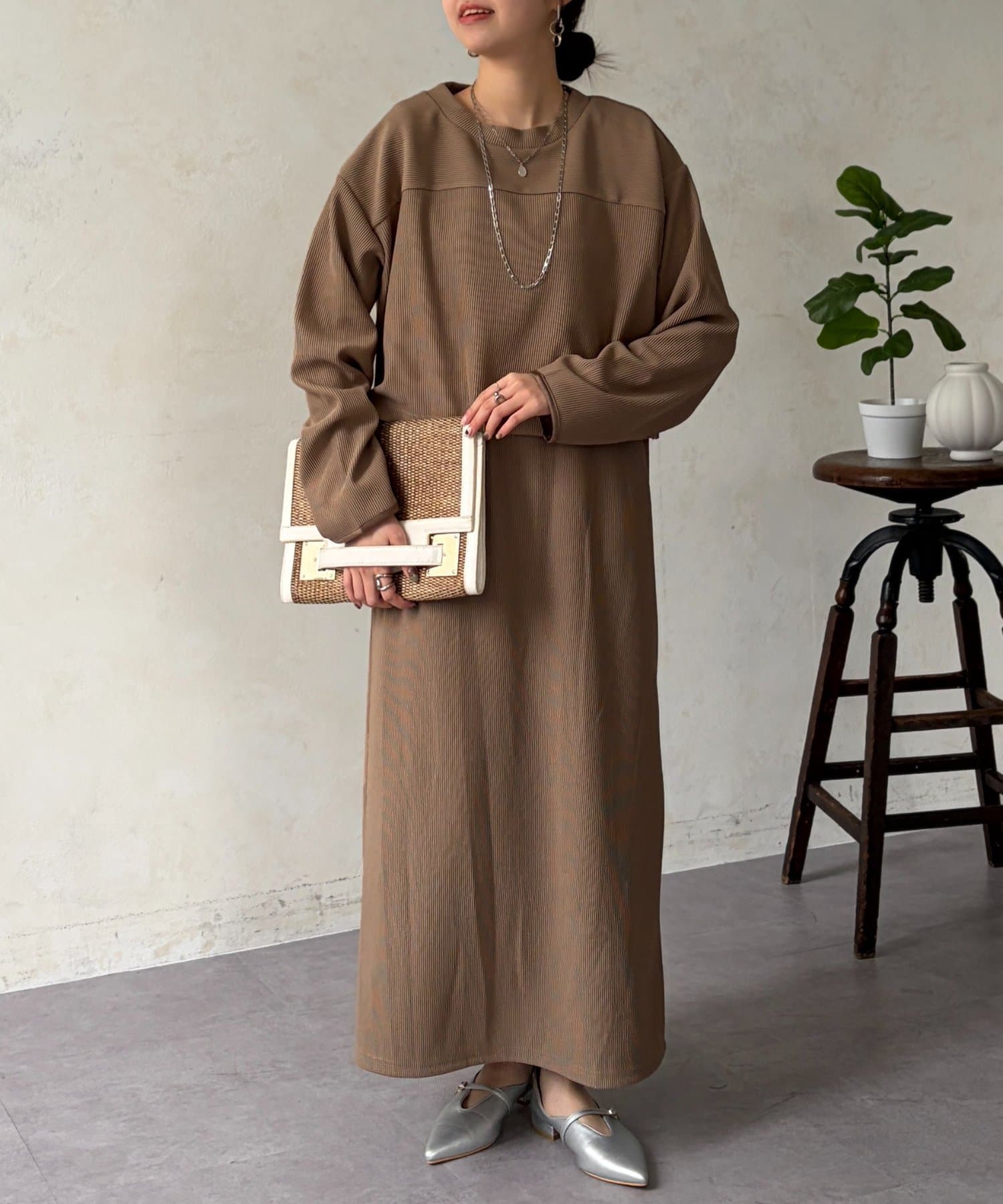 ワンピースはすっきりとした印象ながらタイトすぎないサイズ感で、体型を拾いにくいのが嬉しいポイント◎