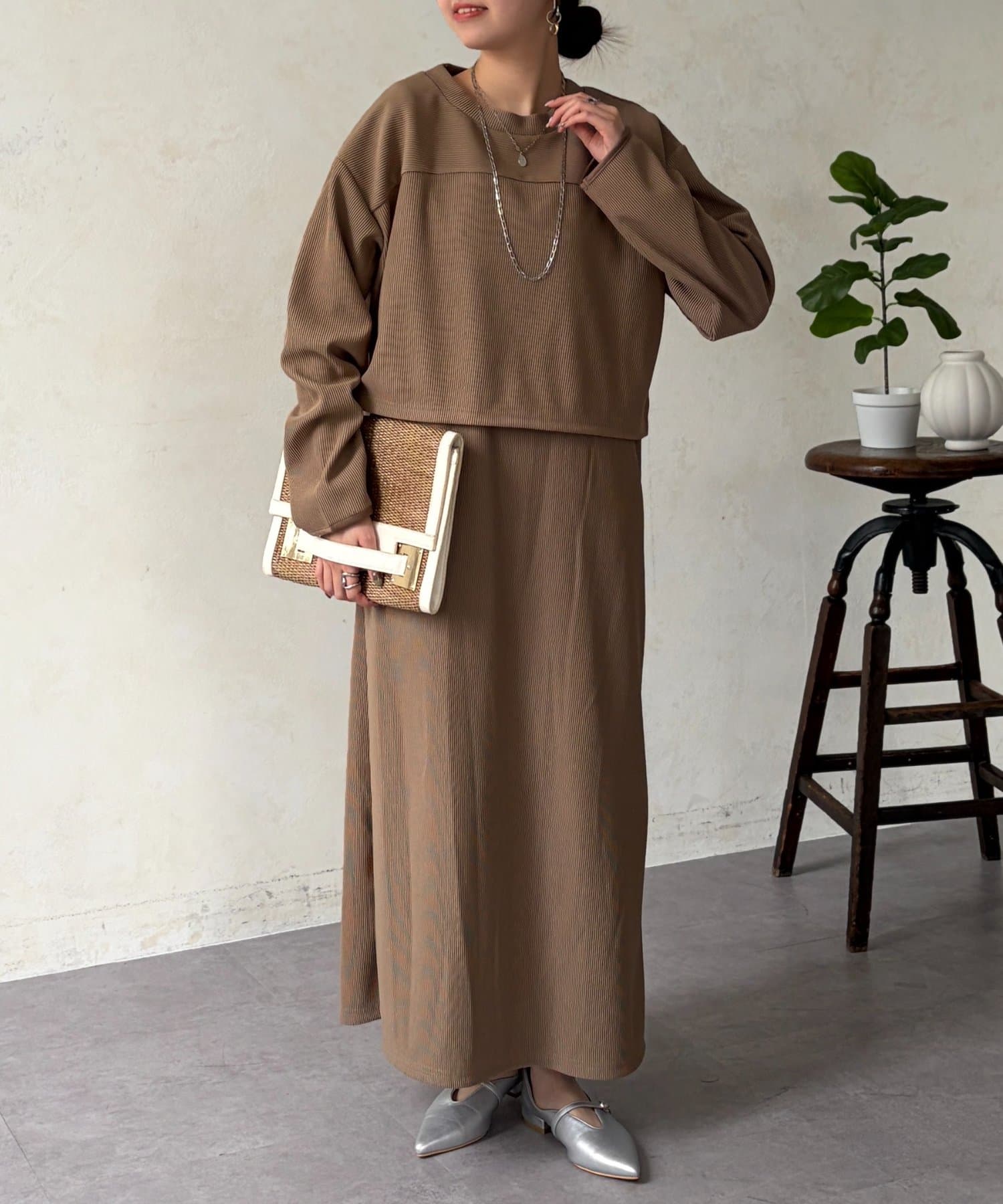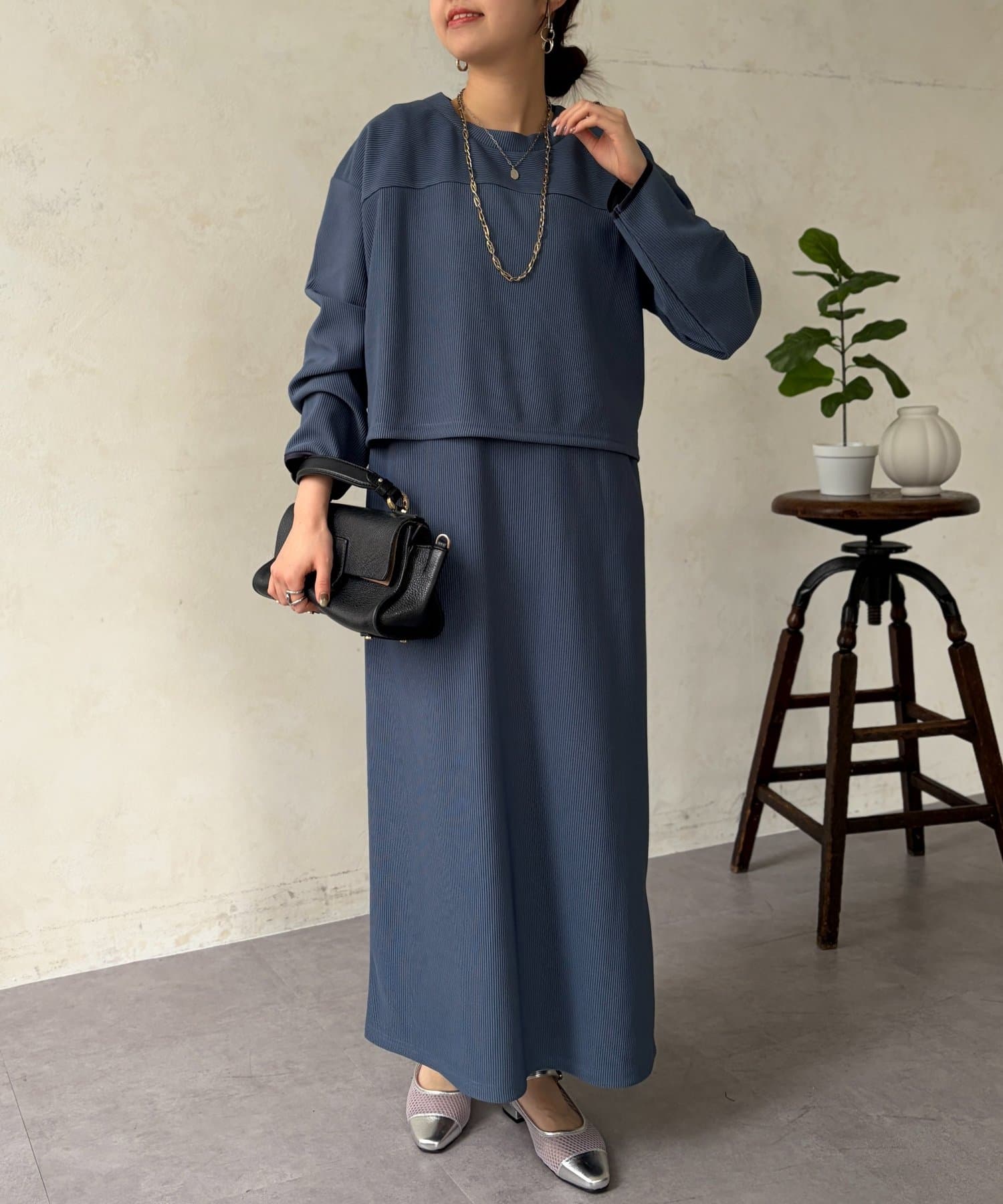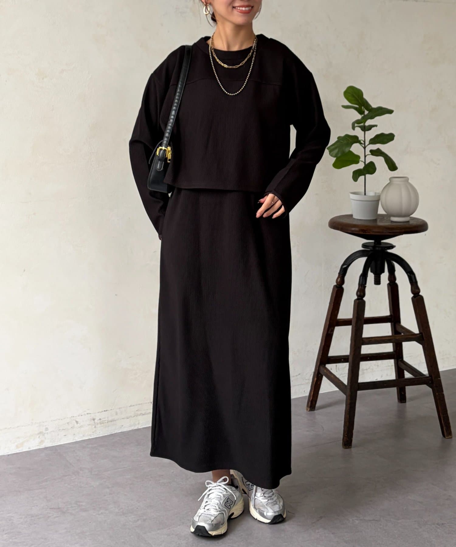 ワンピースはすっきりとした印象ながらタイトすぎないサイズ感で、体型を拾いにくいのが嬉しいポイント◎