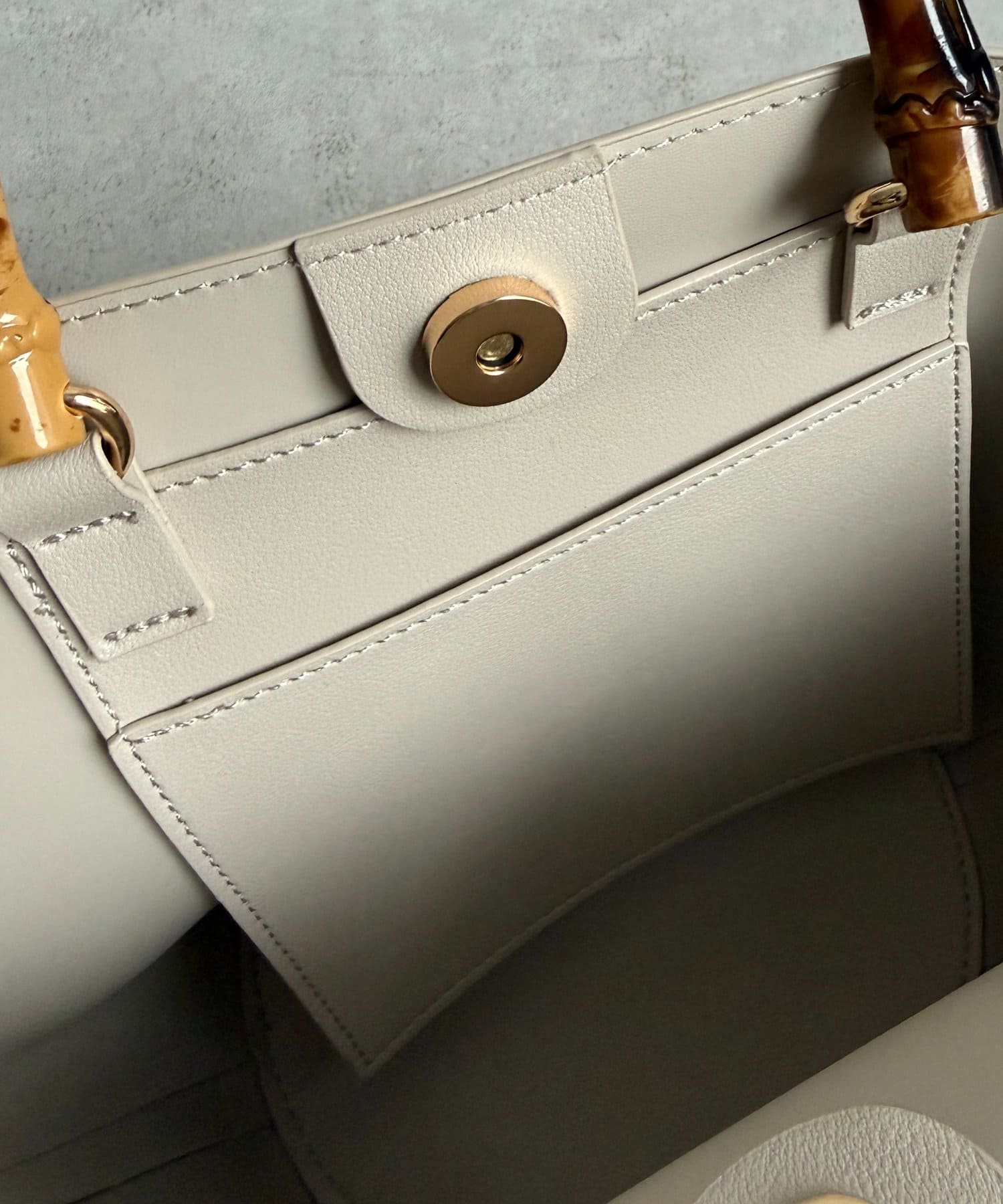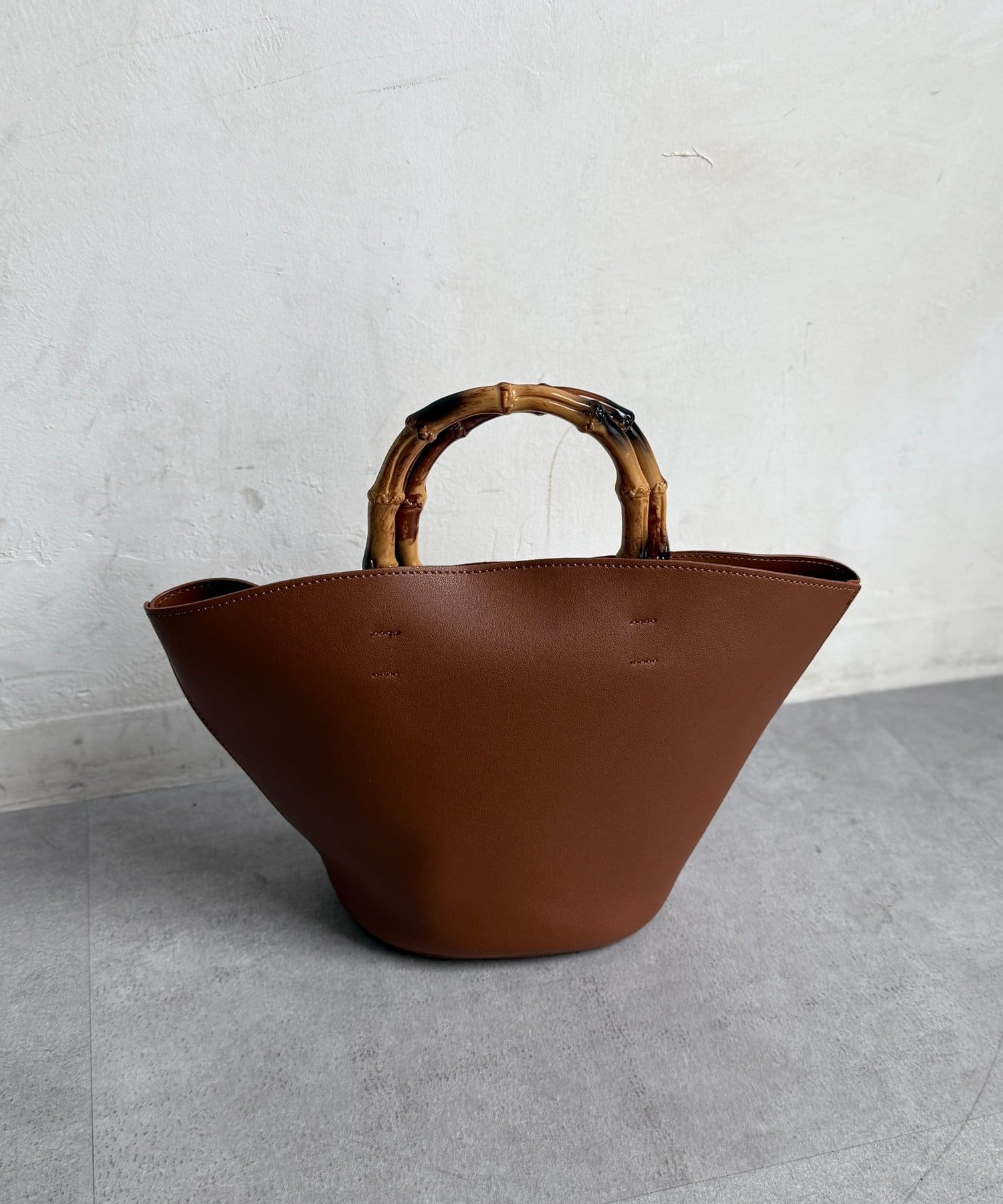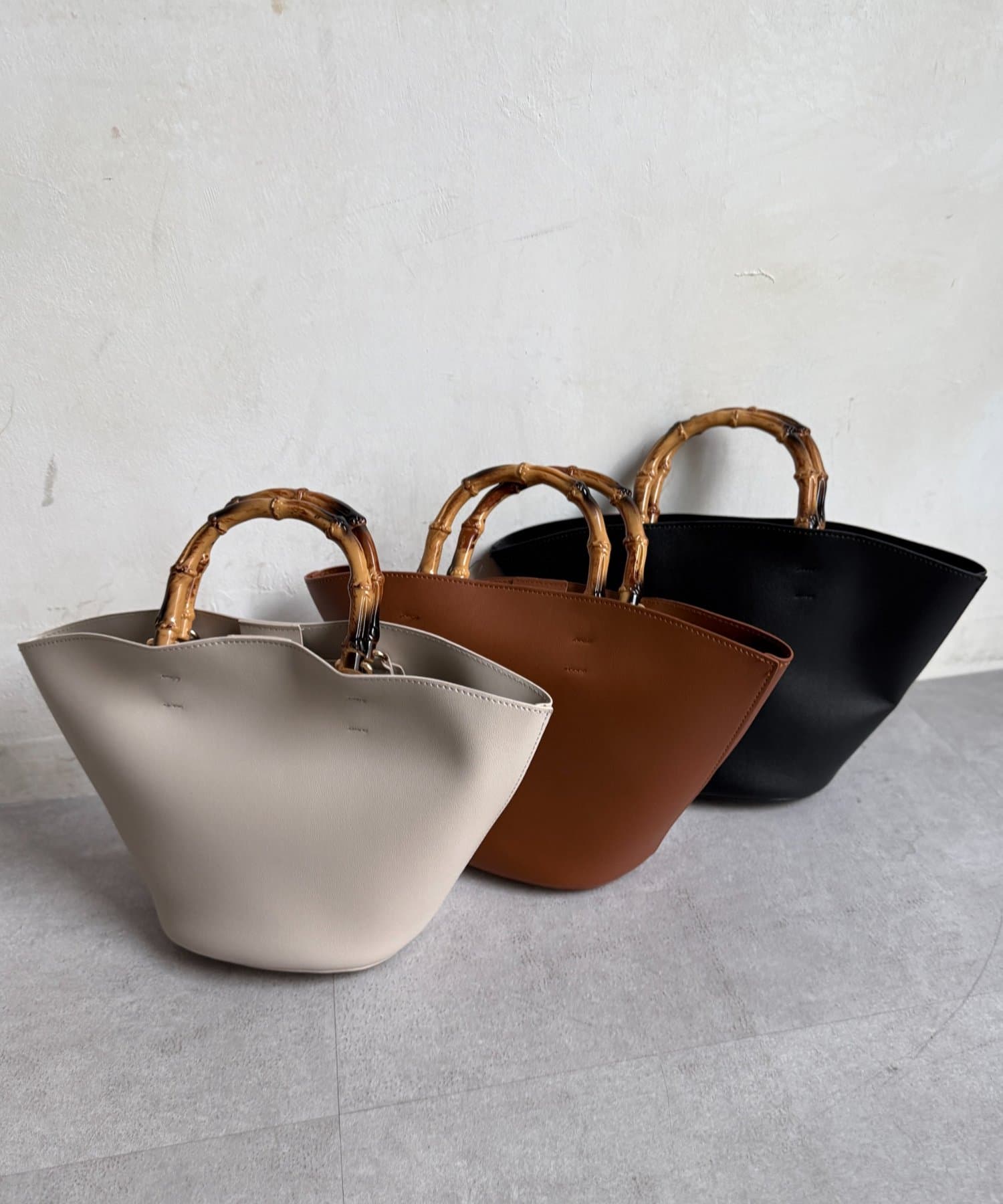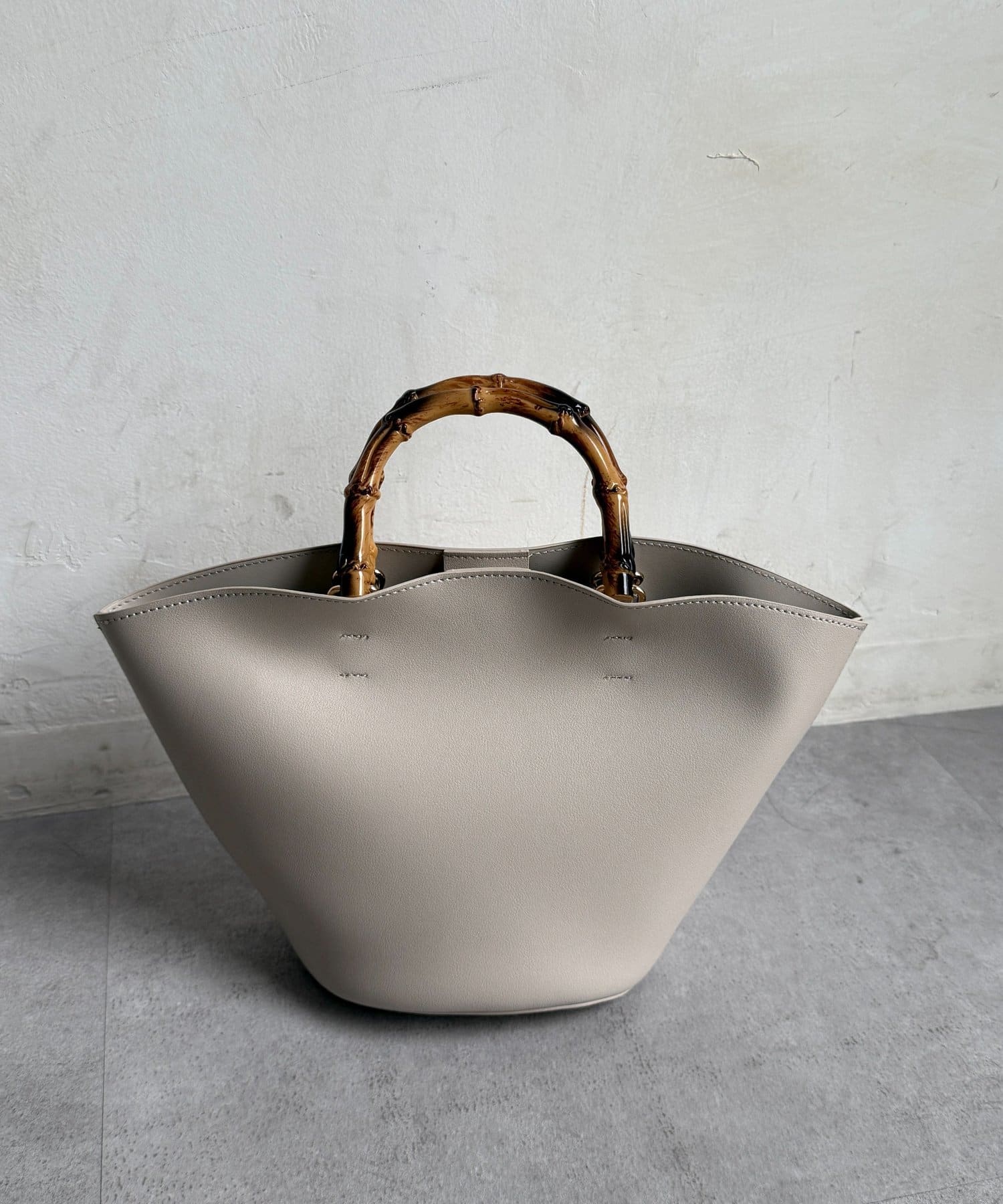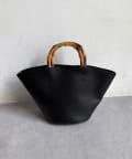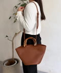 丸みのあるバケツ型のフォルムが大人可愛いデザインで、しっかりと持ちやすいバンブーハンドル。