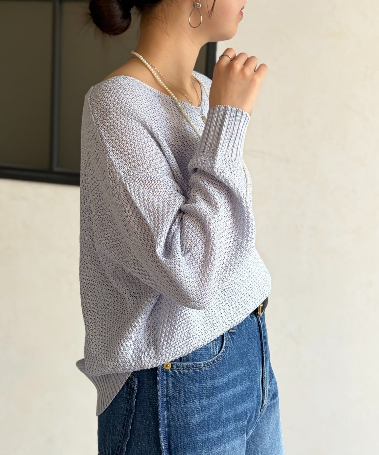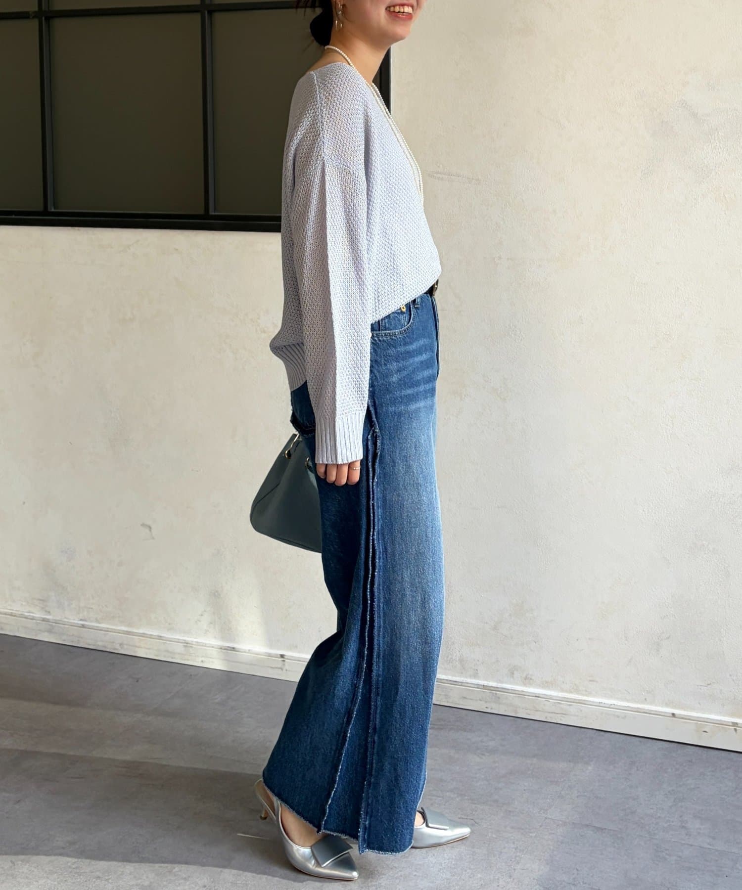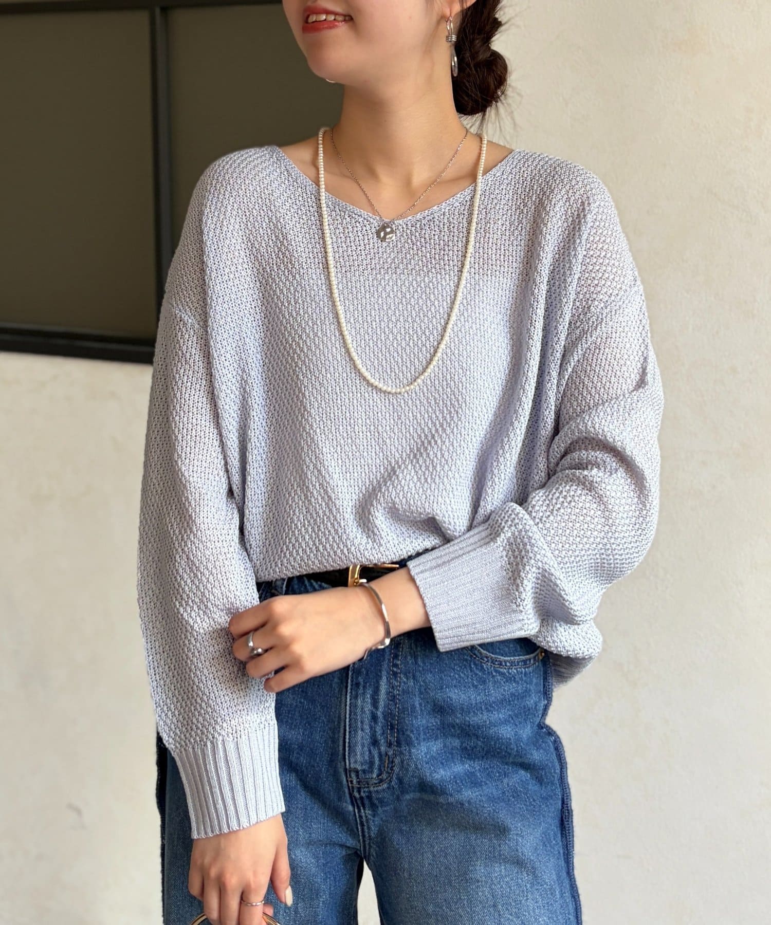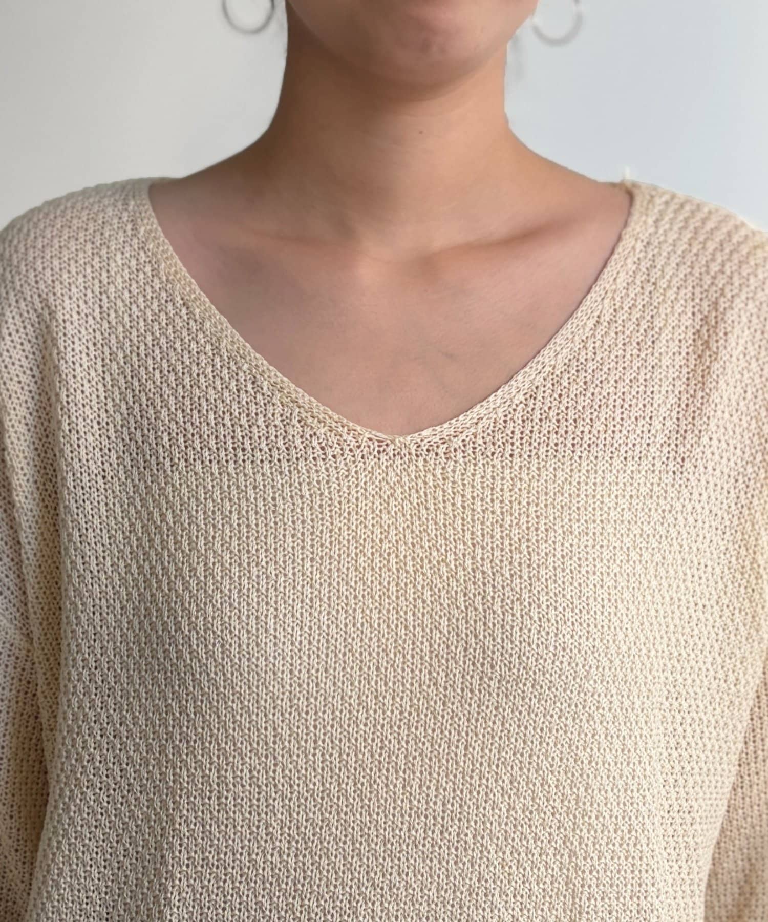 開きすぎないVネックと程よいシアー感が大人の抜け感をプラス