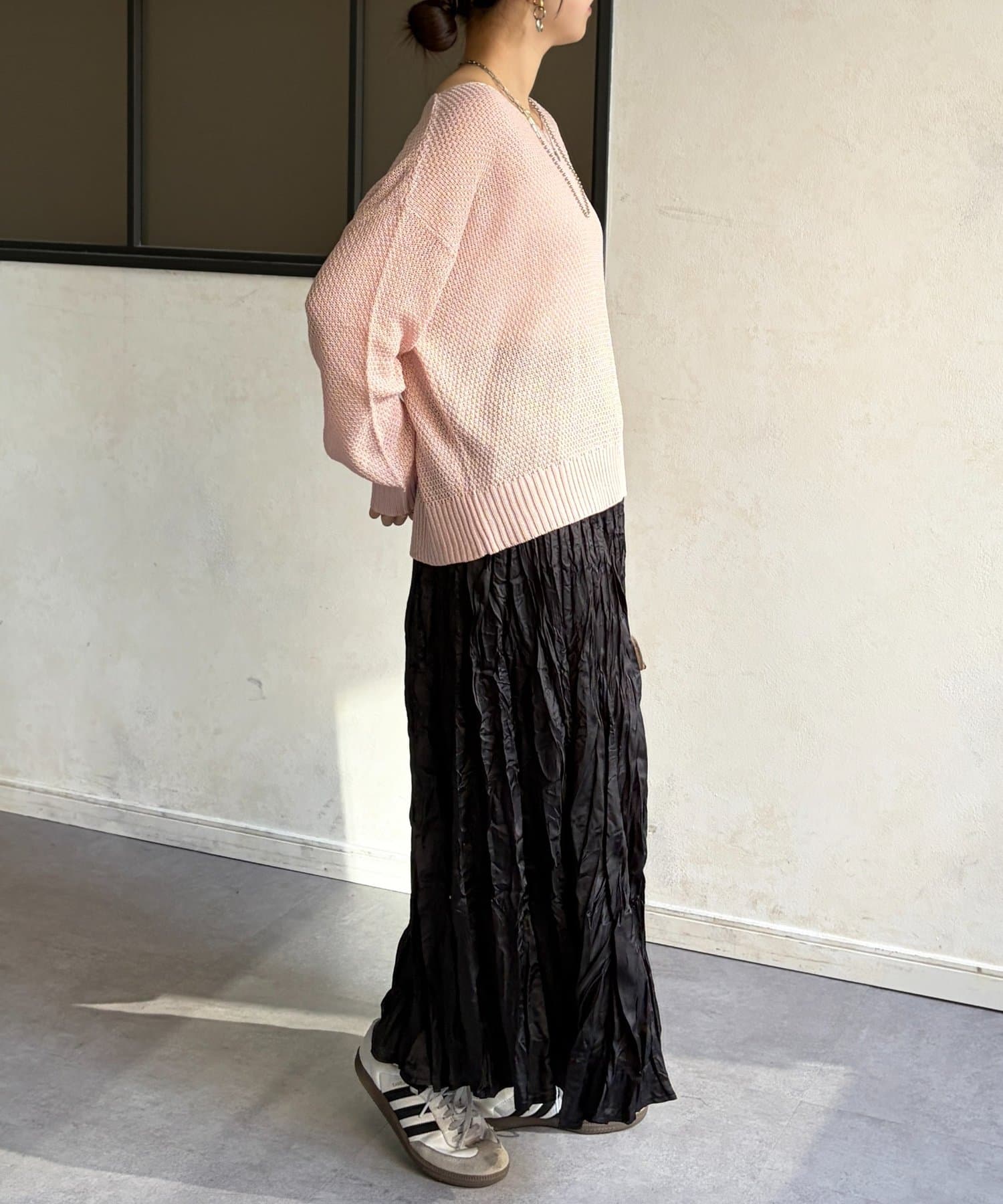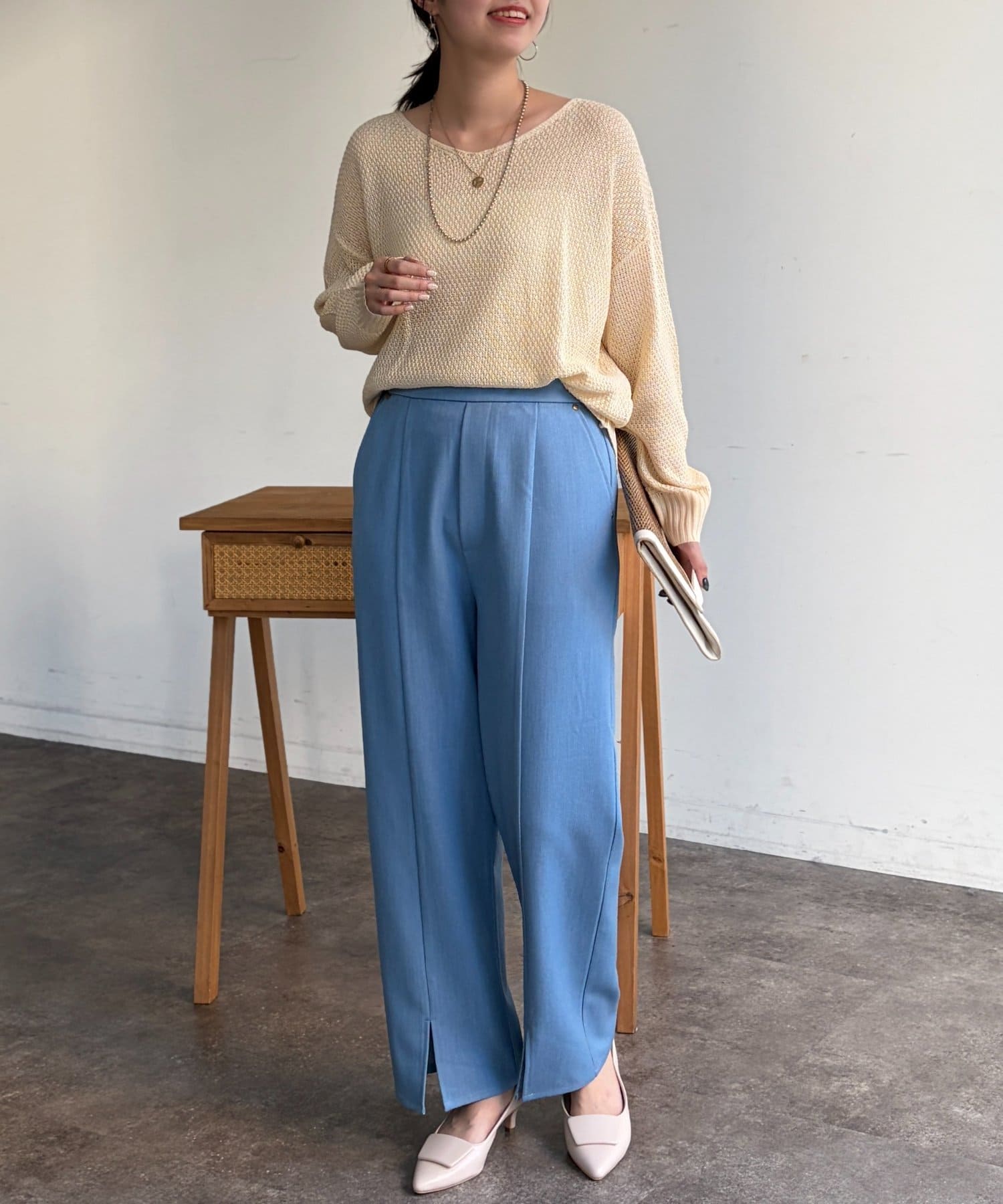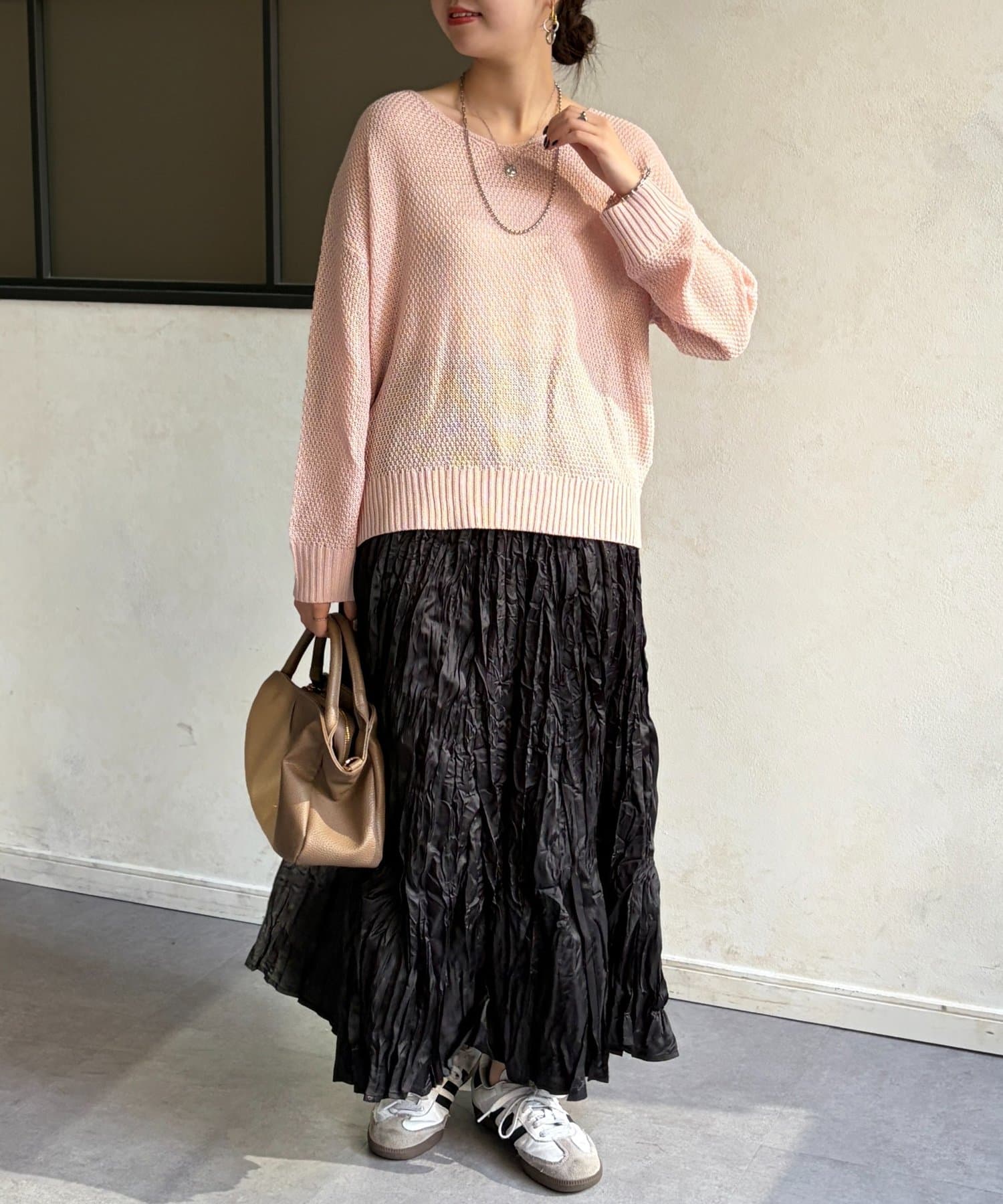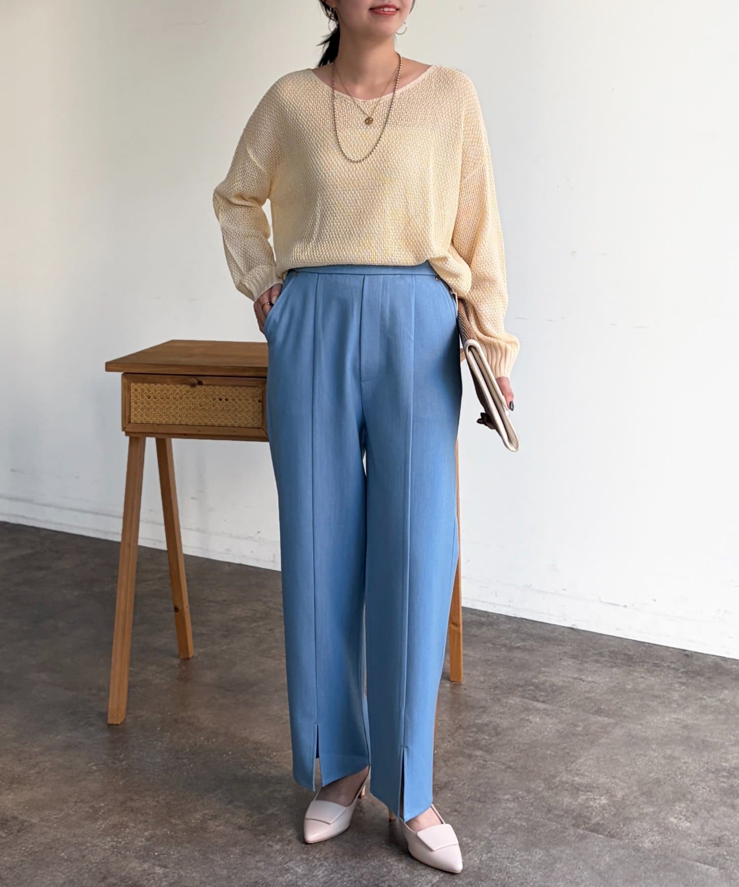 スカート、パンツ、デニムなど幅広いスタイリングにマッチするアイテムです。