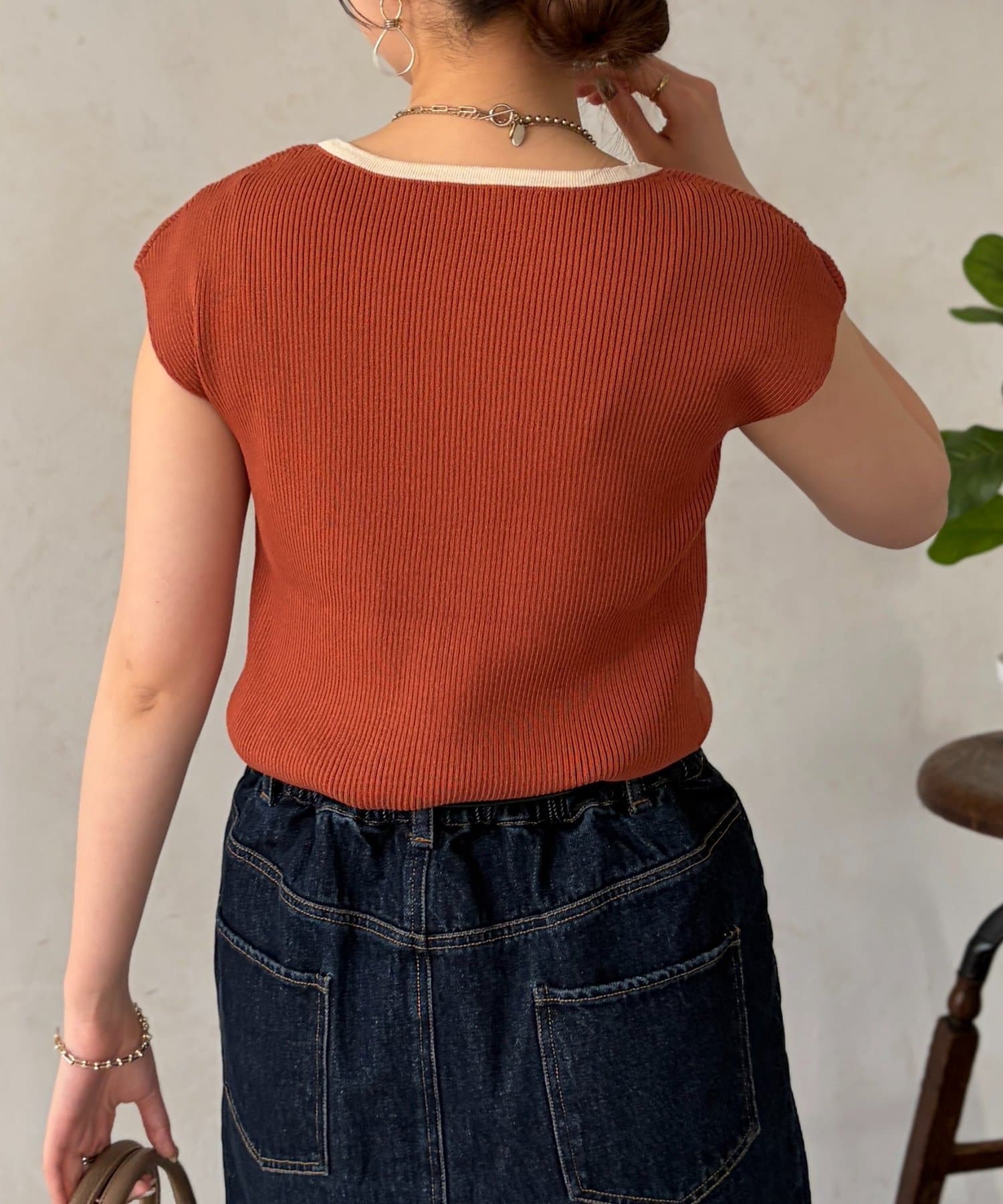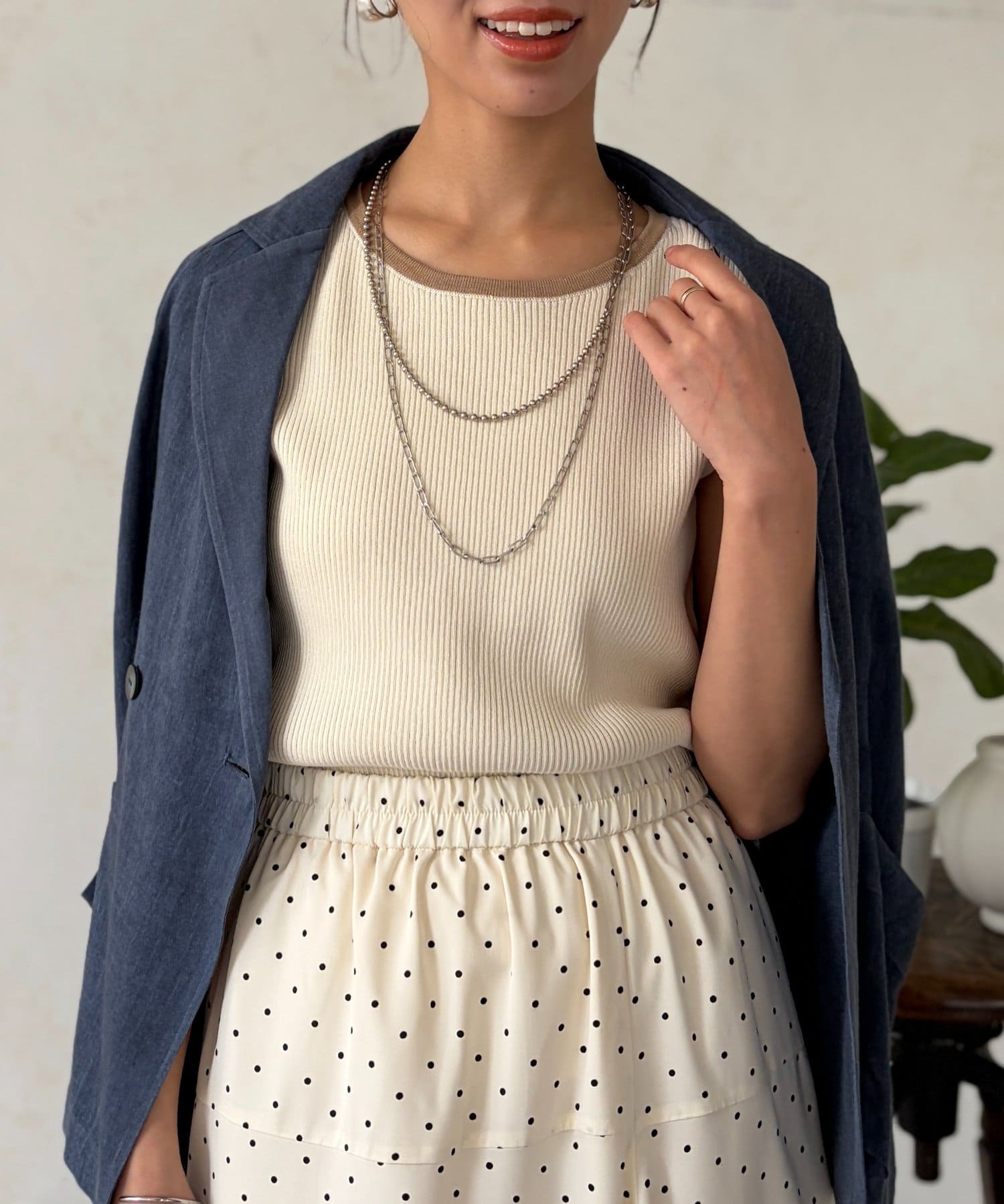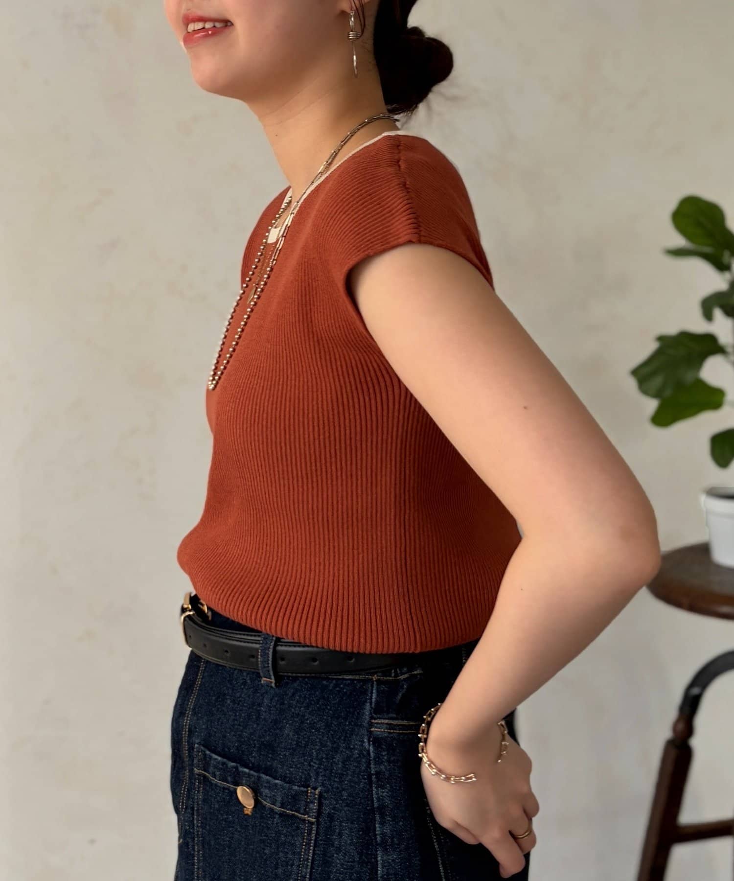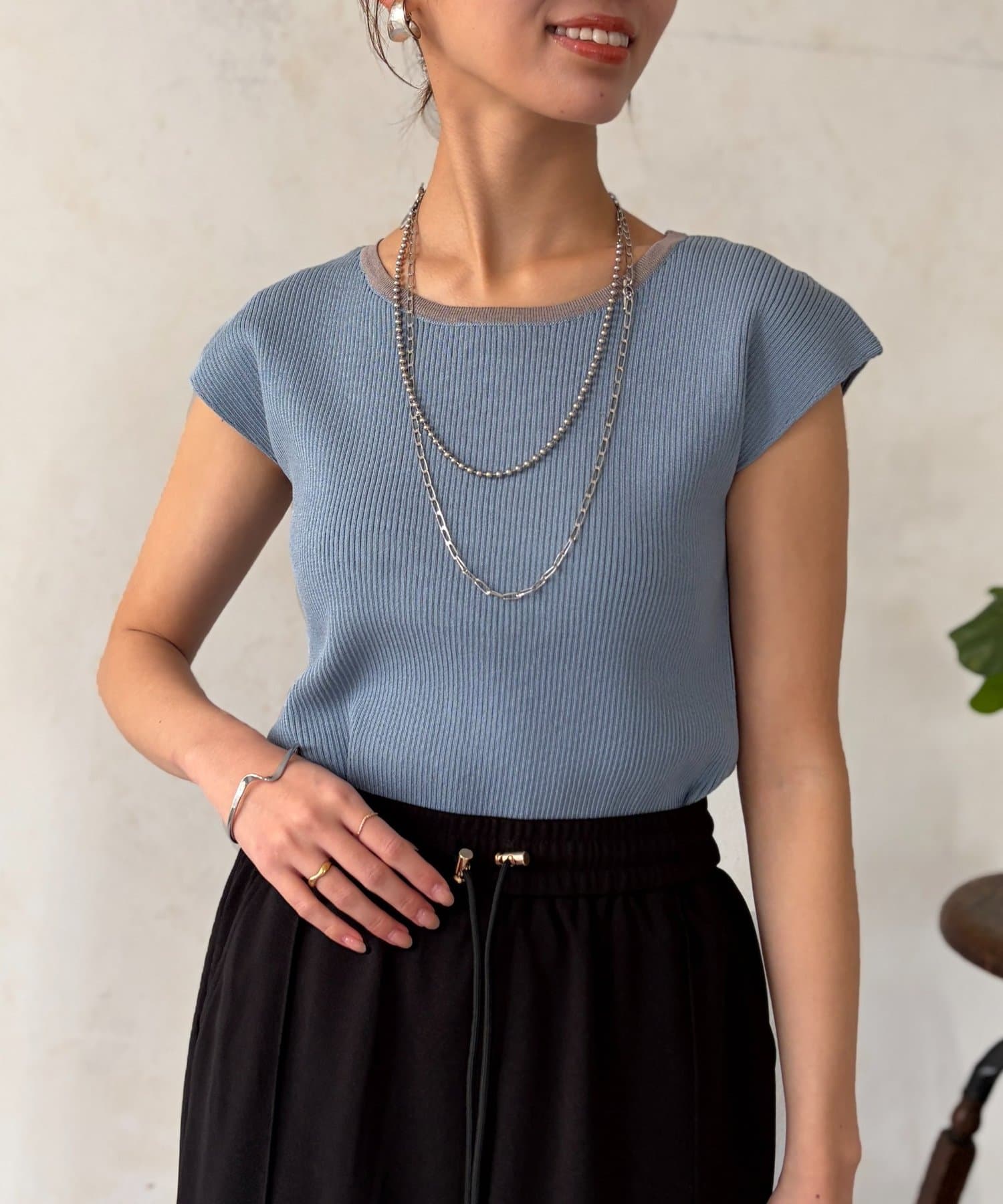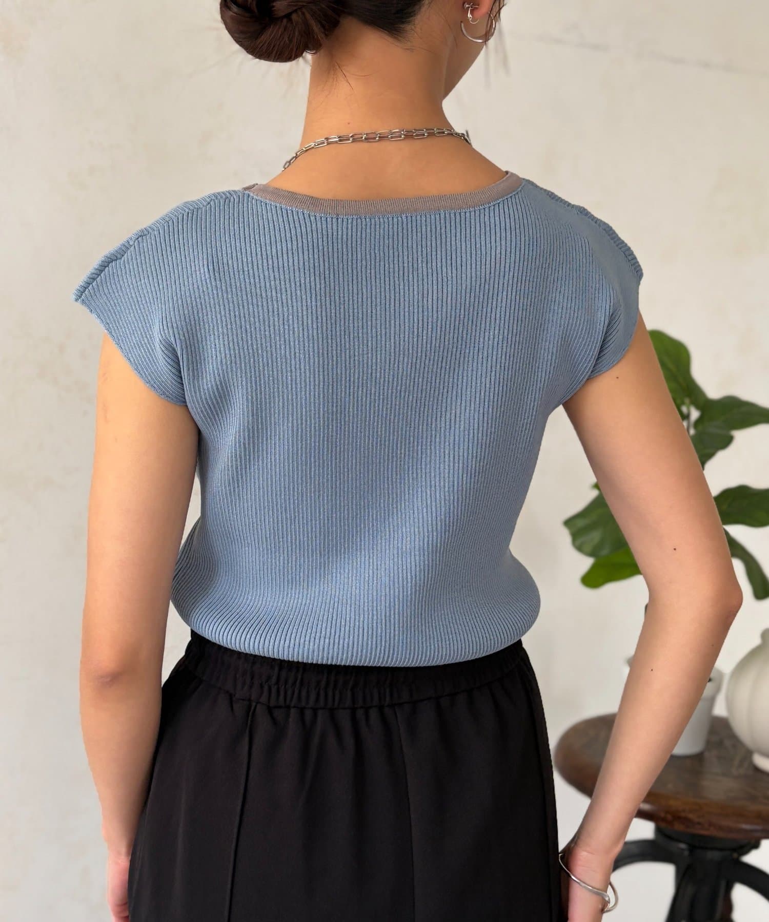 首元にはリブが入っており、インナーが見えにくい開き具合になっているので安心の着心地に。