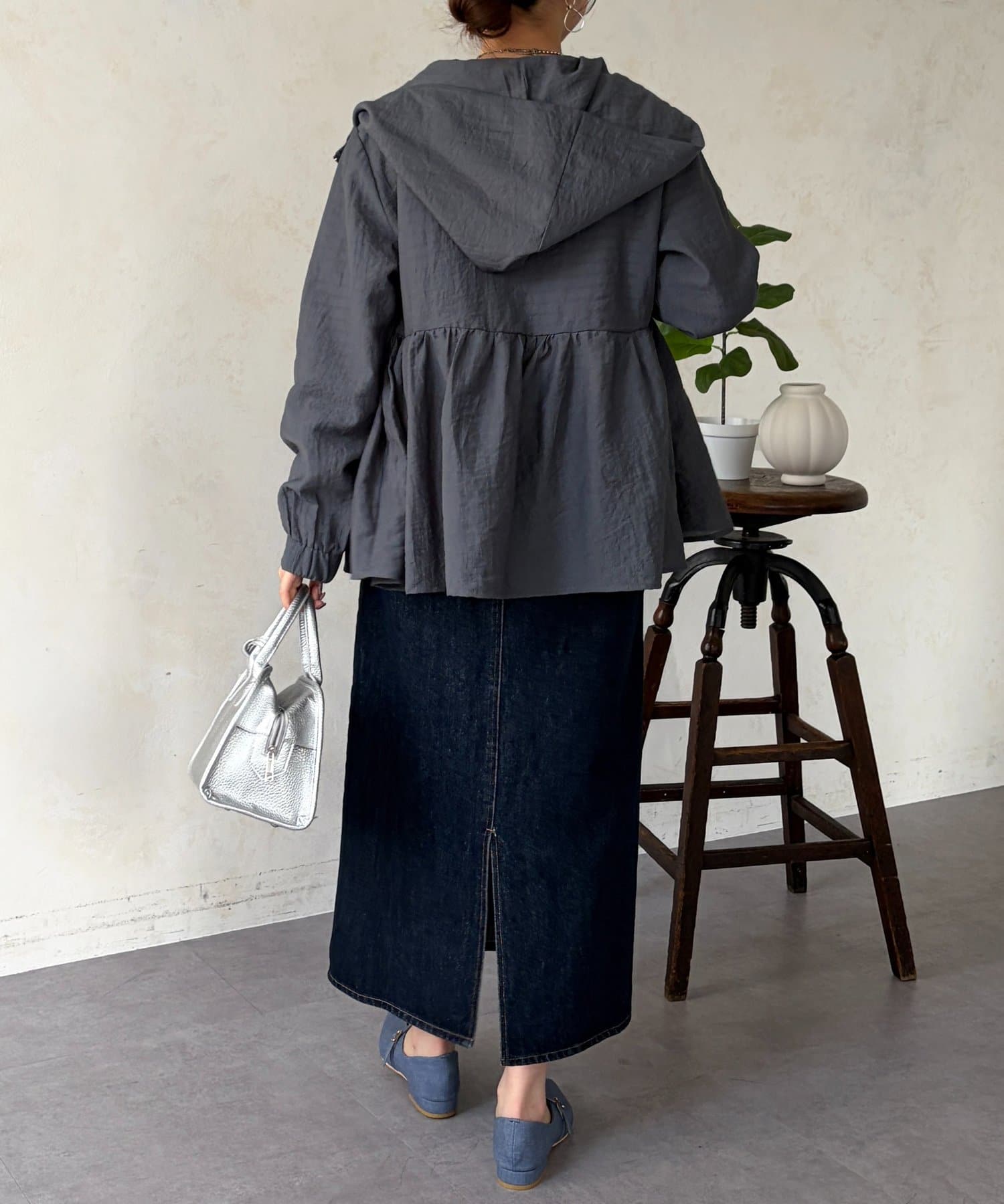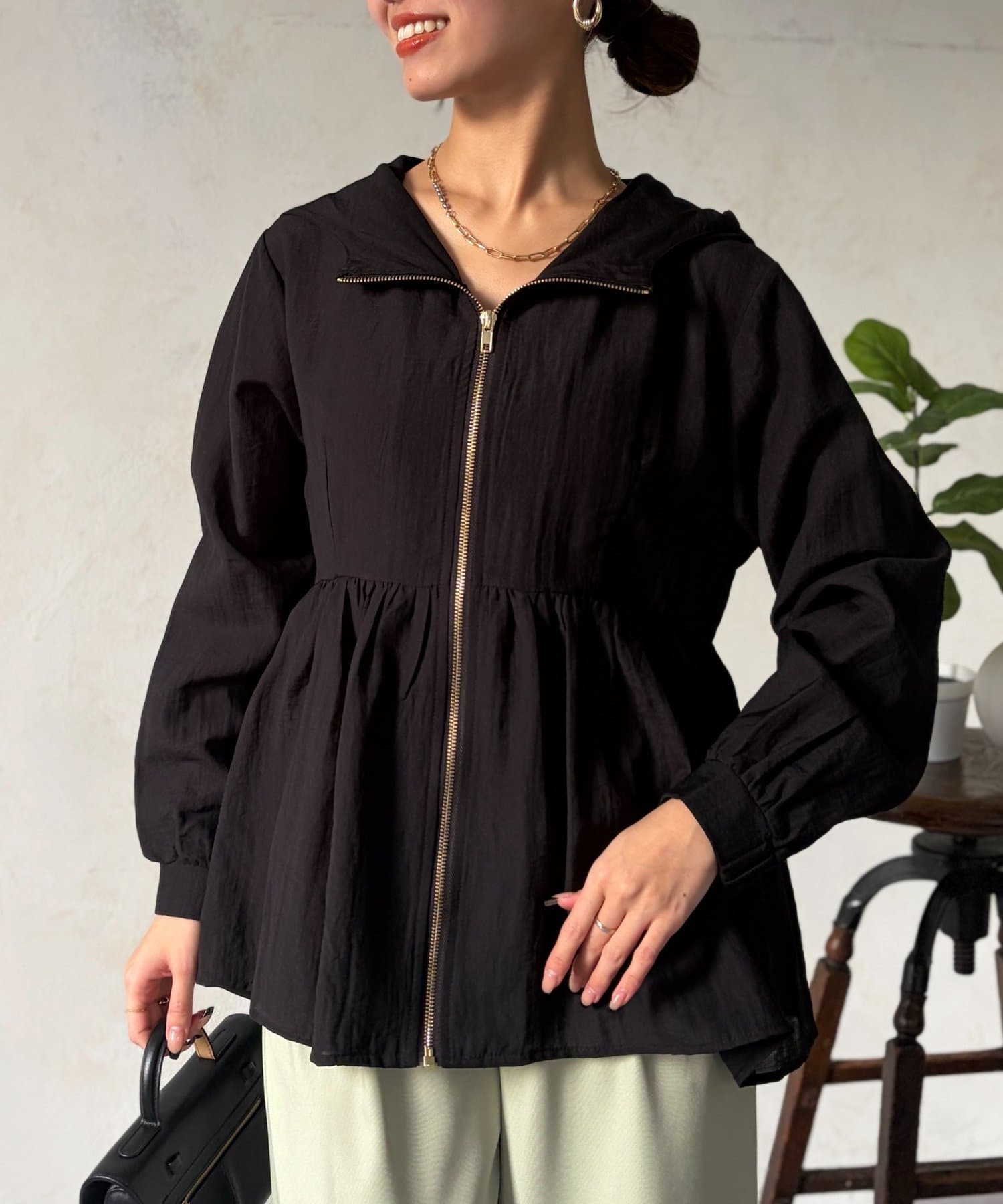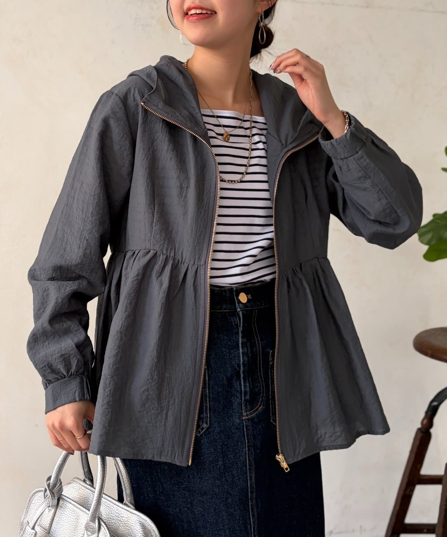 ペプラムシルエットがフェミニンな印象で、さり気なく体型カバーもしてくれるブルゾン。