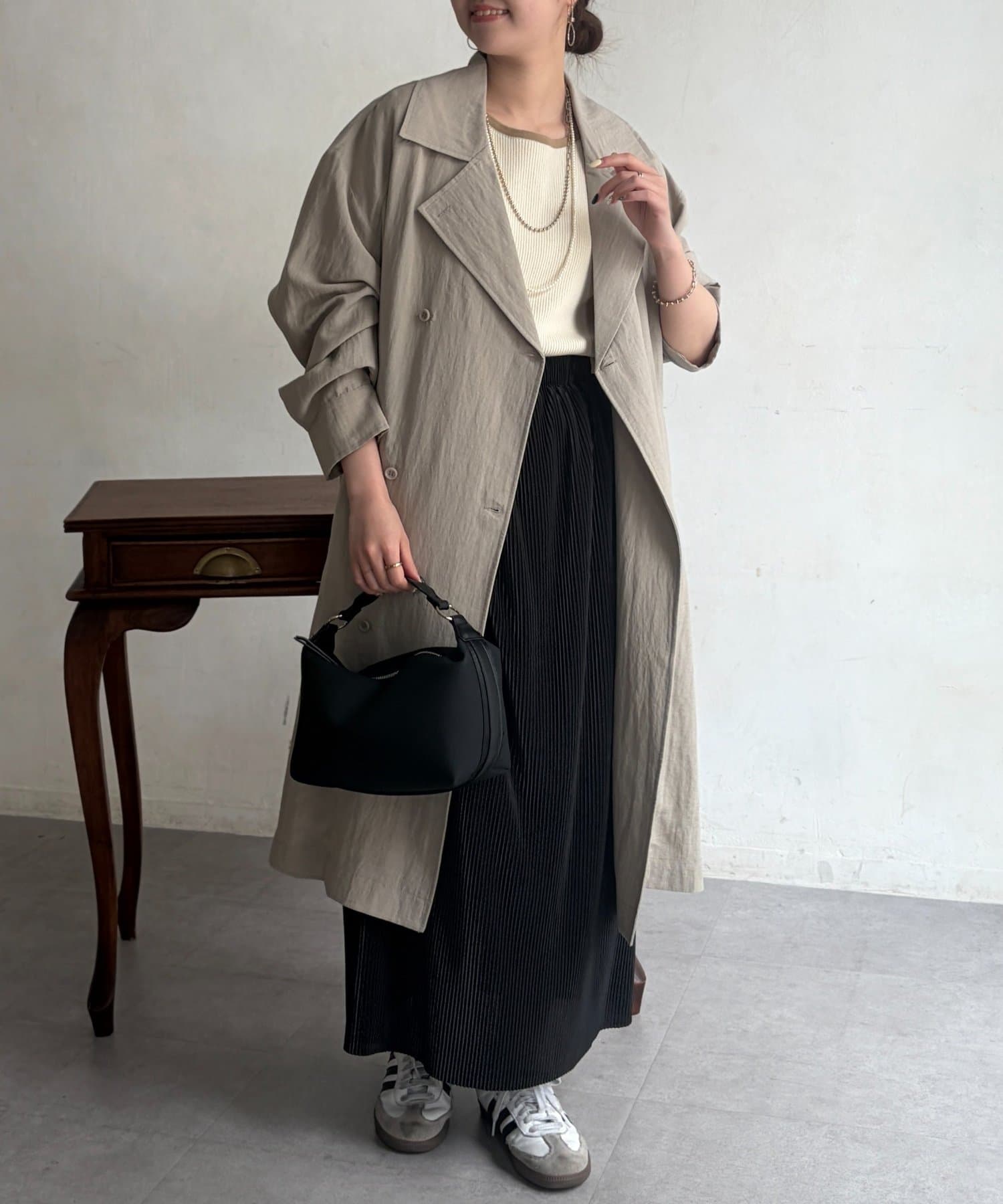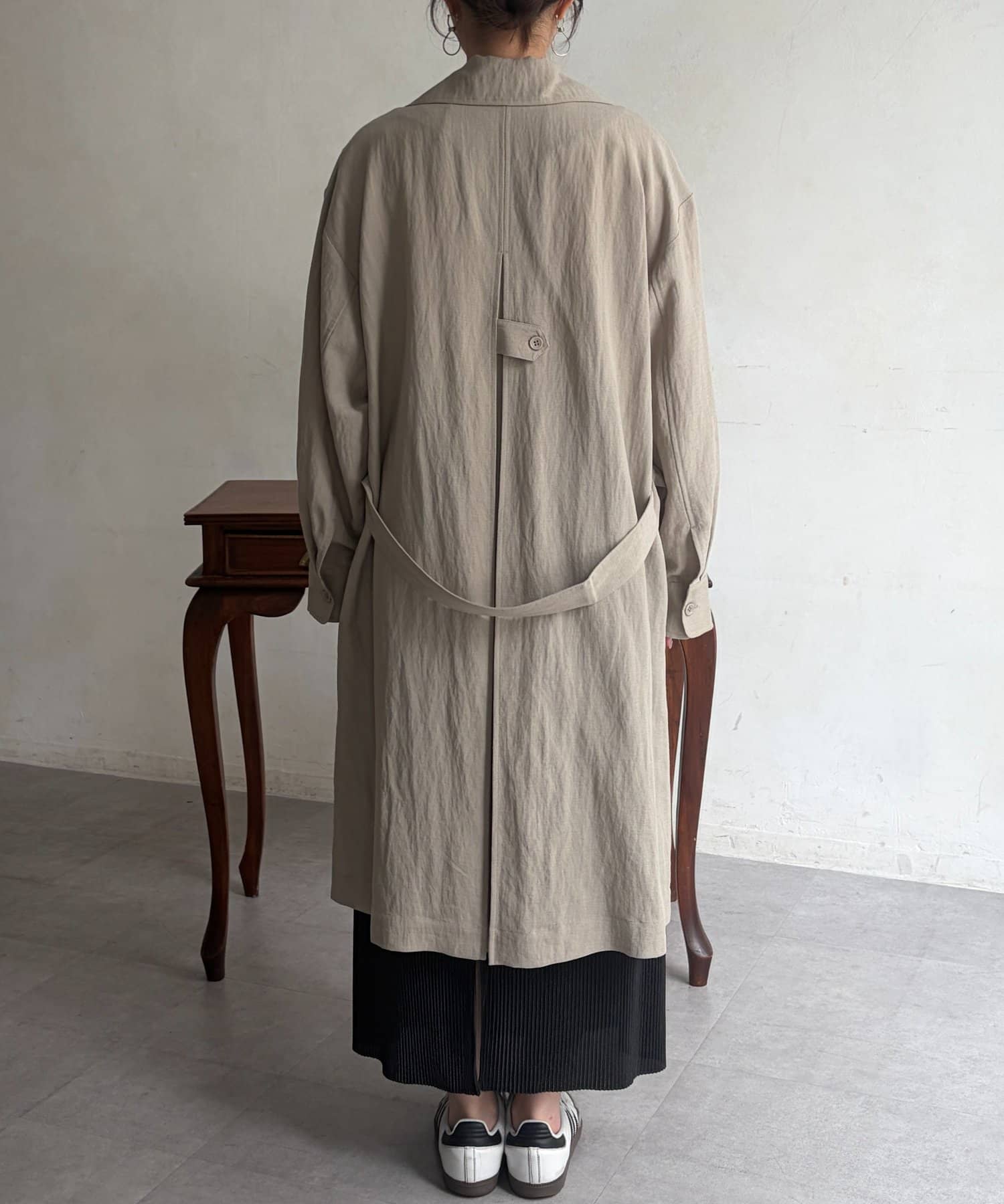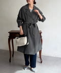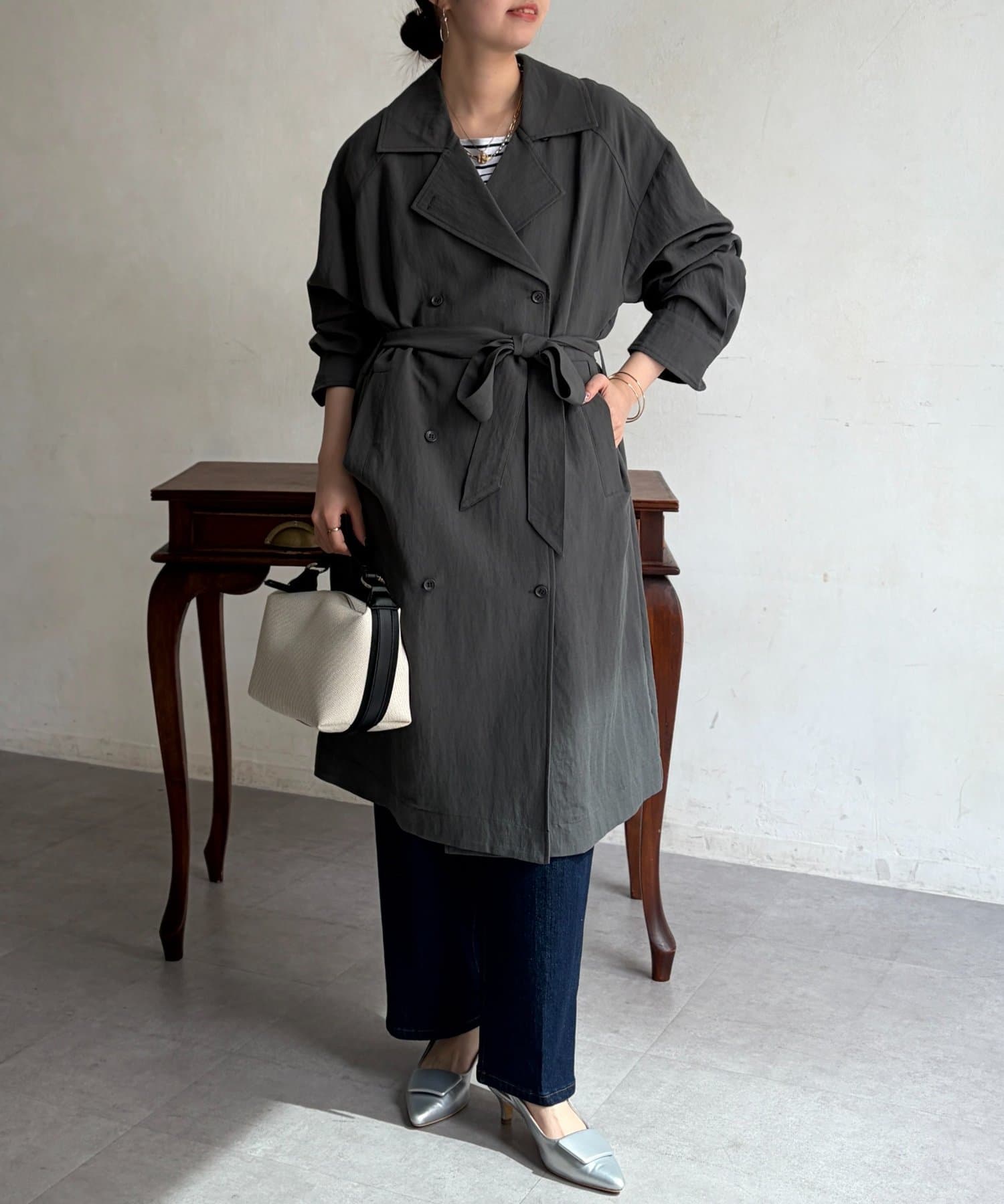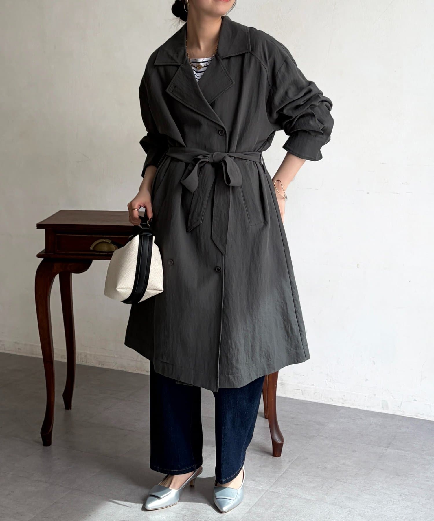 トレンチコートのデザインですがシャツ感覚で羽織ることができ、春先の羽織りとして活躍する1着です。