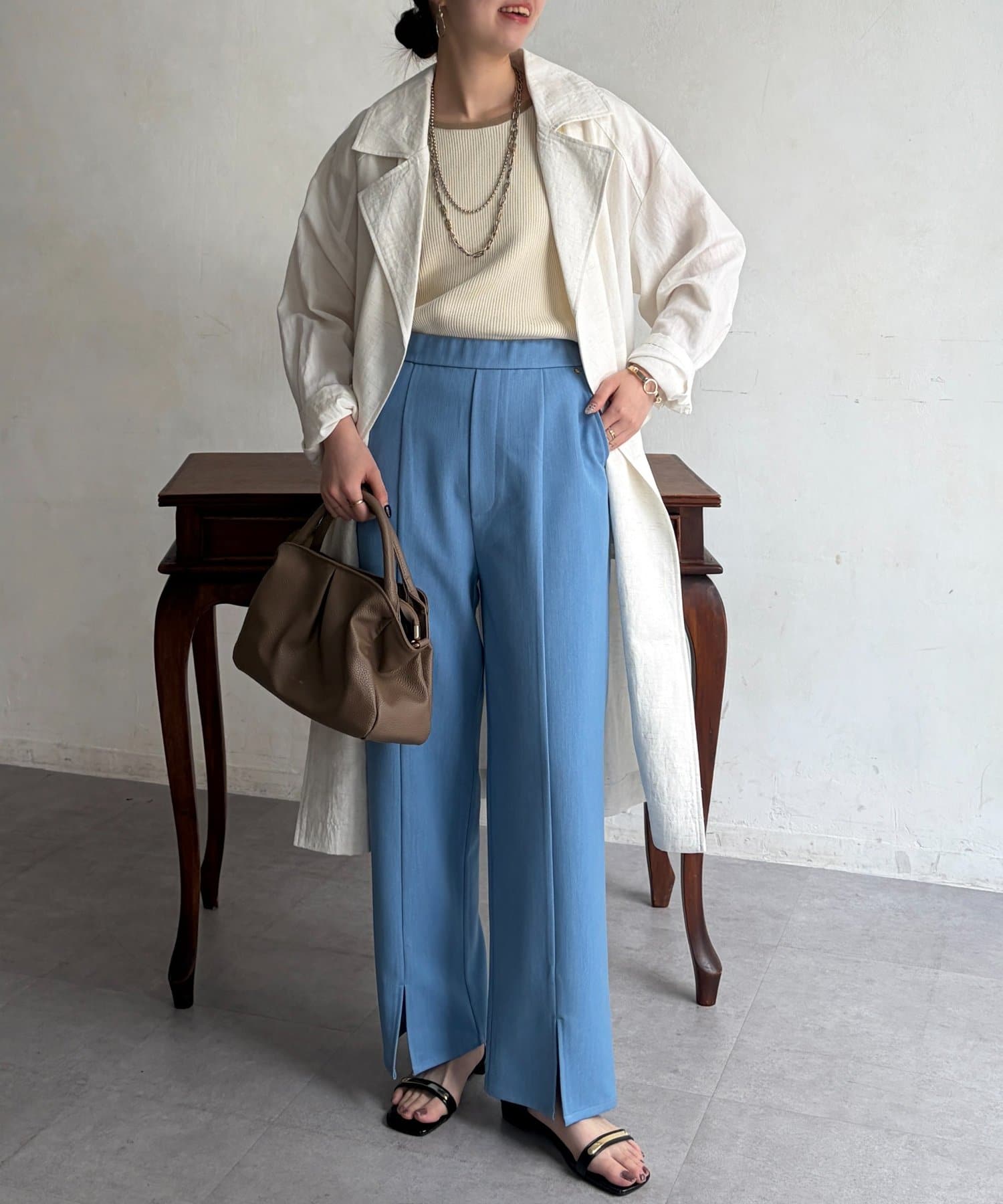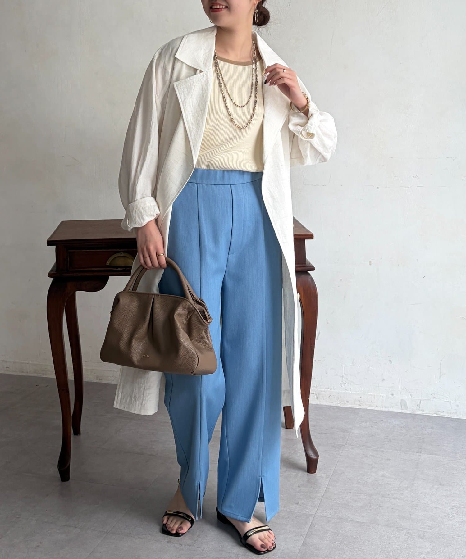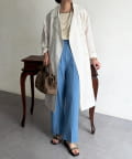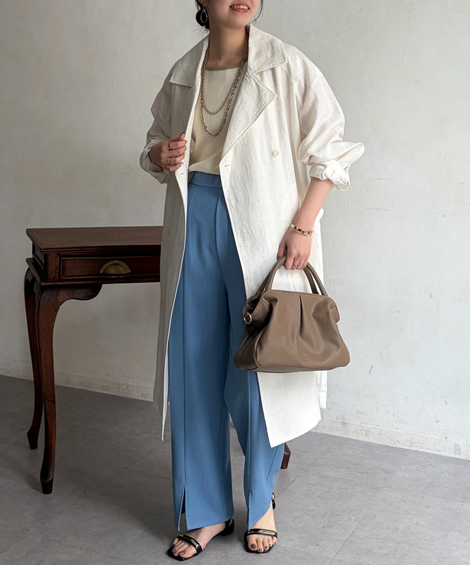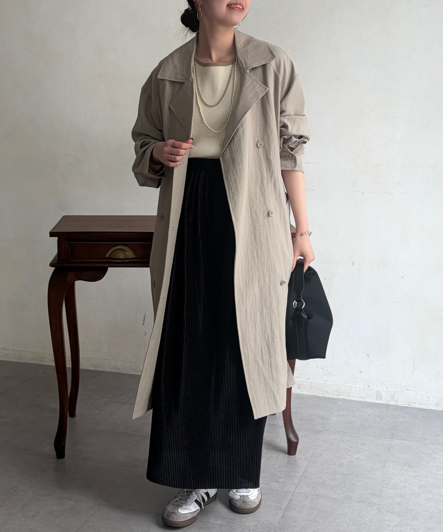 トレンチコートのデザインですがシャツ感覚で羽織ることができ、春先の羽織りとして活躍する1着です。