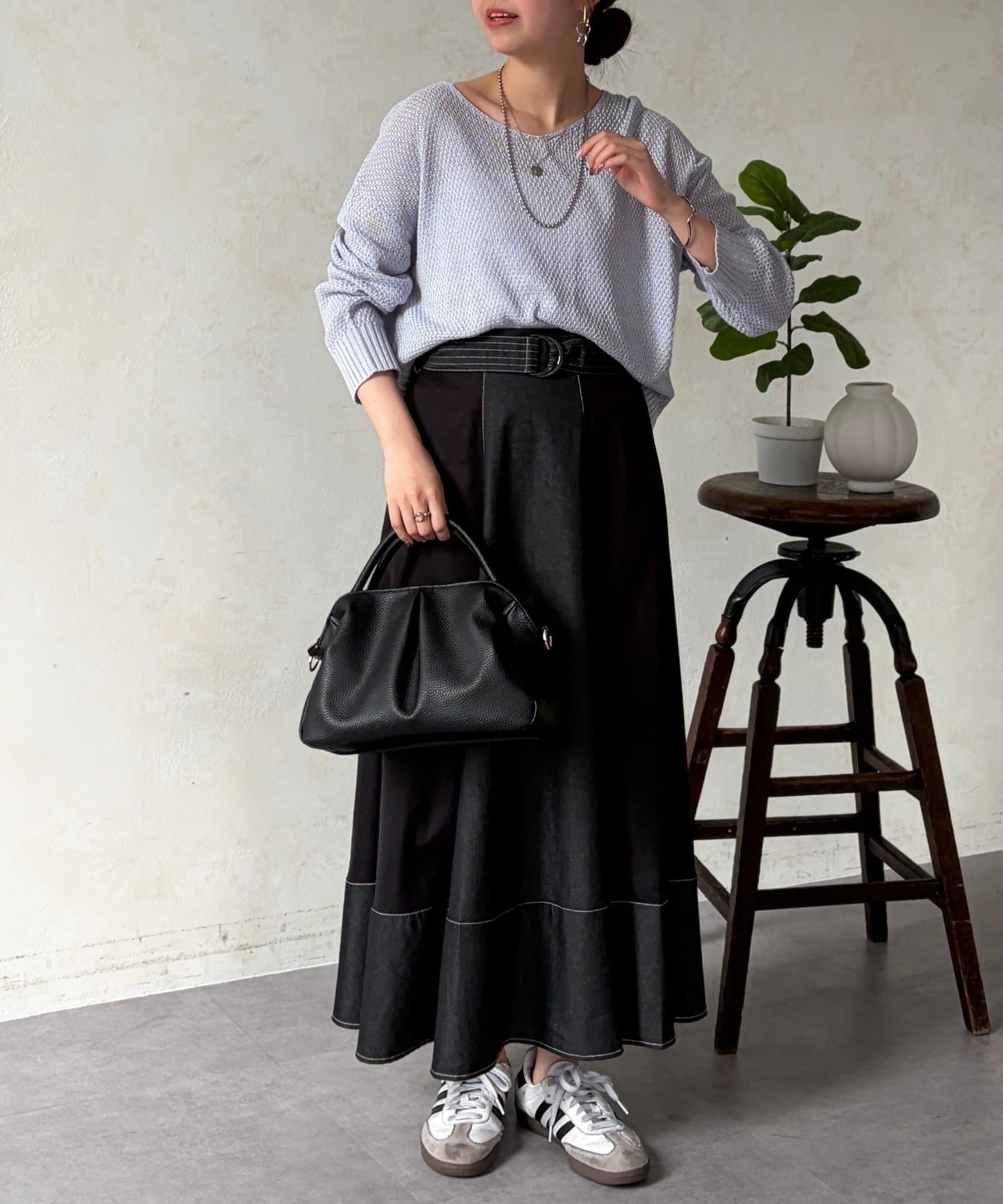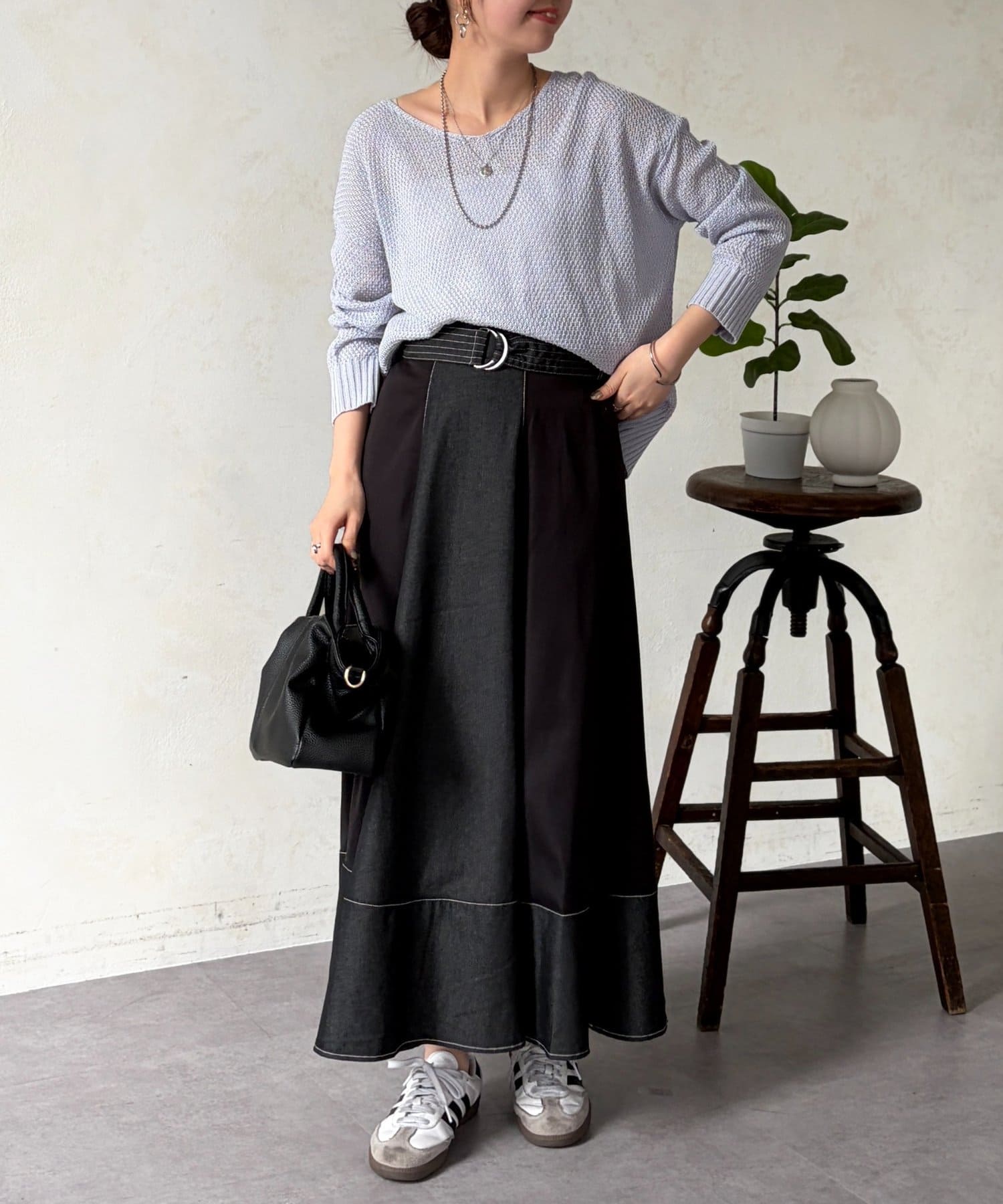 ブラウスやシャツ、軽めのニットと合わせた春らしいコーディネートがオススメ。