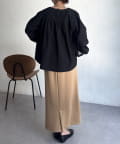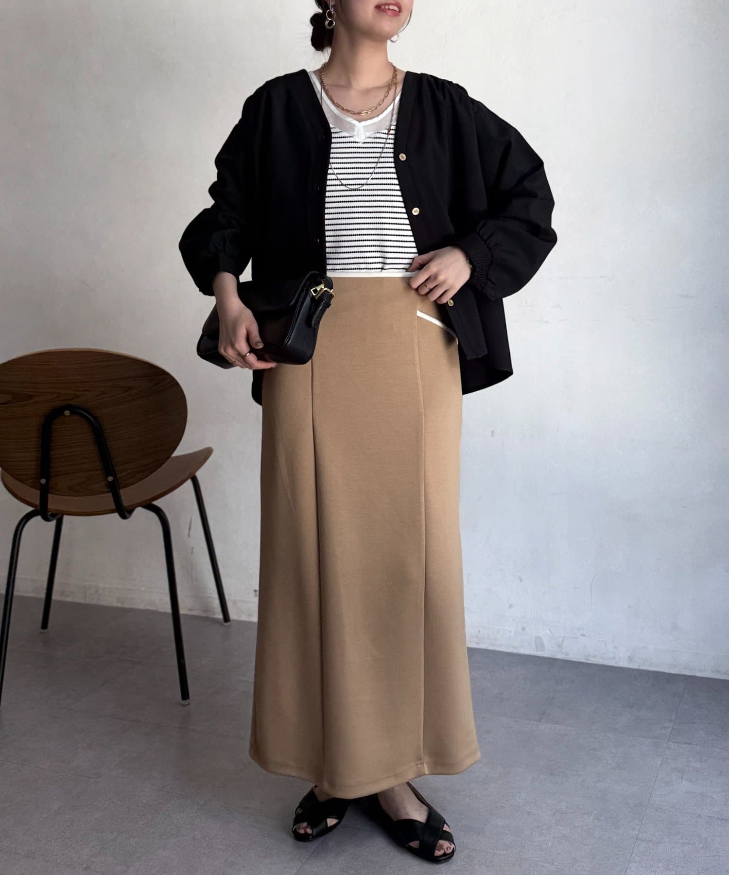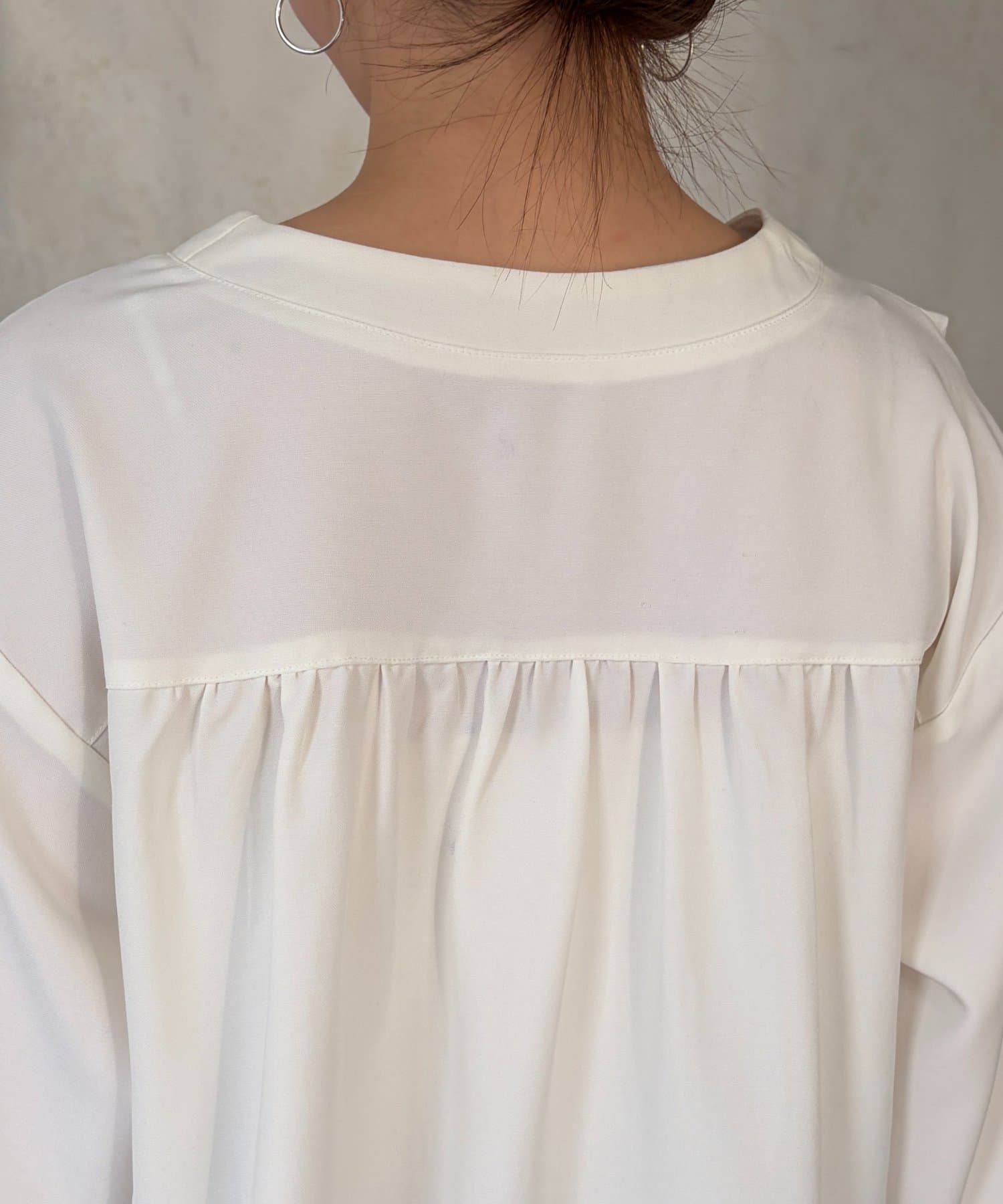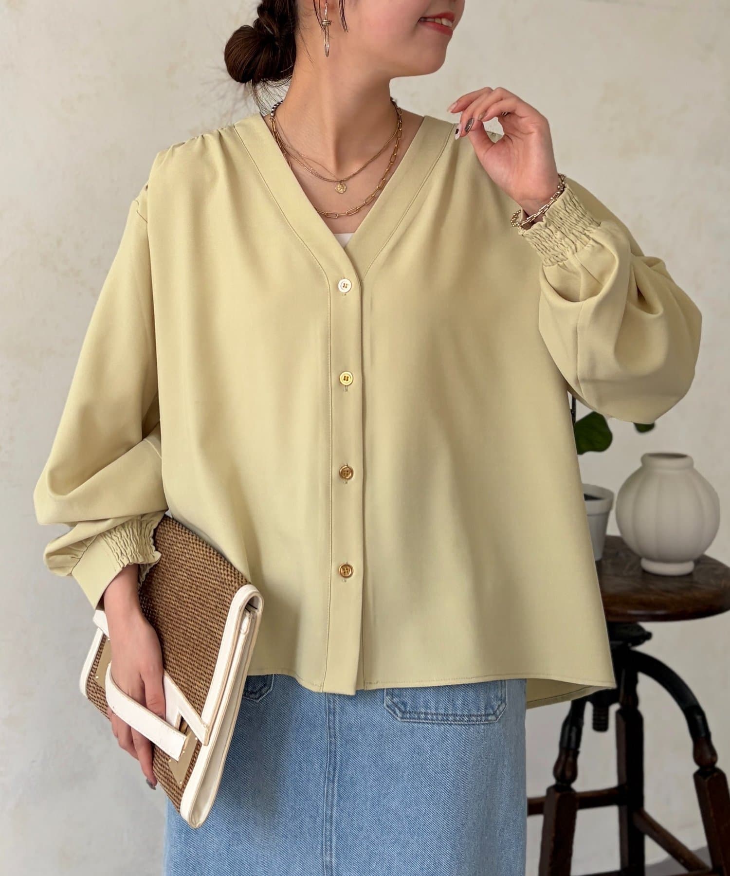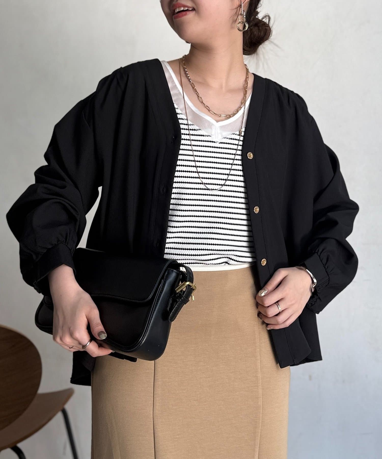カットソー合わせはもちろん着流しタイプのデザインなので、襟のあるシャツとのレイヤードもばっちり決まります。