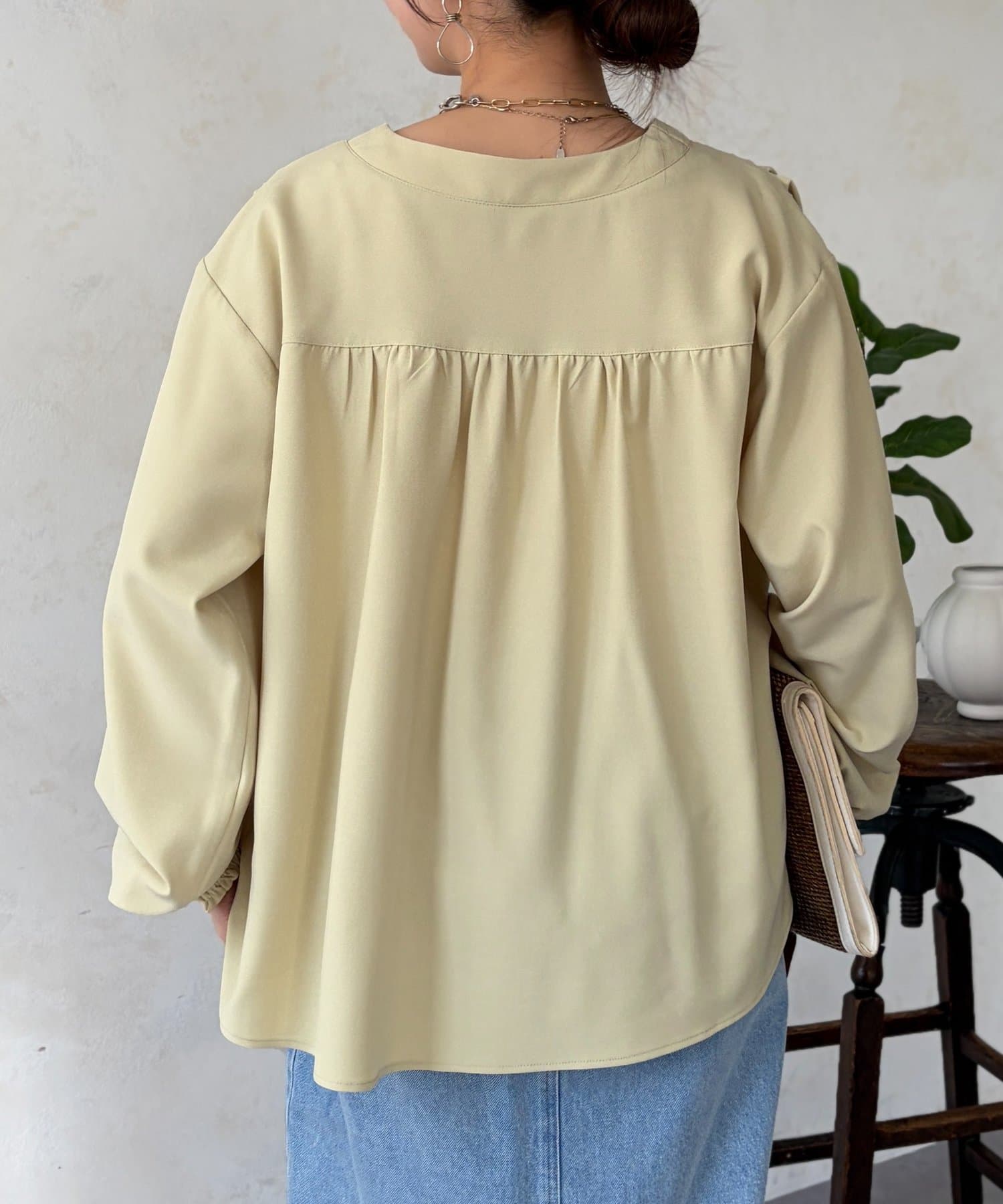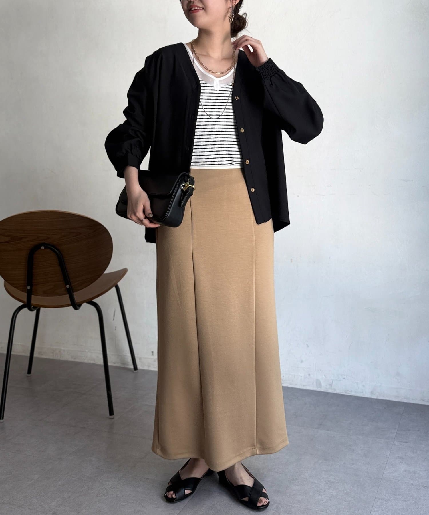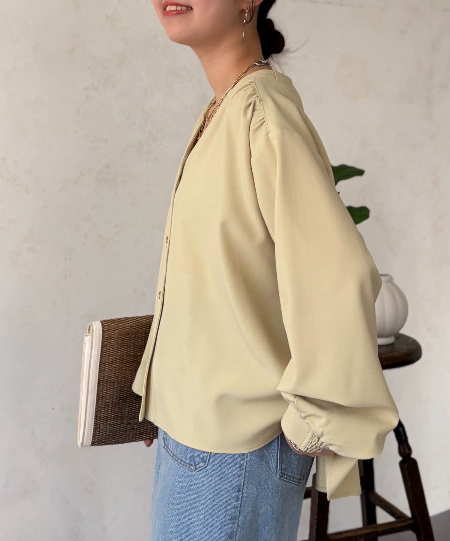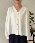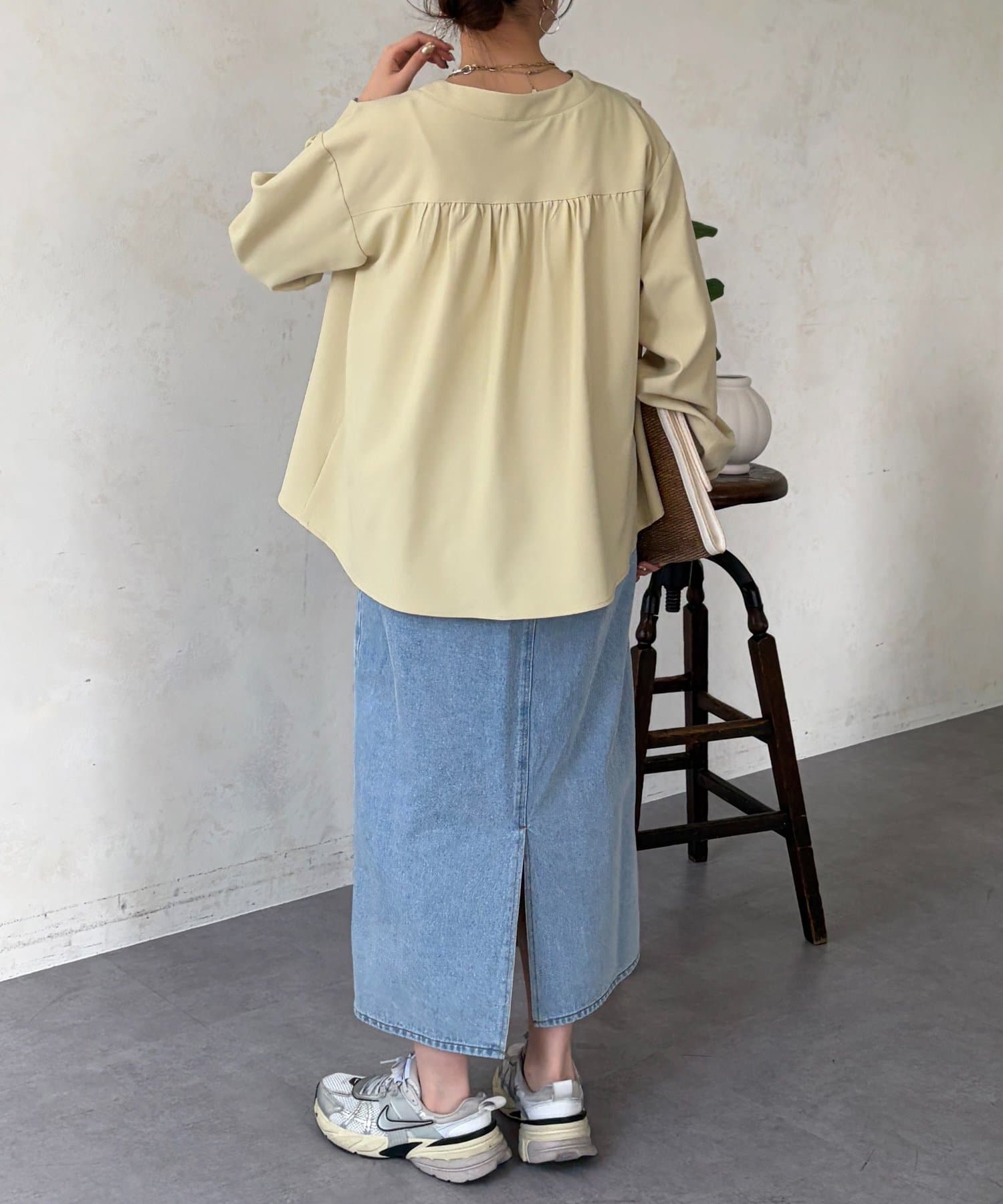 カットソー合わせはもちろん着流しタイプのデザインなので、襟のあるシャツとのレイヤードもばっちり決まります。