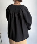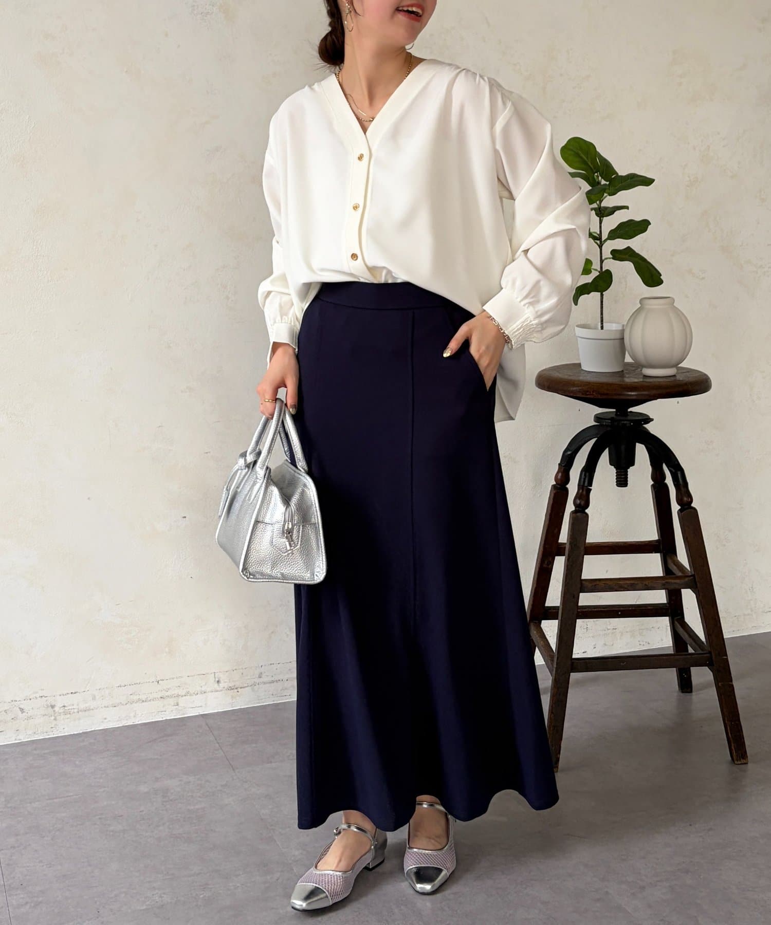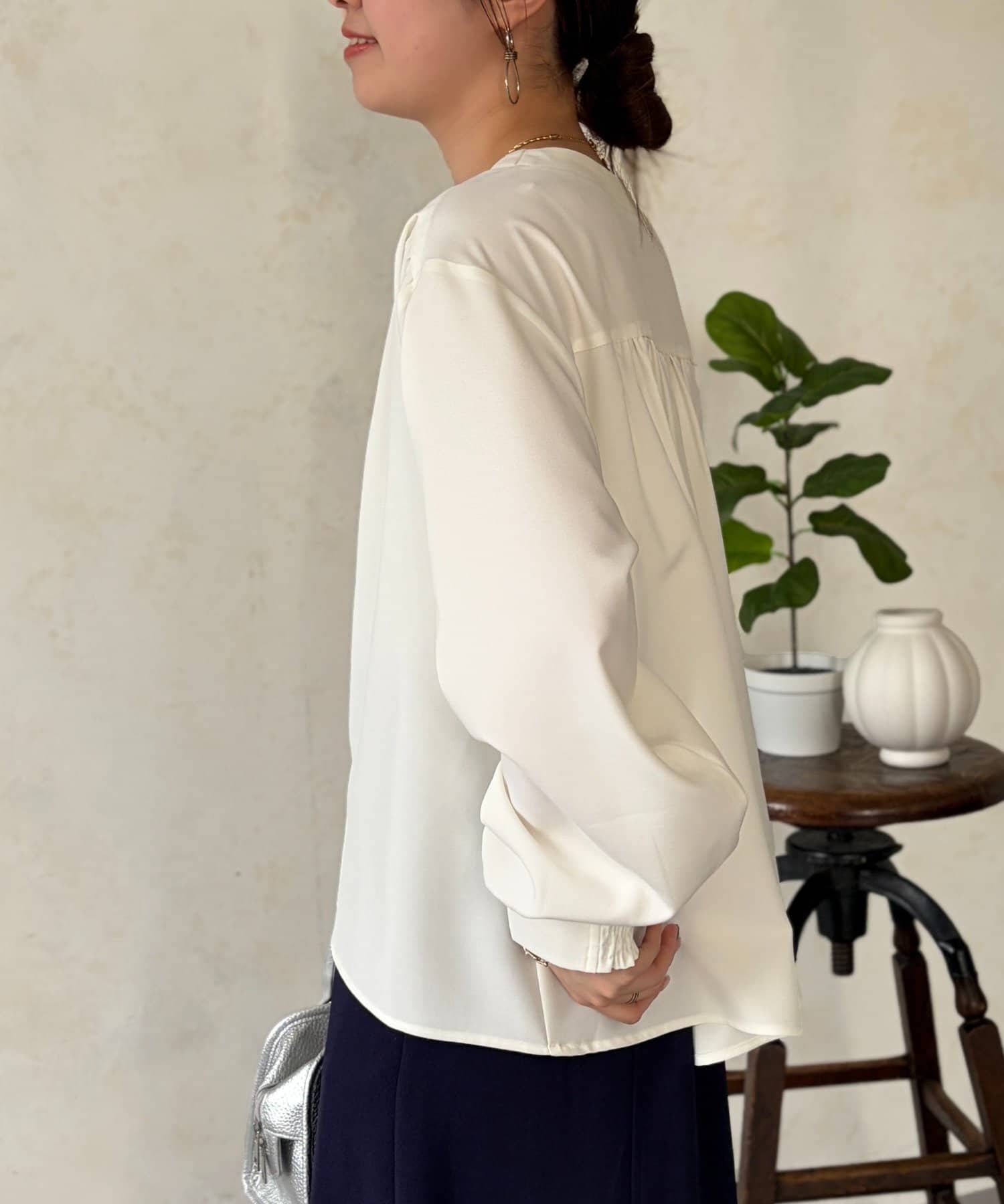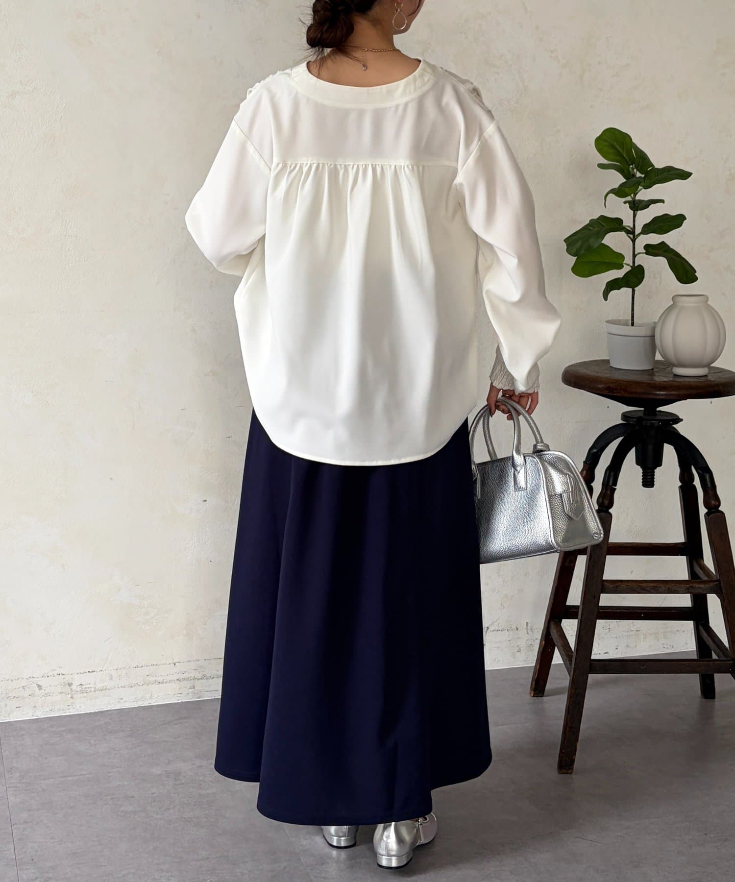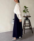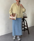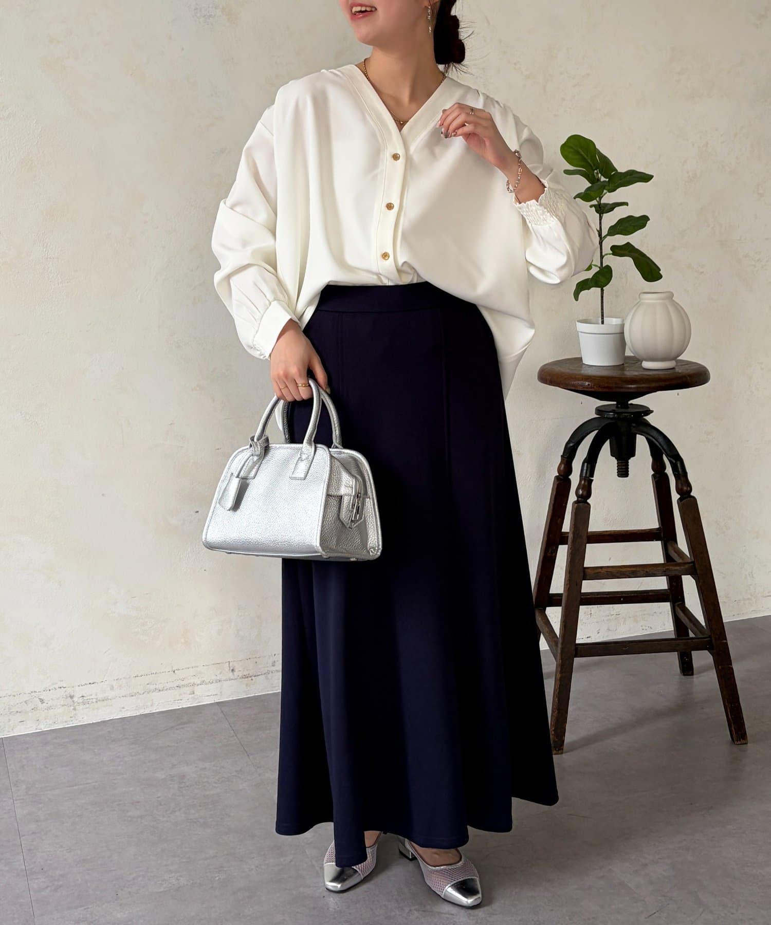 カットソー合わせはもちろん着流しタイプのデザインなので、襟のあるシャツとのレイヤードもばっちり決まります。