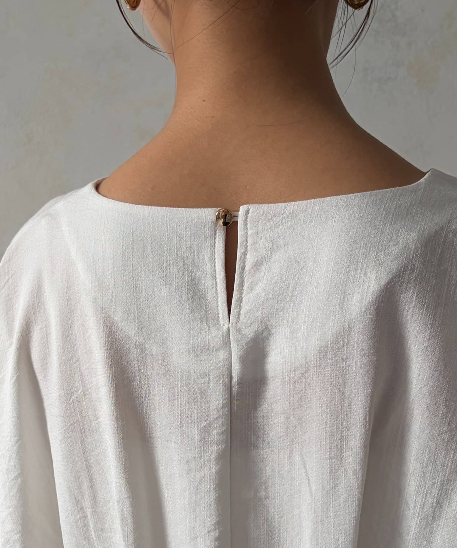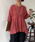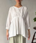 前後両面にあるギャザーデザインが目を惹くチュニックブラウス。