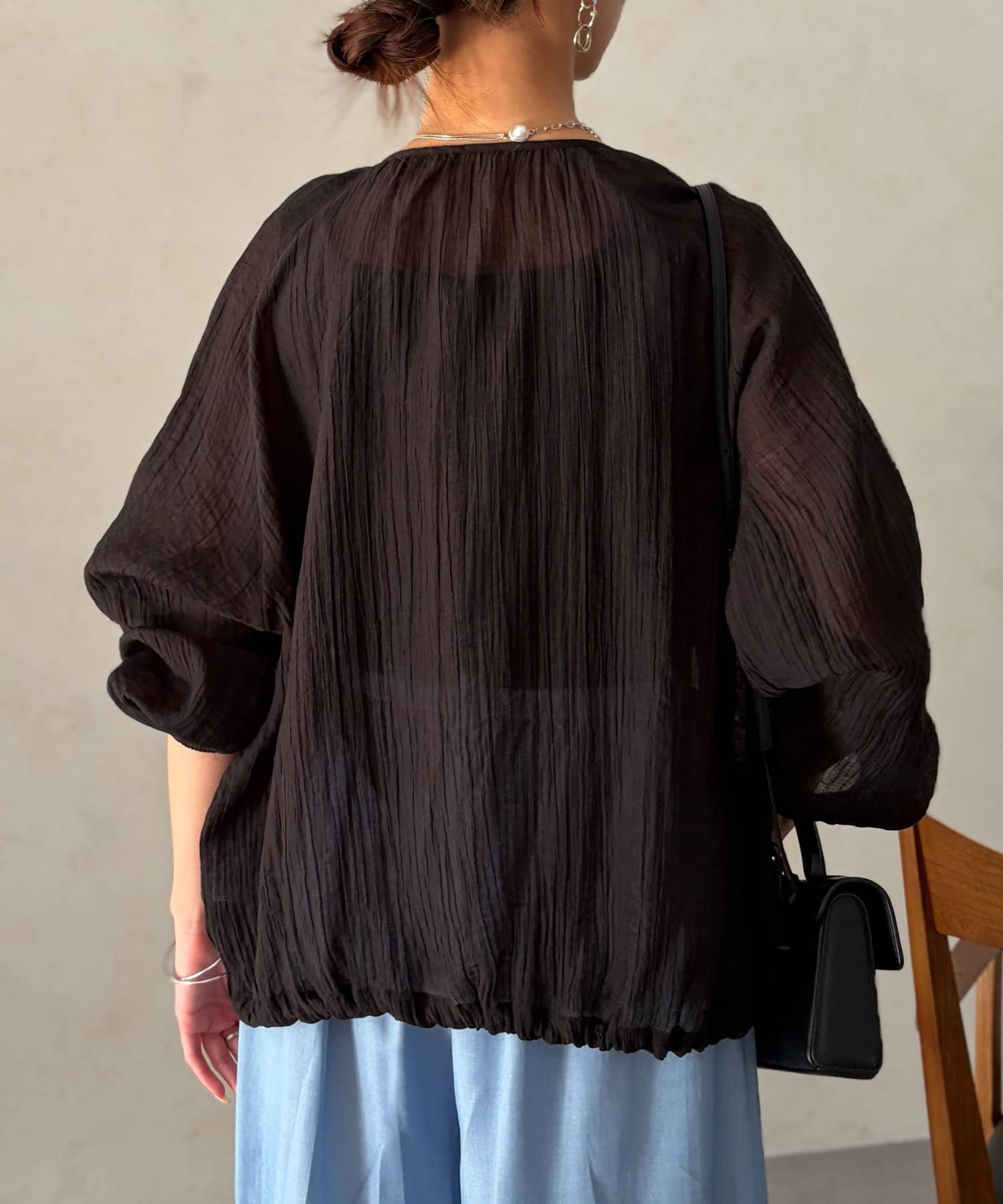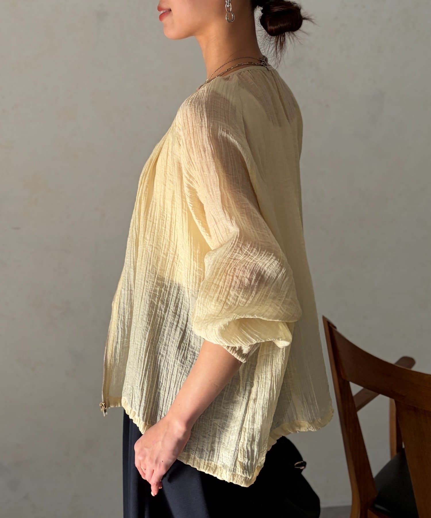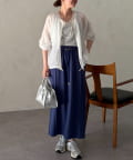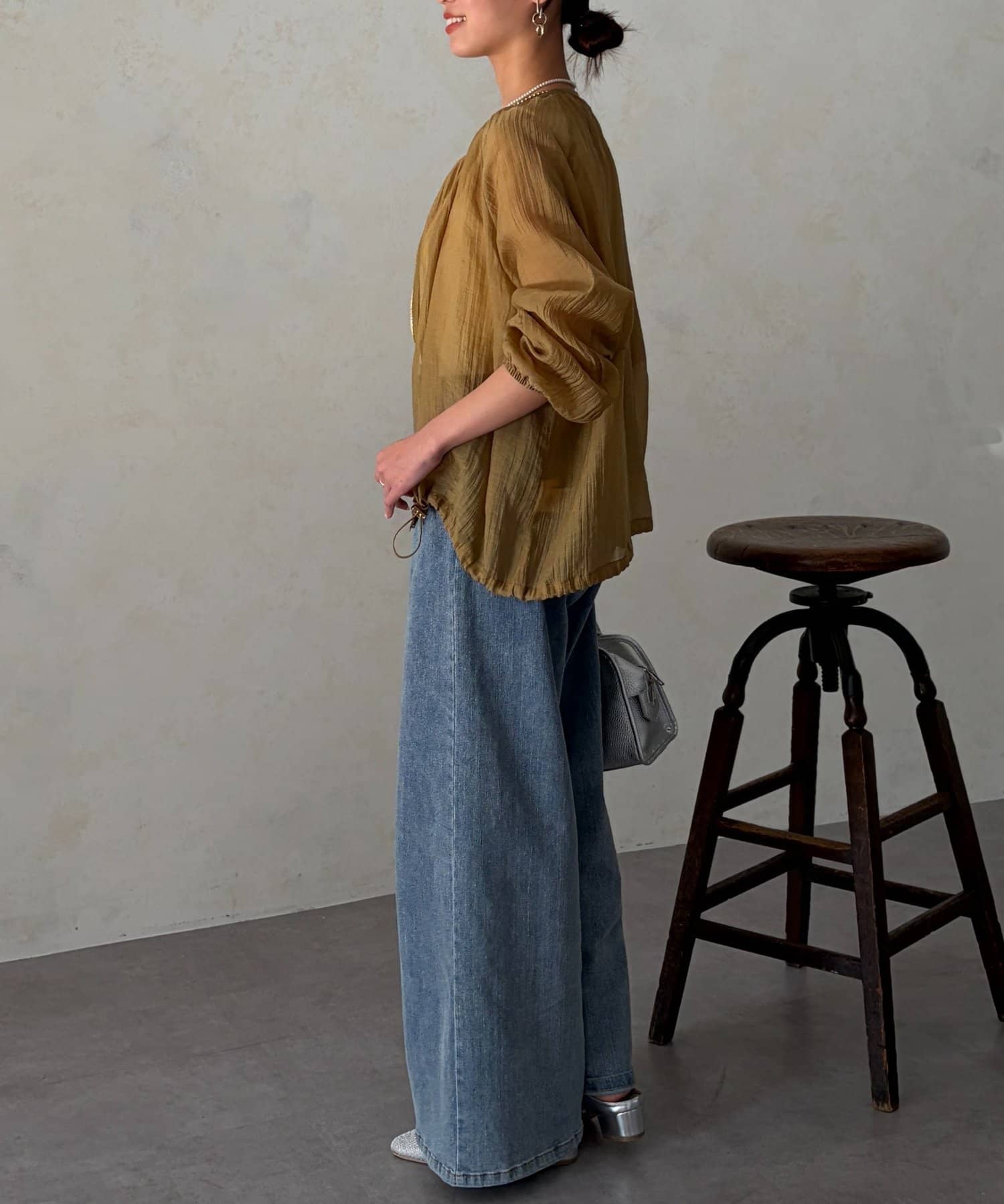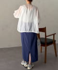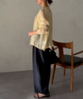裾を絞るとギュッとブラウジングができるので、ハイウエストのパンツやフレスカートで合わせてもバランスよく合わせていただけます。