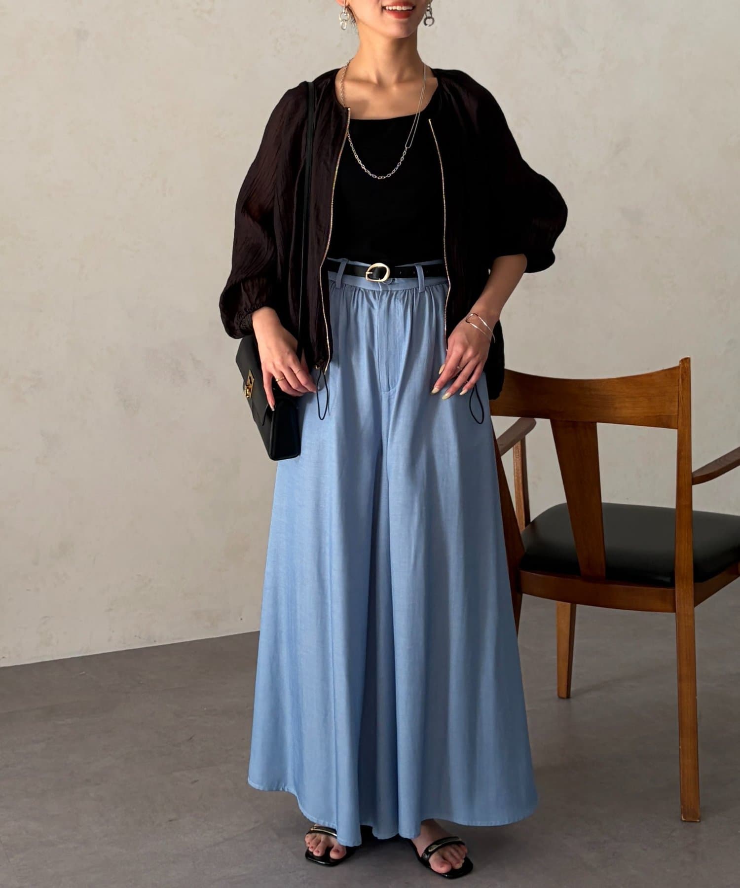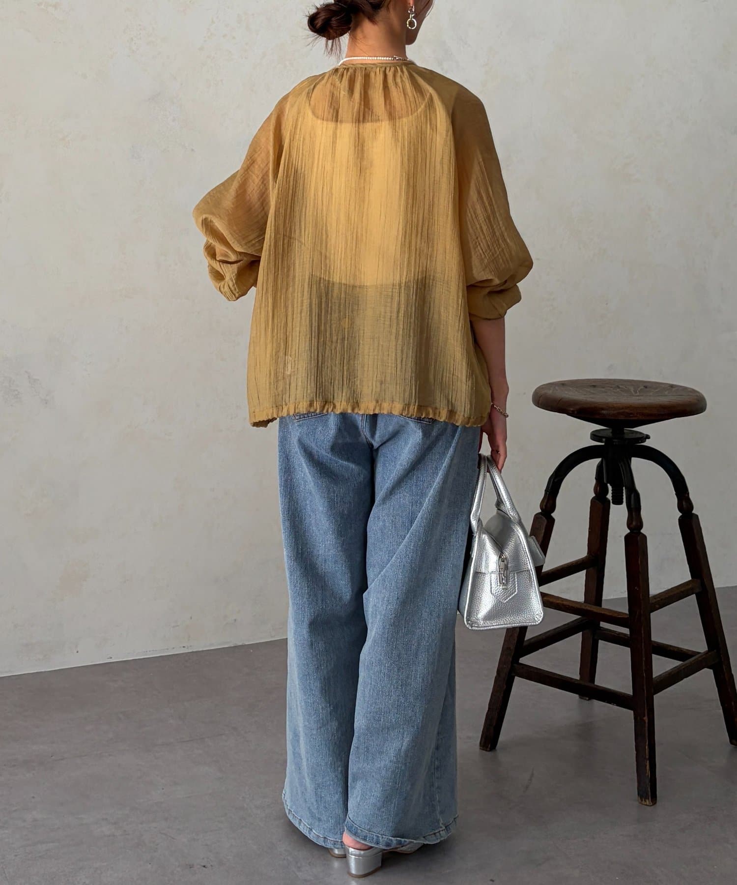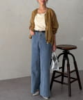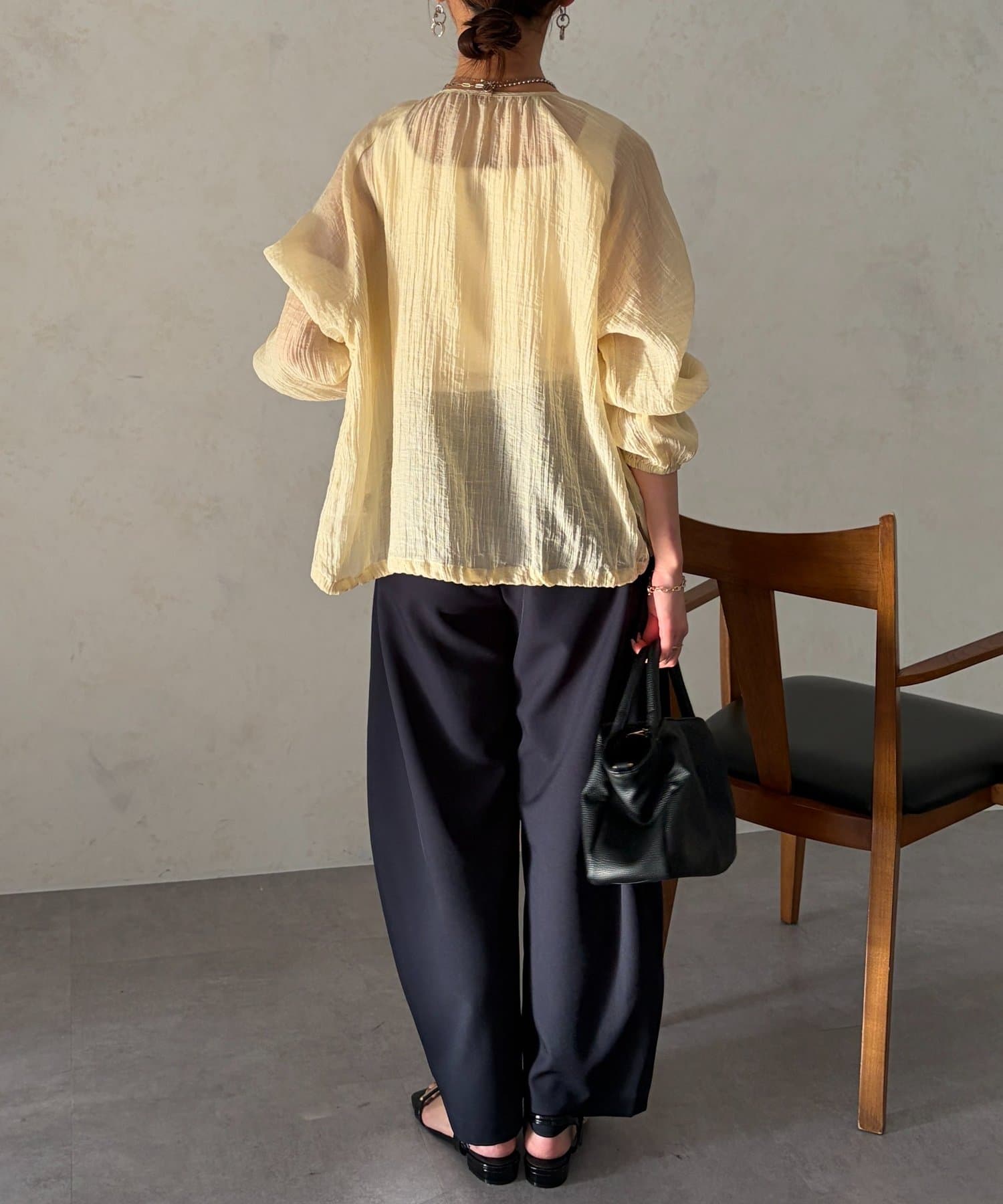 裾を絞るとギュッとブラウジングができるので、ハイウエストのパンツやフレスカートで合わせてもバランスよく合わせていただけます。